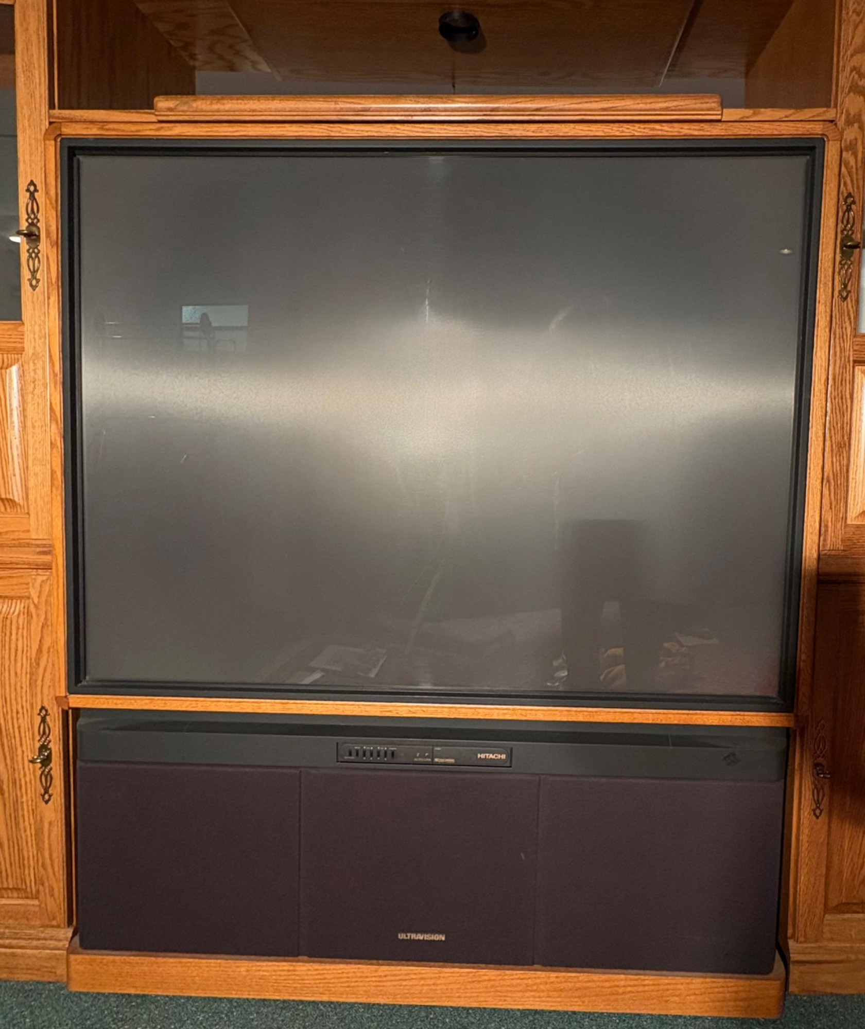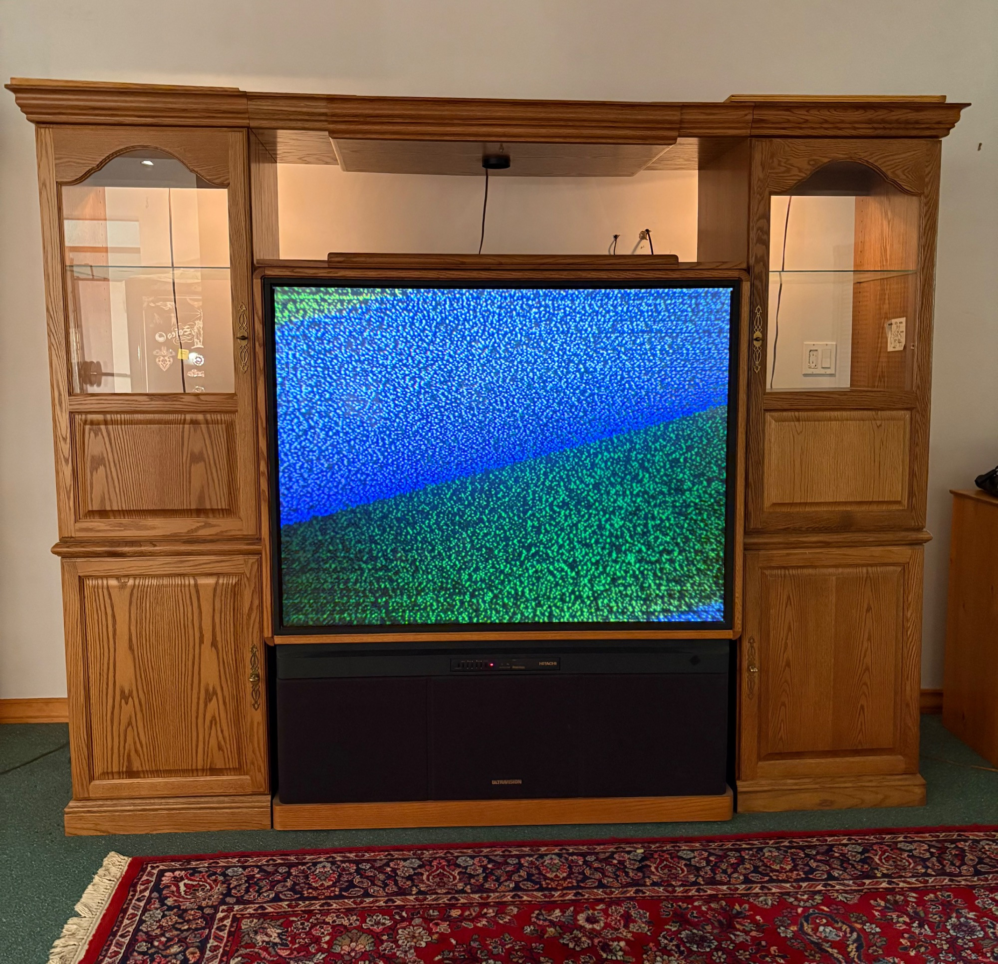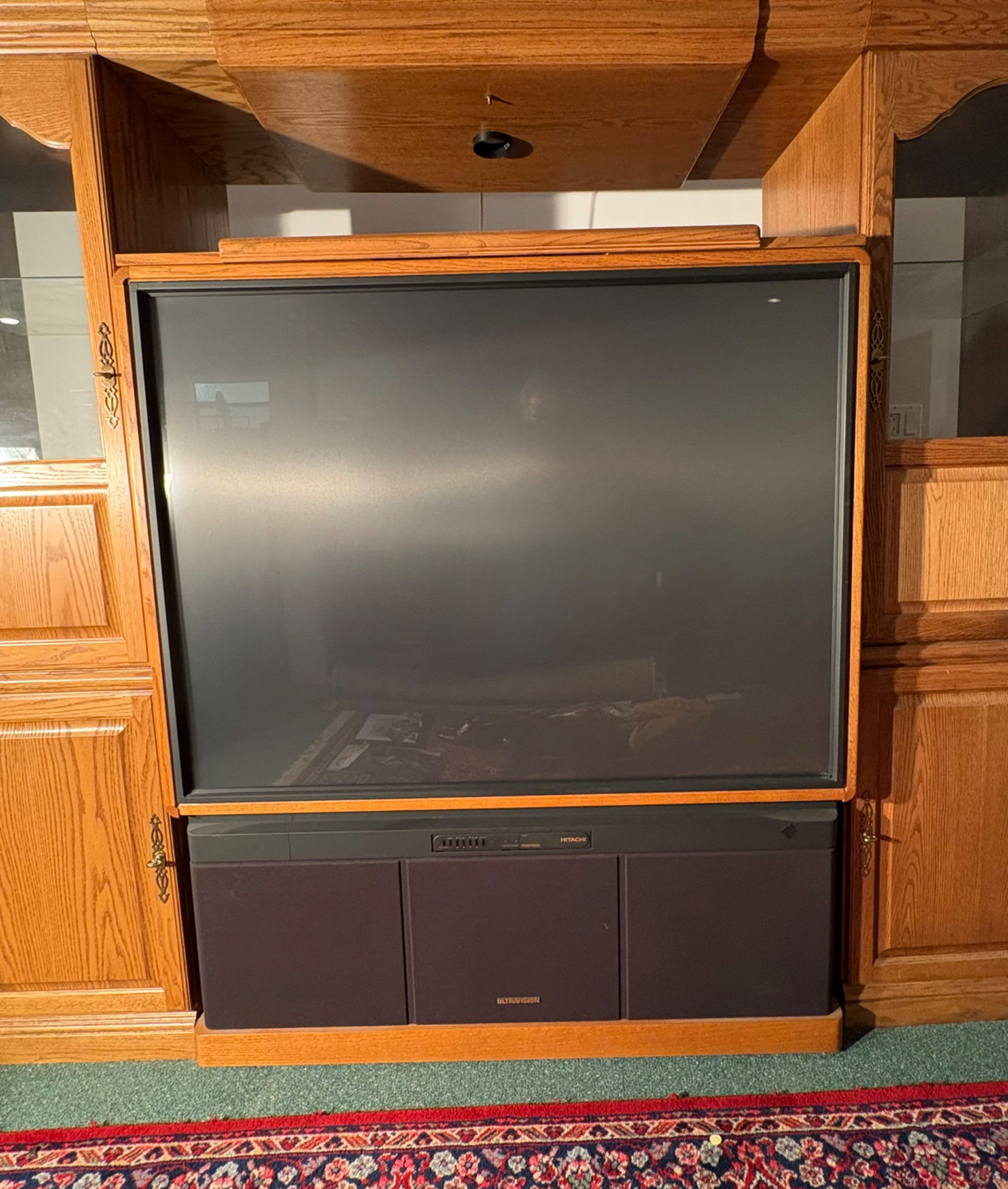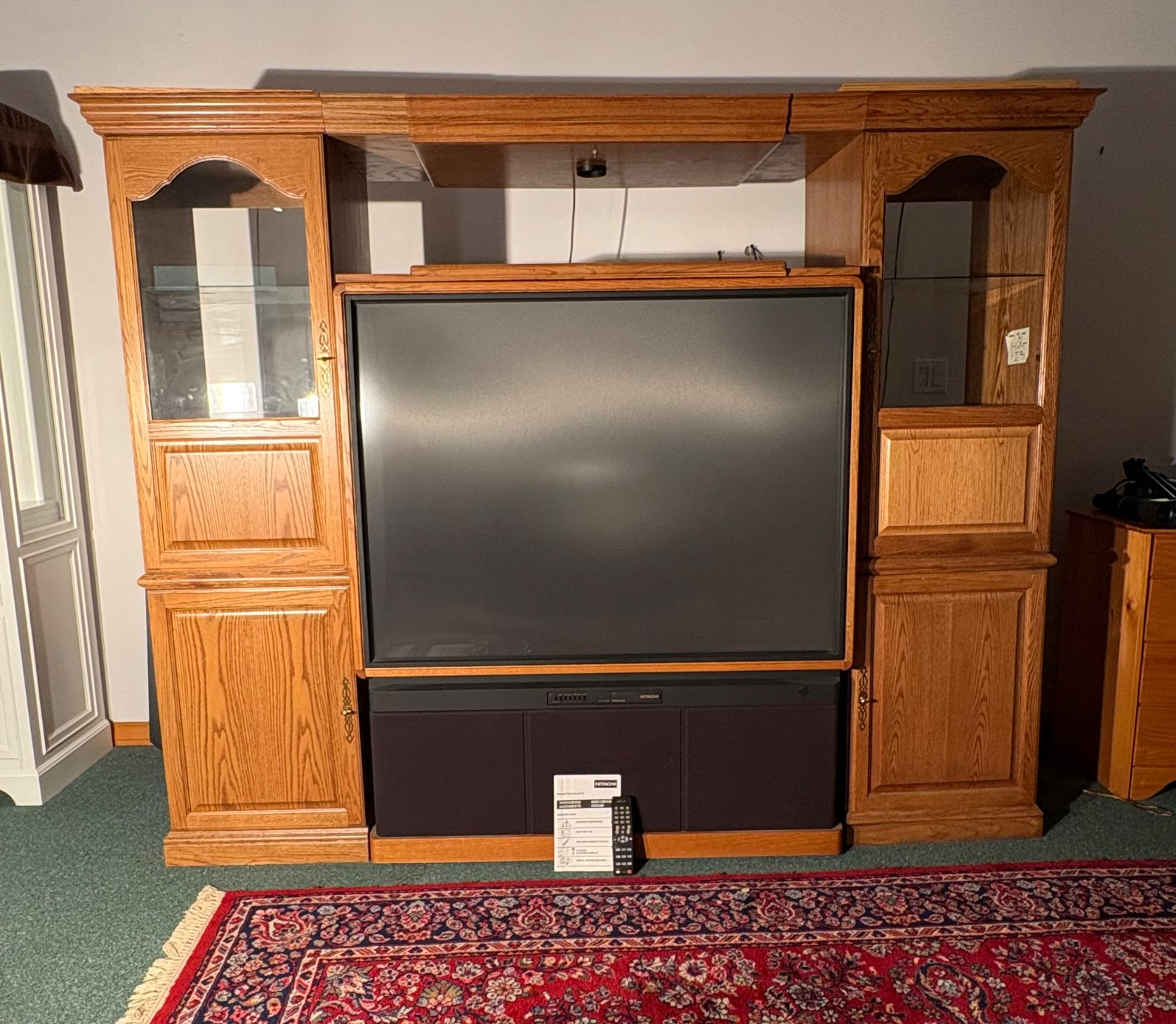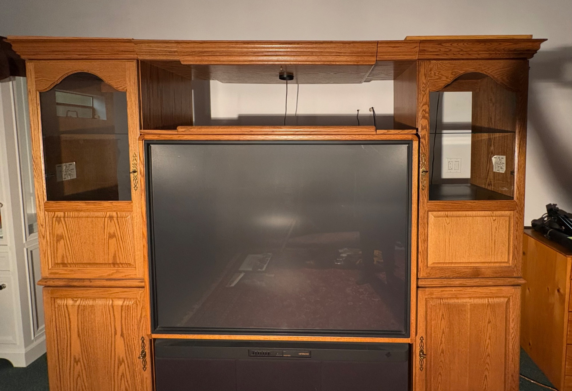 Large Hitachi projection color TV. Wood trim that matches the cabinet on the exterior of the TV. It appears to be on wheels so it can be moved. TV itself measures just shy 61" H x by 52.5" W. Diagonal screen measurement is 60. TV powers on. Surround cabinet appears to be out of honey oak with gold hardware and lighting above the glass sections.. There are two swing doors on either side of the tv and crown molding around the top of the piece. Cabinet measures approx. 78" H x 10" W (widest at the top of the crown molding). We have several backing pieces our client removed but saved from the cabinet should you prefer to move center shelf (now on top of the TV in the photos) to become an actual shelf or to hold a smaller tv. We've included a remote we think goes with this TV and the owner manual. Note that there is also a center recessed light, but we didn't have the right bulb to test it. Cabinet need to be taken apart to get out the basement door, but there are no steps involved and loading area is directly outside the basement door. . Local Pickup Only. Bidding on this lot is an agreement that: (1.) You will have 2 capable, able-bodied persons to lift and load at a minimum. (2.) You will bring a hand truck and/or any other tools needed to remove this item. If these steps are not followed your item will be forfeited and no refund given.
