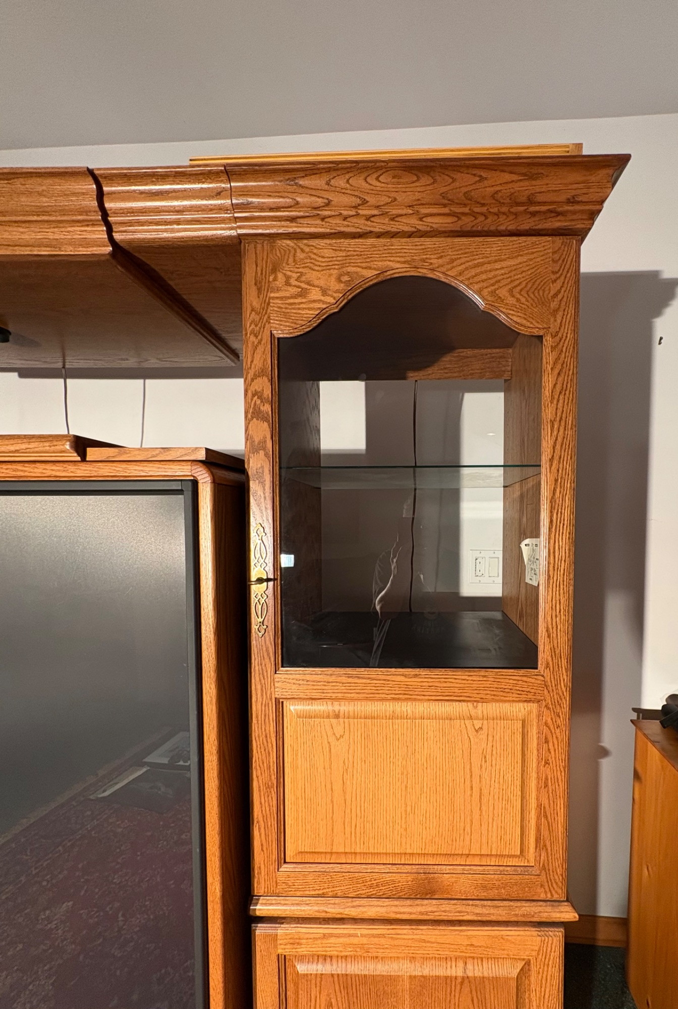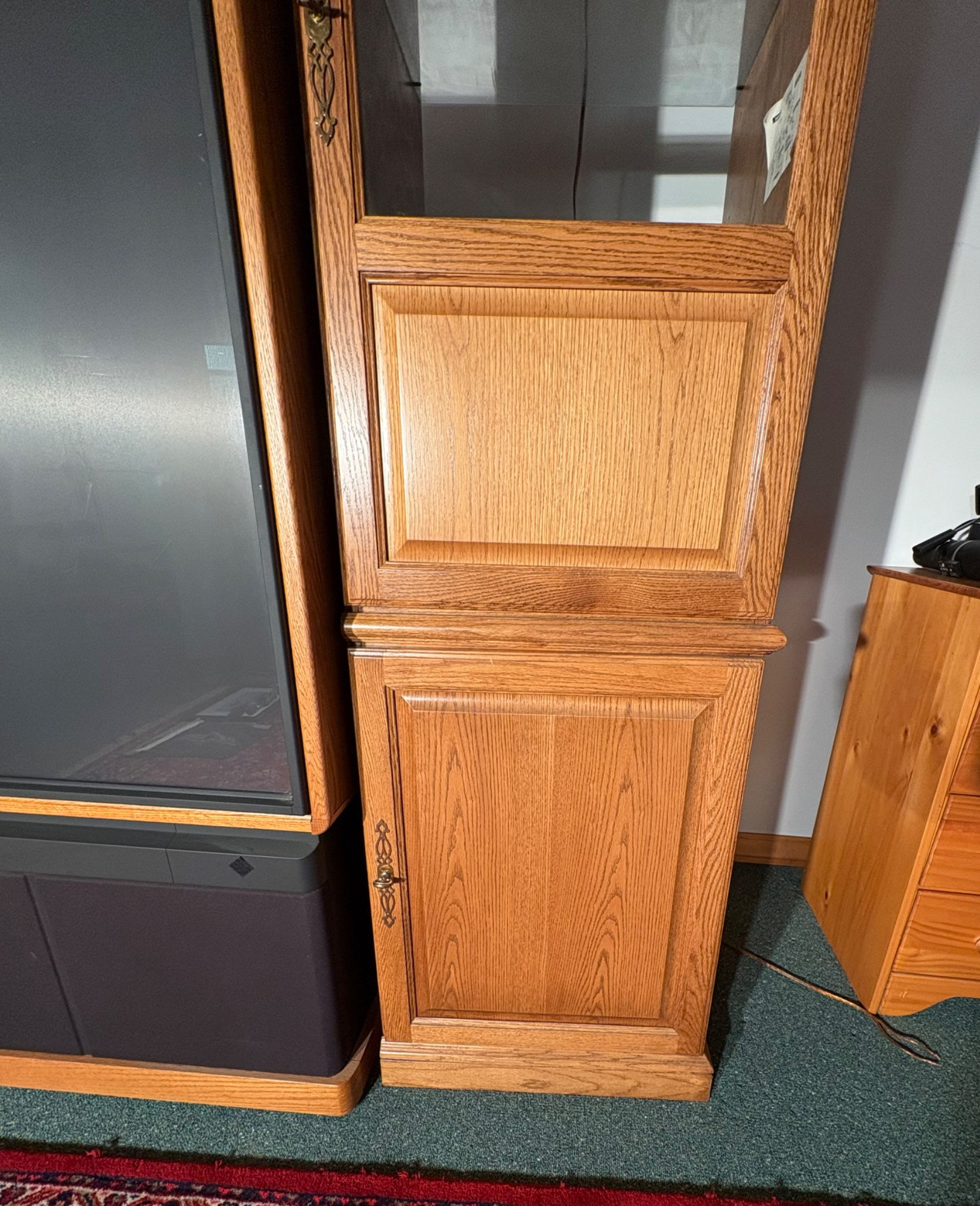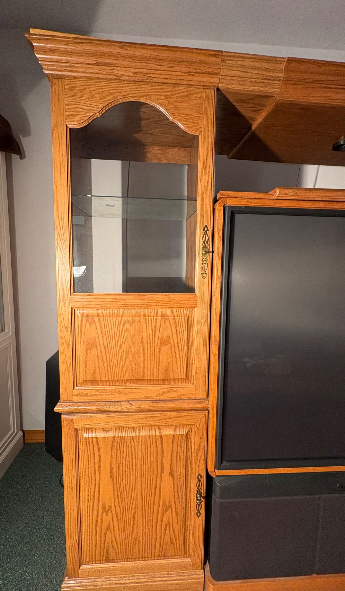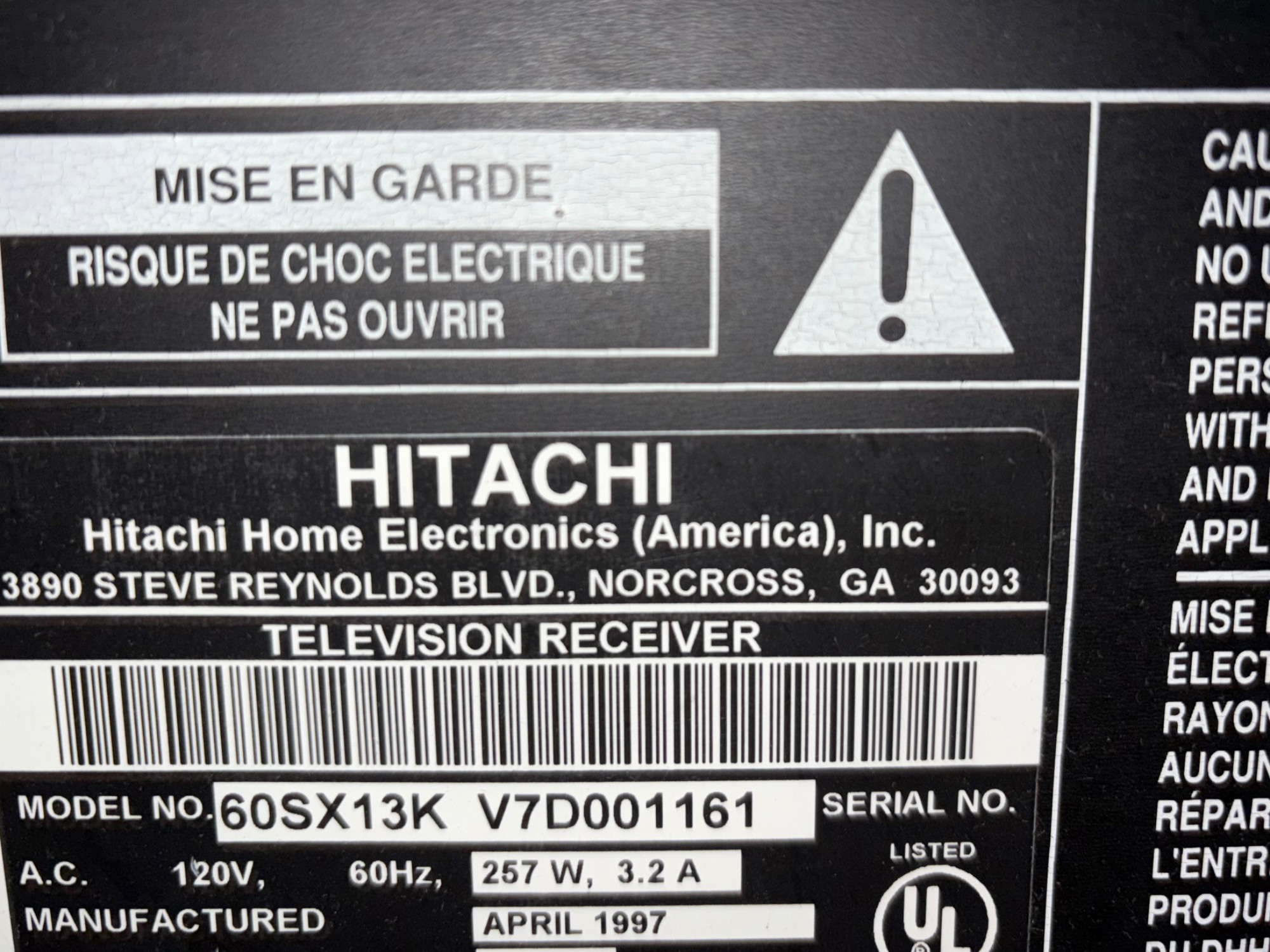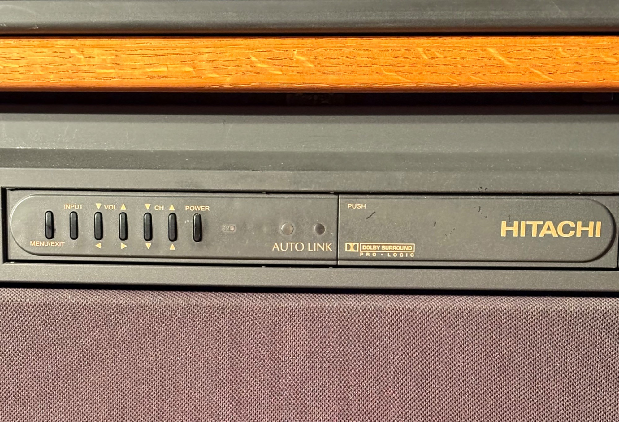 Large Hitachi projection color TV. Wood trim that matches the cabinet on the exterior of the TV. It appears to be on wheels so it can be moved. TV itself measures just shy 61" H x by 52.5" W. Diagonal screen measurement is 60. TV powers on. Surround cabinet appears to be out of honey oak with gold hardware and lighting above the glass sections.. There are two swing doors on either side of the tv and crown molding around the top of the piece. Cabinet measures approx. 78" H x 10" W (widest at the top of the crown molding). We have several backing pieces our client removed but saved from the cabinet should you prefer to move center shelf (now on top of the TV in the photos) to become an actual shelf or to hold a smaller tv. We've included a remote we think goes with this TV and the owner manual. Note that there is also a center recessed light, but we didn't have the right bulb to test it. Cabinet need to be taken apart to get out the basement door, but there are no steps involved and loading area is directly outside the basement door. . Local Pickup Only. Bidding on this lot is an agreement that: (1.) You will have 2 capable, able-bodied persons to lift and load at a minimum. (2.) You will bring a hand truck and/or any other tools needed to remove this item. If these steps are not followed your item will be forfeited and no refund given.