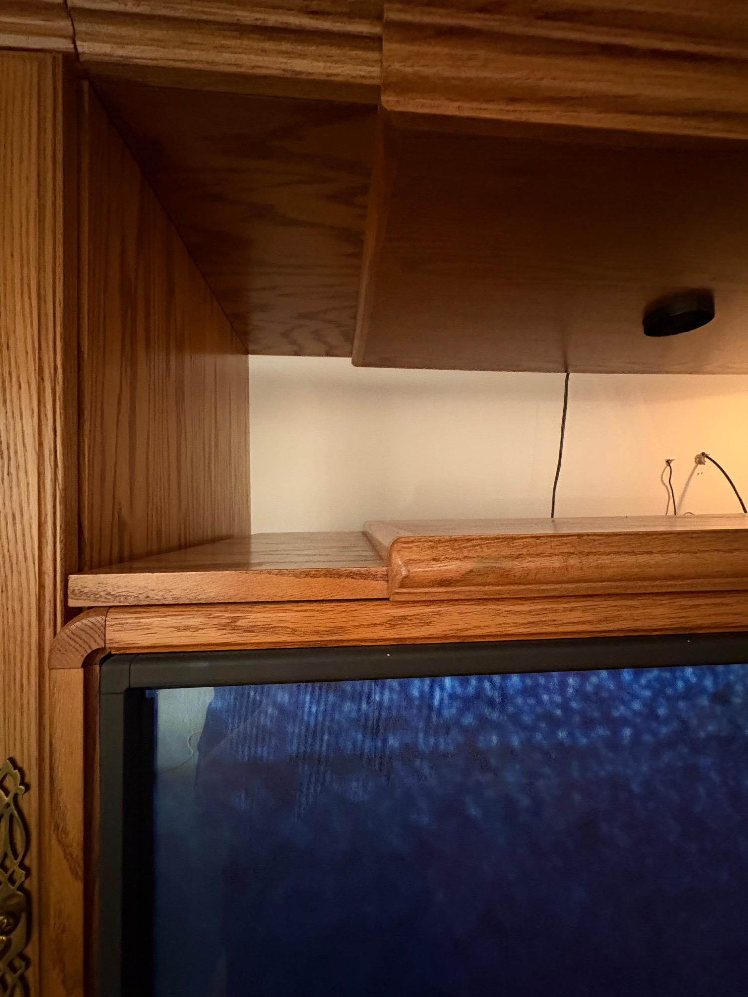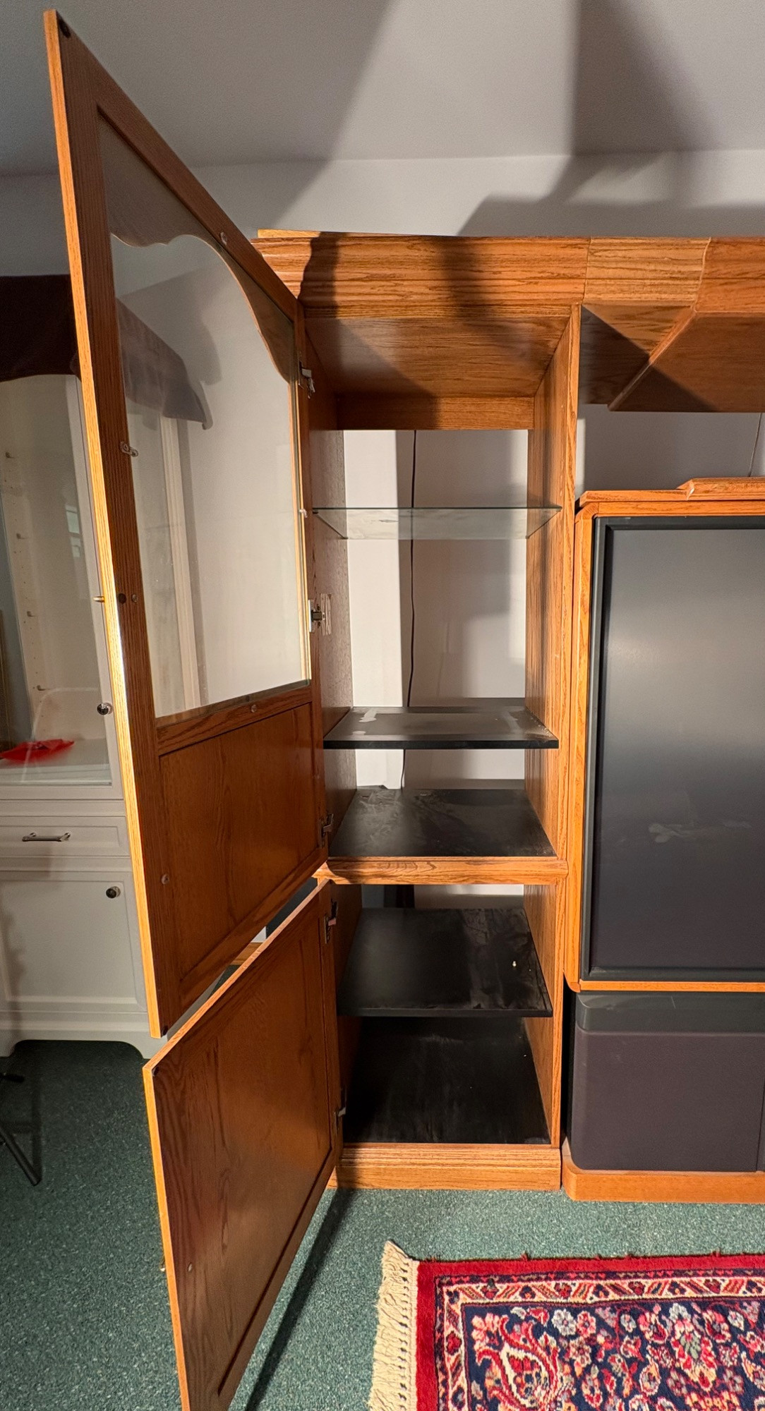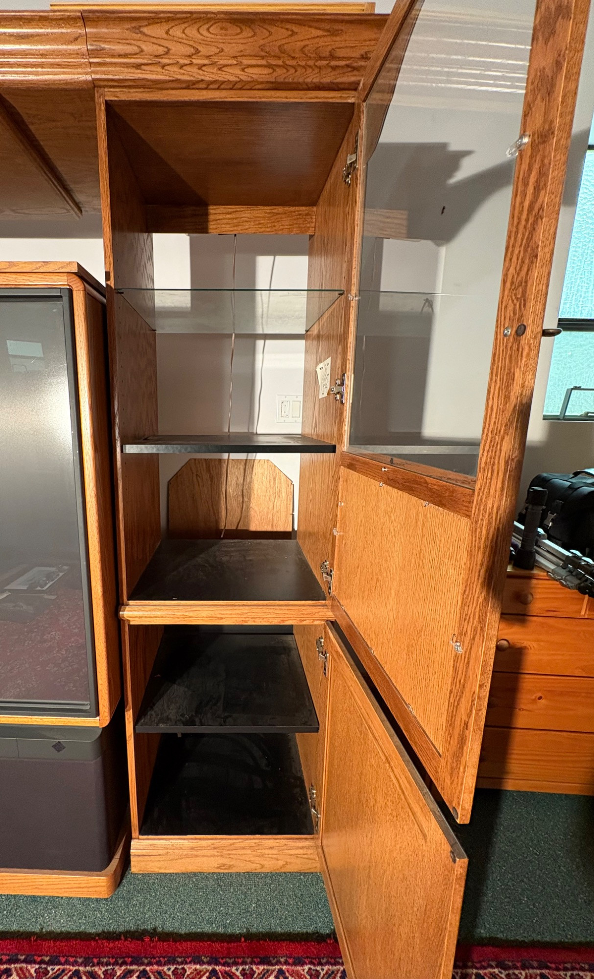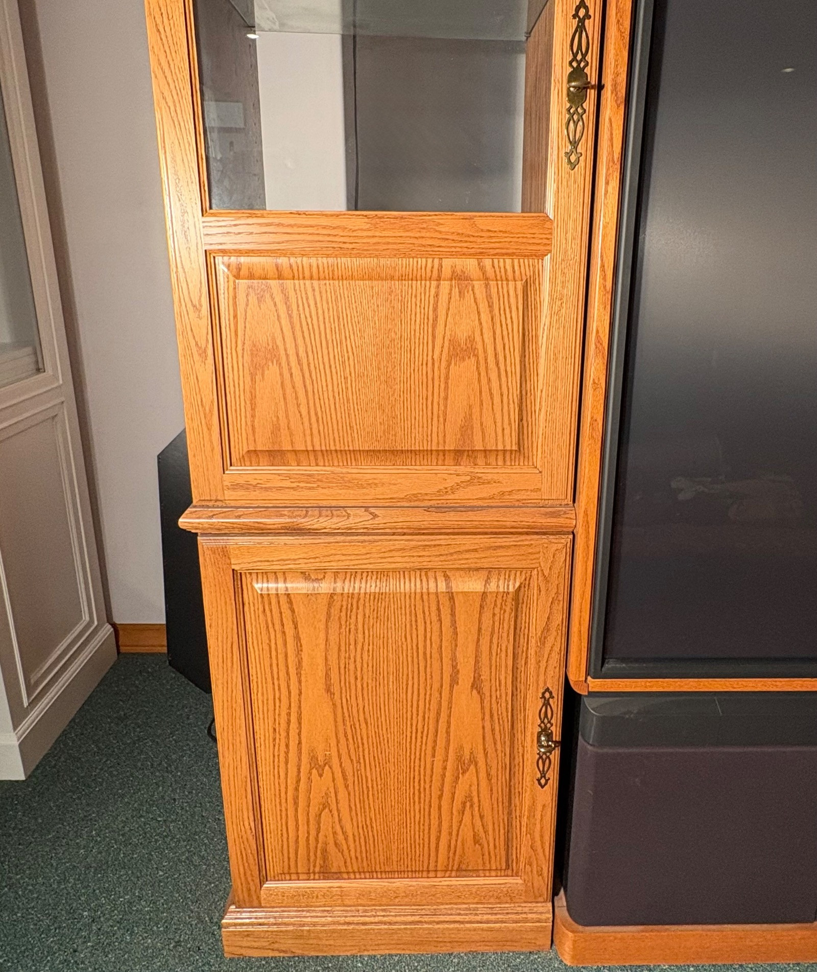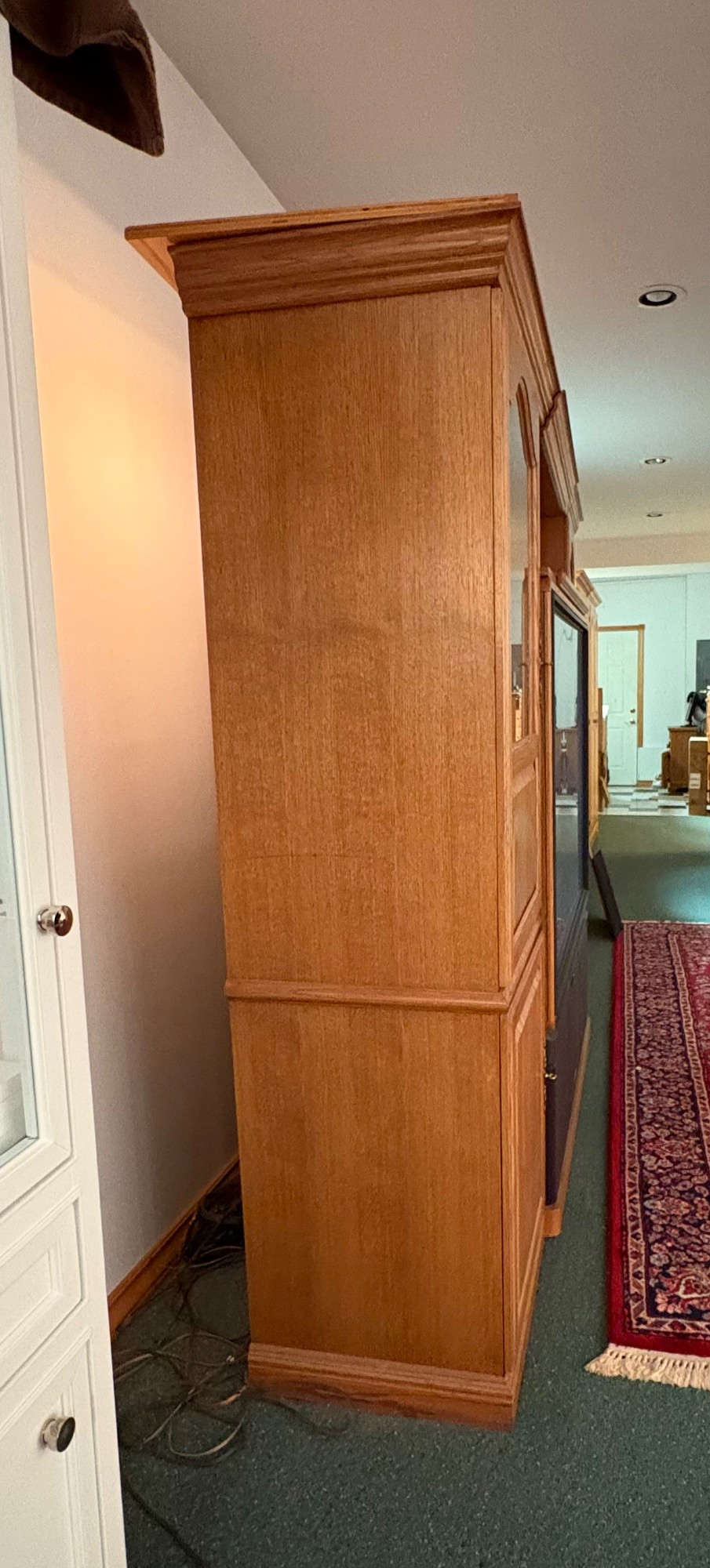 Large Hitachi projection color TV. Wood trim that matches the cabinet on the exterior of the TV. It appears to be on wheels so it can be moved. TV itself measures just shy 61" H x by 52.5" W. Diagonal screen measurement is 60. TV powers on. Surround cabinet appears to be out of honey oak with gold hardware and lighting above the glass sections.. There are two swing doors on either side of the tv and crown molding around the top of the piece. Cabinet measures approx. 78" H x 10" W (widest at the top of the crown molding). We have several backing pieces our client removed but saved from the cabinet should you prefer to move center shelf (now on top of the TV in the photos) to become an actual shelf or to hold a smaller tv. We've included a remote we think goes with this TV and the owner manual. Note that there is also a center recessed light, but we didn't have the right bulb to test it. Cabinet need to be taken apart to get out the basement door, but there are no steps involved and loading area is directly outside the basement door. . Local Pickup Only. Bidding on this lot is an agreement that: (1.) You will have 2 capable, able-bodied persons to lift and load at a minimum. (2.) You will bring a hand truck and/or any other tools needed to remove this item. If these steps are not followed your item will be forfeited and no refund given.