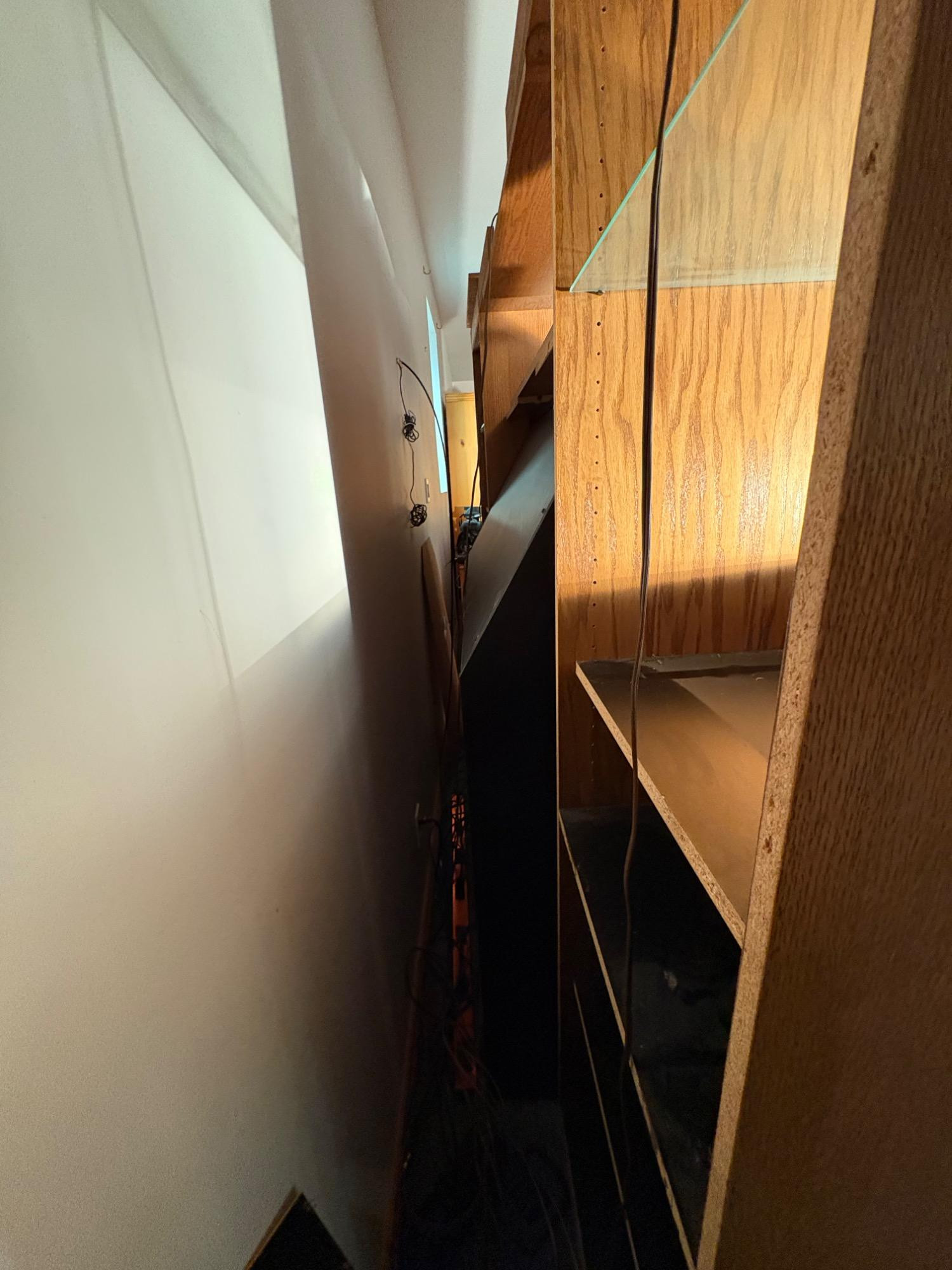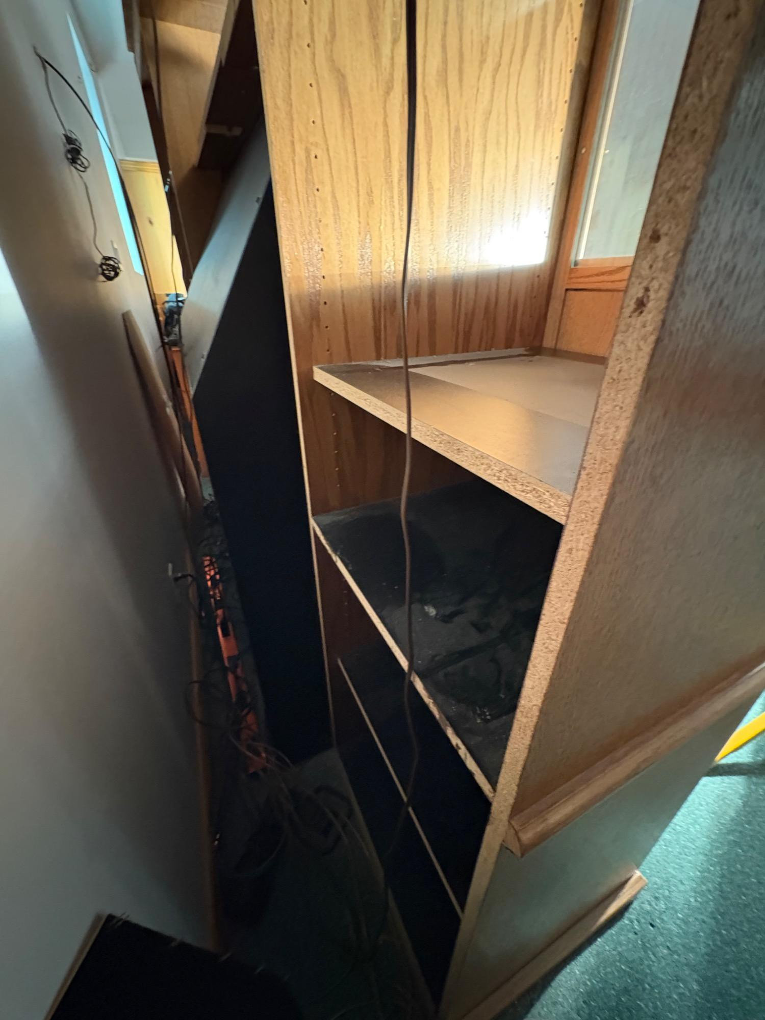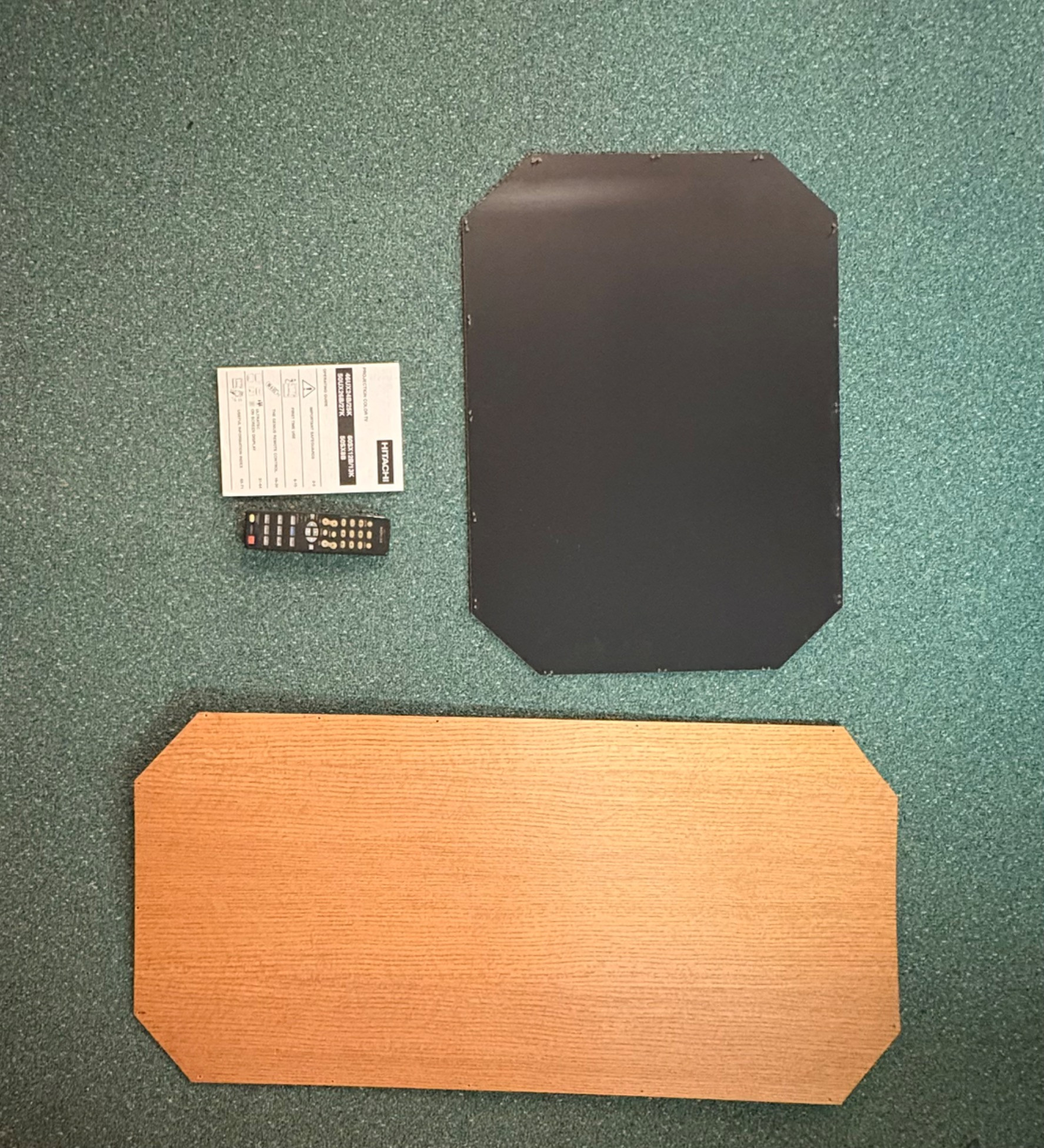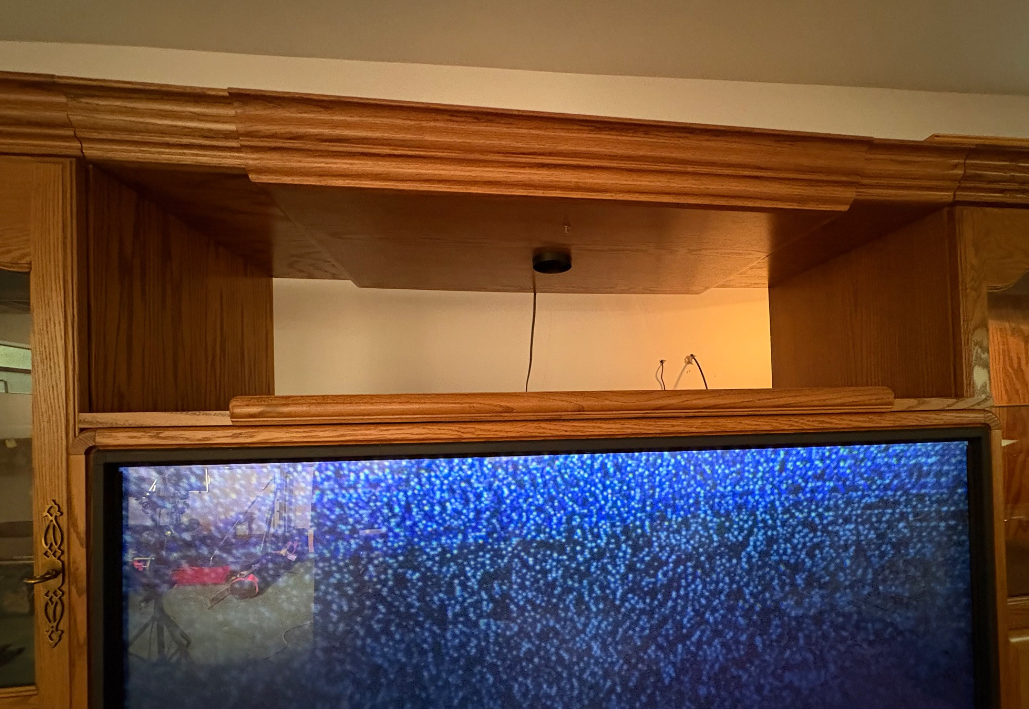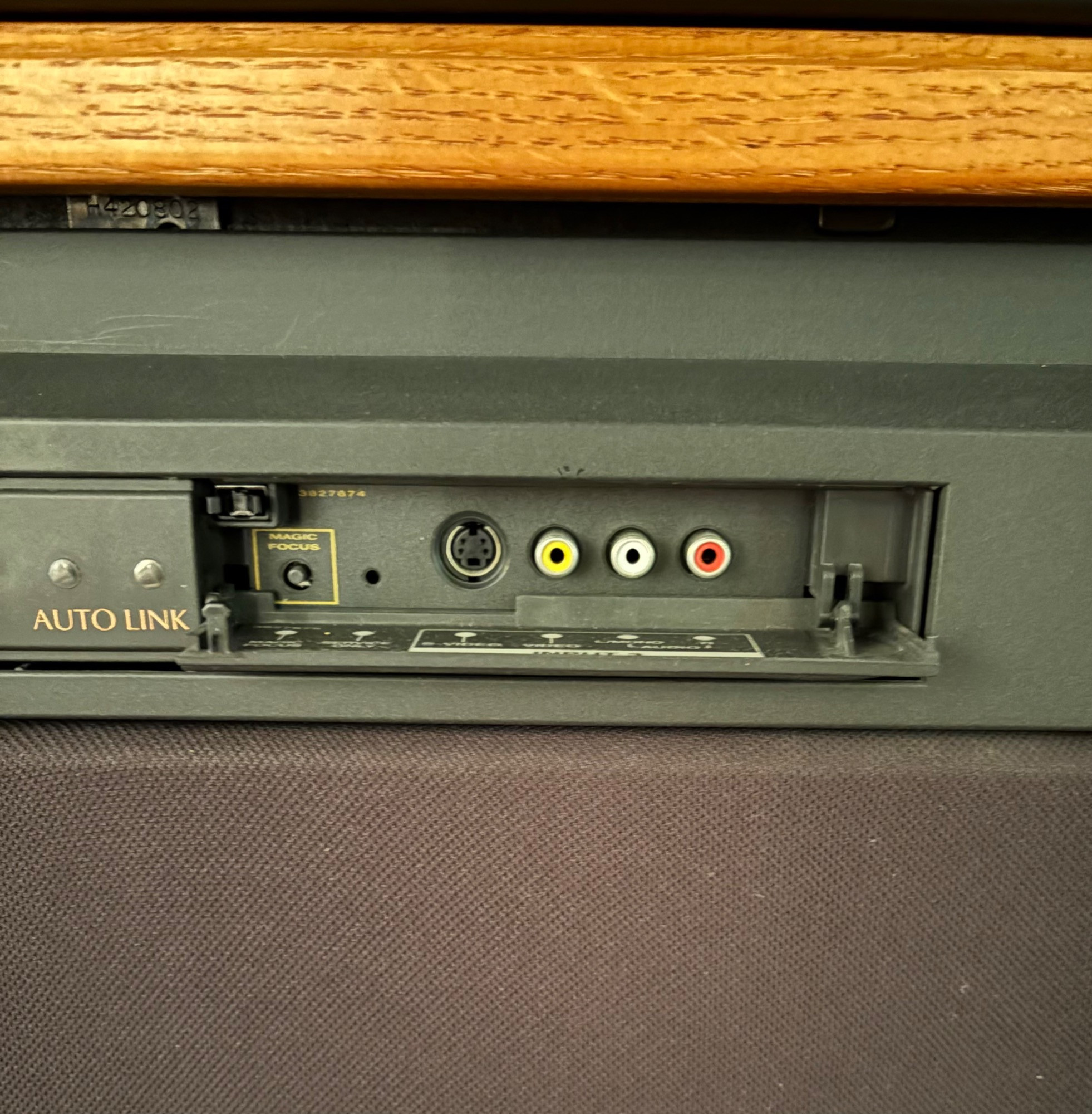 Large Hitachi projection color TV. Wood trim that matches the cabinet on the exterior of the TV. It appears to be on wheels so it can be moved. TV itself measures just shy 61" H x by 52.5" W. Diagonal screen measurement is 60. TV powers on. Surround cabinet appears to be out of honey oak with gold hardware and lighting above the glass sections.. There are two swing doors on either side of the tv and crown molding around the top of the piece. Cabinet measures approx. 78" H x 10" W (widest at the top of the crown molding). We have several backing pieces our client removed but saved from the cabinet should you prefer to move center shelf (now on top of the TV in the photos) to become an actual shelf or to hold a smaller tv. We've included a remote we think goes with this TV and the owner manual. Note that there is also a center recessed light, but we didn't have the right bulb to test it. Cabinet need to be taken apart to get out the basement door, but there are no steps involved and loading area is directly outside the basement door. . Local Pickup Only. Bidding on this lot is an agreement that: (1.) You will have 2 capable, able-bodied persons to lift and load at a minimum. (2.) You will bring a hand truck and/or any other tools needed to remove this item. If these steps are not followed your item will be forfeited and no refund given.