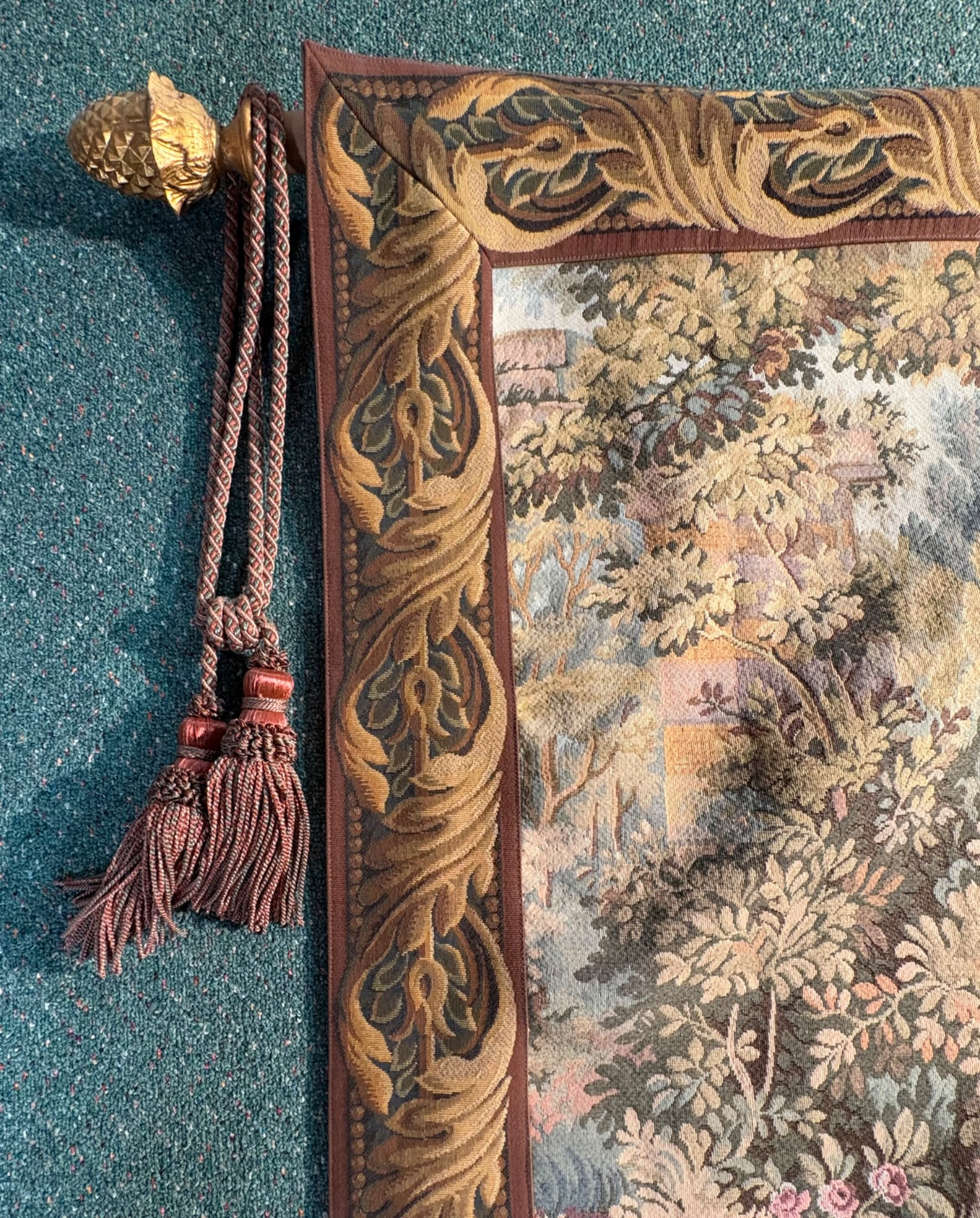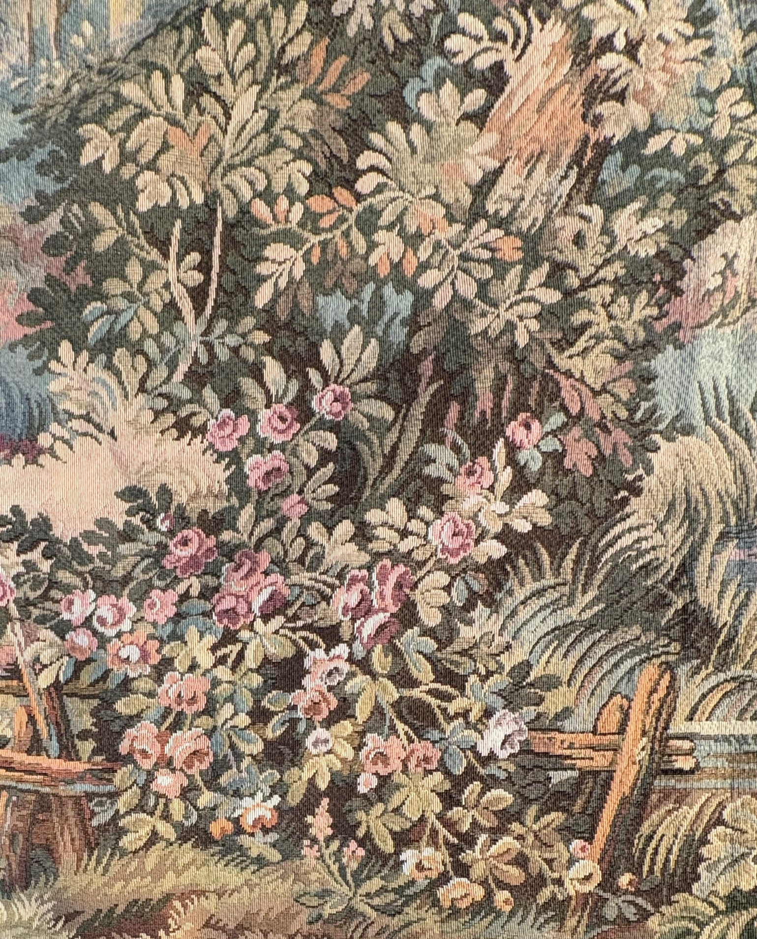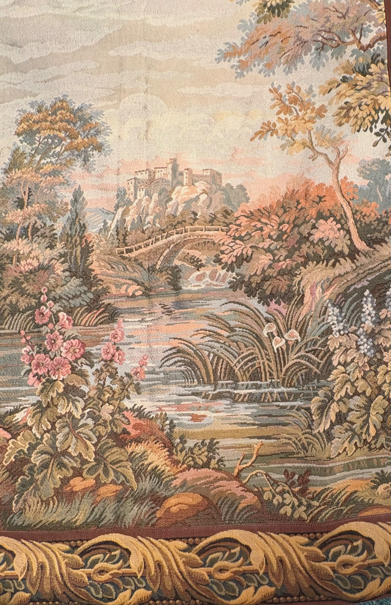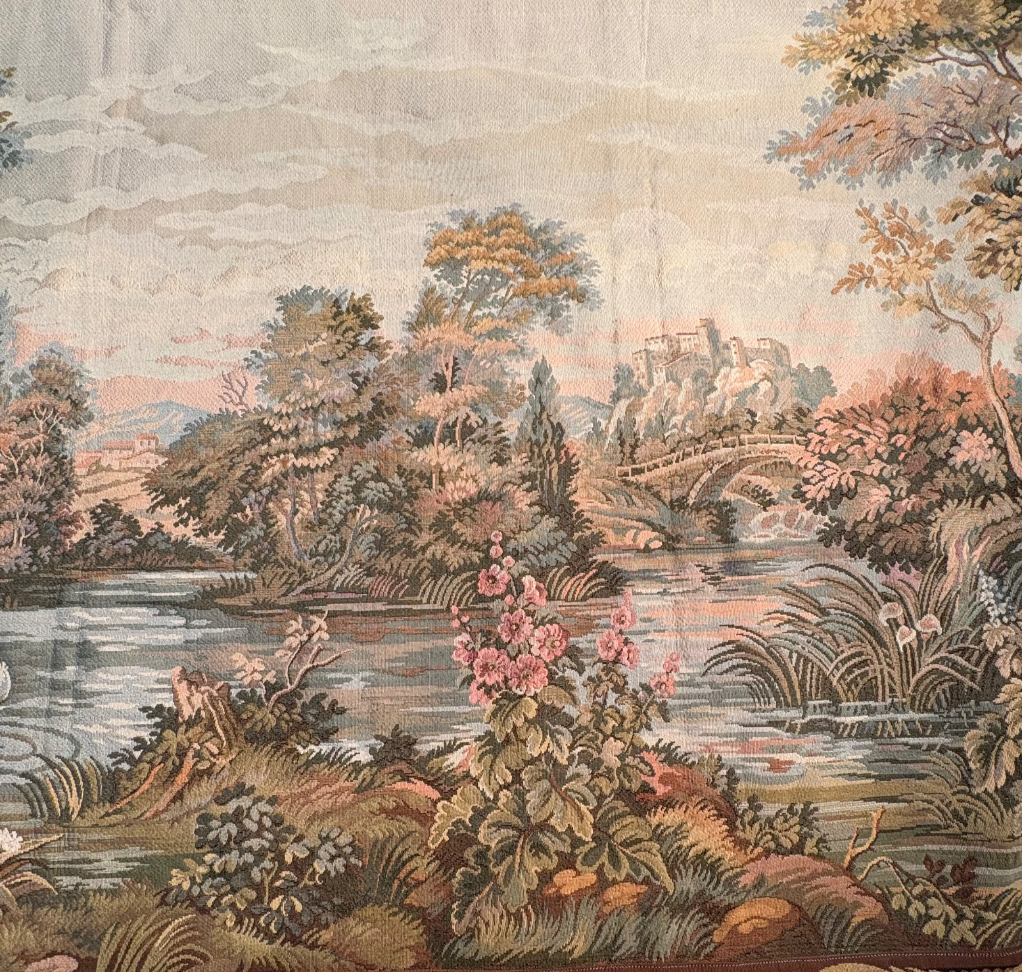 Vintage large French tapestry scene of swans in a lake with surrounding garden greenery. Comes with on wood hanging rod with finials & tassel. It is very large - about 4' high by 7' wide. Nice tight weave & fully lined. Back rod pocket needs a quick whipstitch repair - see last photo. Note: All tapestries listed in this auction are in good condition, but all would benefit from a good wash.