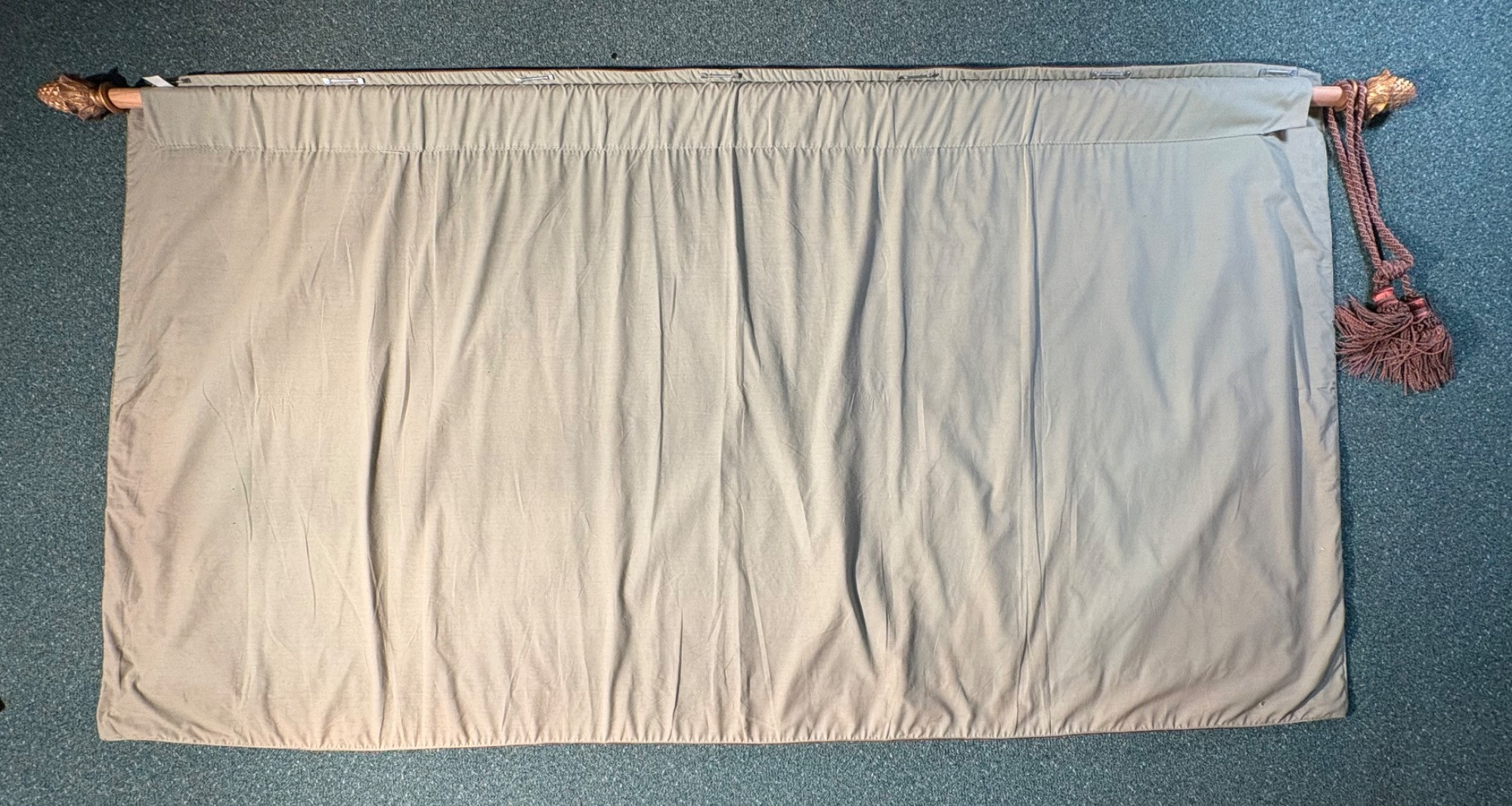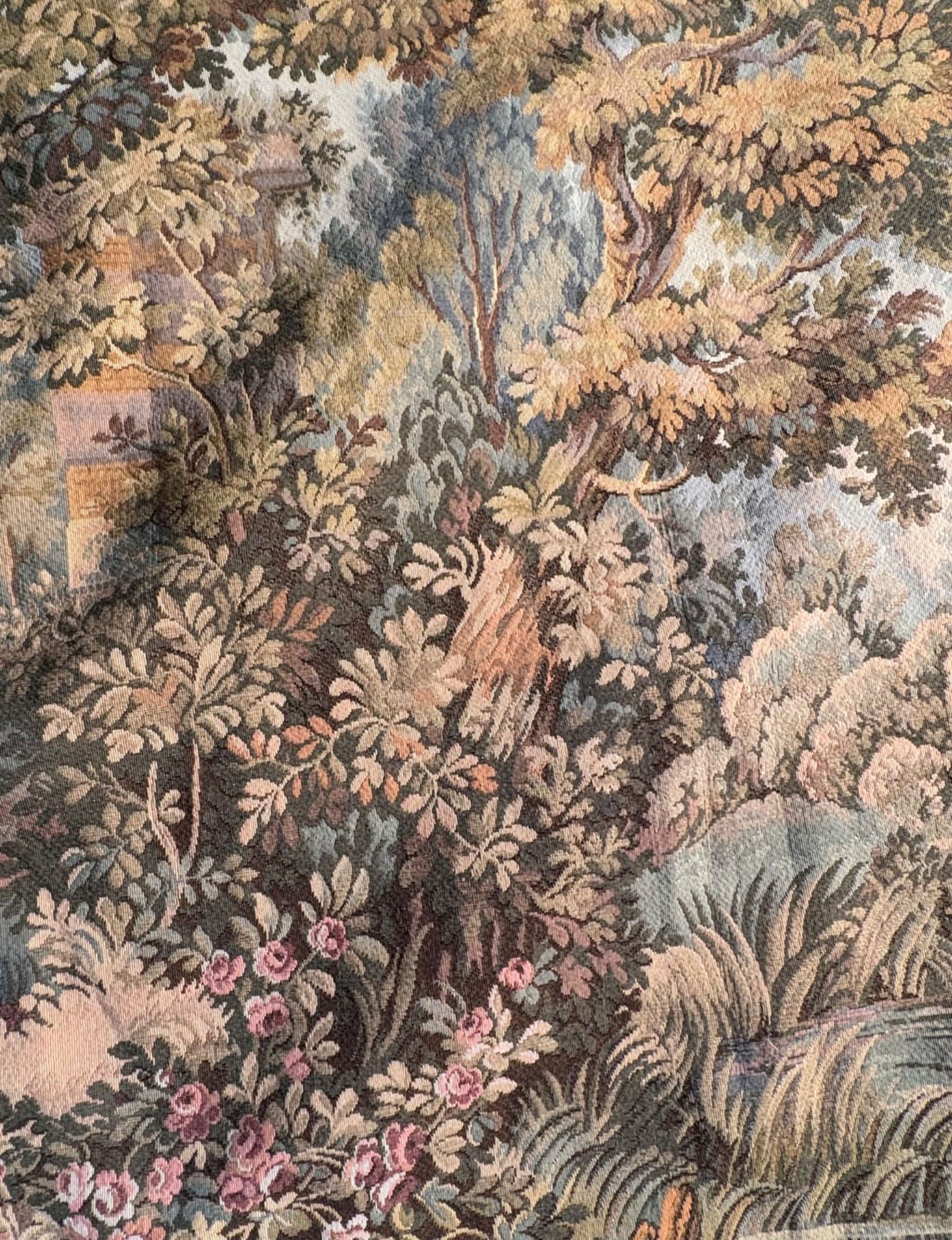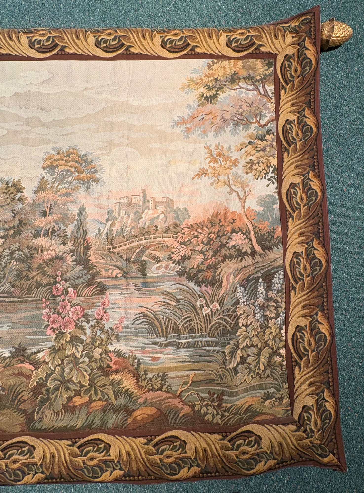 Vintage large French tapestry scene of swans in a lake with surrounding garden greenery. Comes with on wood hanging rod with finials & tassel. It is very large - about 4' high by 7' wide. Nice tight weave & fully lined. Back rod pocket needs a quick whipstitch repair - see last photo. Note: All tapestries listed in this auction are in good condition, but all would benefit from a good wash.