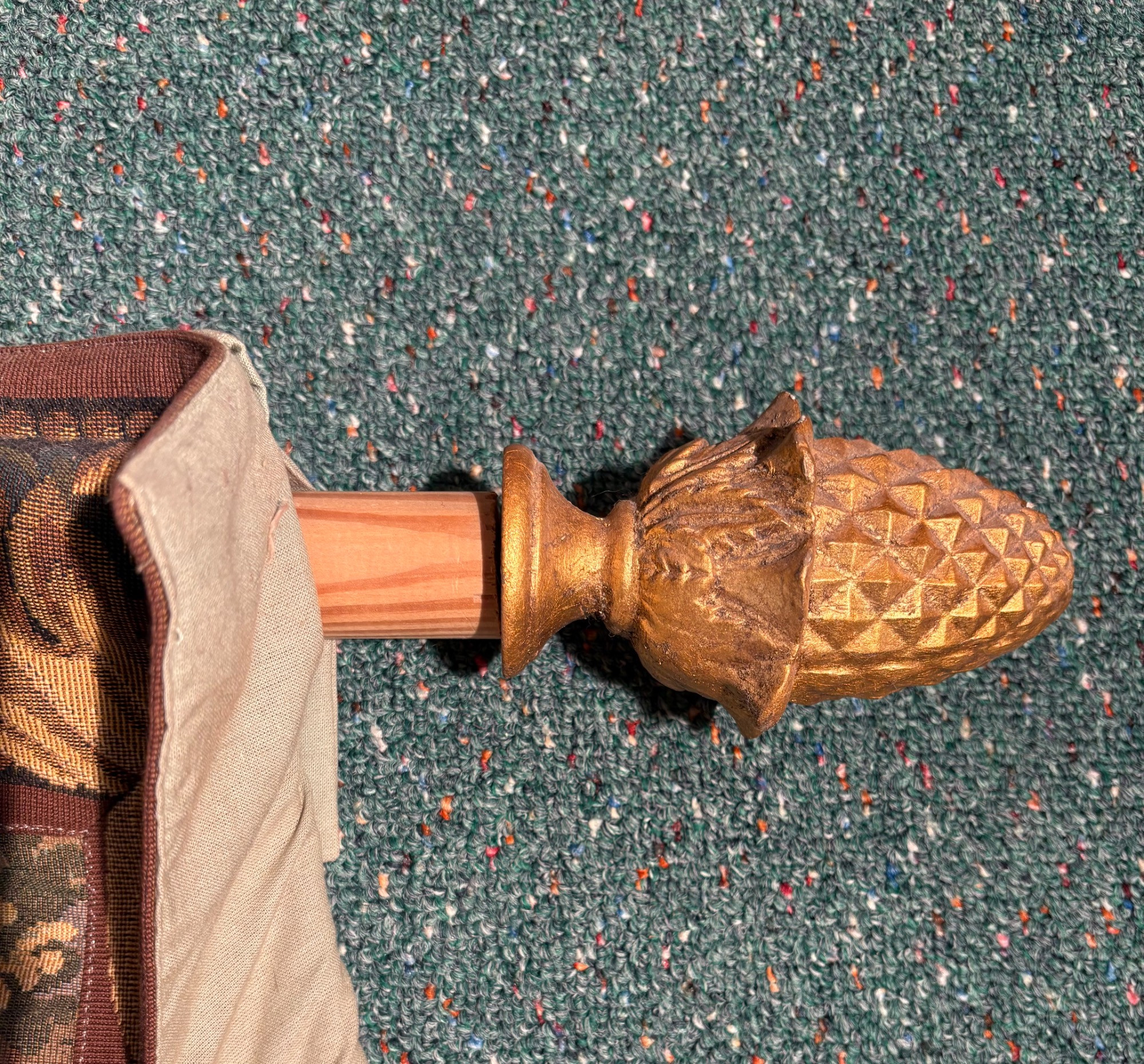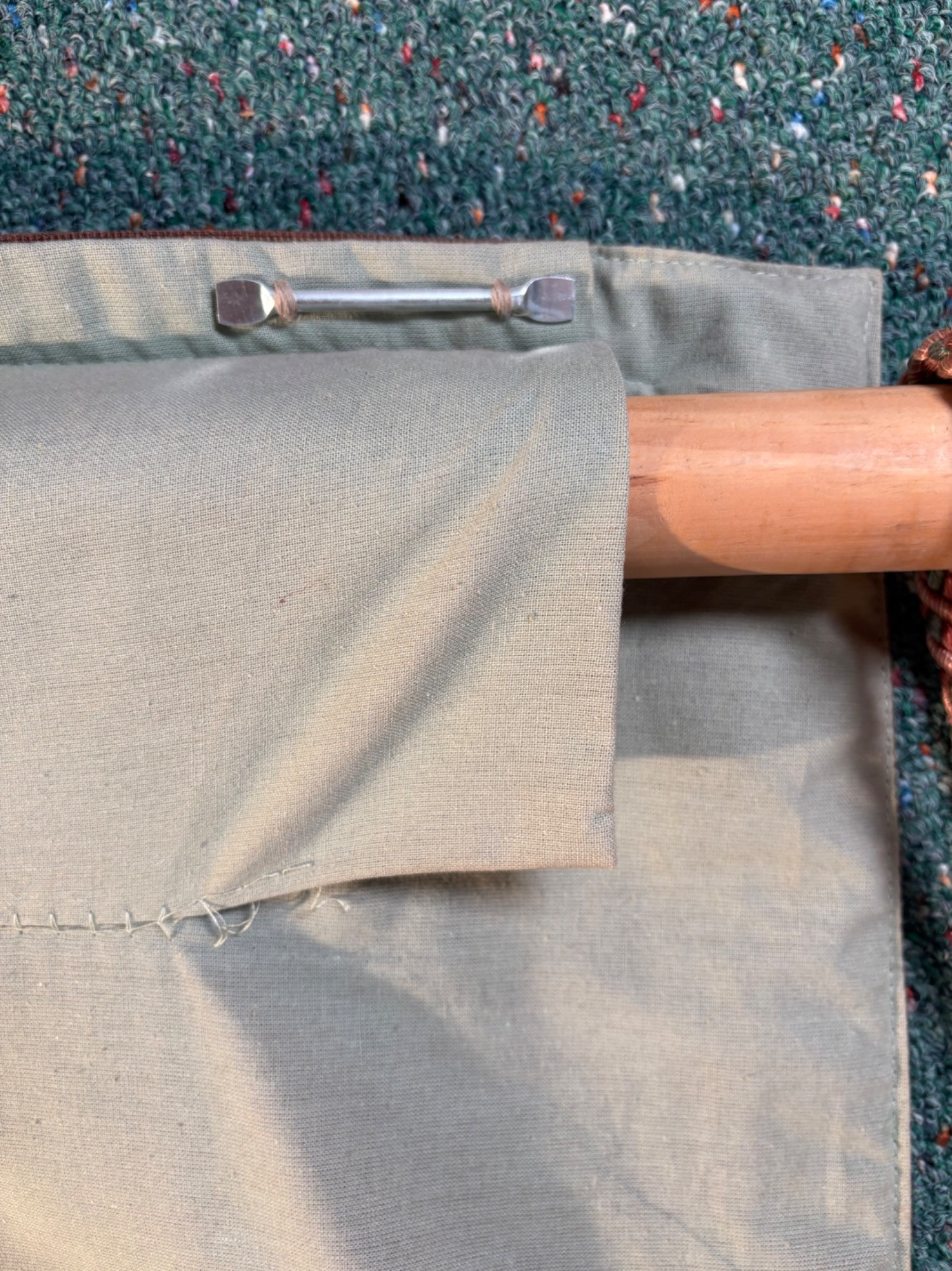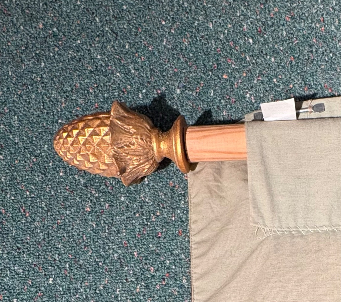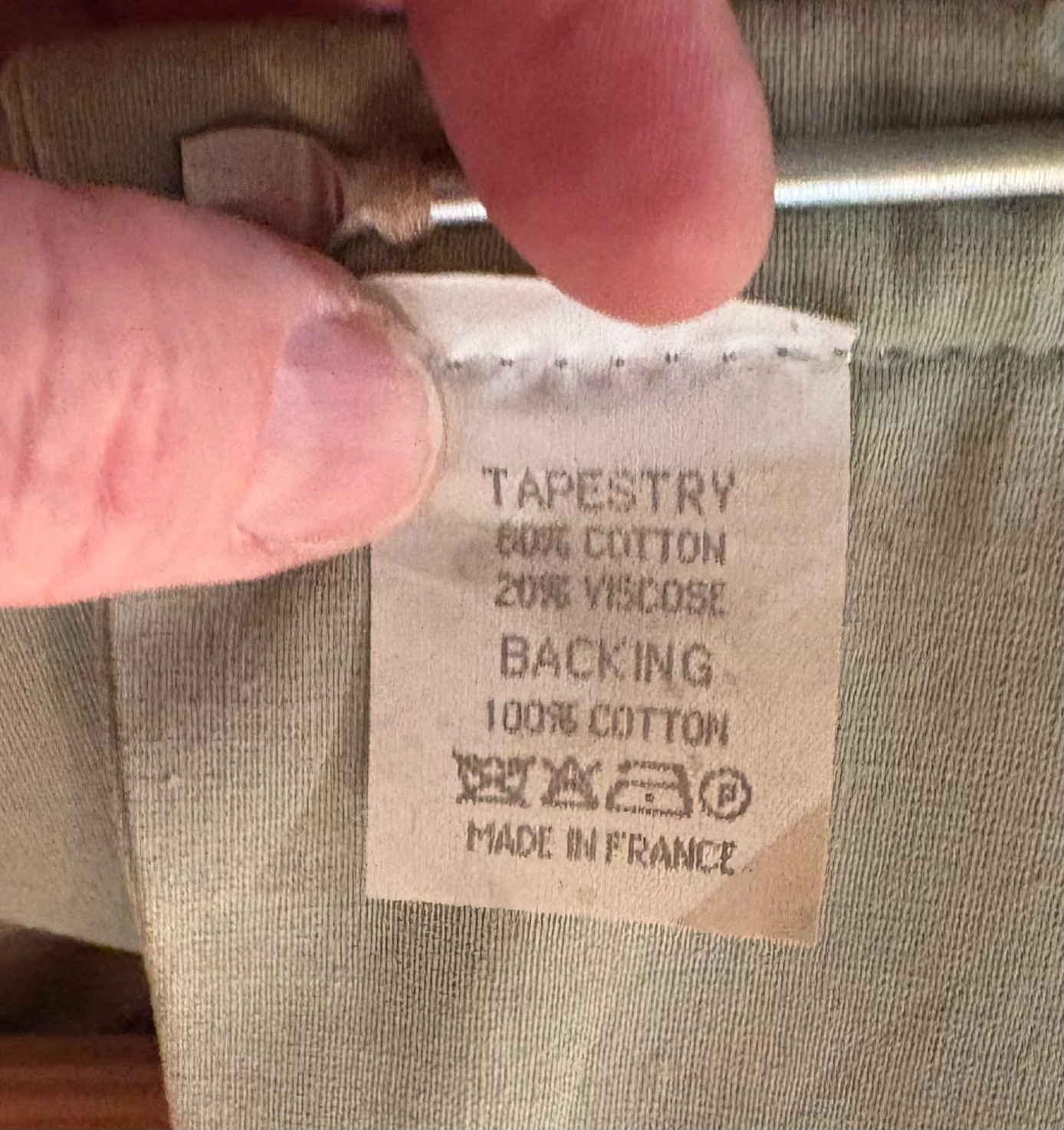 Vintage large French tapestry scene of swans in a lake with surrounding garden greenery. Comes with on wood hanging rod with finials & tassel. It is very large - about 4' high by 7' wide. Nice tight weave & fully lined. Back rod pocket needs a quick whipstitch repair - see last photo. Note: All tapestries listed in this auction are in good condition, but all would benefit from a good wash.
