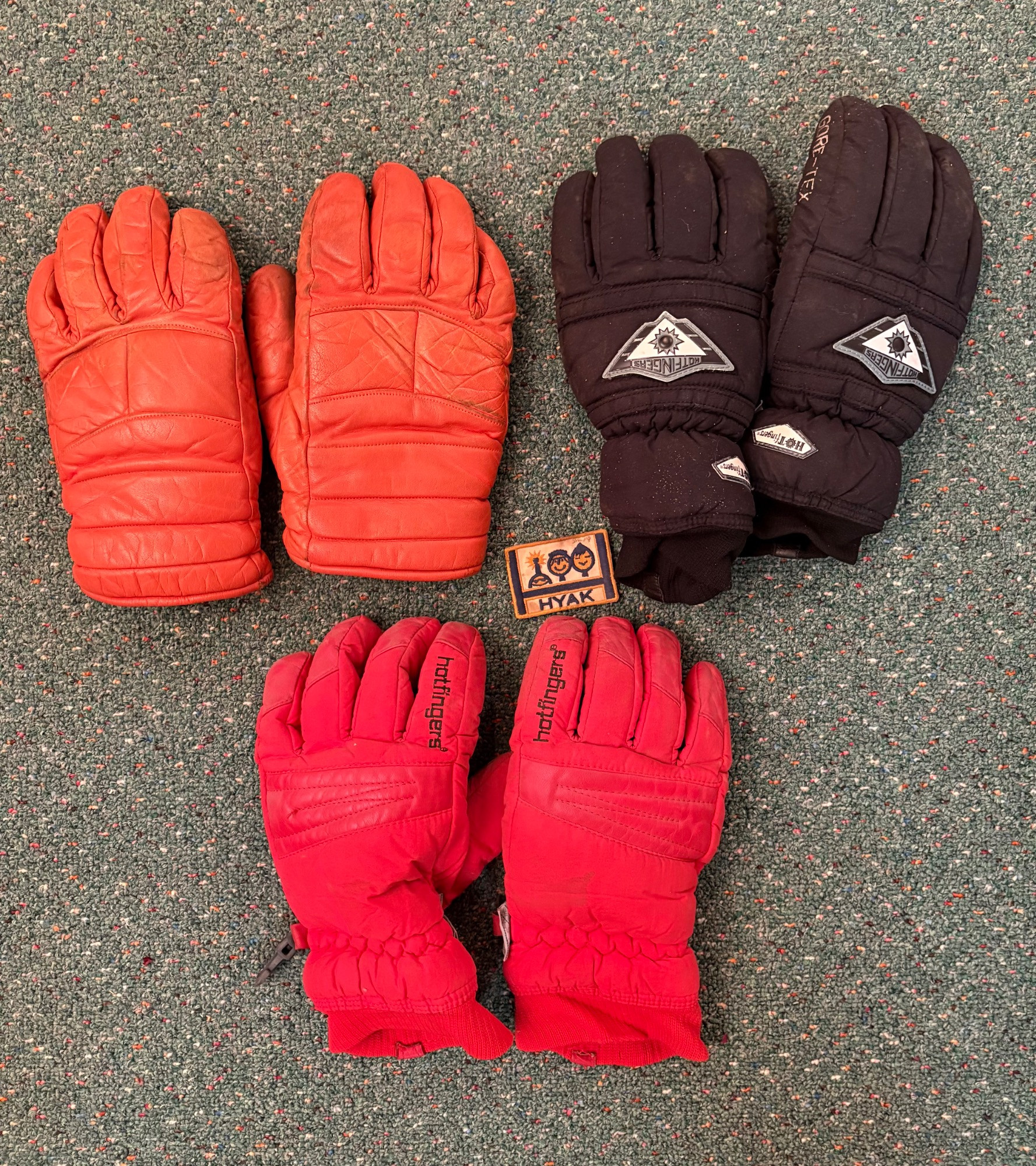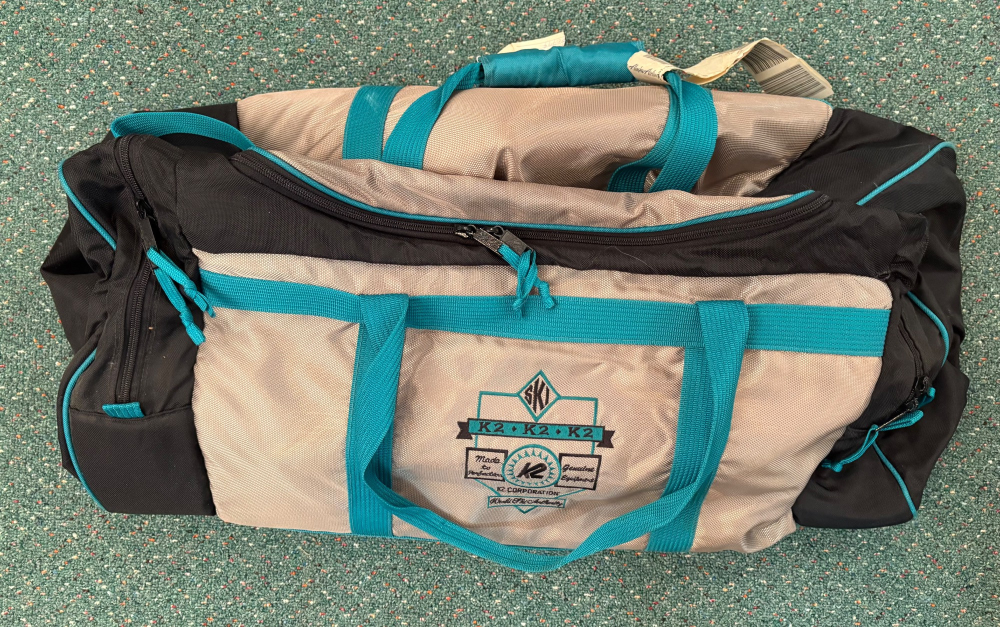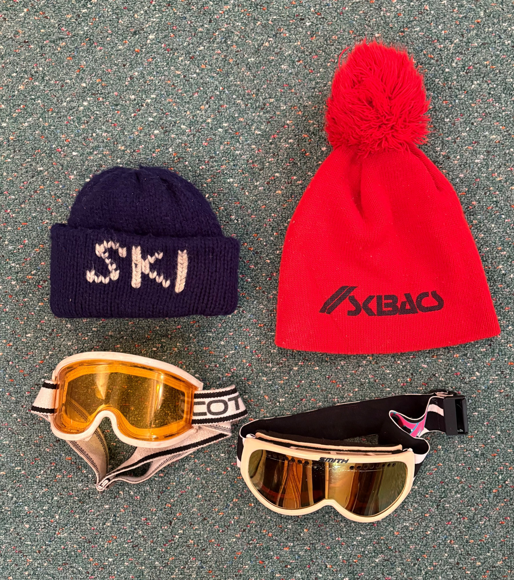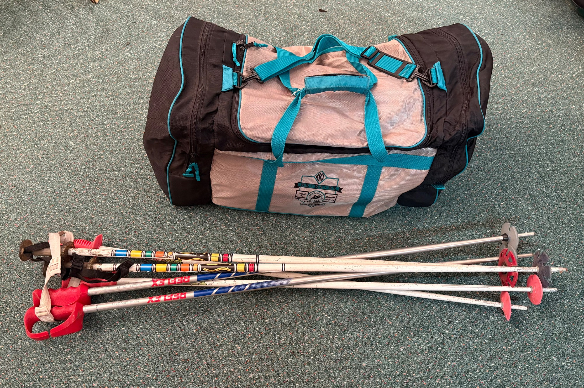 Large group of ski accessories. Lot includes: Raichle Swiss ski boots - size10. Dynafit Austrian ski boots - size not found, but probably a 10 given client's shoe size. 2 vintage ski hats with the blue one needing a good sweater shave. 2 vintage pairs of Smith and Scott goggles - both need a good wash and some foam replacement. 3 pairs of ski poles - brands include K2, Reflex, and Scott. The Reflex pair appears to be slightly bowed. We’re not skiers so we don’t know if that disqualifies from use - please see photo 1 pair of men’s Skitique underlayer overalls of cotton and nylon with soft terry-cloth interior - size 36. 1 old-fashioned ski carrier cinch. 3 pairs of vintage gloves - the orange ones are leather. Good-size K2 ski duffle bag (all items in lot except poles fit and there's still lots of room) BONUS: 2 vintage VCR tapes not in lead photo.