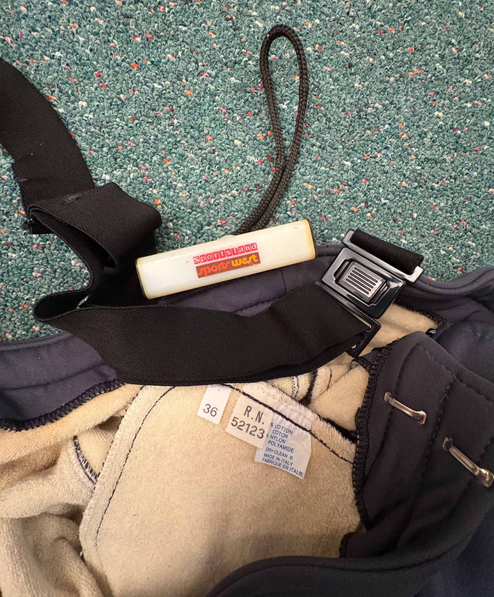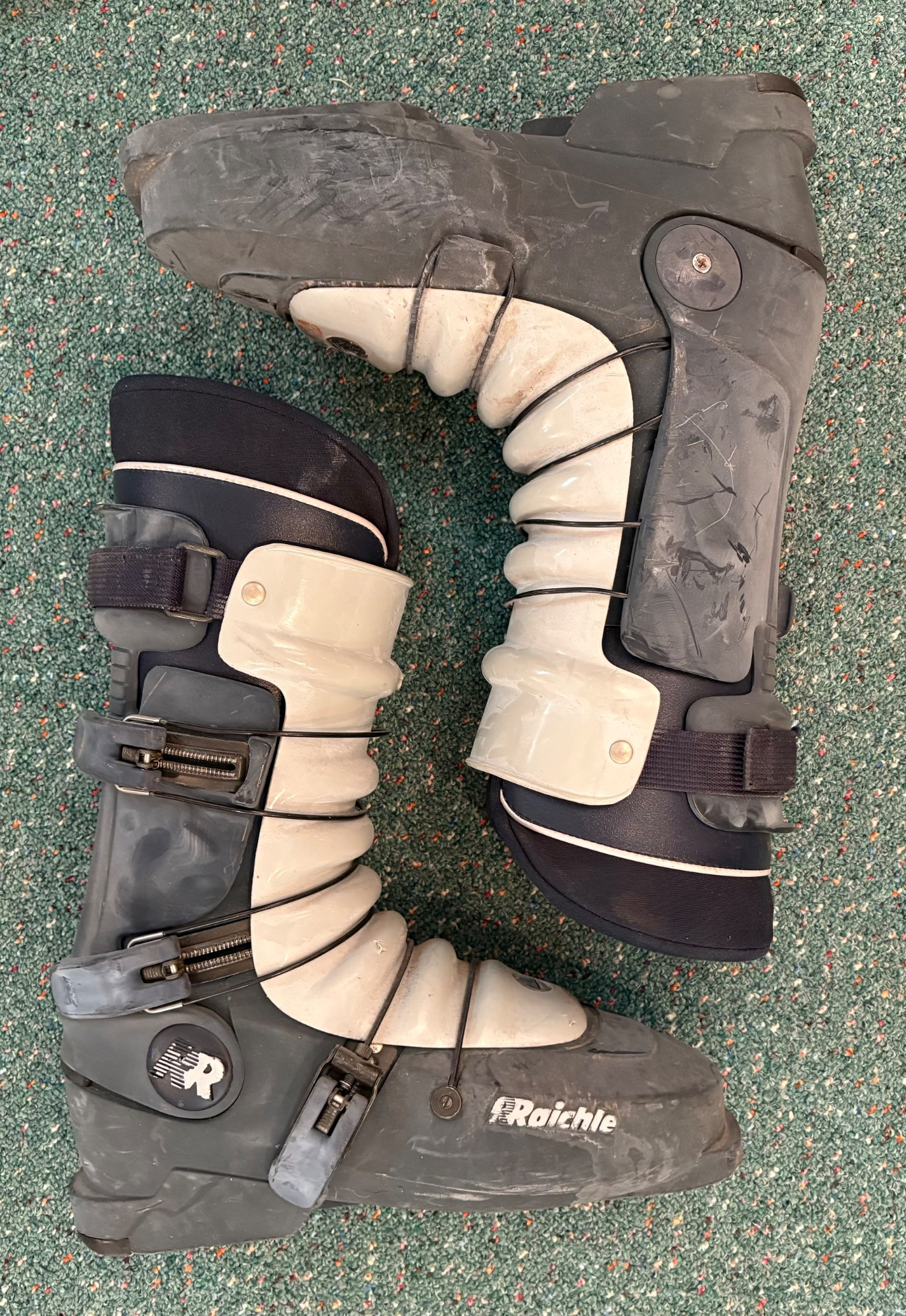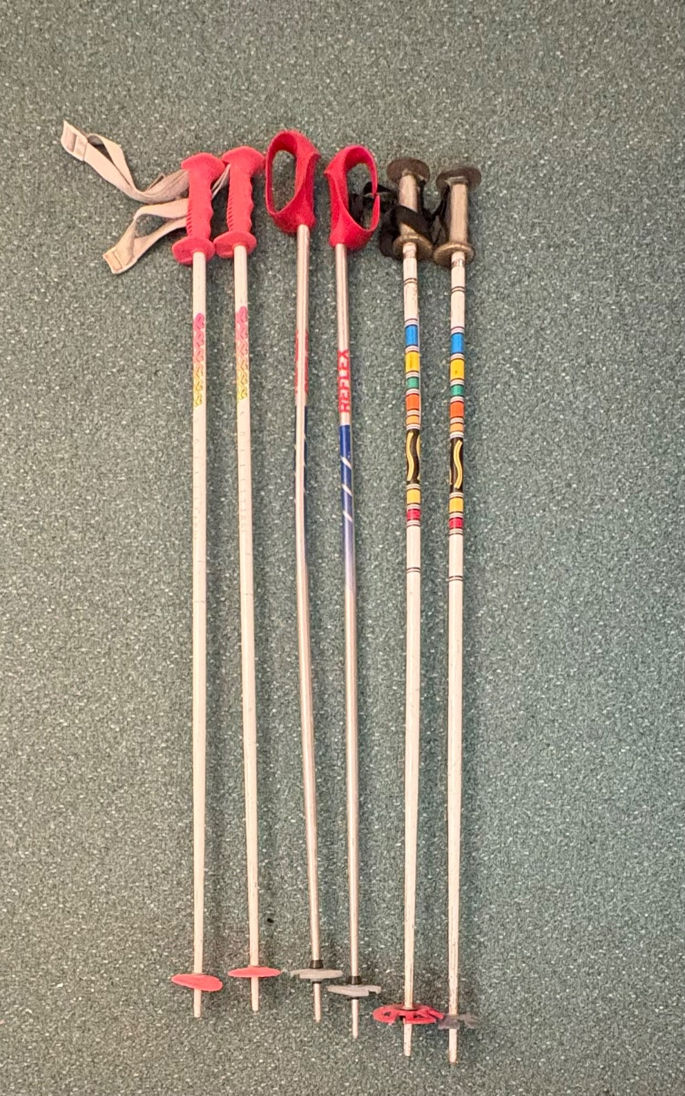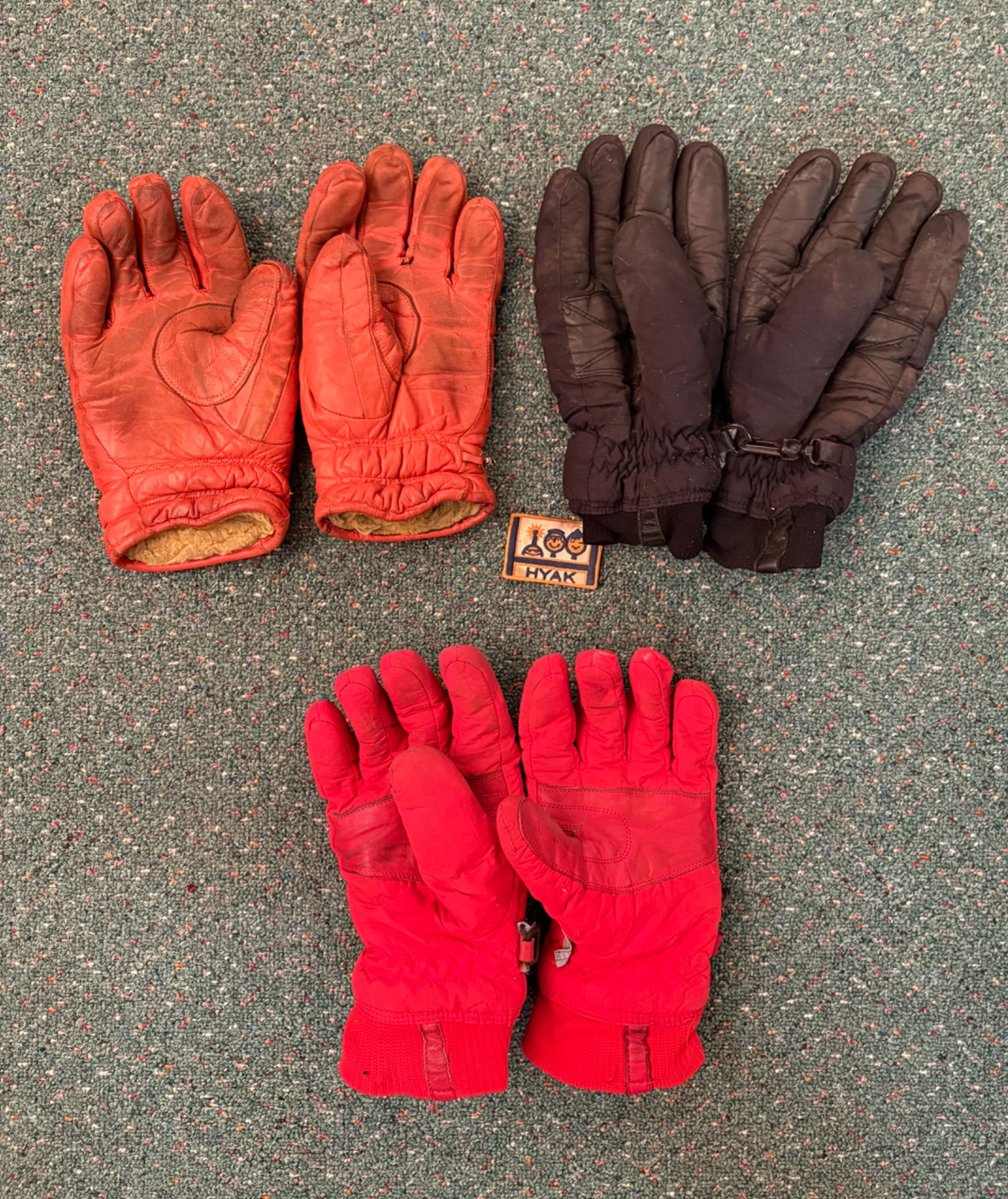 Large group of ski accessories. Lot includes: Raichle Swiss ski boots - size10. Dynafit Austrian ski boots - size not found, but probably a 10 given client's shoe size. 2 vintage ski hats with the blue one needing a good sweater shave. 2 vintage pairs of Smith and Scott goggles - both need a good wash and some foam replacement. 3 pairs of ski poles - brands include K2, Reflex, and Scott. The Reflex pair appears to be slightly bowed. We’re not skiers so we don’t know if that disqualifies from use - please see photo 1 pair of men’s Skitique underlayer overalls of cotton and nylon with soft terry-cloth interior - size 36. 1 old-fashioned ski carrier cinch. 3 pairs of vintage gloves - the orange ones are leather. Good-size K2 ski duffle bag (all items in lot except poles fit and there's still lots of room) BONUS: 2 vintage VCR tapes not in lead photo.
