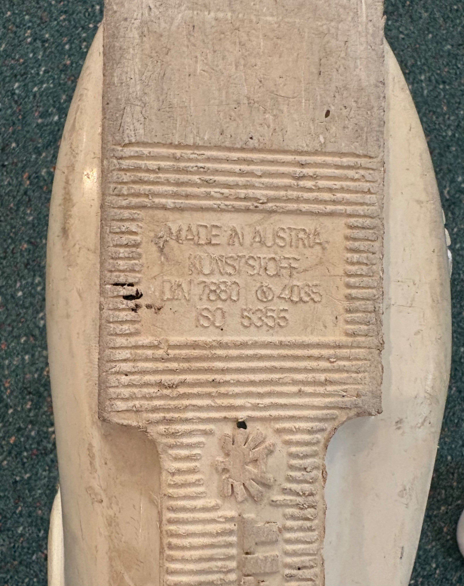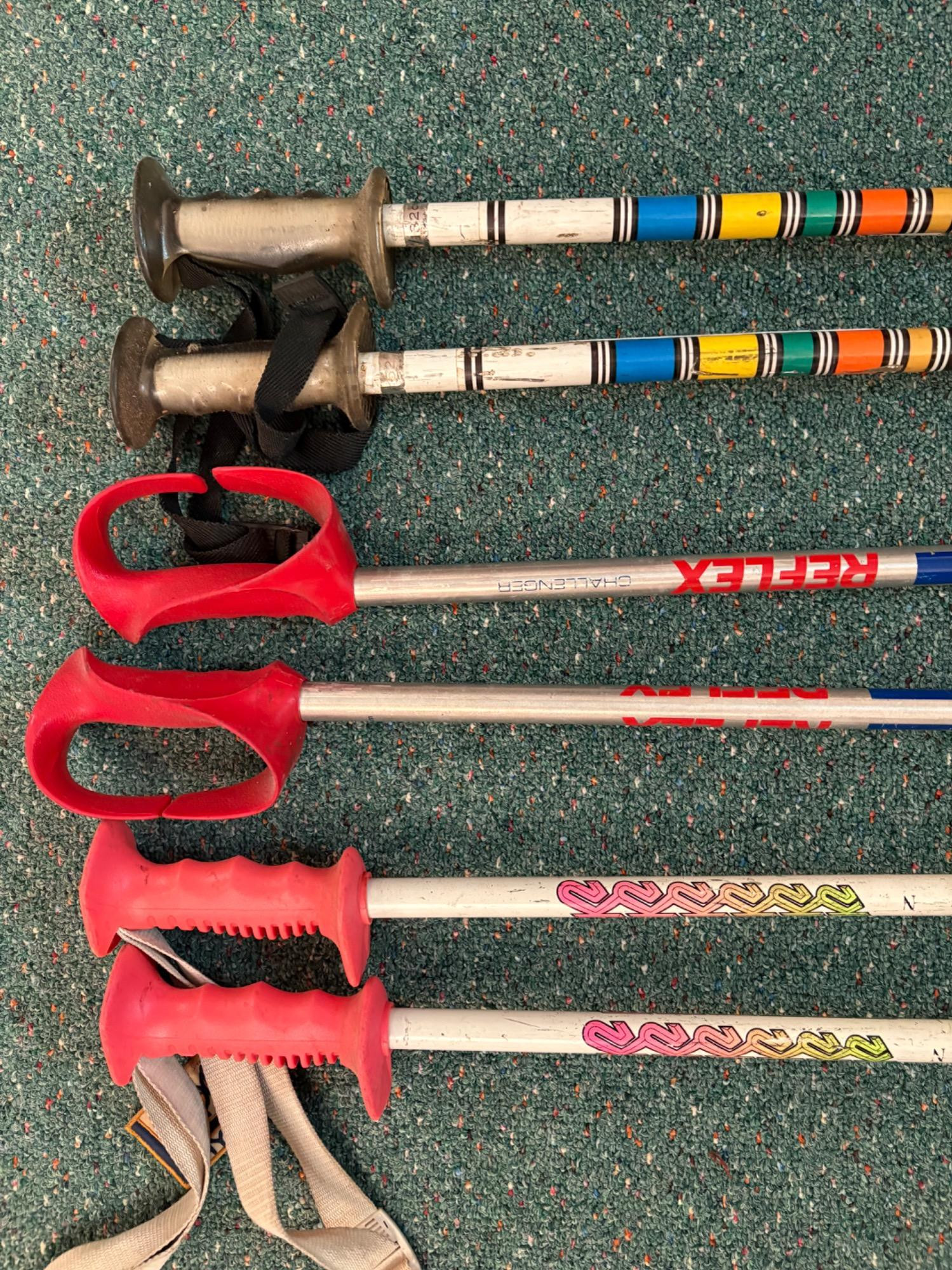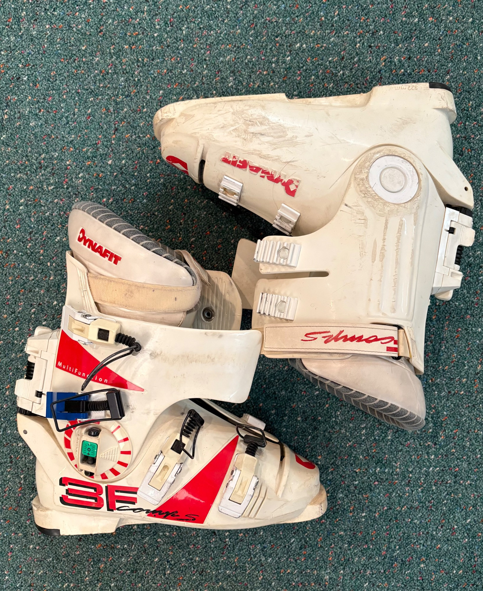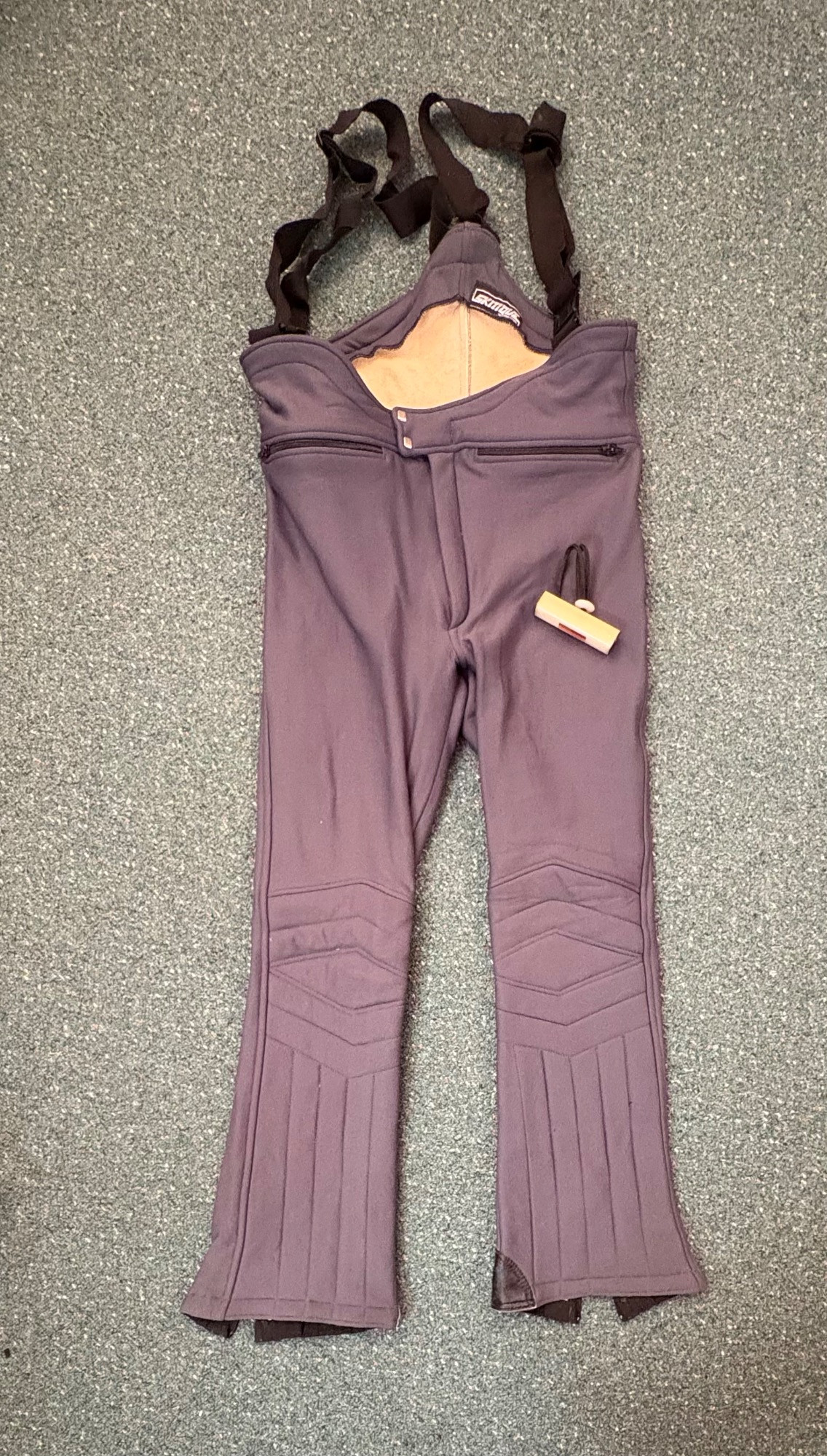 Large group of ski accessories. Lot includes: Raichle Swiss ski boots - size10. Dynafit Austrian ski boots - size not found, but probably a 10 given client's shoe size. 2 vintage ski hats with the blue one needing a good sweater shave. 2 vintage pairs of Smith and Scott goggles - both need a good wash and some foam replacement. 3 pairs of ski poles - brands include K2, Reflex, and Scott. The Reflex pair appears to be slightly bowed. We’re not skiers so we don’t know if that disqualifies from use - please see photo 1 pair of men’s Skitique underlayer overalls of cotton and nylon with soft terry-cloth interior - size 36. 1 old-fashioned ski carrier cinch. 3 pairs of vintage gloves - the orange ones are leather. Good-size K2 ski duffle bag (all items in lot except poles fit and there's still lots of room) BONUS: 2 vintage VCR tapes not in lead photo.