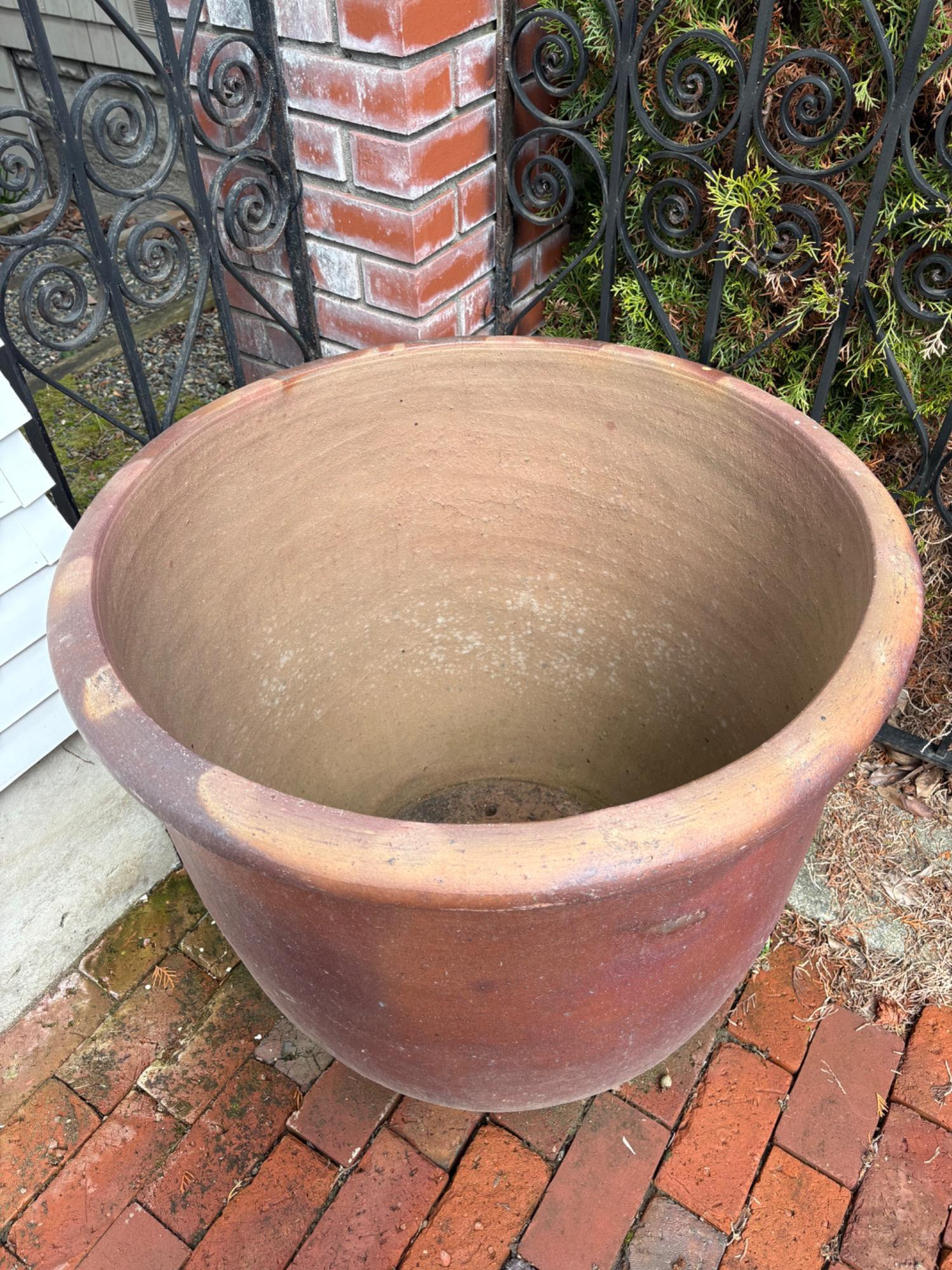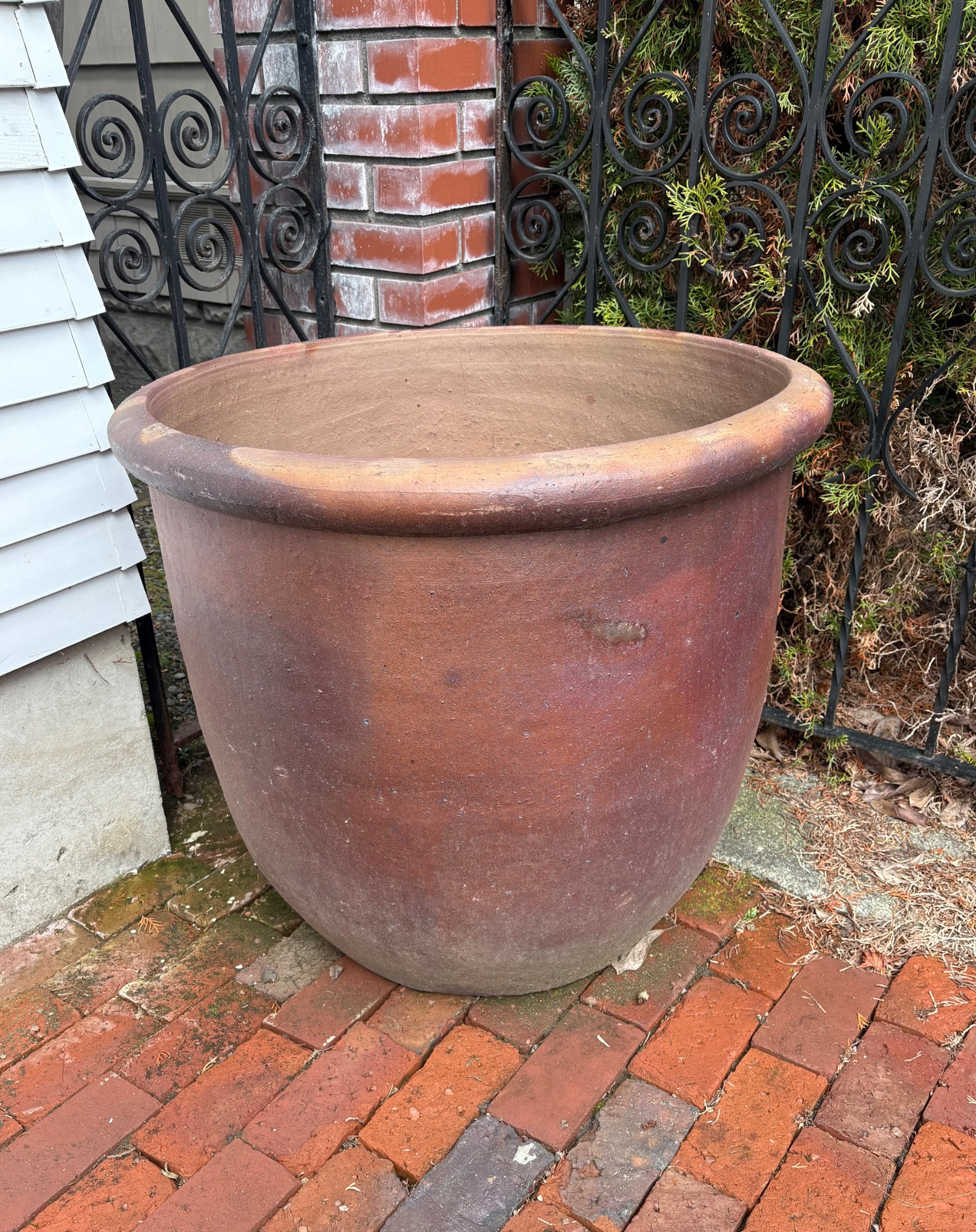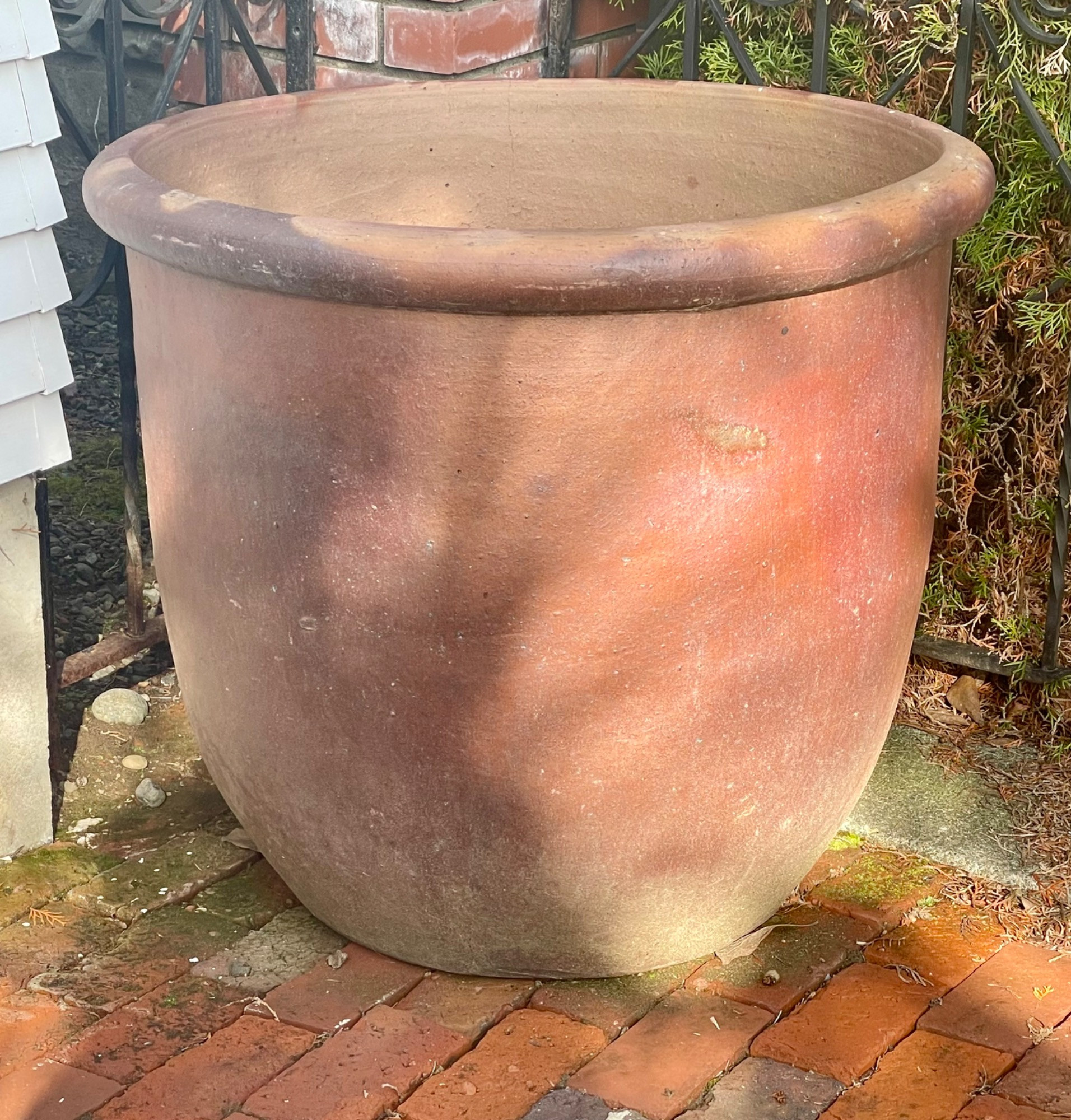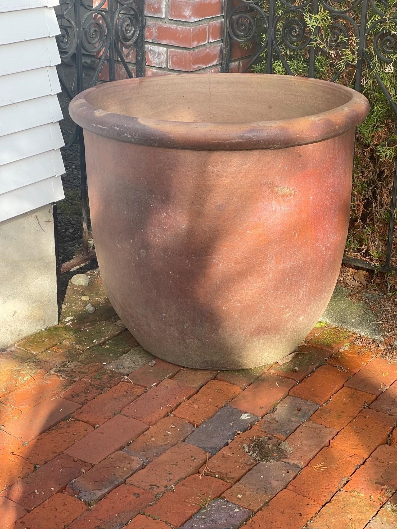 Huge outdoor ceramic planter pot - lightly glazed on the exterior with three drain holes. No flaws noticed. This is really big and can handle very large plants (The last photo is to show how big - this is an identical pot in size that has a mature palm tree comfortably growing in it) Measures 29” H x 32.5” W x 32.5” D.
