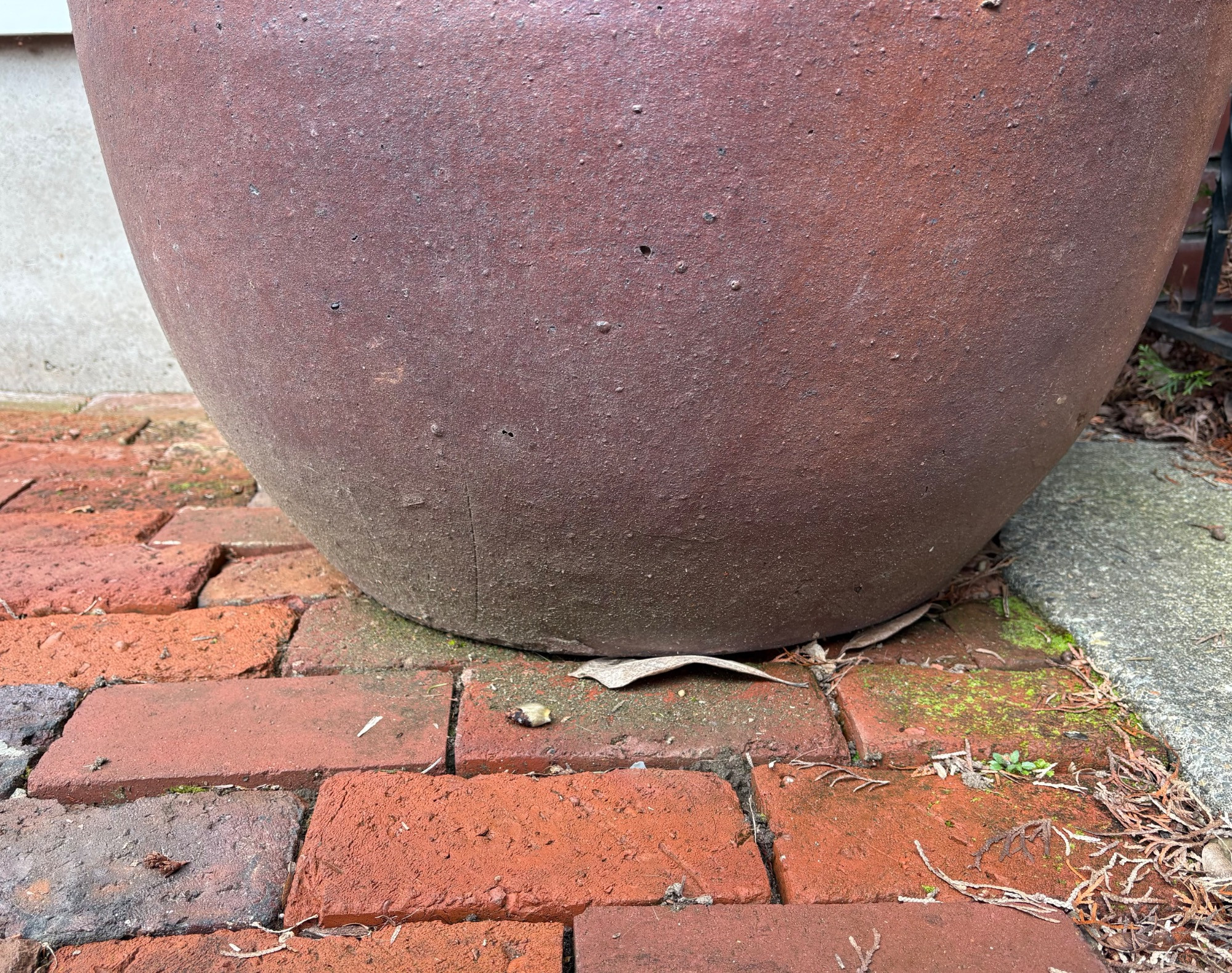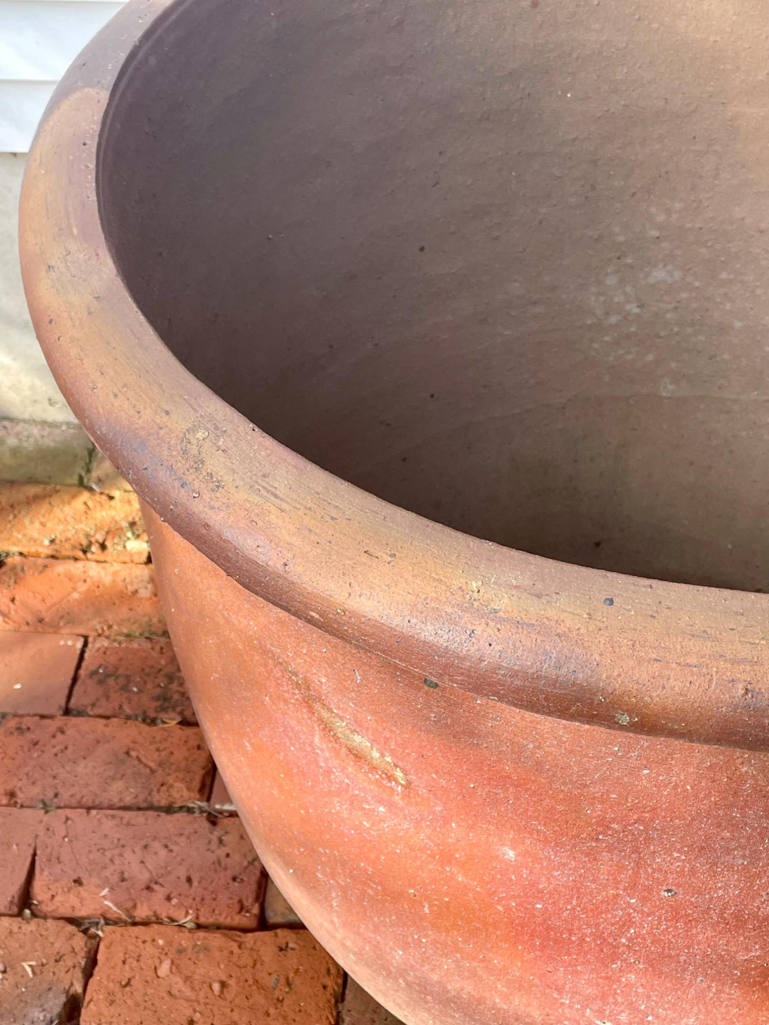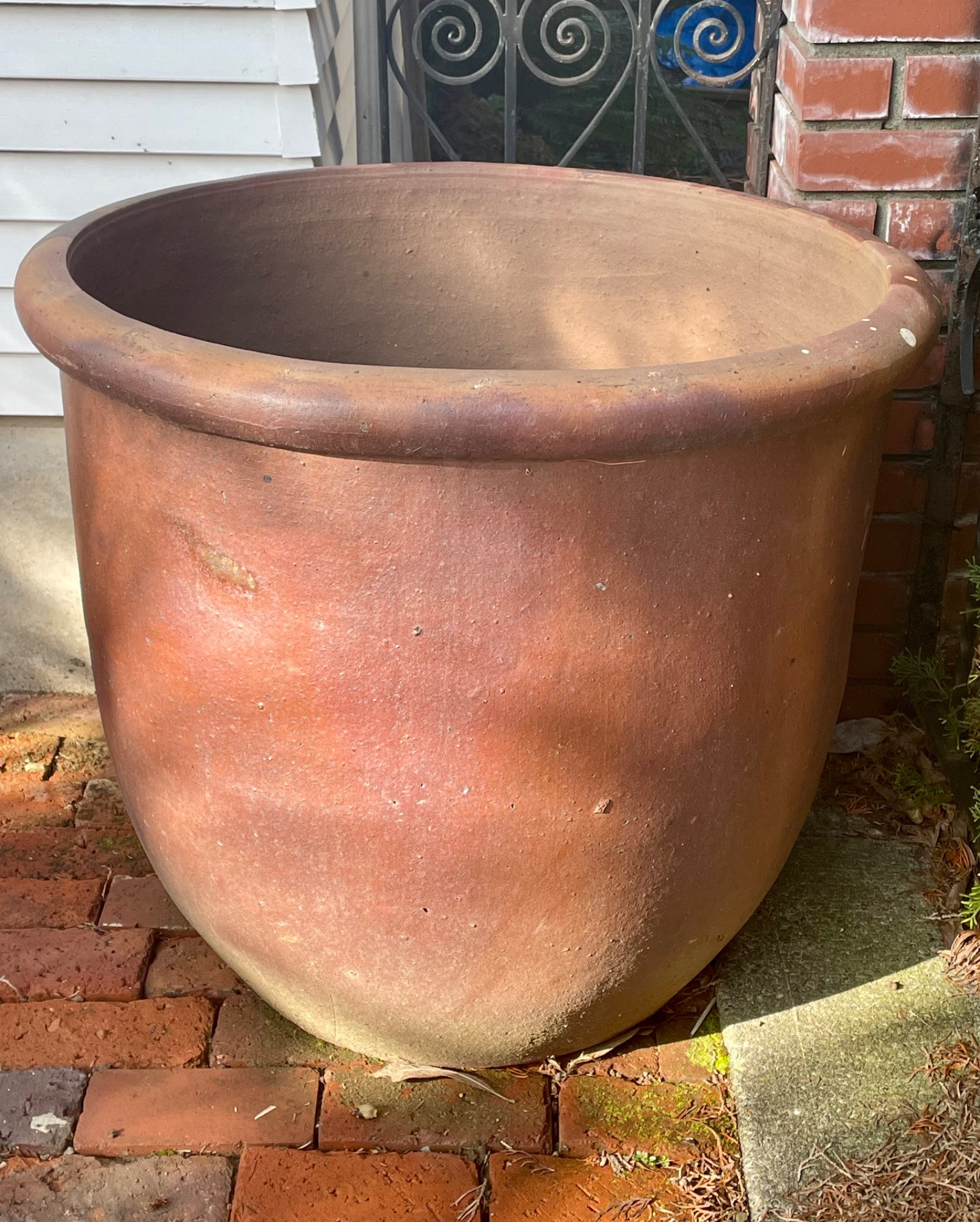 Huge outdoor ceramic planter pot - lightly glazed on the exterior with three drain holes. No flaws noticed. This is really big and can handle very large plants (The last photo is to show how big - this is an identical pot in size that has a mature palm tree comfortably growing in it) Measures 29” H x 32.5” W x 32.5” D.