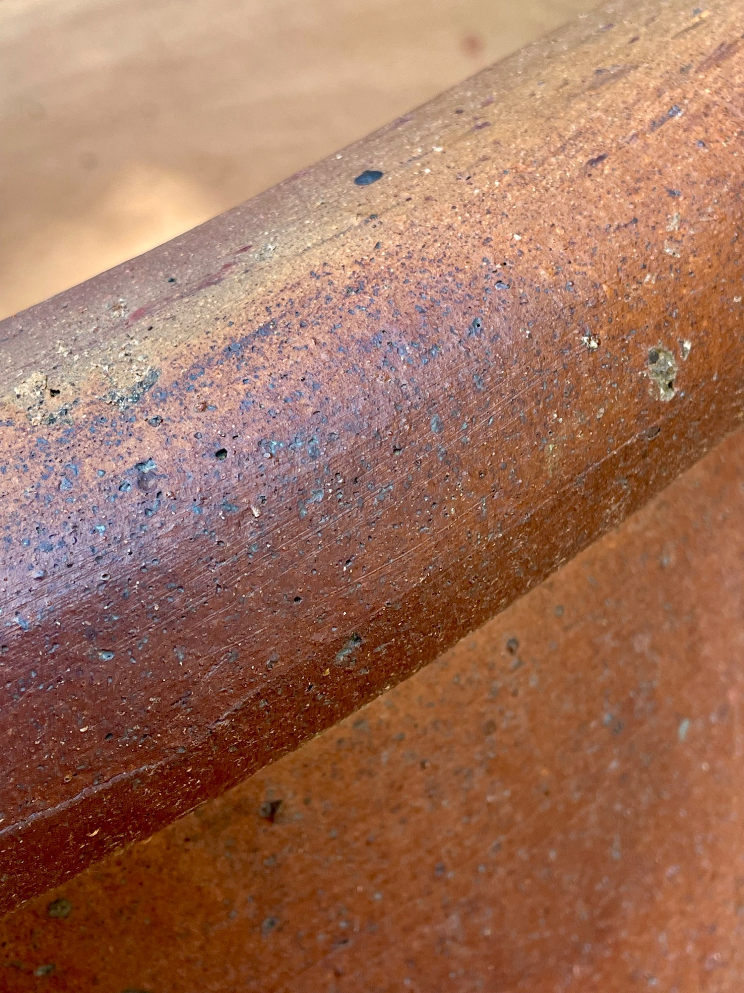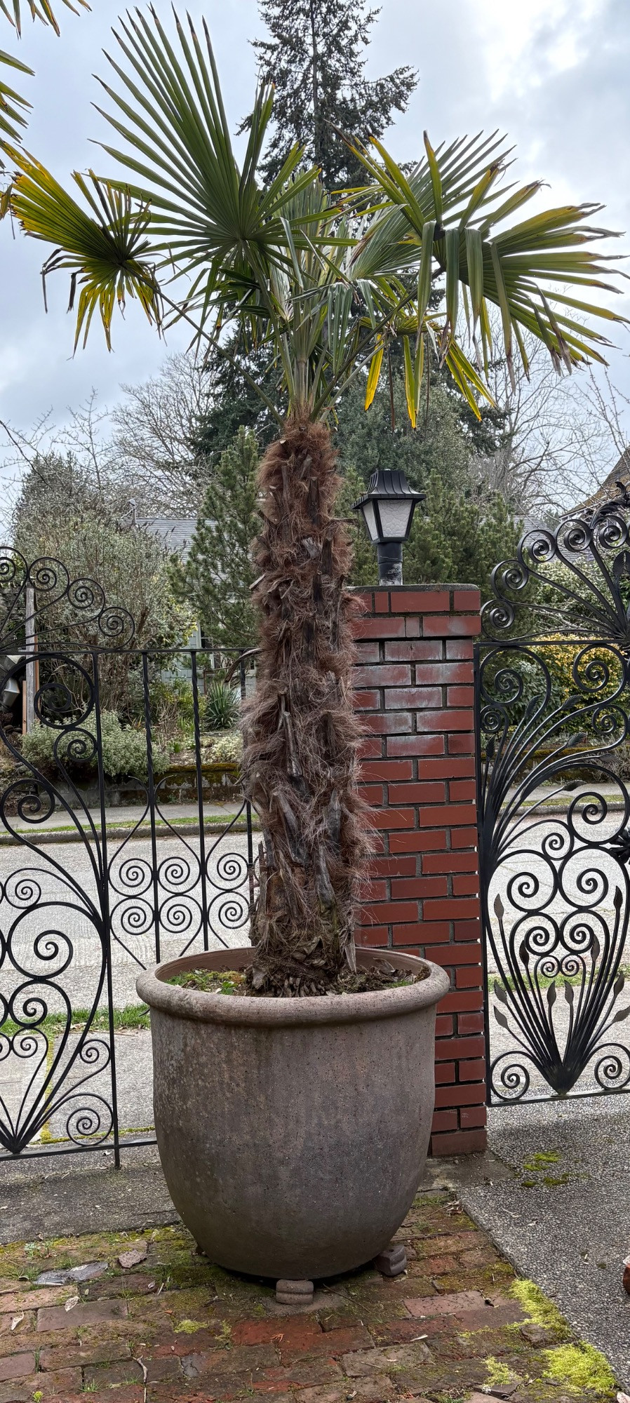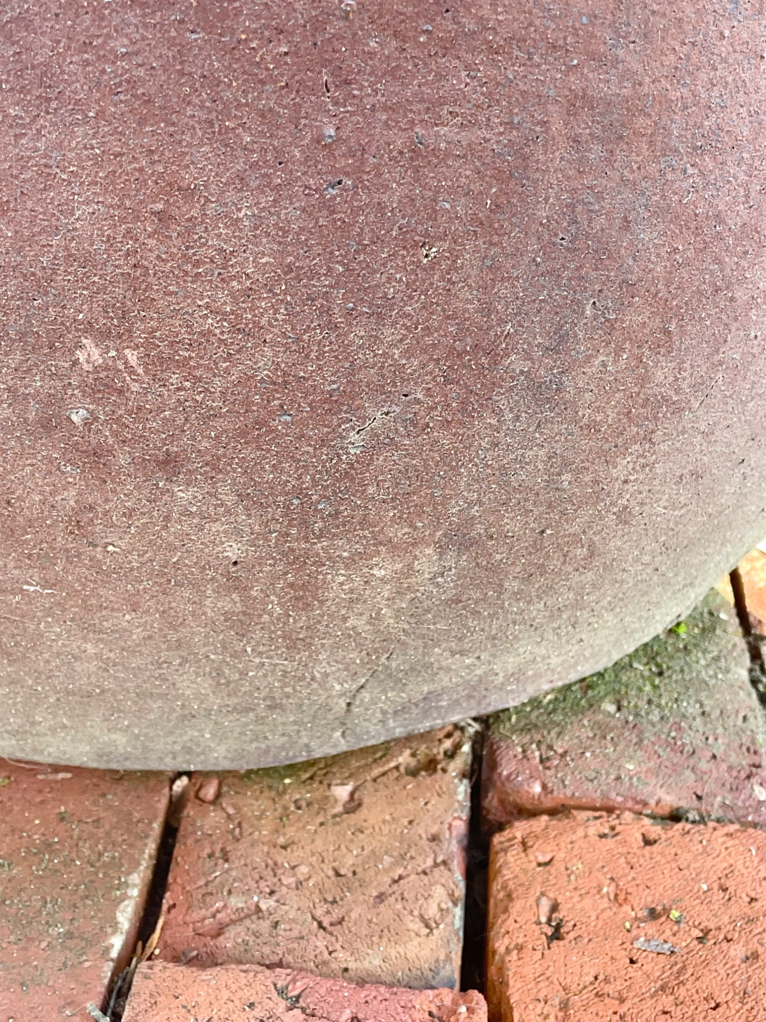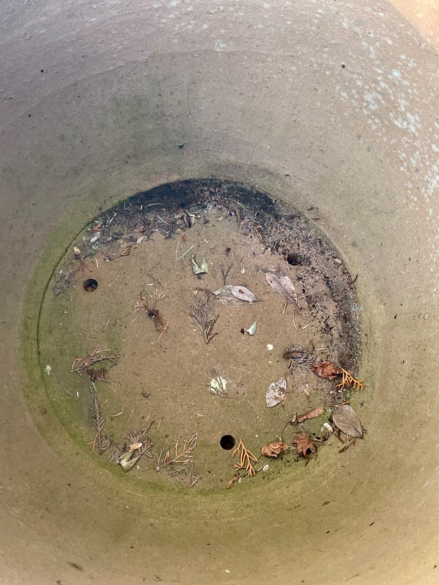 Huge outdoor ceramic planter pot - lightly glazed on the exterior with three drain holes. No flaws noticed. This is really big and can handle very large plants (The last photo is to show how big - this is an identical pot in size that has a mature palm tree comfortably growing in it) Measures 29” H x 32.5” W x 32.5” D.
