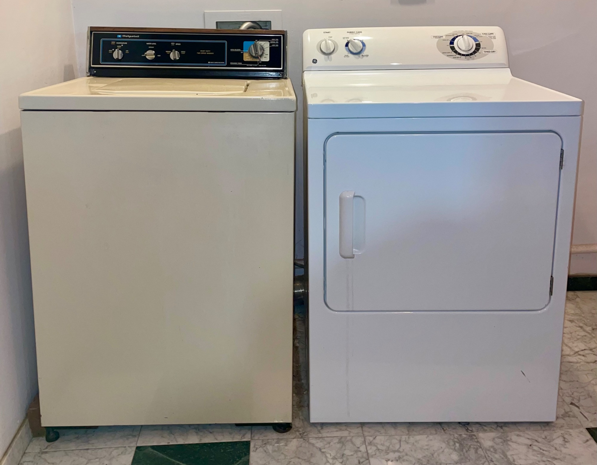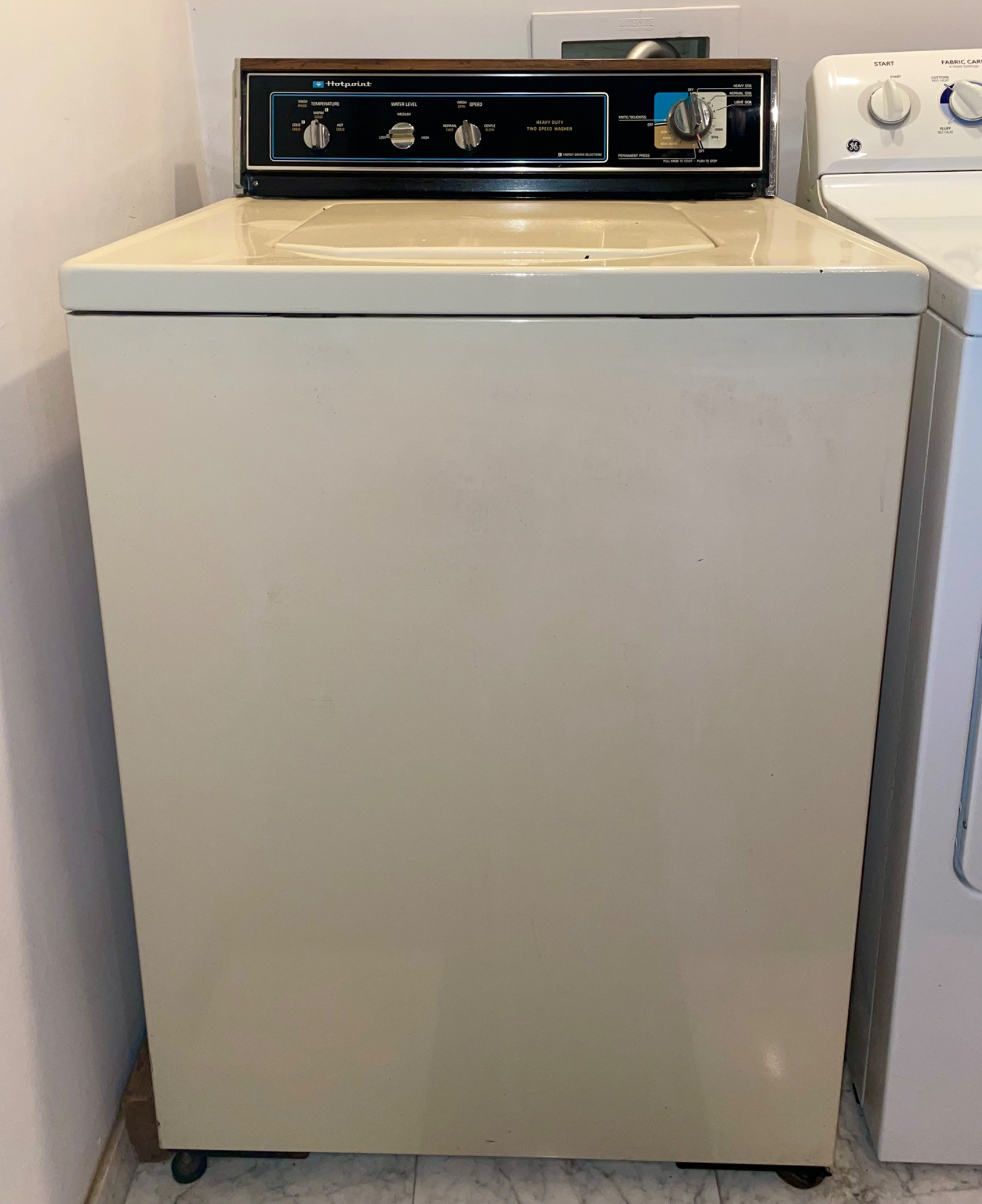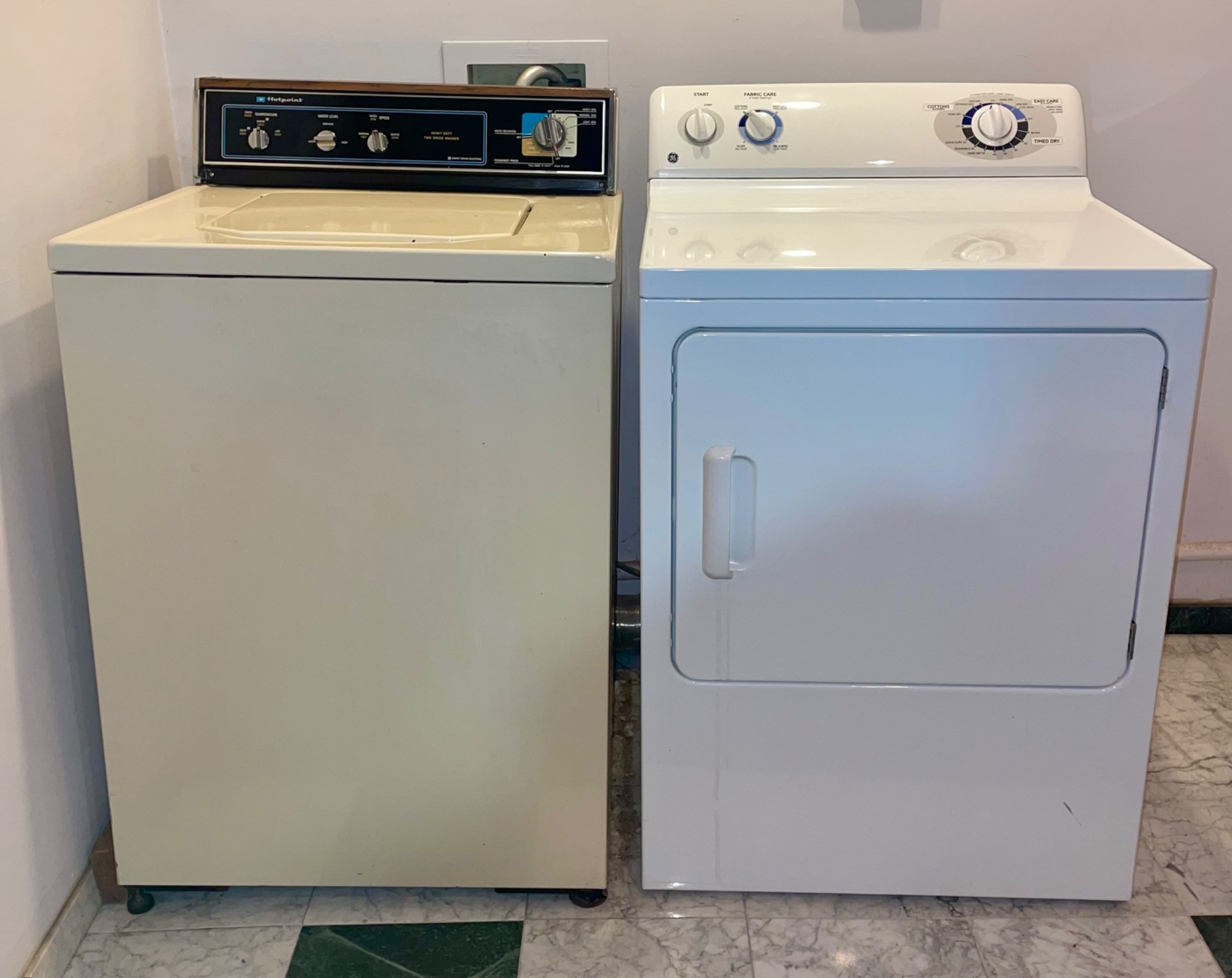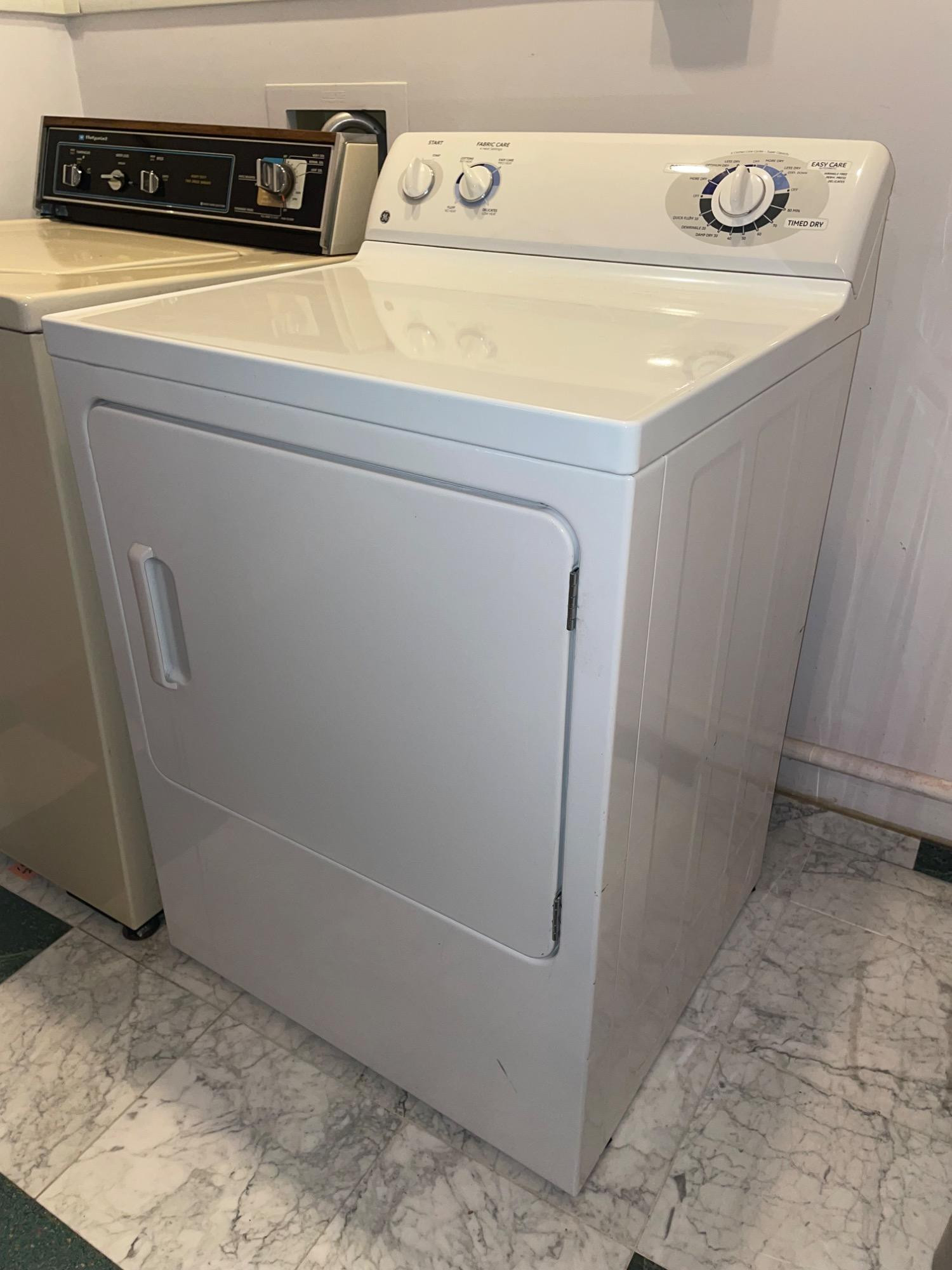 OK, they aren't pretty, but they got the job done right for our client - a man who showered AFTER work rather than before (in other words, he wasn't sitting behind a desk all day and needed a workhorse washer/dryer). We tried these out and sure enough, the washer get things CLEAN with a real agitator! (We have a newer washer/dryer at home and they just don't work as well as these older models...) Hotpoint washing machine: beige metal body, heavy duty two-speed, with energy saving selections, top loading. Measures 43” H x 27” W x 25” D. General Electric dryer: white metal body, front loading, 4 heat settings, timed dryer. Measures 42.5” H x 27.5” W x 25.5” D. Model #DBSR463EG7WW.