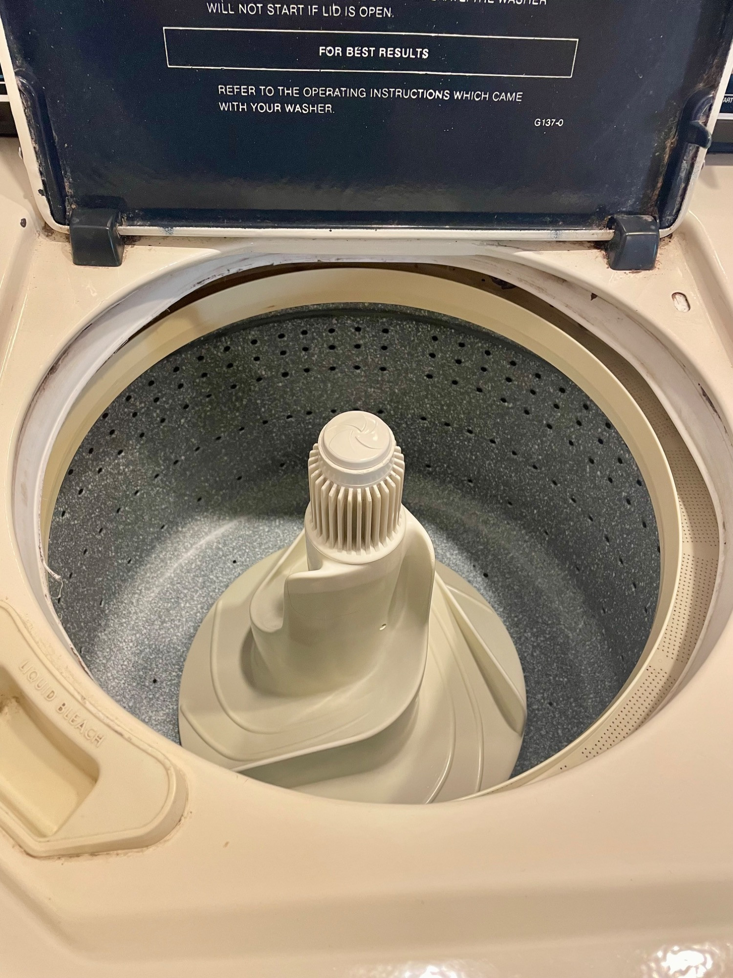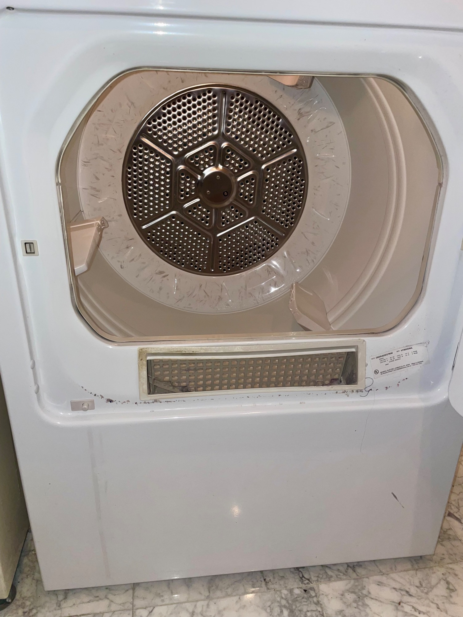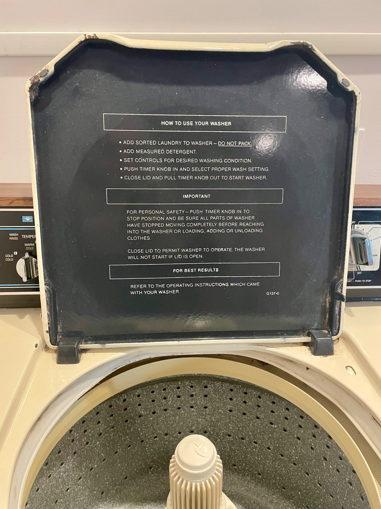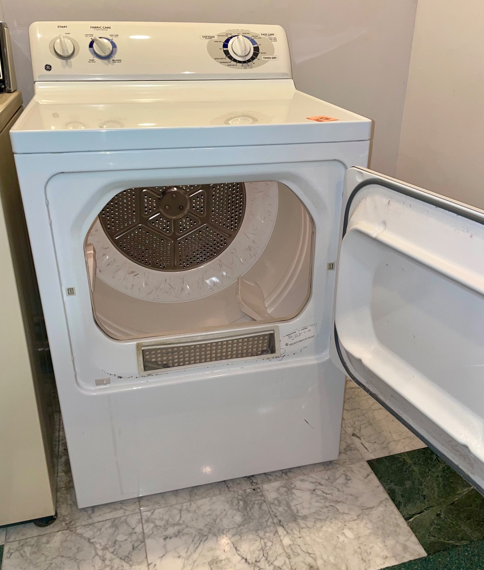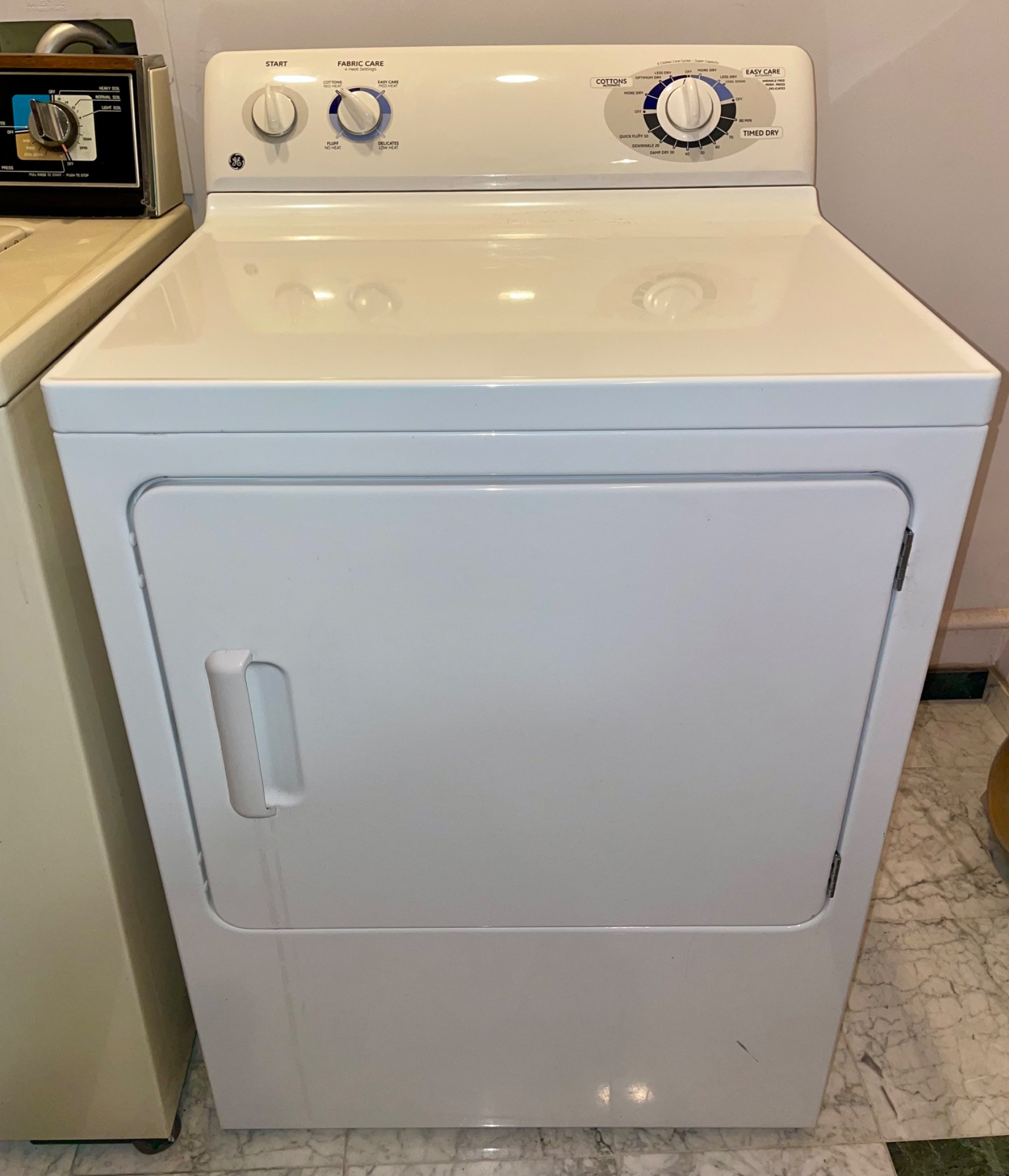 OK, they aren't pretty, but they got the job done right for our client - a man who showered AFTER work rather than before (in other words, he wasn't sitting behind a desk all day and needed a workhorse washer/dryer). We tried these out and sure enough, the washer get things CLEAN with a real agitator! (We have a newer washer/dryer at home and they just don't work as well as these older models...) Hotpoint washing machine: beige metal body, heavy duty two-speed, with energy saving selections, top loading. Measures 43” H x 27” W x 25” D. General Electric dryer: white metal body, front loading, 4 heat settings, timed dryer. Measures 42.5” H x 27.5” W x 25.5” D. Model #DBSR463EG7WW.