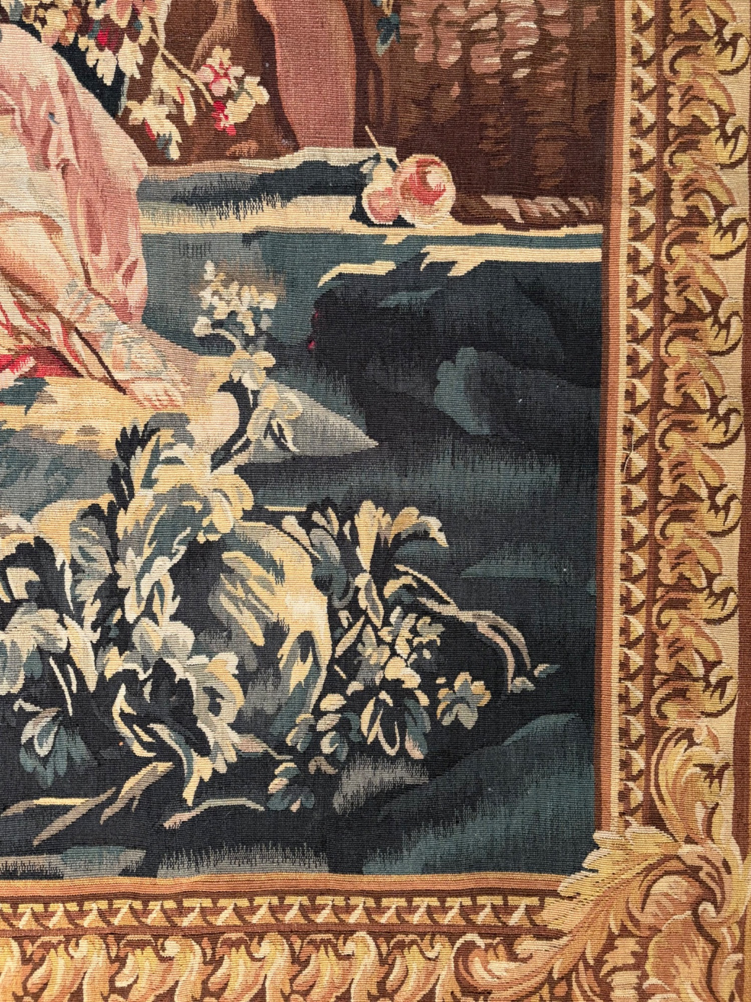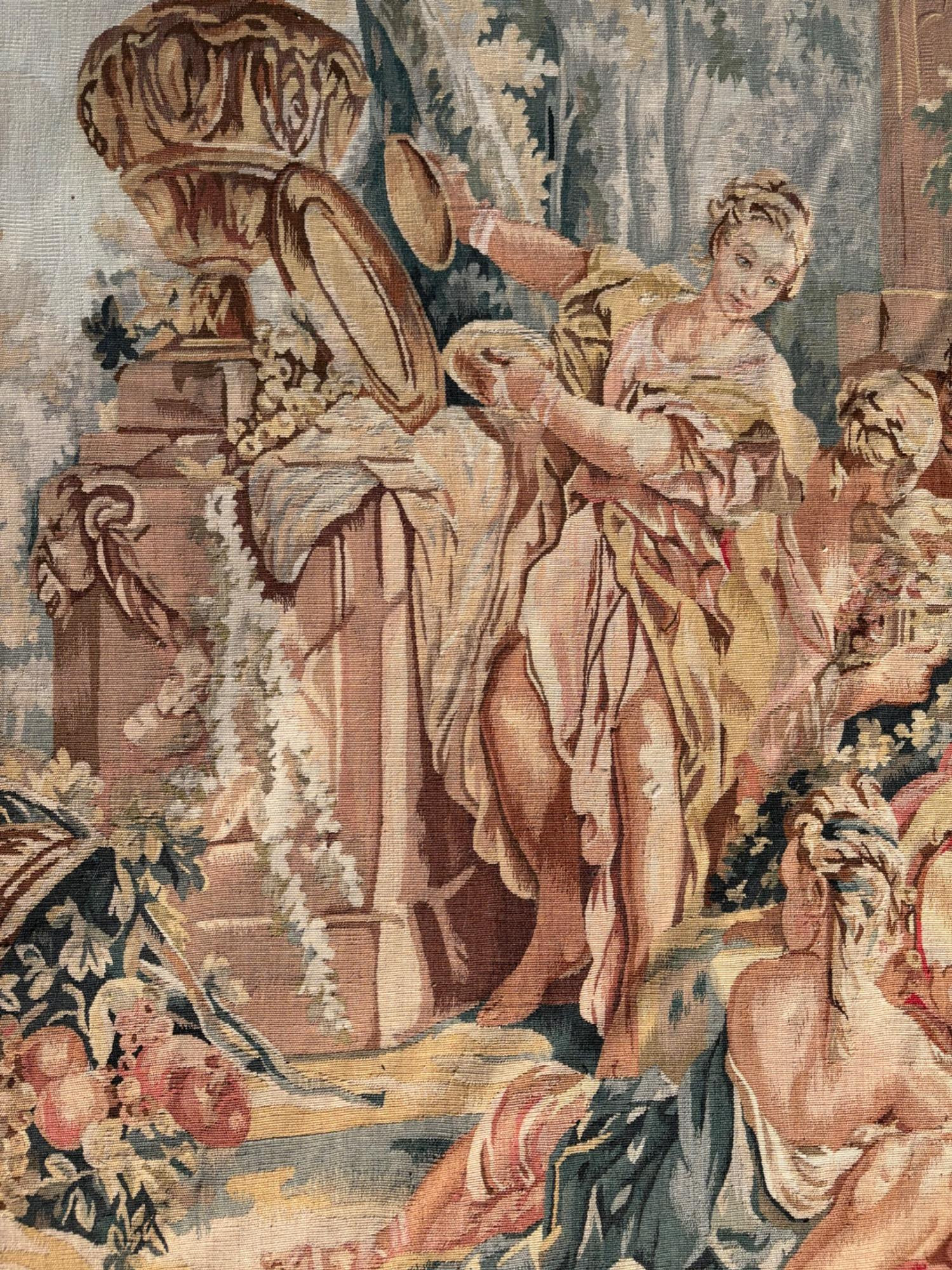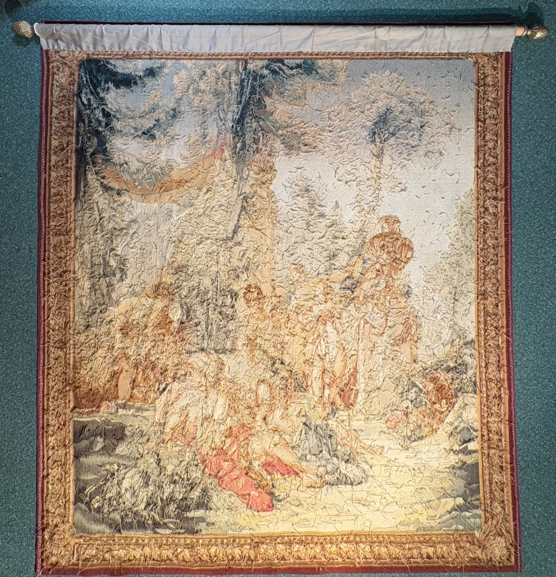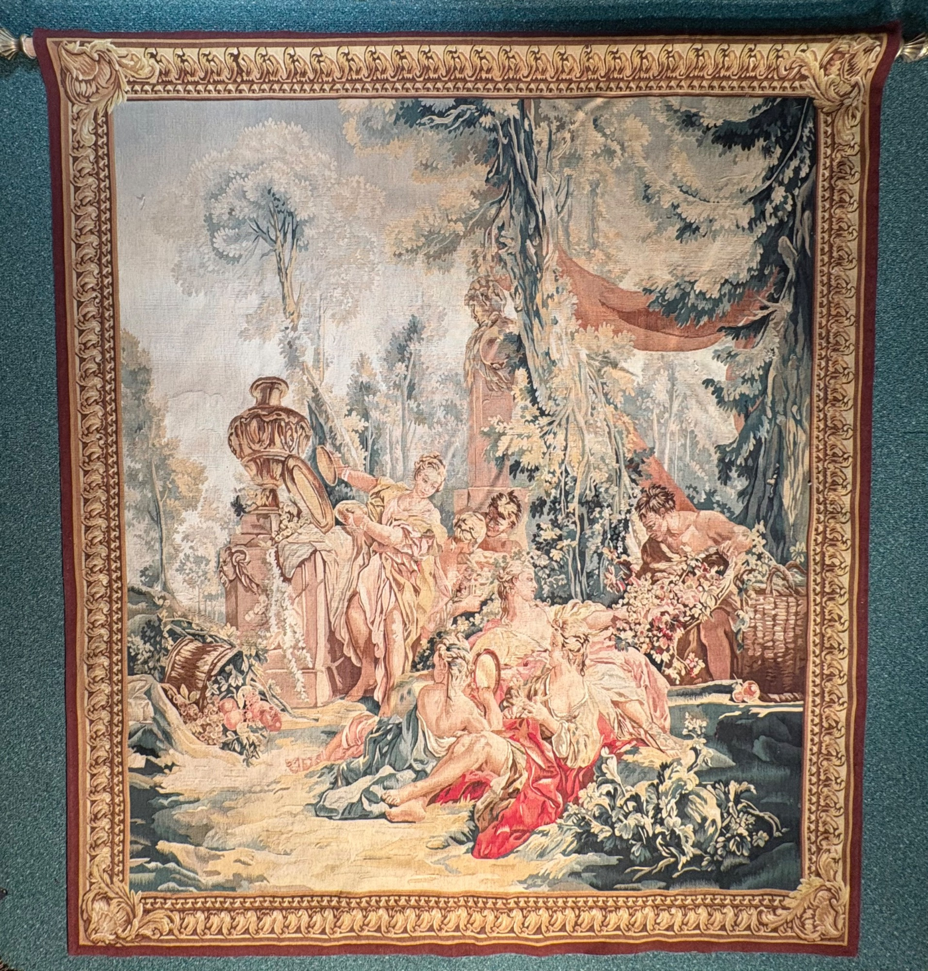 Oversize tapestry in traditional pale color palate with classical figures at an outdoor gathering. Great gold "framing" pattern on the edges. Comes with a sturdy wooden pole and gold wood finials. It is very large - about 7' high by 6' wide. Nice tight weave. Given the quality, we are guessing it was made in France. This is the only tapestry we have in the auction that is unlined, so it is lighter in weight despite its size. Interesting looking at all the threads the linings usually hide! Note: All tapestries listed in this auction are in good condition, but all would benefit from a good wash.