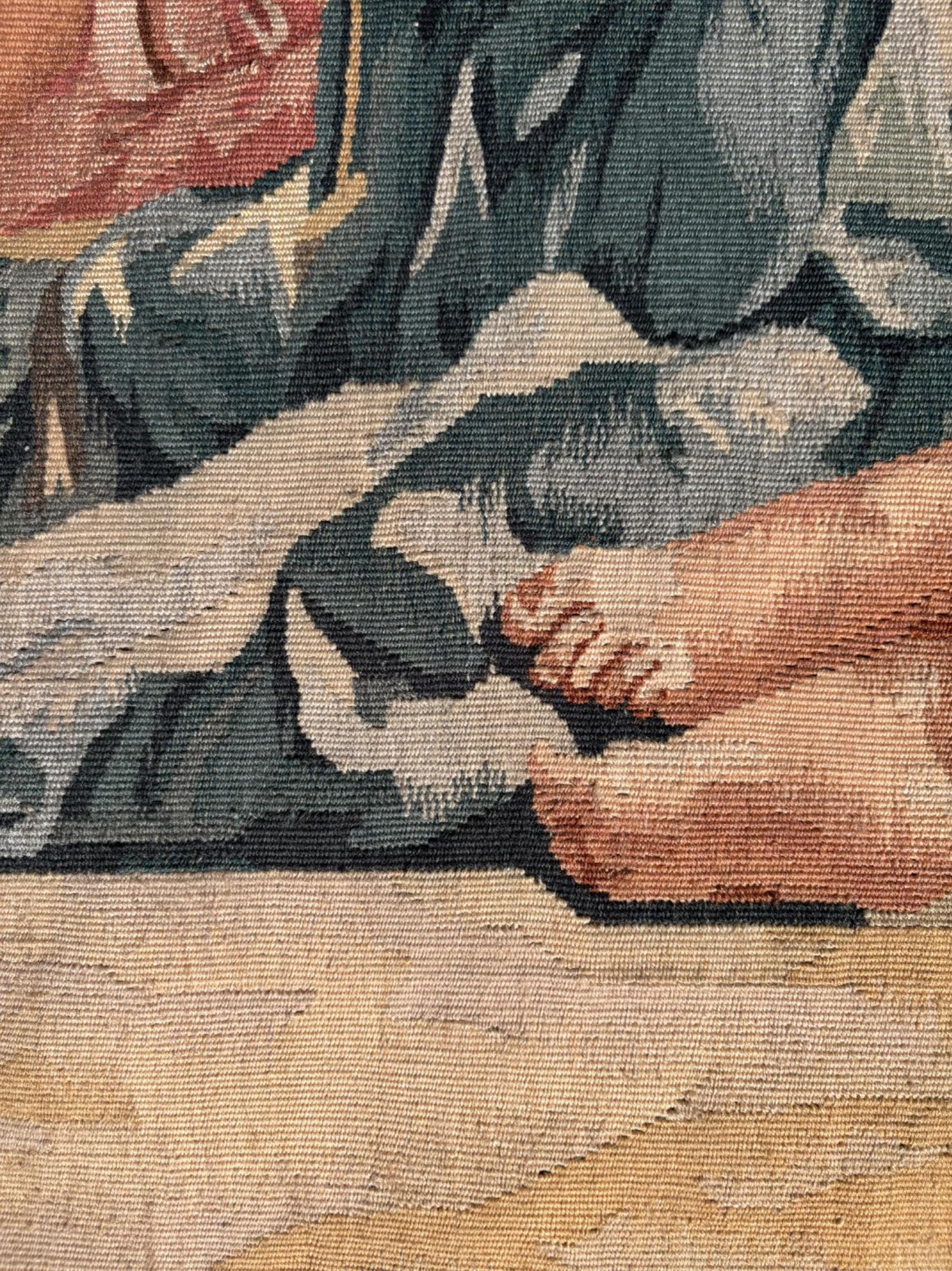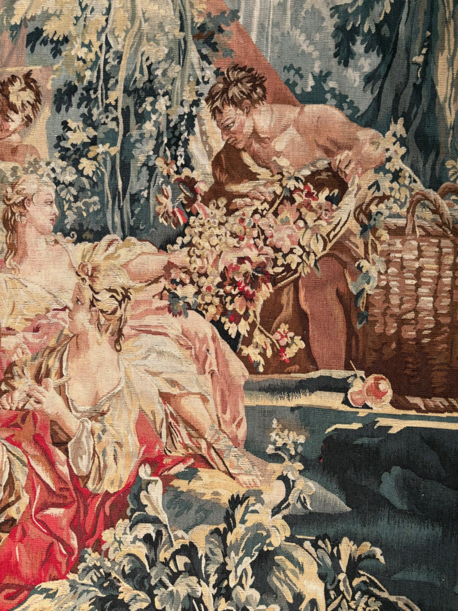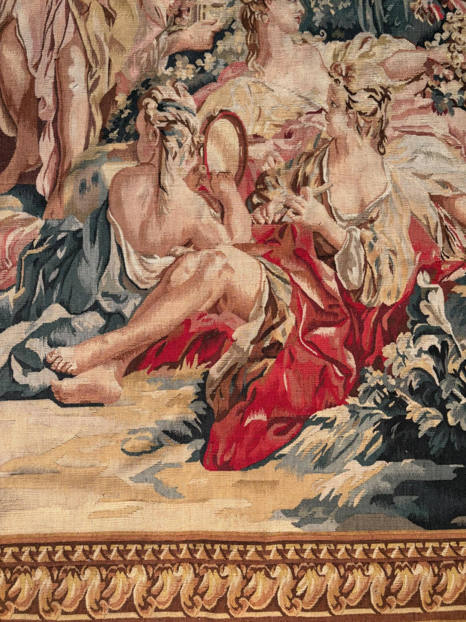 Oversize tapestry in traditional pale color palate with classical figures at an outdoor gathering. Great gold "framing" pattern on the edges. Comes with a sturdy wooden pole and gold wood finials. It is very large - about 7' high by 6' wide. Nice tight weave. Given the quality, we are guessing it was made in France. This is the only tapestry we have in the auction that is unlined, so it is lighter in weight despite its size. Interesting looking at all the threads the linings usually hide! Note: All tapestries listed in this auction are in good condition, but all would benefit from a good wash.
