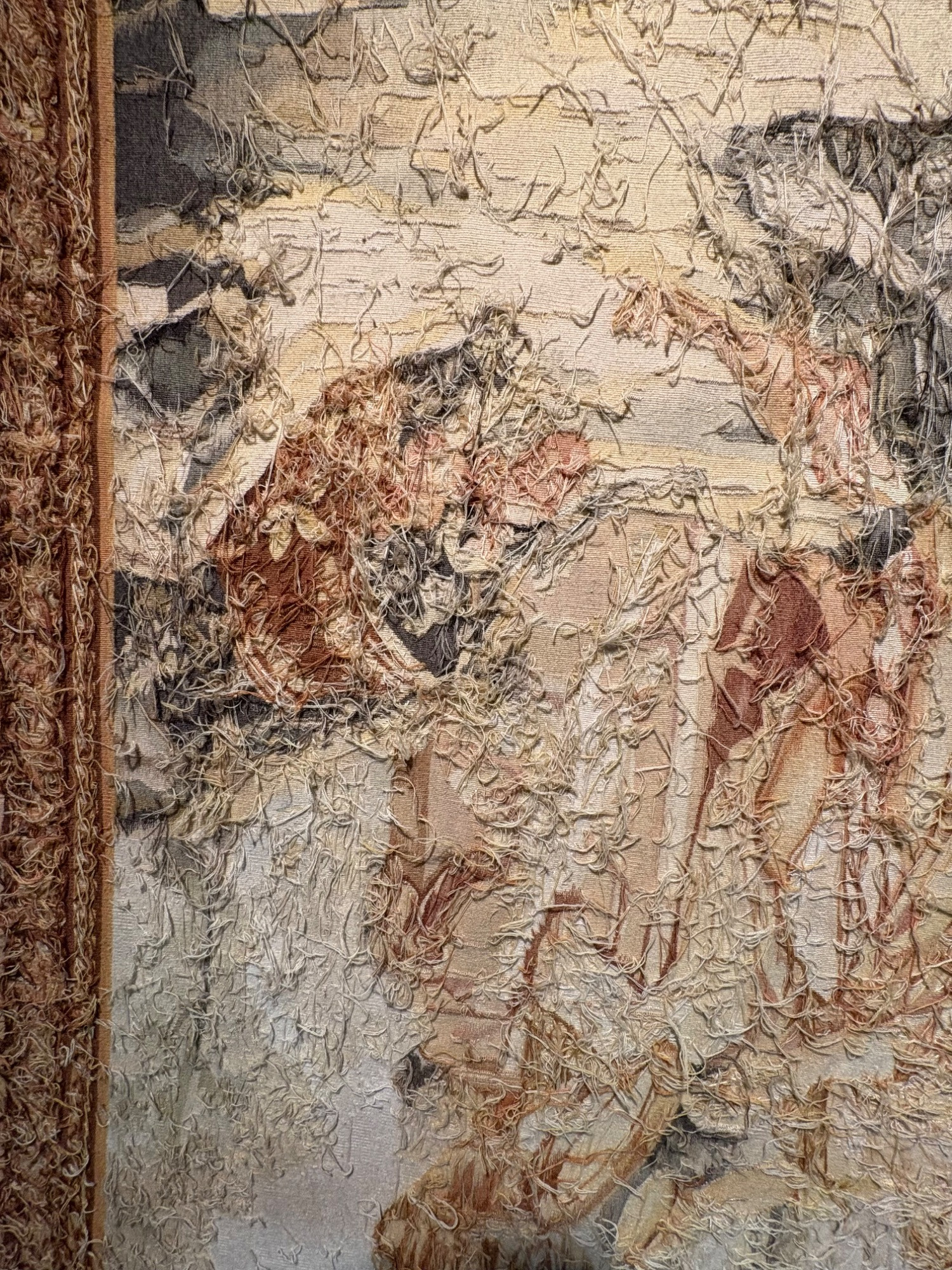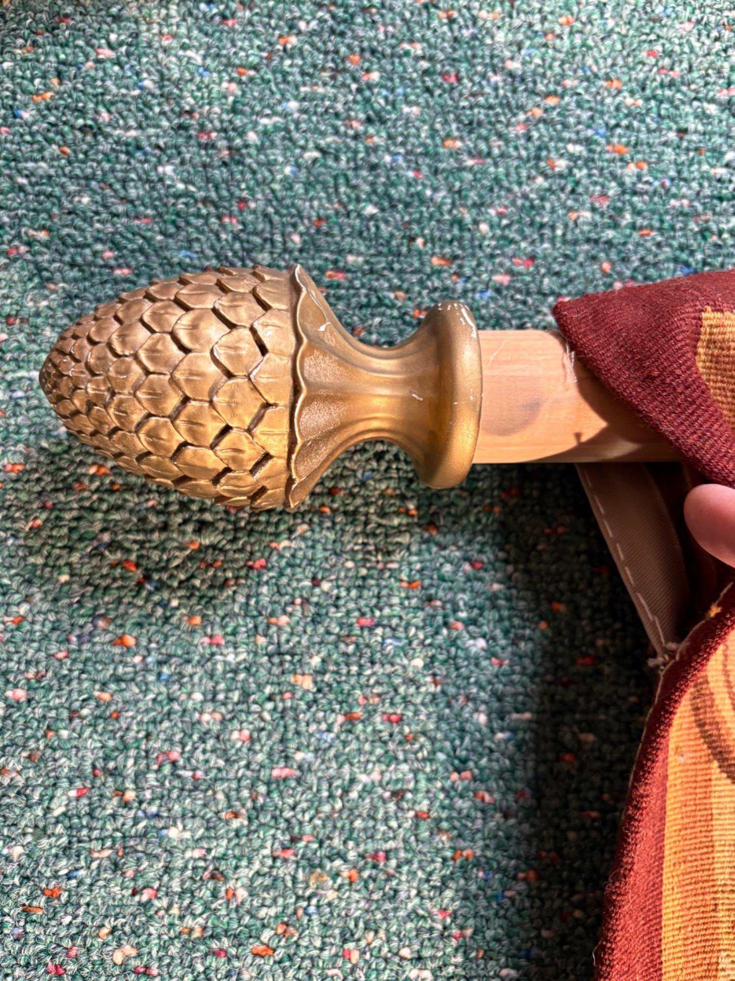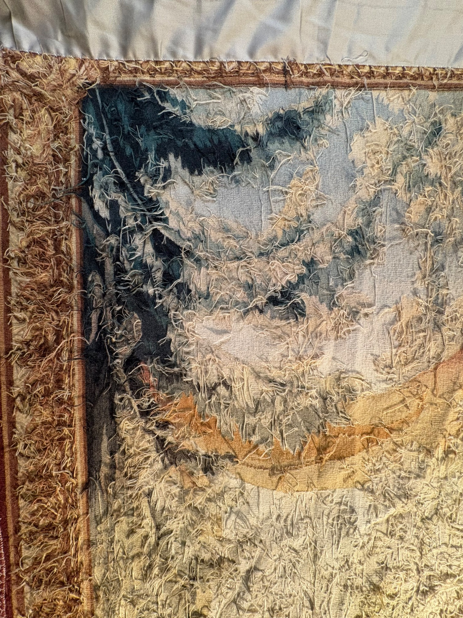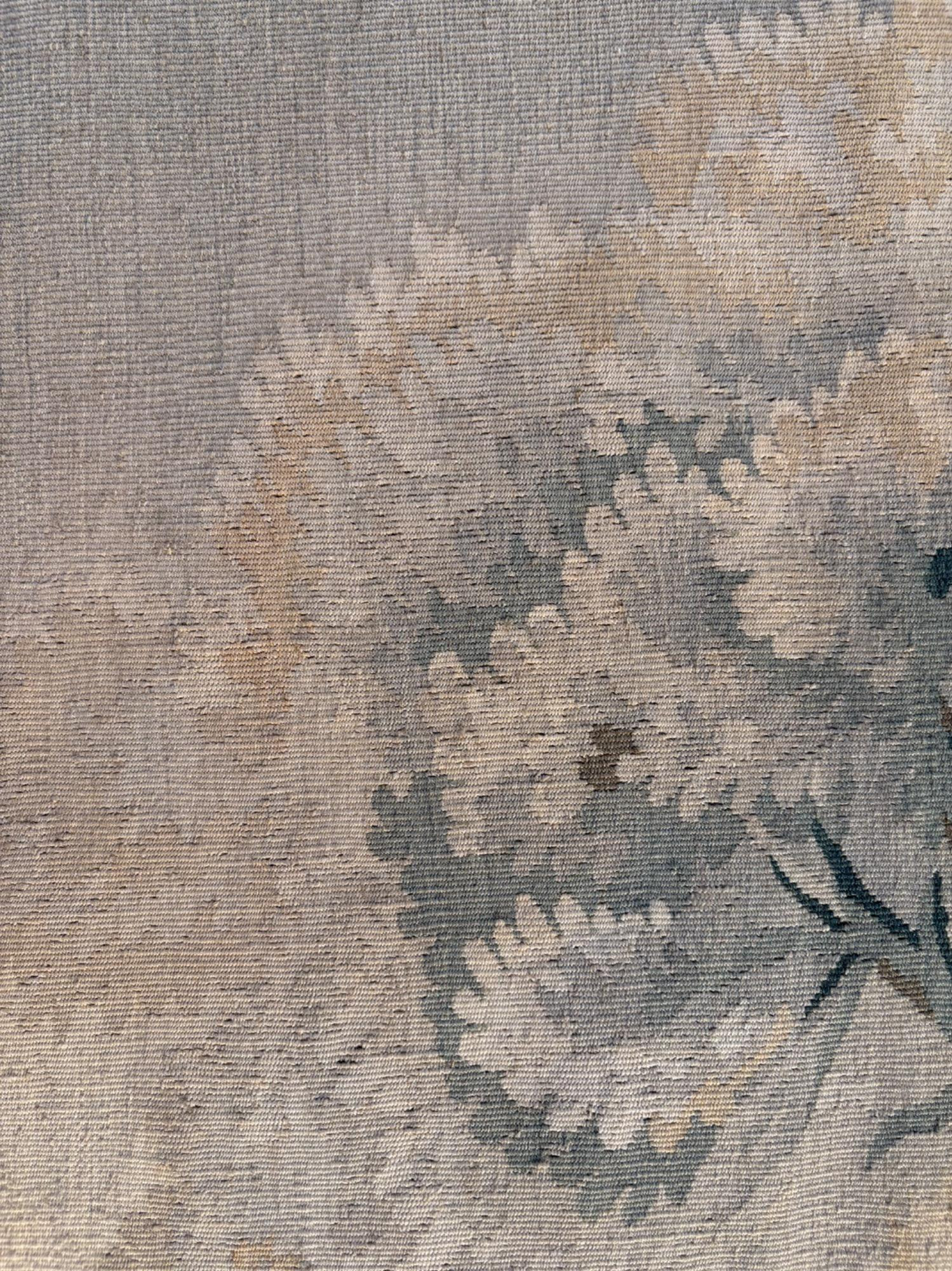 Oversize tapestry in traditional pale color palate with classical figures at an outdoor gathering. Great gold "framing" pattern on the edges. Comes with a sturdy wooden pole and gold wood finials. It is very large - about 7' high by 6' wide. Nice tight weave. Given the quality, we are guessing it was made in France. This is the only tapestry we have in the auction that is unlined, so it is lighter in weight despite its size. Interesting looking at all the threads the linings usually hide! Note: All tapestries listed in this auction are in good condition, but all would benefit from a good wash.