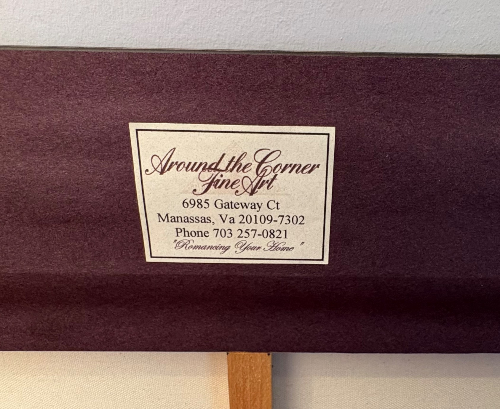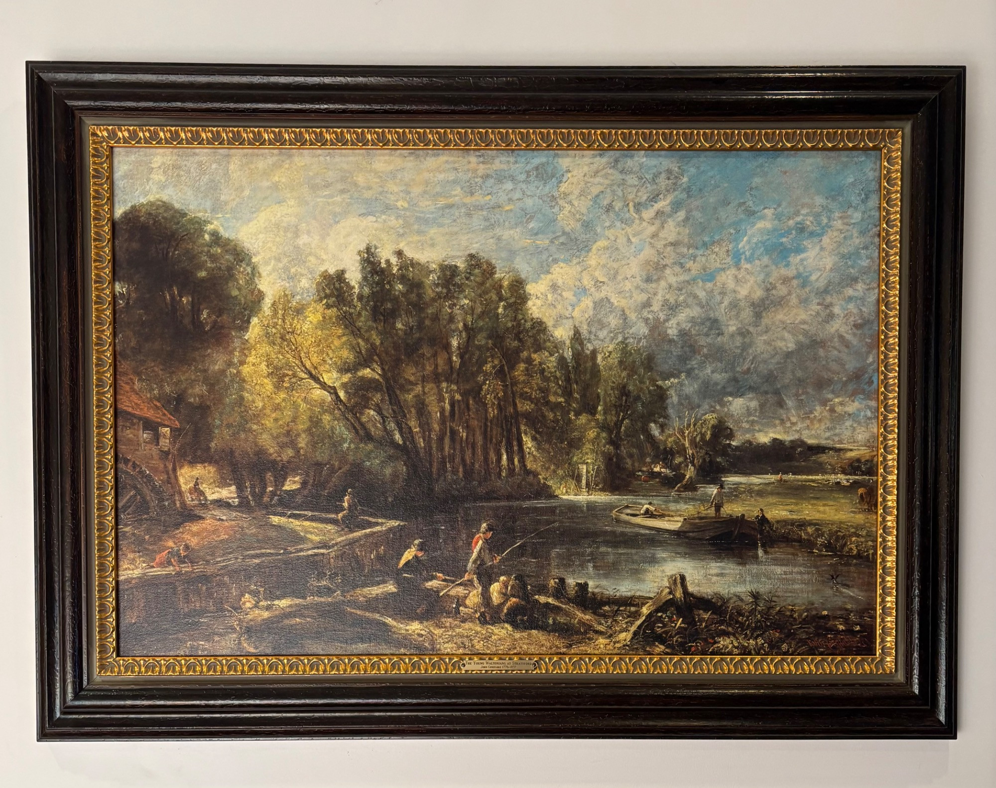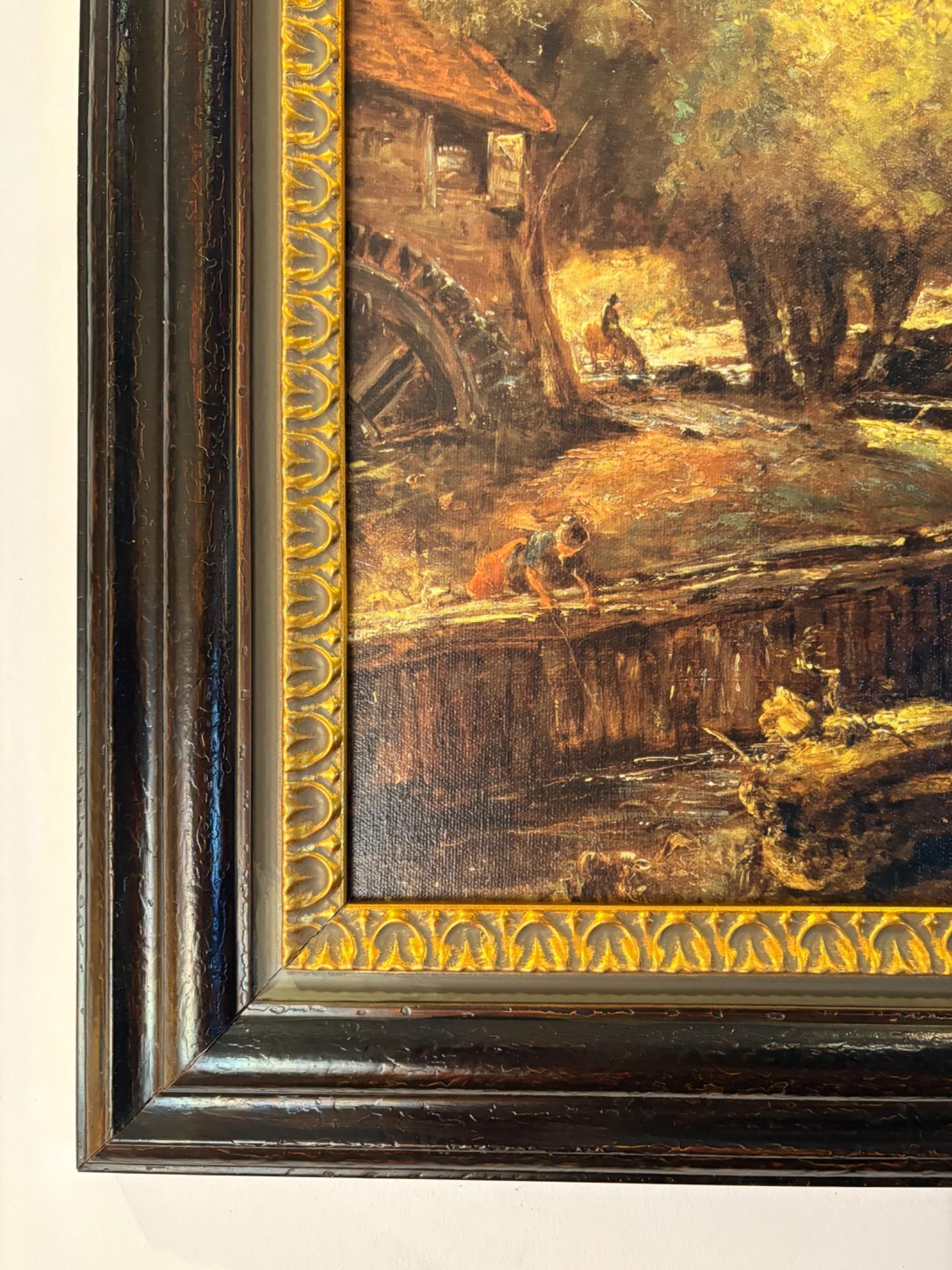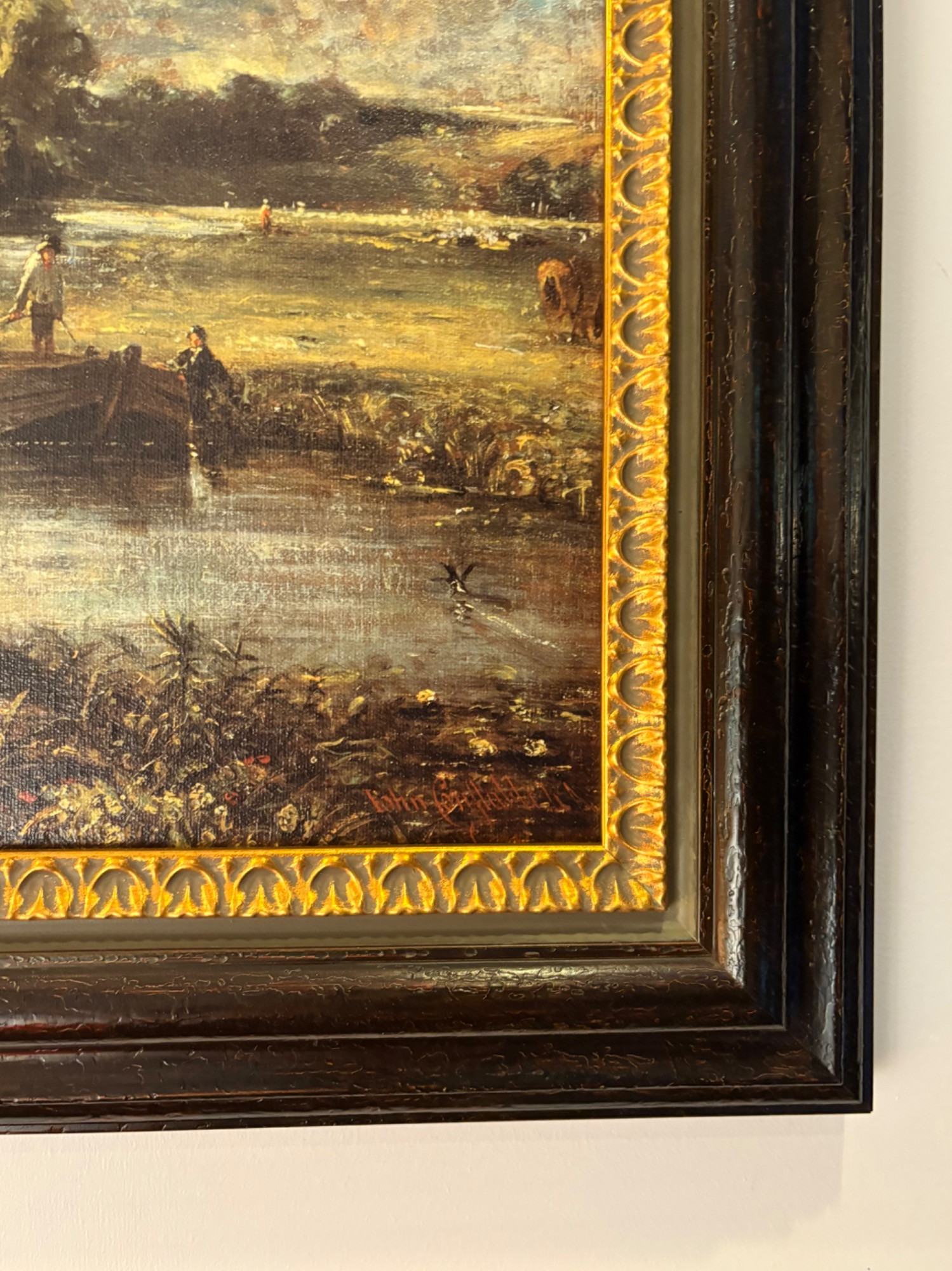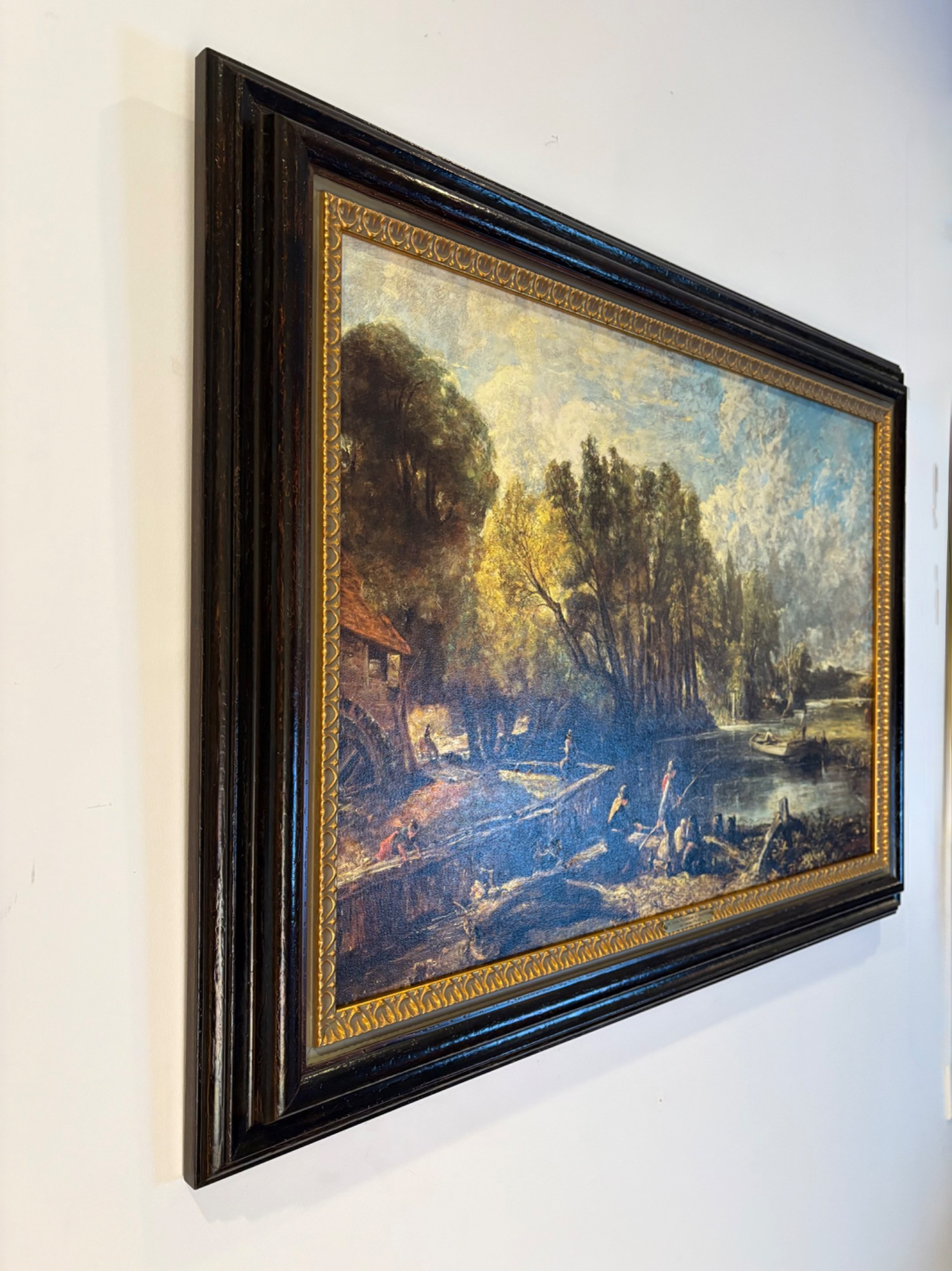 “The Young Waltonians at Strattford” by John Constable (1776-1837). Reproduction painting on canvas of a quiet country scene typical of Constable. Surrounded by a black lacquered wood frame with gold trim. Medium size at about 2' high x 3' wide framed. From Around the Corner Fine Art of Virginia known for producing high quality reproductions & frames in the 1980s & 1990s (Sadly, they appear to have closed shop in the early 2000s). We found a catalogue offering many of the exact works our client owned that roughly aligns with our client's purchase dates (pre-internet when everything was phone ordered or mail ordered). For those curious about the original price range/production of the paintings, see catalogue info in photos below after the listing photos. Can be shipped FedEx.