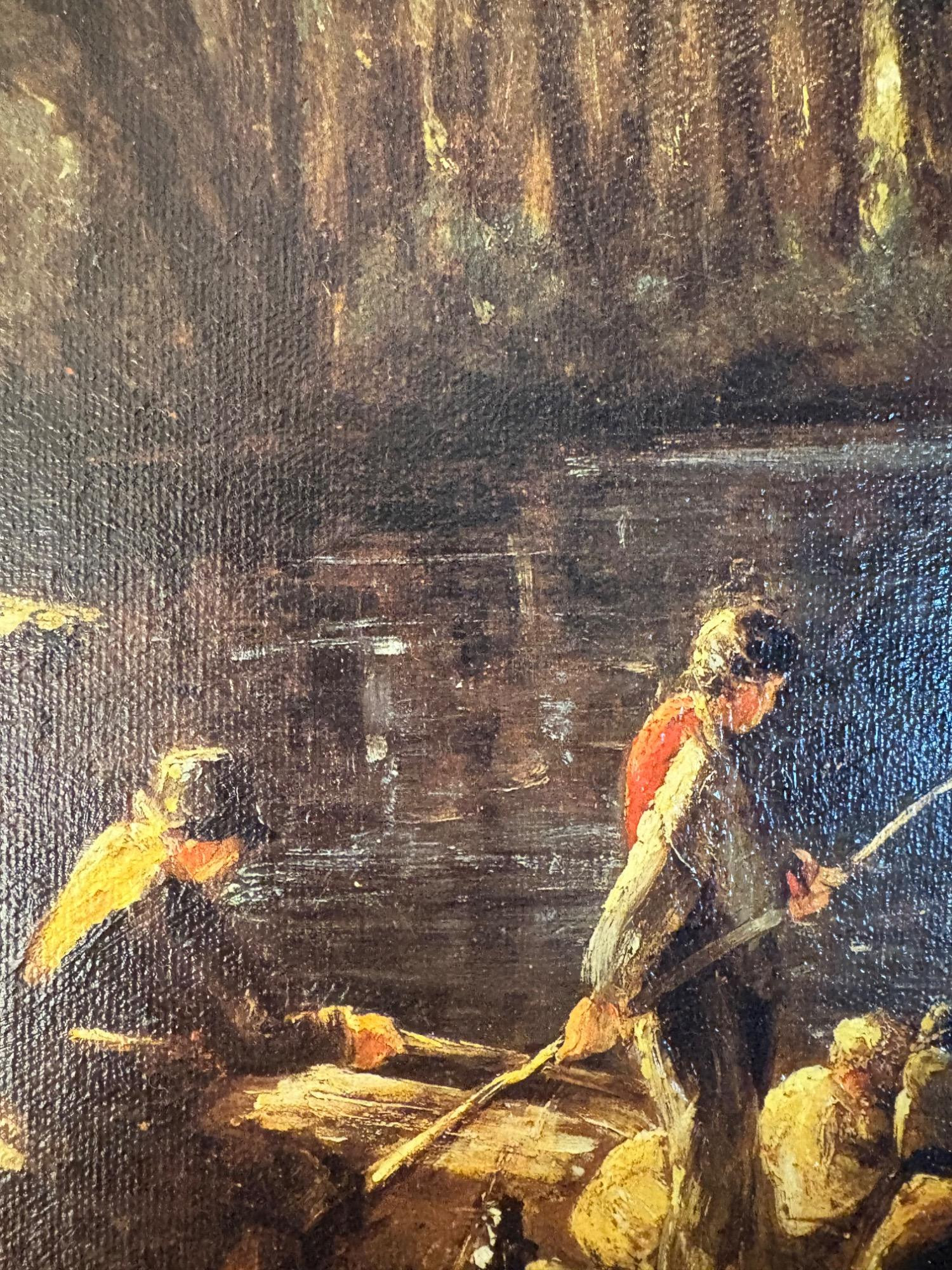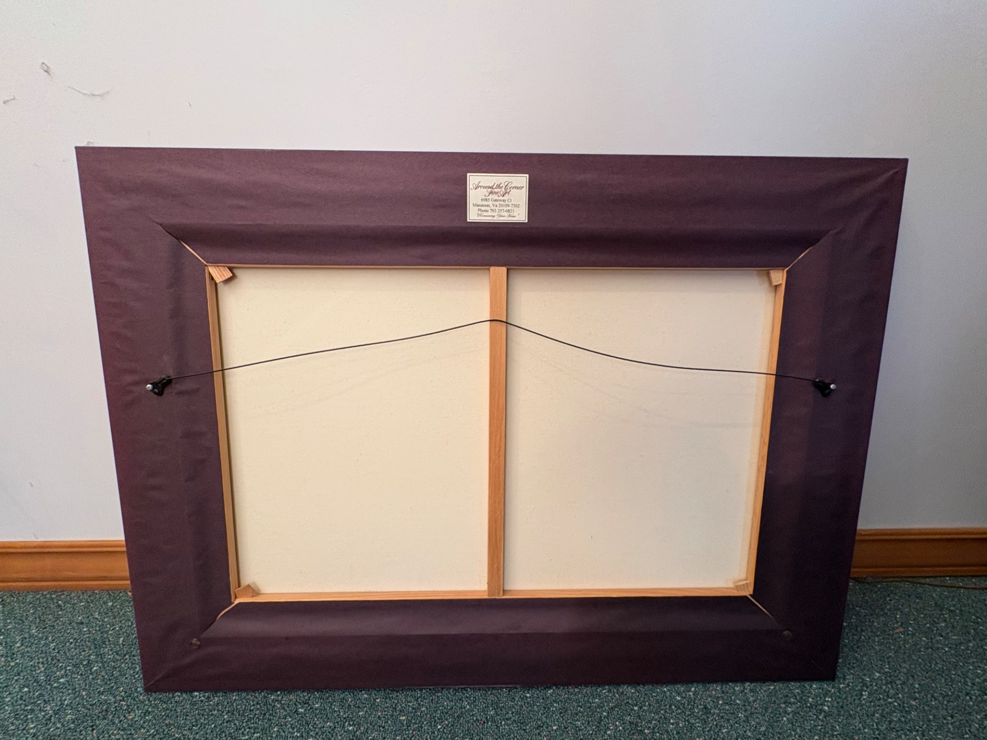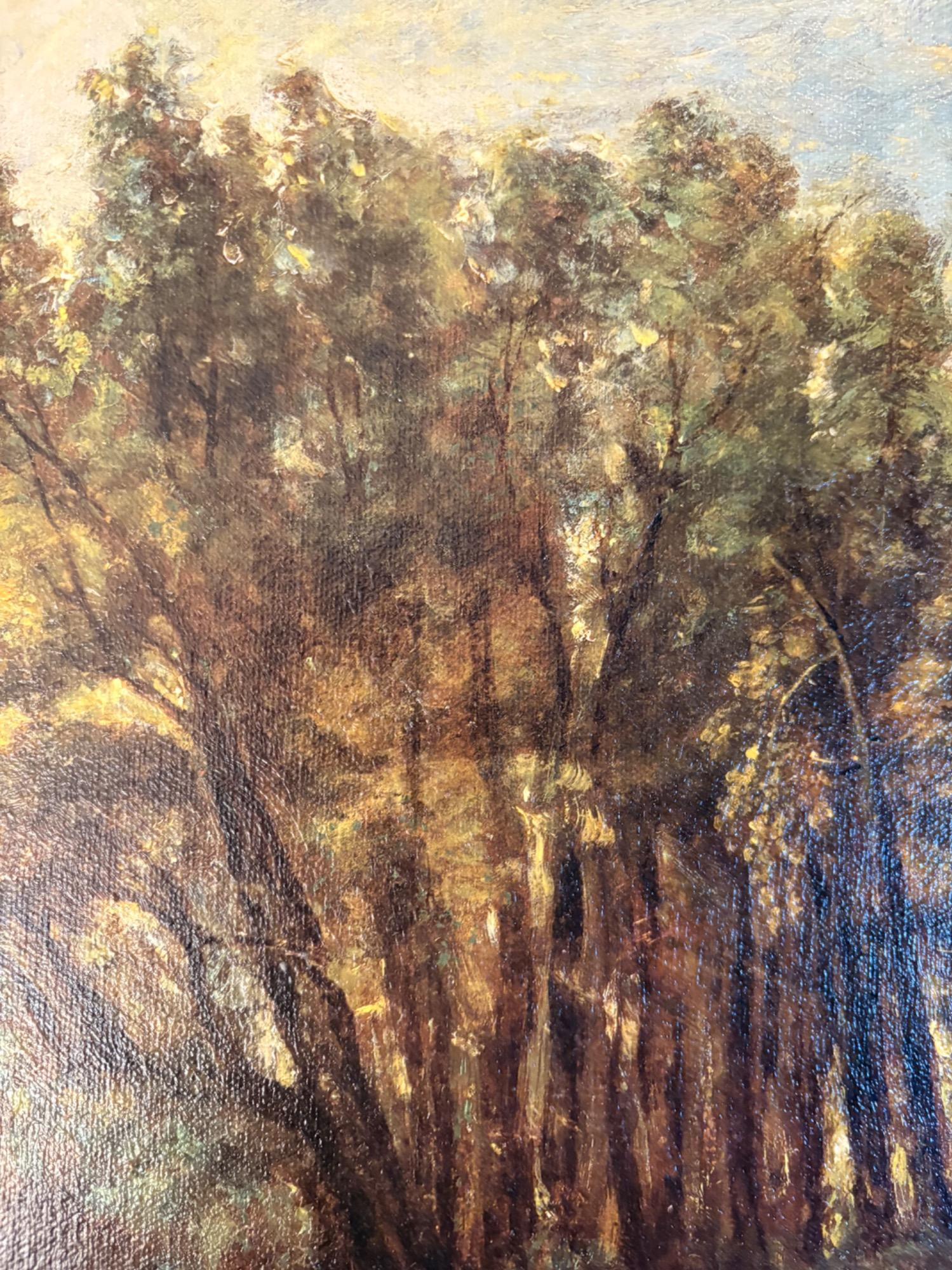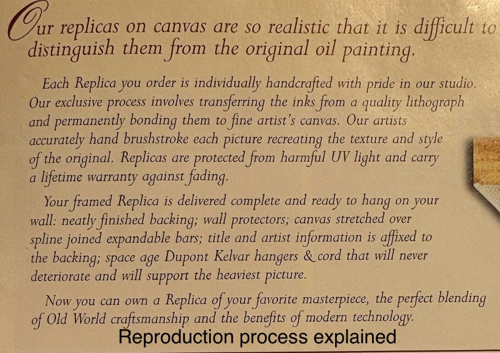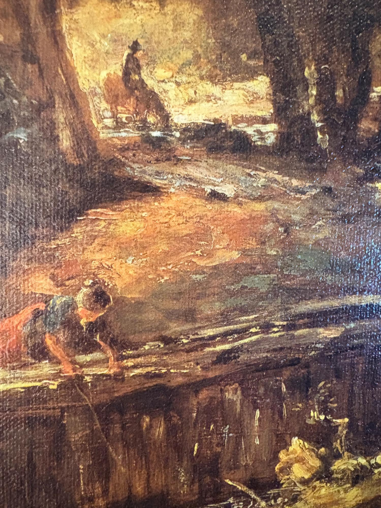“The Young Waltonians at Strattford” by John Constable (1776-1837). Reproduction painting on canvas of a quiet country scene typical of Constable. Surrounded by a black lacquered wood frame with gold trim. Medium size at about 2' high x 3' wide framed. From Around the Corner Fine Art of Virginia known for producing high quality reproductions & frames in the 1980s & 1990s (Sadly, they appear to have closed shop in the early 2000s). We found a catalogue offering many of the exact works our client owned that roughly aligns with our client's purchase dates (pre-internet when everything was phone ordered or mail ordered). For those curious about the original price range/production of the paintings, see catalogue info in photos below after the listing photos. Can be shipped FedEx.