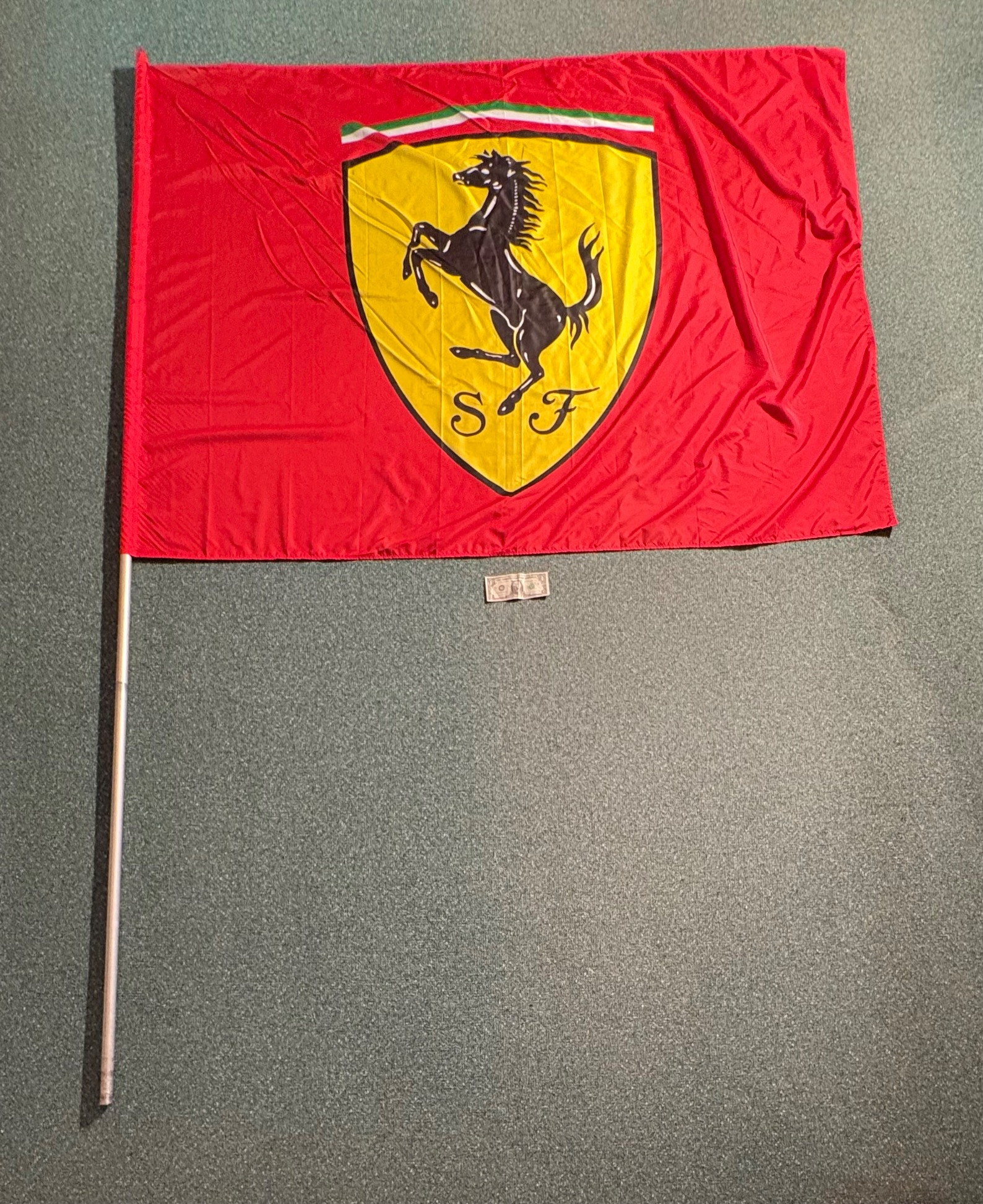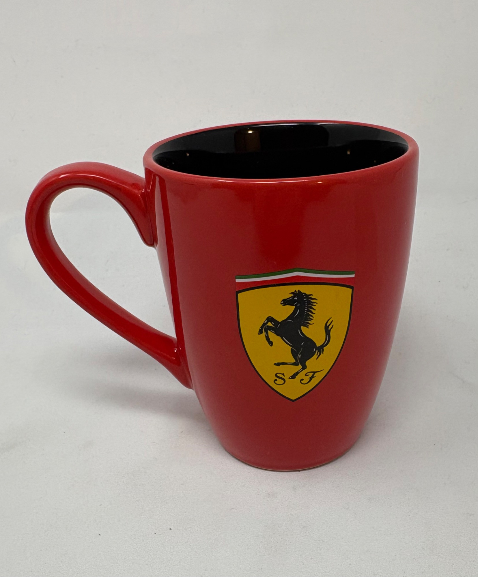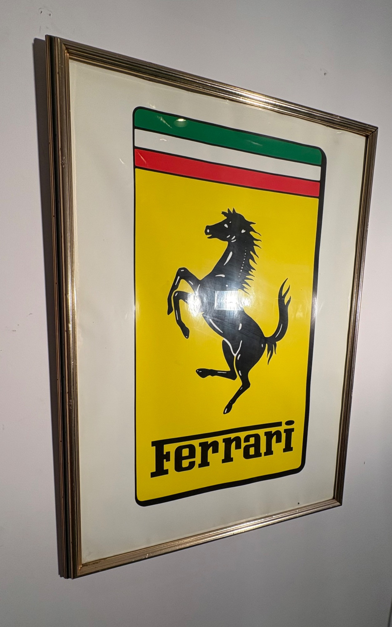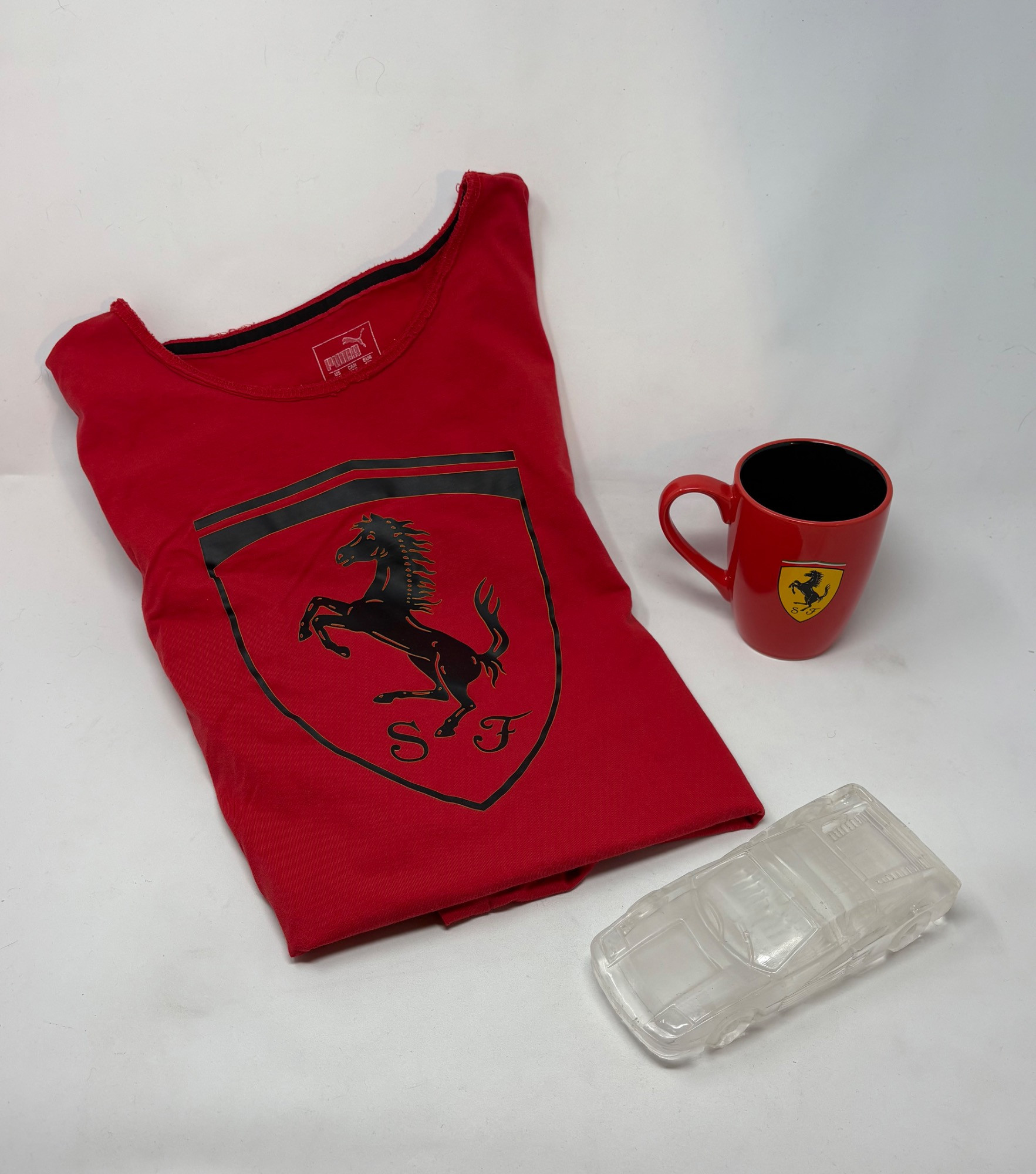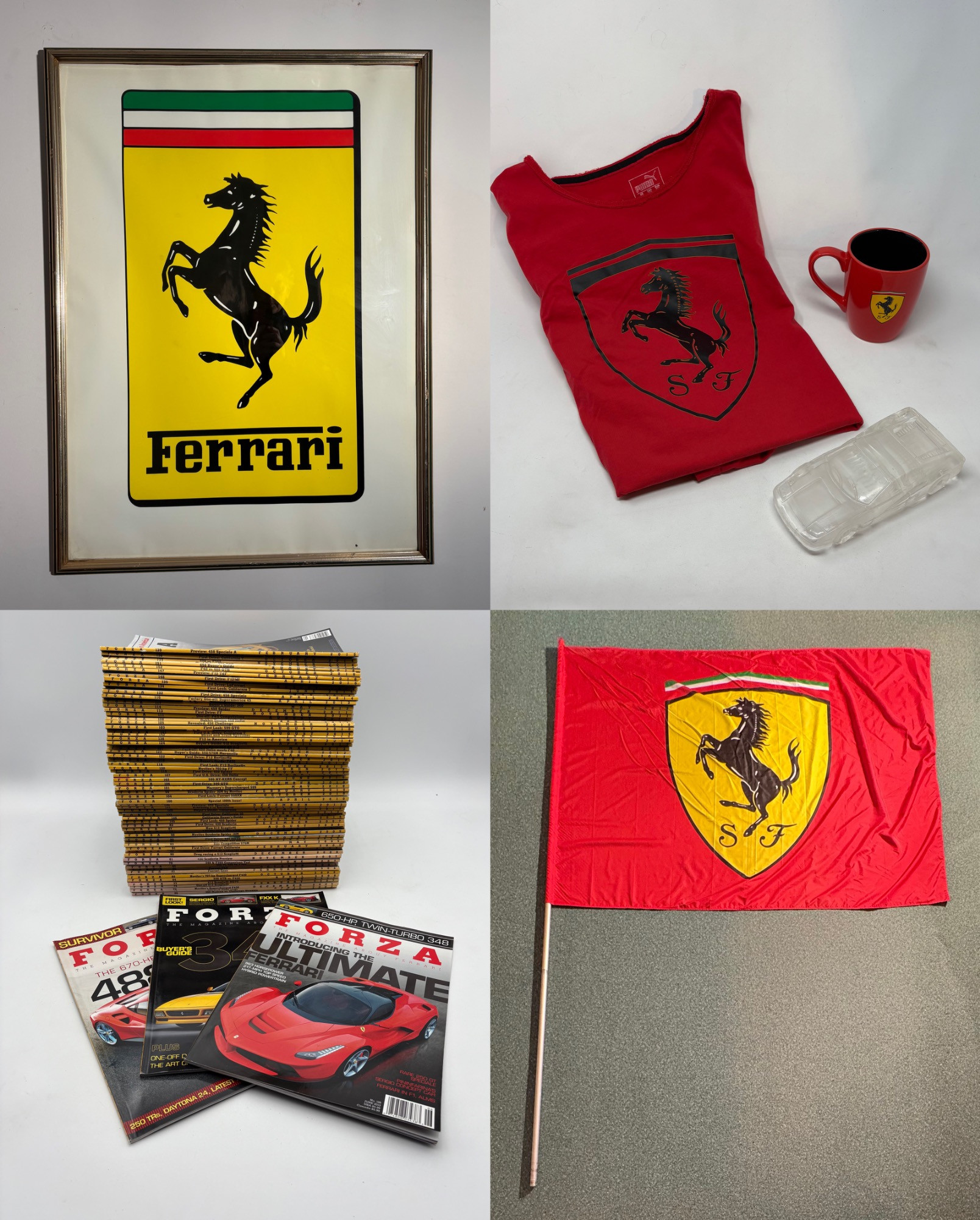 Framed Ferrari poster in brilliant bright colors. Gold frame is acceptable, but we would suggest reframing or removing the glass & dusting the poster as there is some debris between the poster & the glass - poster itself appears to be in excellent condition. Measures approx. 38.5" H x 28.5" W. See last photo for closeup. Red Ferrari coffee mug with logo on one side. Appears to be new. Red Ferrari shirt - Size XXL - with Puma emblem on left sleeve and Ferrari emblem on right. Note that the collar has been removed & the neck edge serged. Glass Ferrari model (just under 7" L), Giant Ferrari flag on aluminum pole - we think this was probably used in a parade with the client’s Ferrari. Flag is huge - measures 57" H x 76" W and is mounted on a 9' aluminum pole. . Flag needs a good wash but otherwise in great condition. Multiple issues of "Forza - The Magazine about Ferrari". Dates range from 2006 to 2016. Lots and lots of reading for the Ferrari fan.