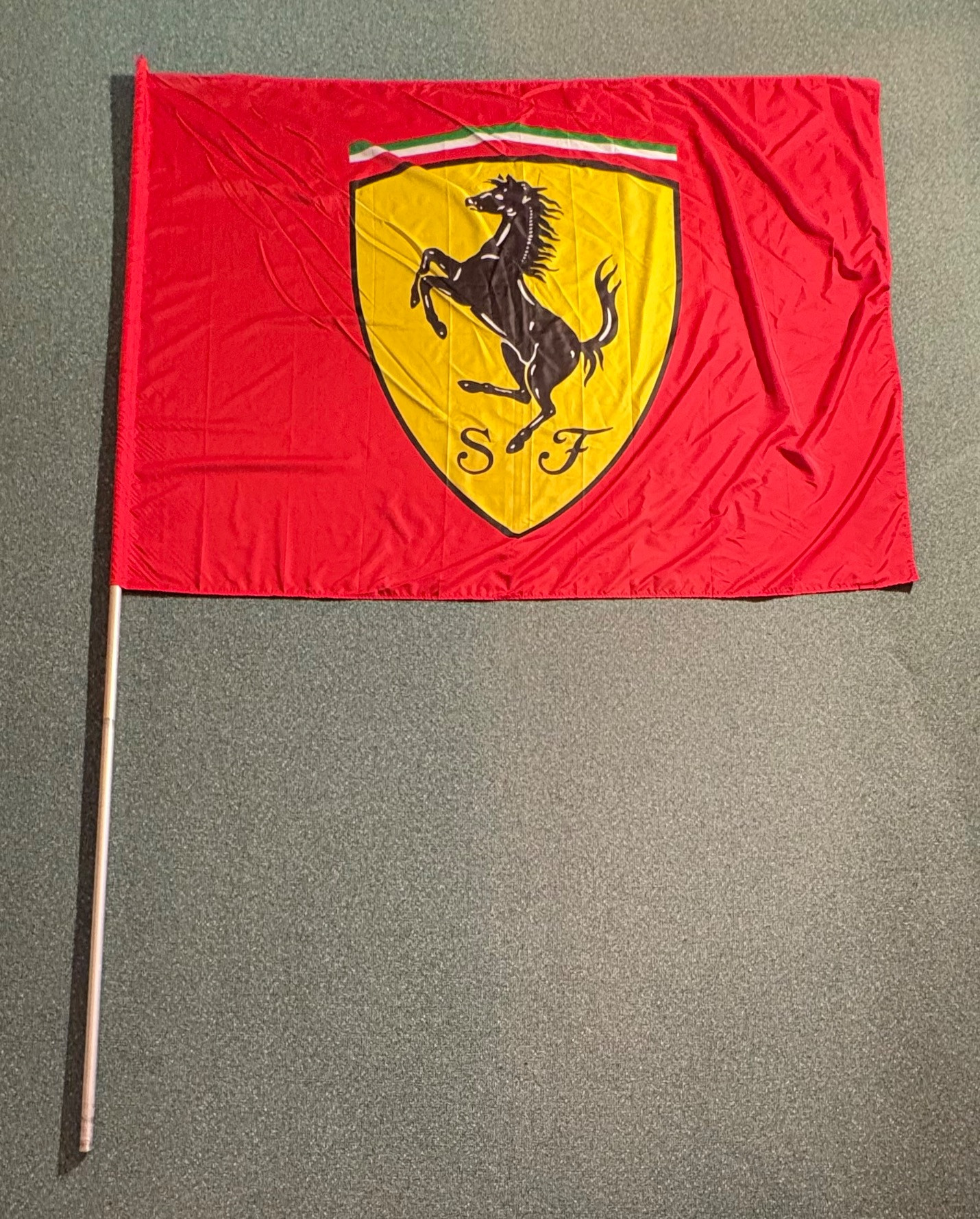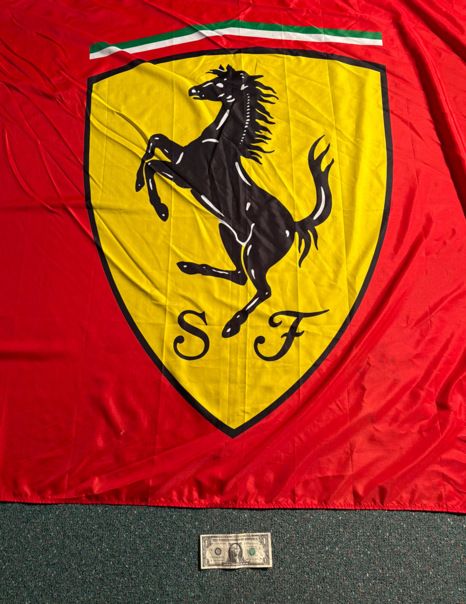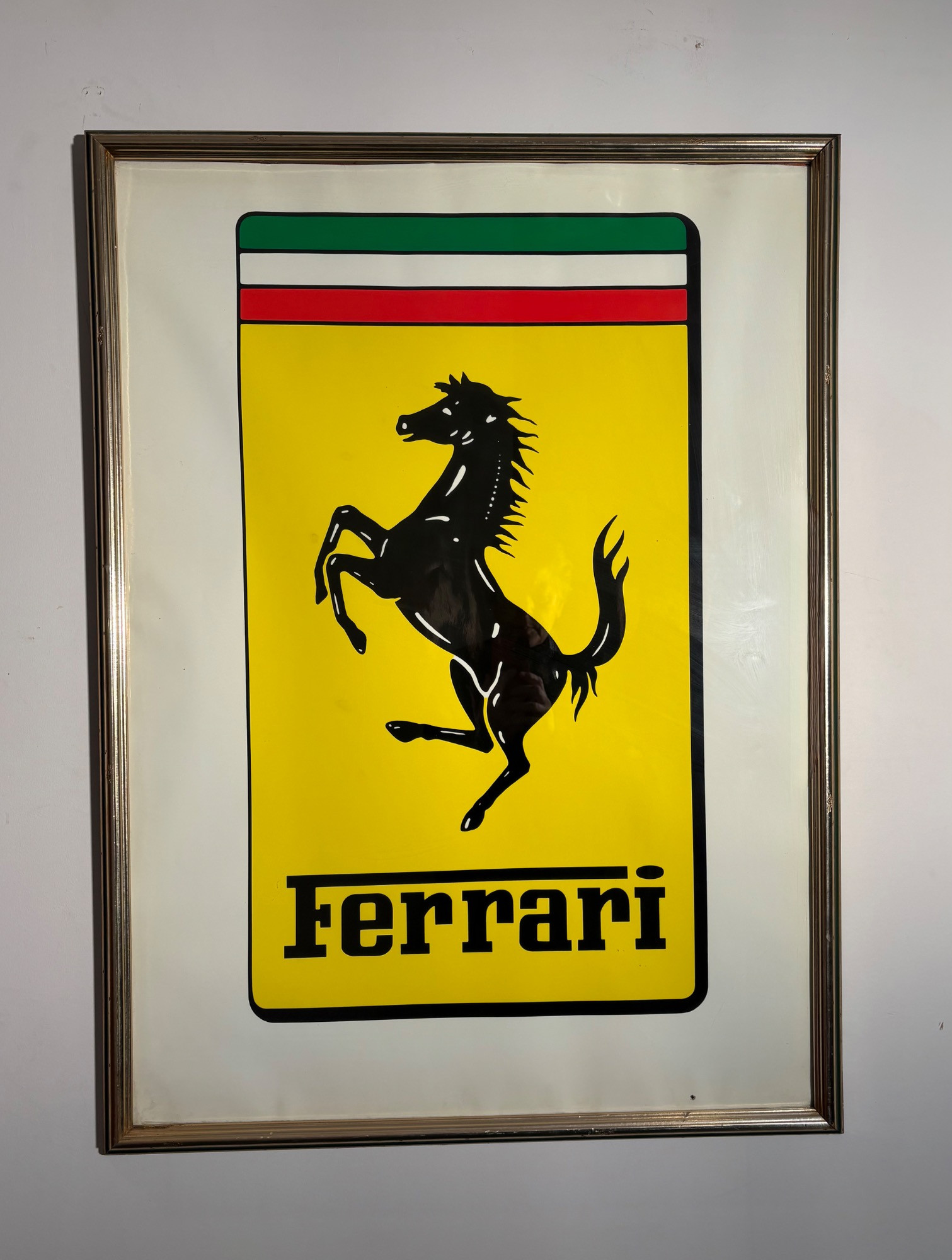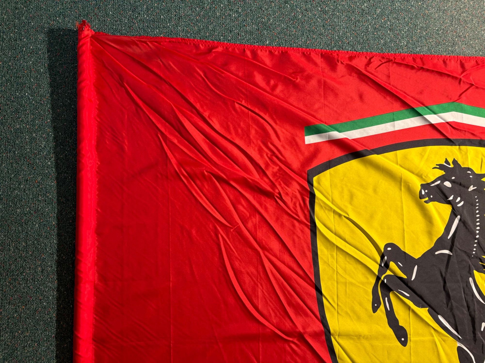 Framed Ferrari poster in brilliant bright colors. Gold frame is acceptable, but we would suggest reframing or removing the glass & dusting the poster as there is some debris between the poster & the glass - poster itself appears to be in excellent condition. Measures approx. 38.5" H x 28.5" W. See last photo for closeup. Red Ferrari coffee mug with logo on one side. Appears to be new. Red Ferrari shirt - Size XXL - with Puma emblem on left sleeve and Ferrari emblem on right. Note that the collar has been removed & the neck edge serged. Glass Ferrari model (just under 7" L), Giant Ferrari flag on aluminum pole - we think this was probably used in a parade with the client’s Ferrari. Flag is huge - measures 57" H x 76" W and is mounted on a 9' aluminum pole. . Flag needs a good wash but otherwise in great condition. Multiple issues of "Forza - The Magazine about Ferrari". Dates range from 2006 to 2016. Lots and lots of reading for the Ferrari fan.