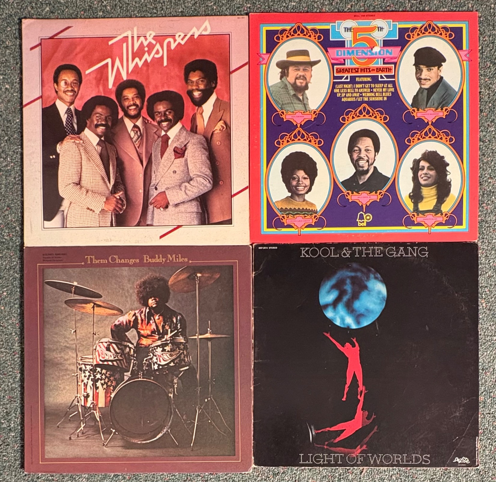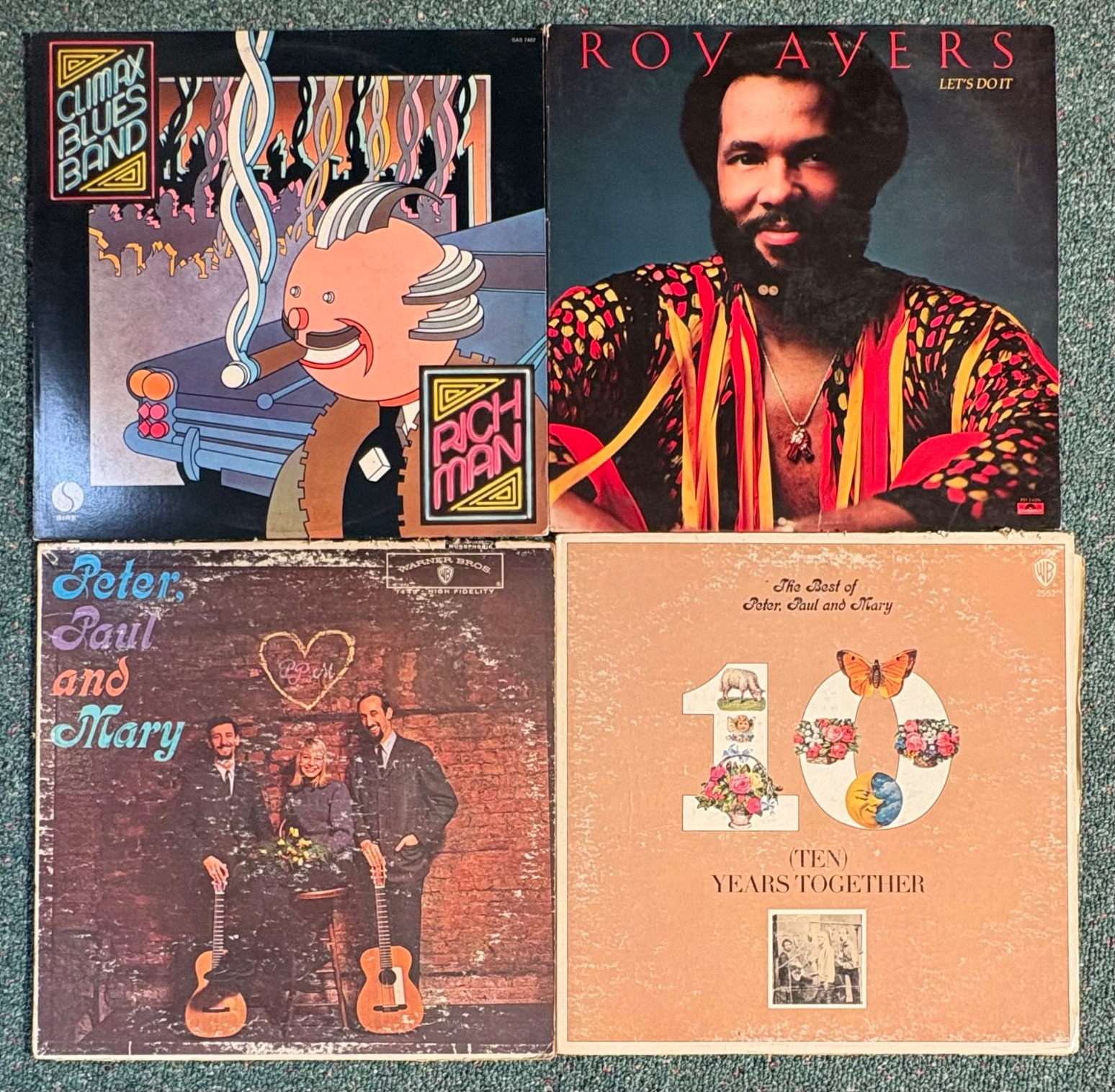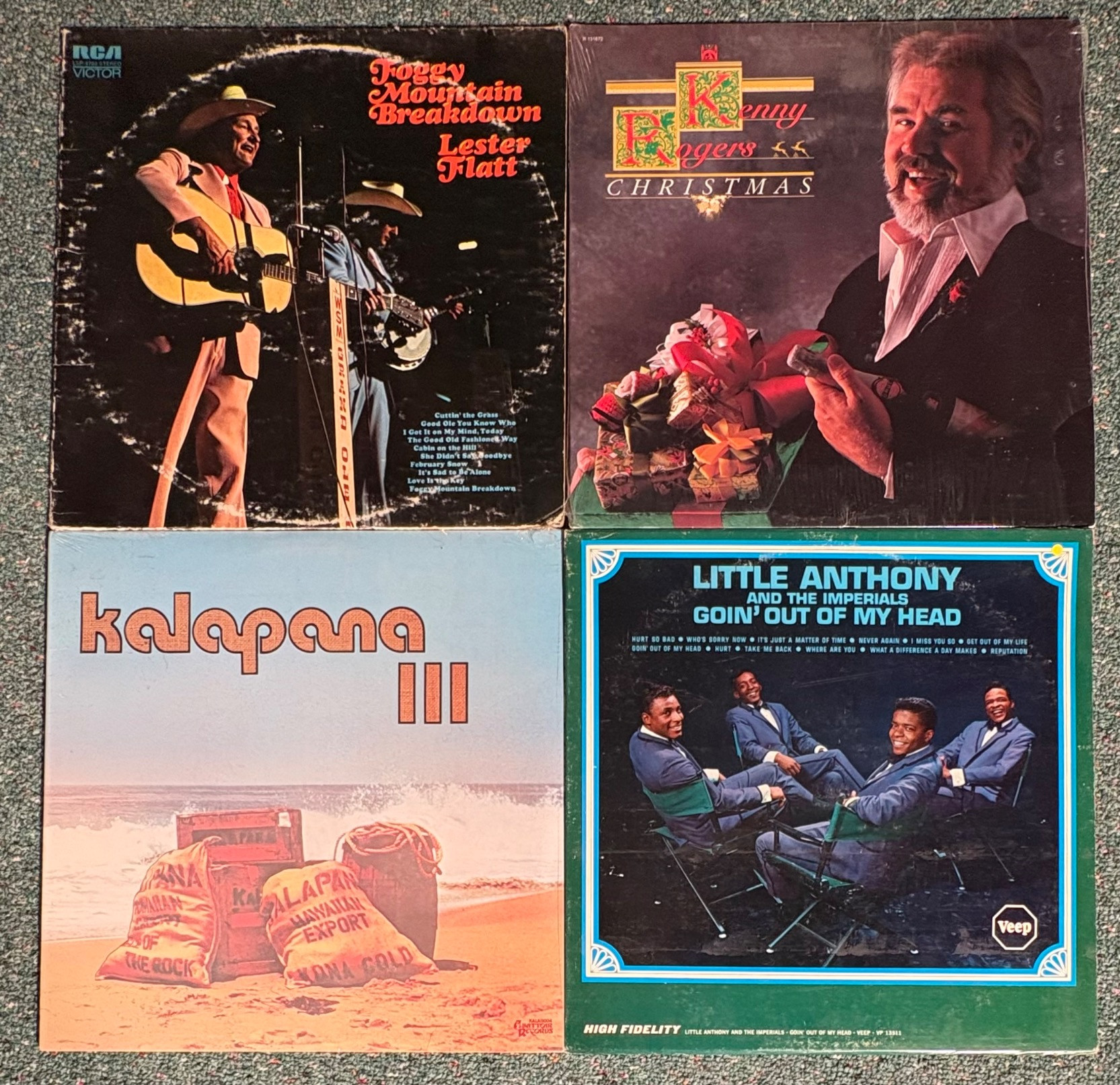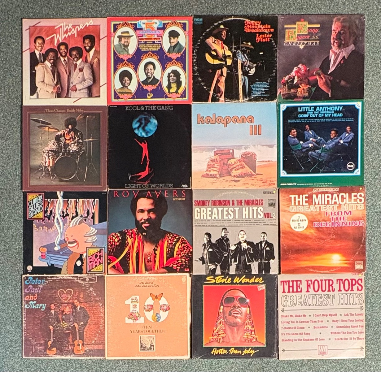 16 vintage vinyl LPs! Our client had eclectic taste and loved his albums - thus, most of these have been lovingly played over the years. We checked to make sure the correct album was in the correct cover and did a cursory glance for any egregious scratches. Some covers reflect heavy use and are worn/split in places/have names written on them. However, the majority are in good used shape. Artists/Bands in this lot include: The Four Tops The Miracles Stevie Wonder Smokey Robinson Roy Ayers Peter, Paul & Mary (2 albums) Climax Blues Band Lester Flatt Miscellaneous Hawaiian Artists Kenny Rogers Little Anthony & The Imperials The Whispers Buddy Miles The Fifth Dimension Kool & The Gang