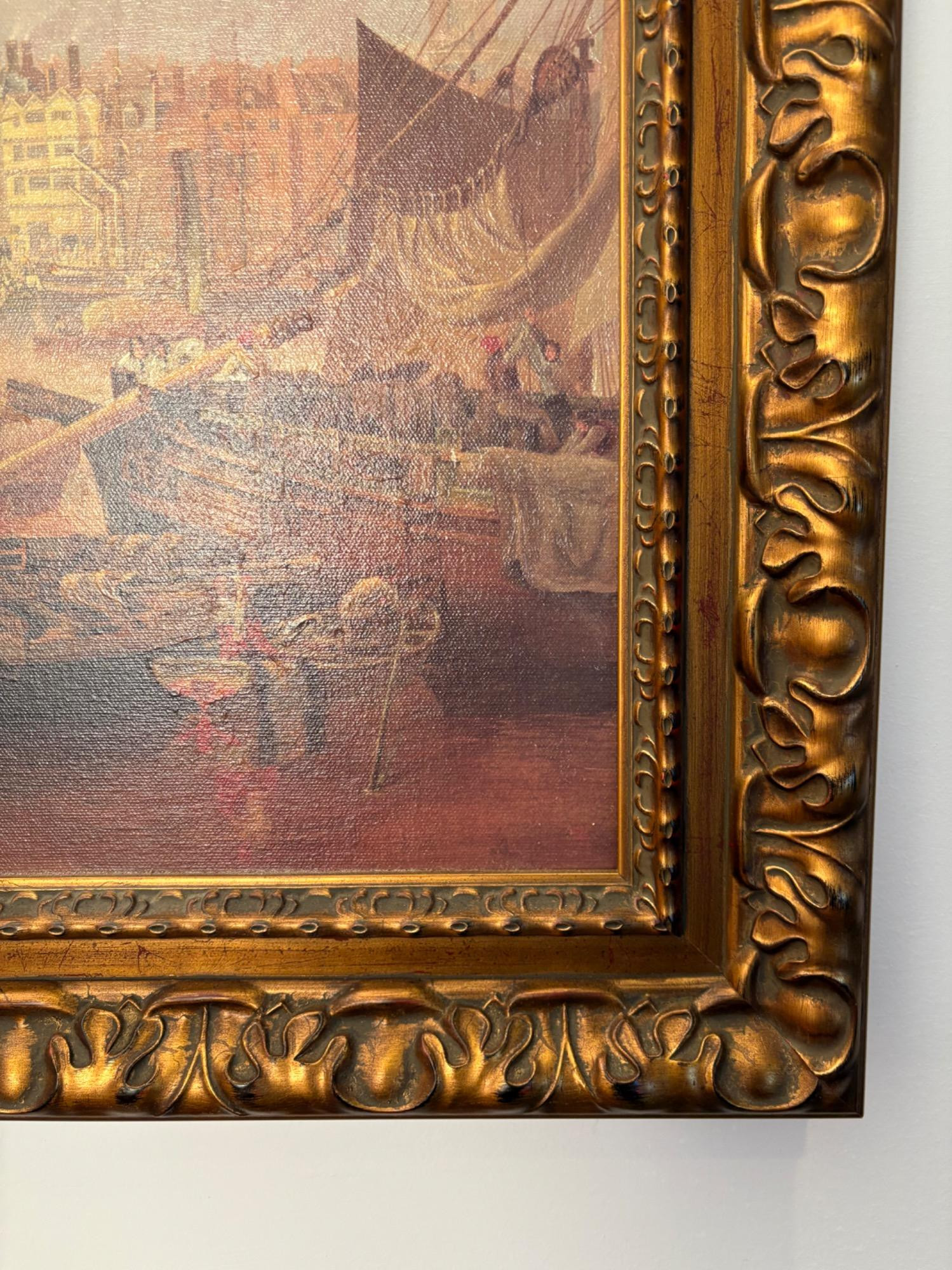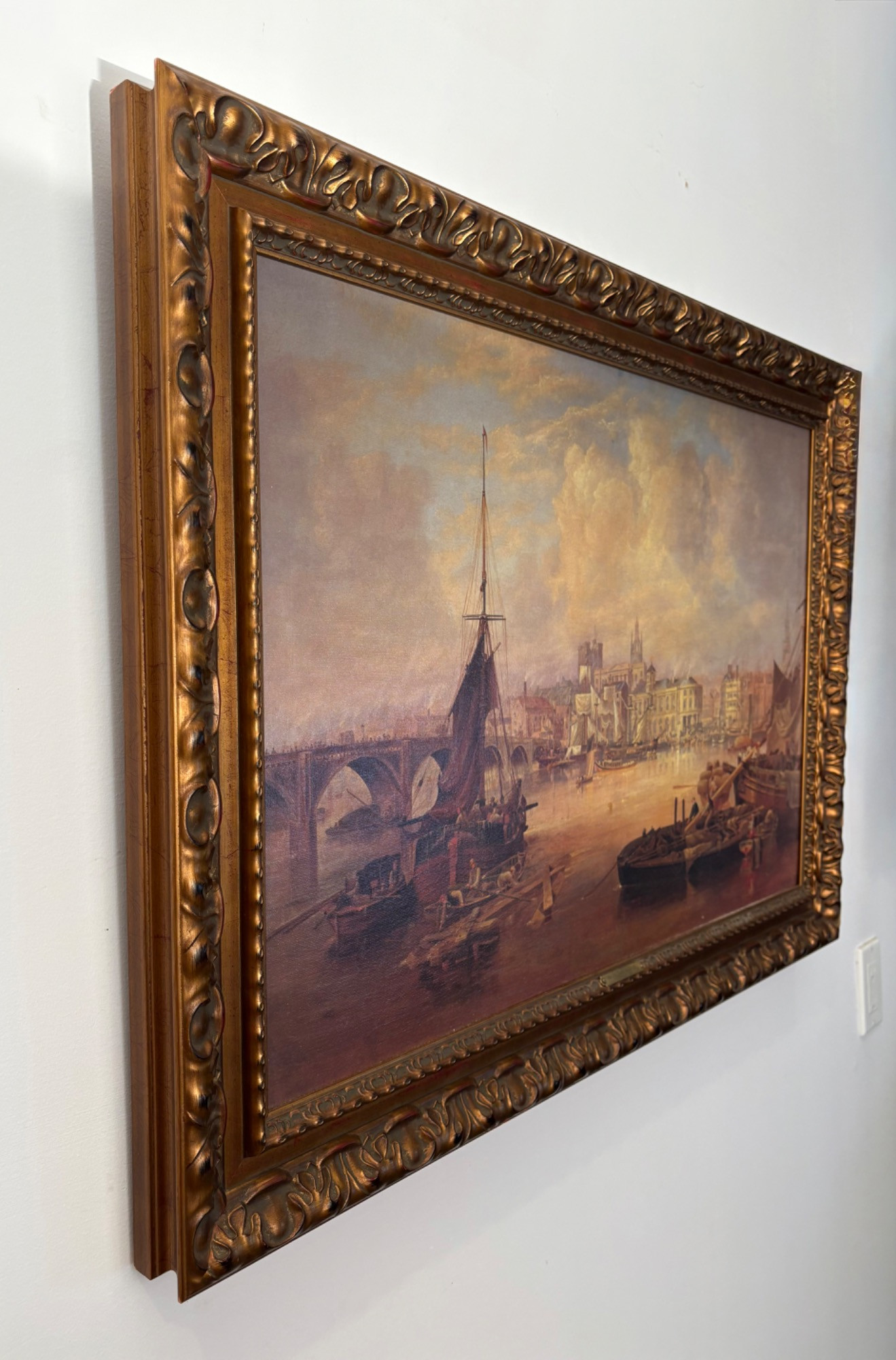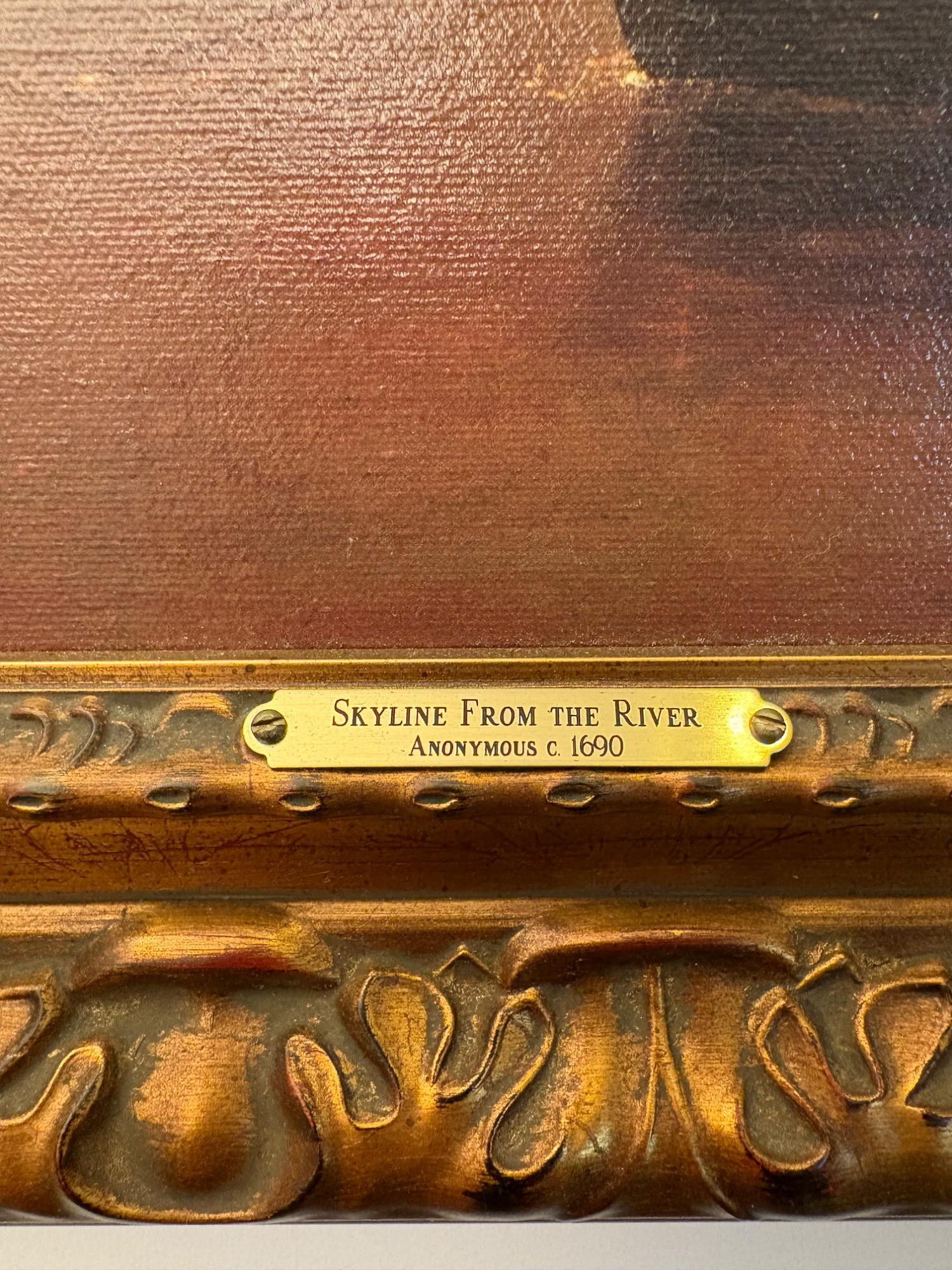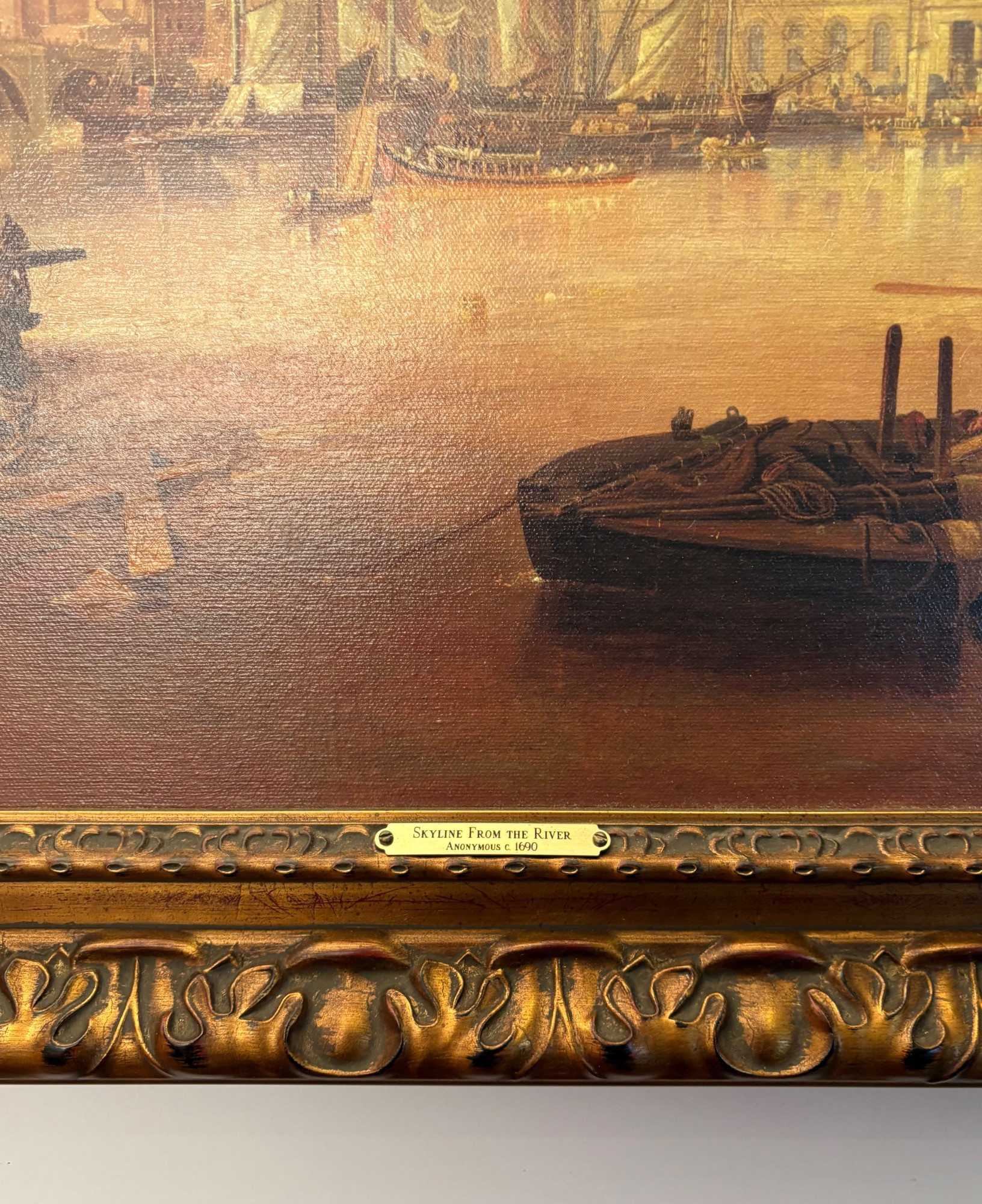 “Skyline from the River” by an anonymous painter circa 1690. Reproduction painting on canvas in an ornate gold wood frame. Medium sized piece at about 2' high by 3' wide framed. Please note there is a small piece of the right top frame that has gone missing. It could easily be touched up with gold paint & wouldn't be noticeable. From Around the Corner Fine Art of Virginia known for producing high quality reproductions & frames in the 1980s & 1990s (Sadly, they appear to have closed shop in the early 2000s). We found a catalogue offering many of the exact works our client owned that roughly aligns with our client's purchase dates (pre-internet when everything was phone ordered or mail ordered). For those curious about the original price range/production of the paintings, see catalogue info in photos below after the listing photos. Can be shipped FedEx.