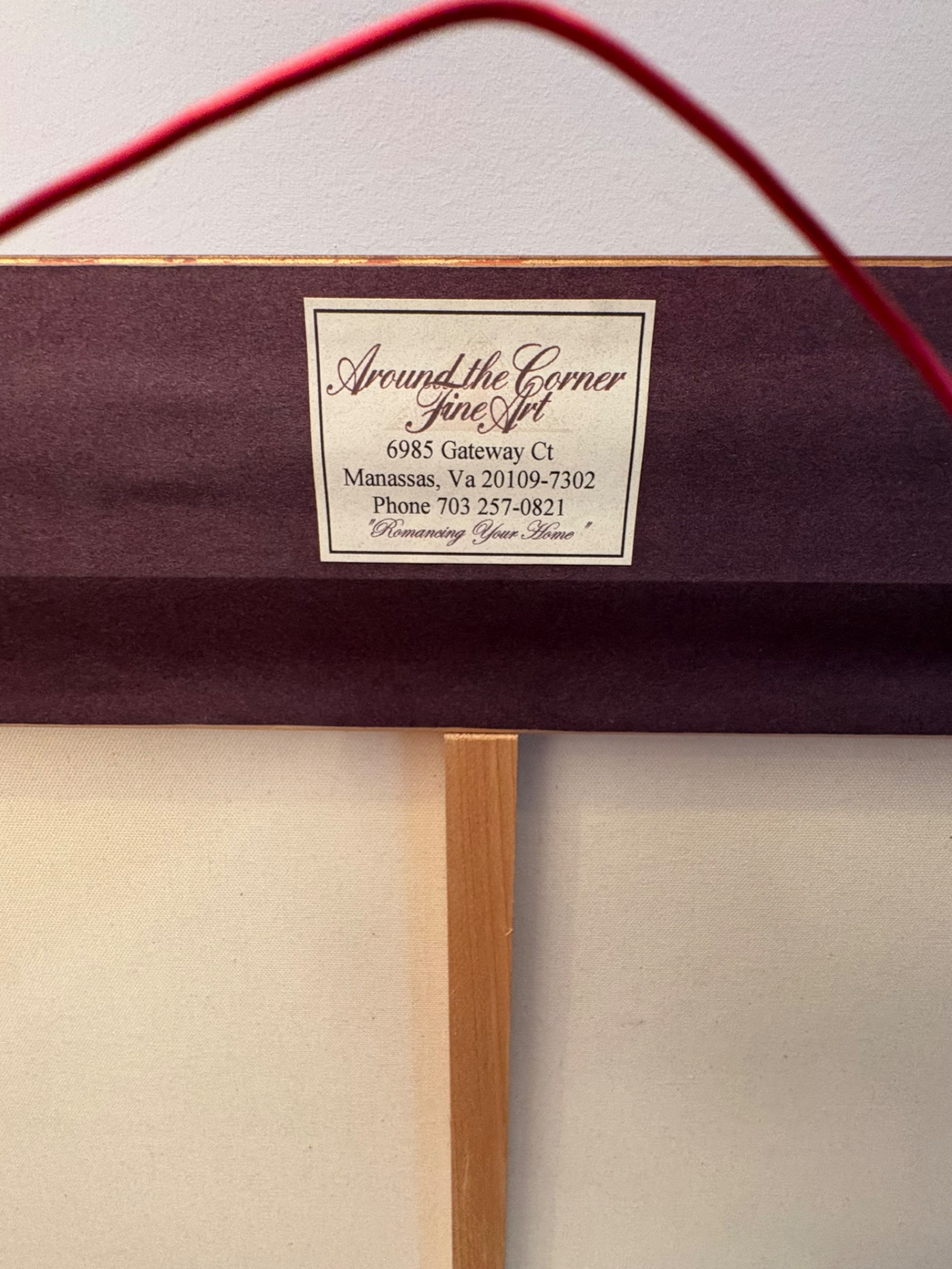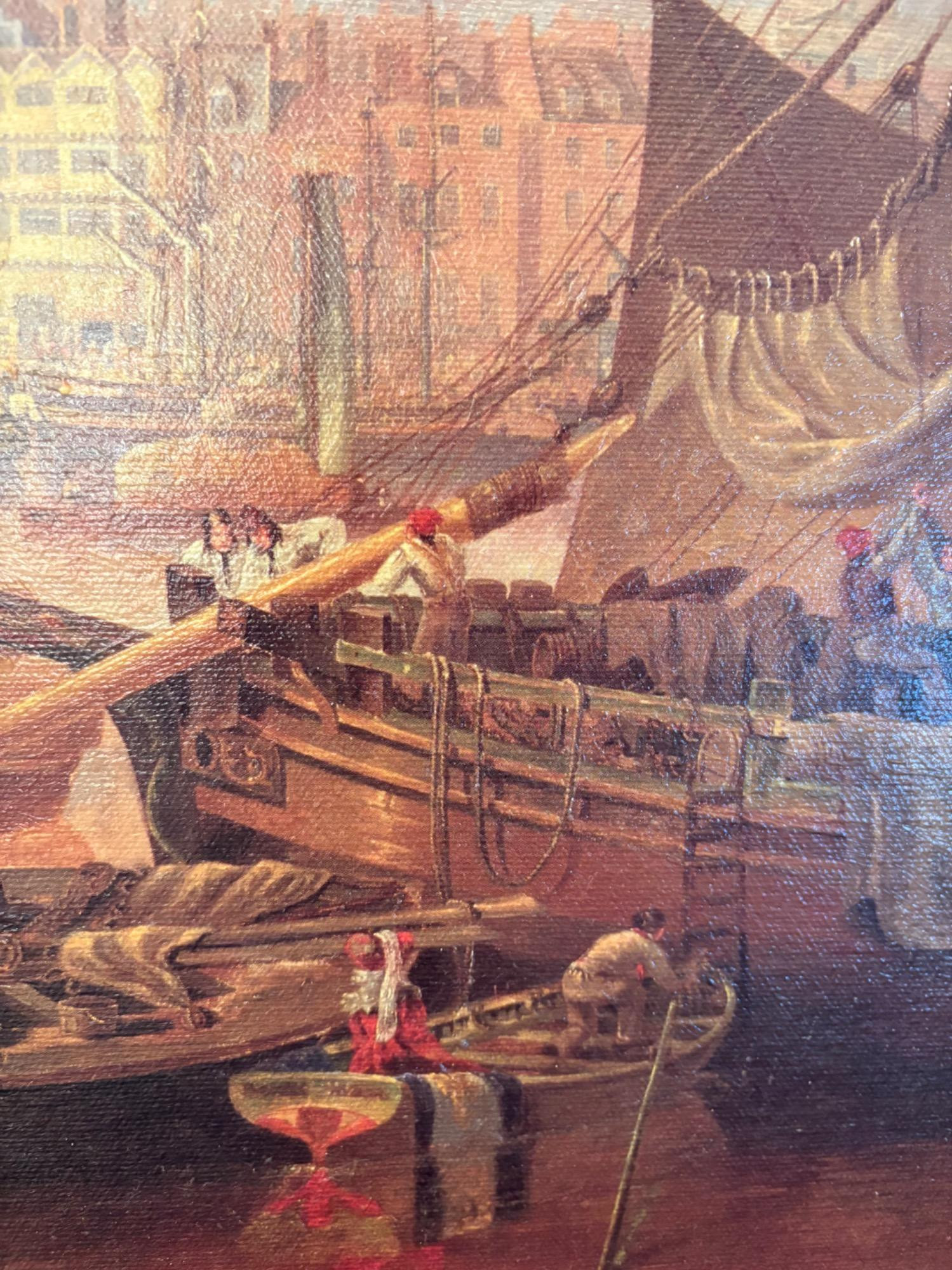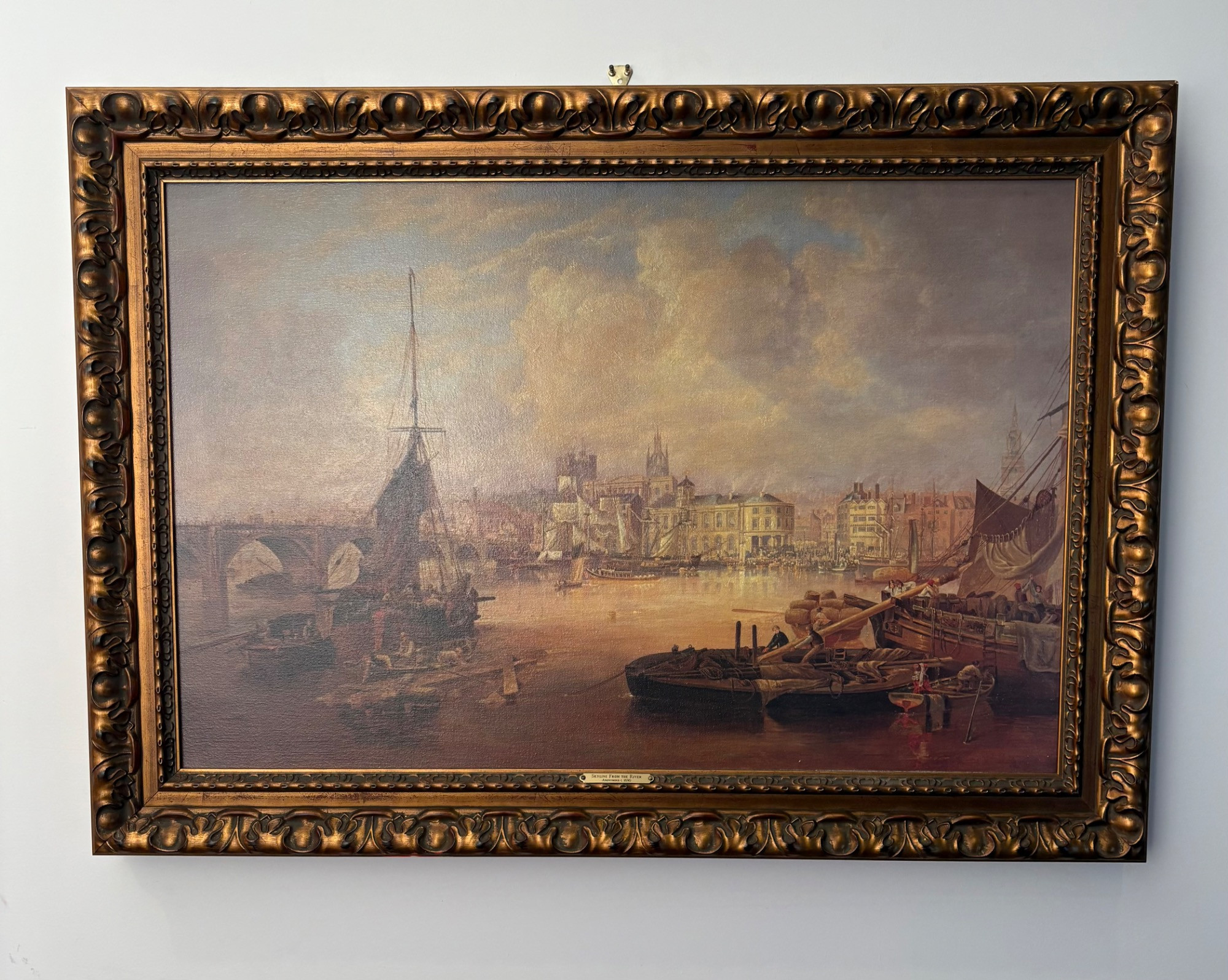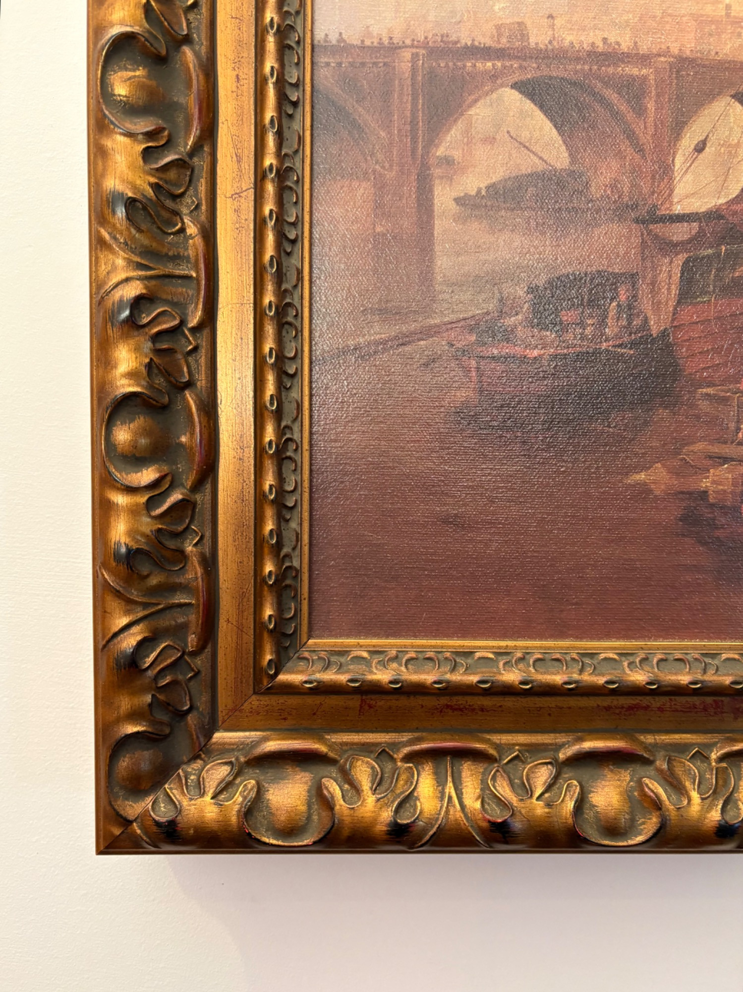 “Skyline from the River” by an anonymous painter circa 1690. Reproduction painting on canvas in an ornate gold wood frame. Medium sized piece at about 2' high by 3' wide framed. Please note there is a small piece of the right top frame that has gone missing. It could easily be touched up with gold paint & wouldn't be noticeable. From Around the Corner Fine Art of Virginia known for producing high quality reproductions & frames in the 1980s & 1990s (Sadly, they appear to have closed shop in the early 2000s). We found a catalogue offering many of the exact works our client owned that roughly aligns with our client's purchase dates (pre-internet when everything was phone ordered or mail ordered). For those curious about the original price range/production of the paintings, see catalogue info in photos below after the listing photos. Can be shipped FedEx.