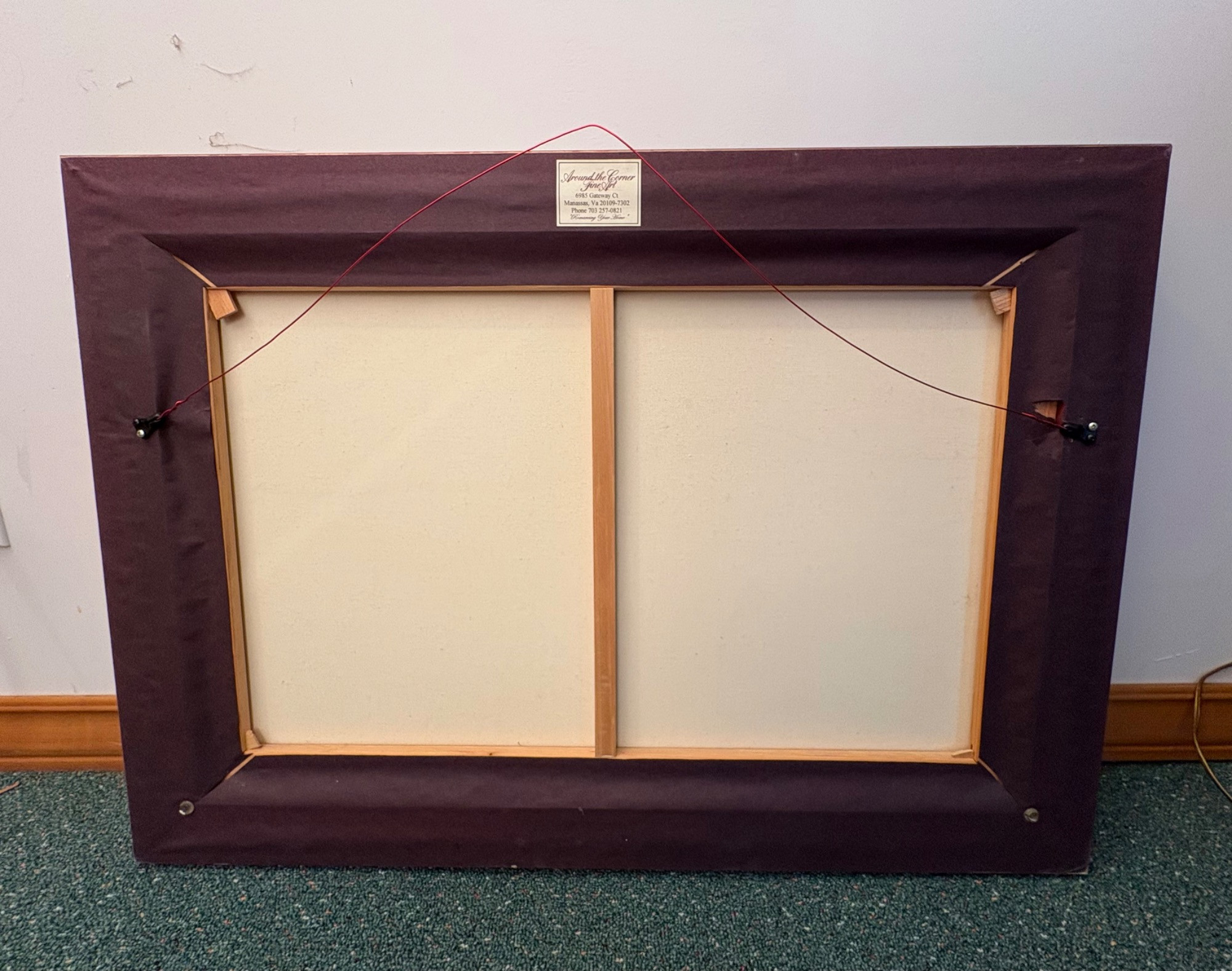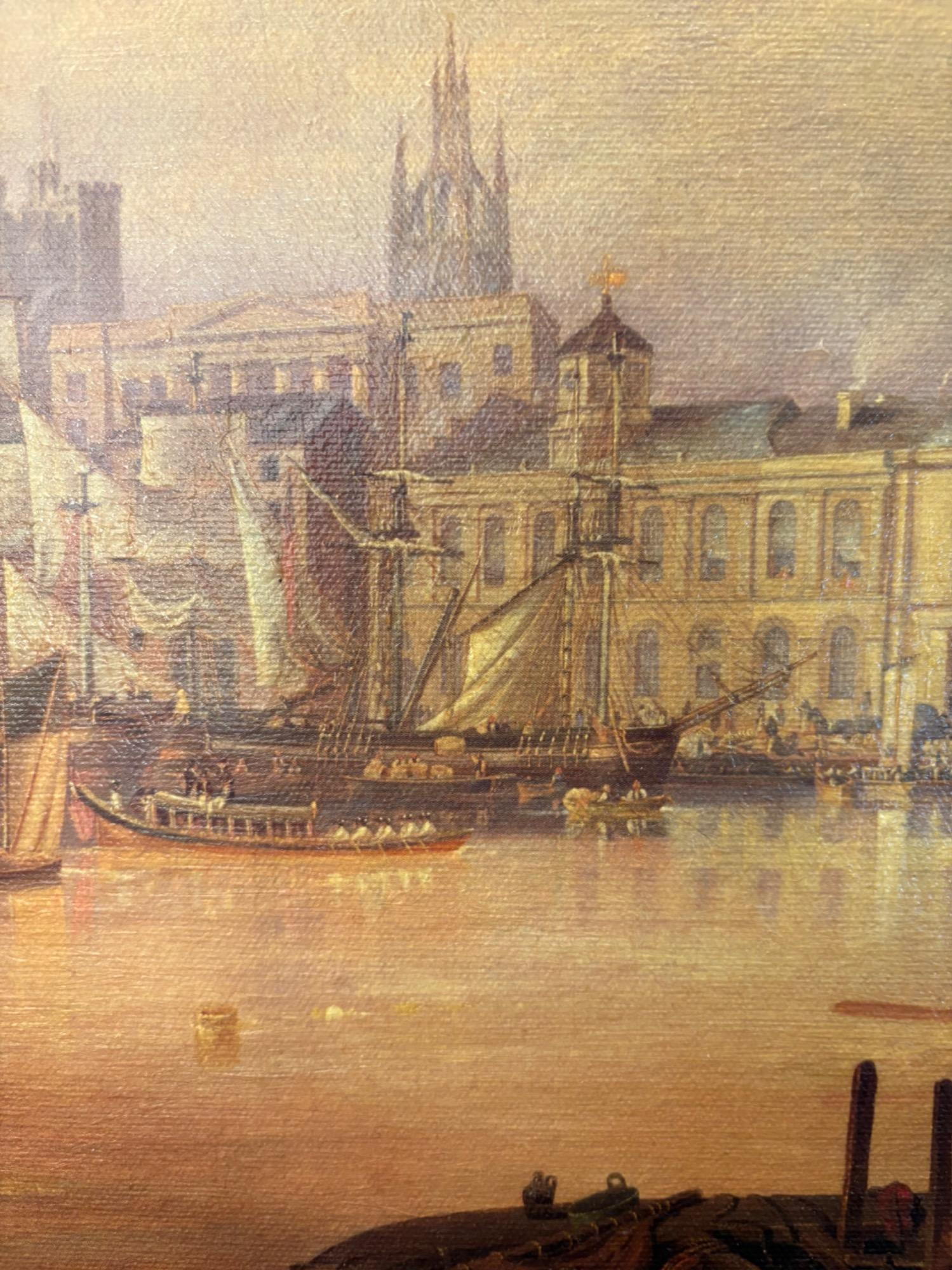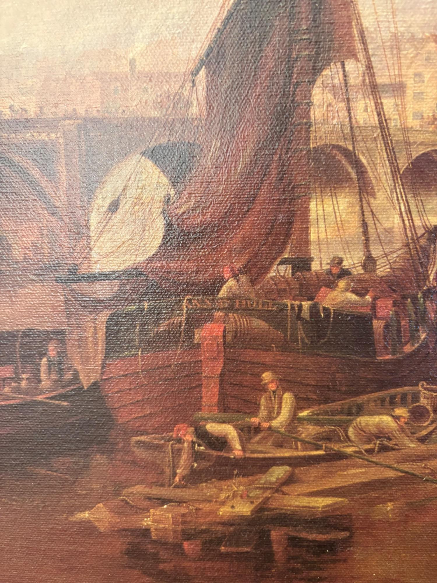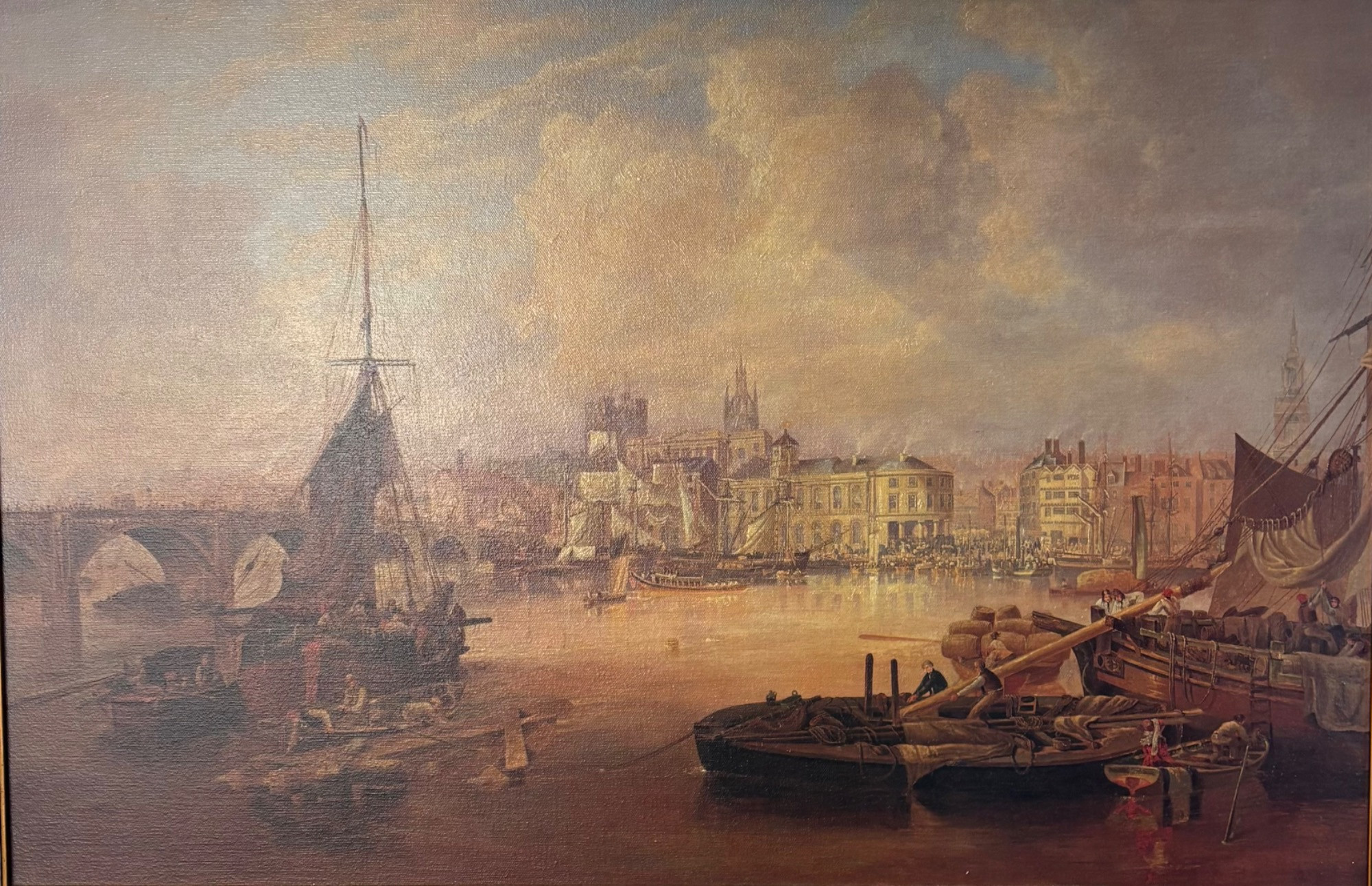 “Skyline from the River” by an anonymous painter circa 1690. Reproduction painting on canvas in an ornate gold wood frame. Medium sized piece at about 2' high by 3' wide framed. Please note there is a small piece of the right top frame that has gone missing. It could easily be touched up with gold paint & wouldn't be noticeable. From Around the Corner Fine Art of Virginia known for producing high quality reproductions & frames in the 1980s & 1990s (Sadly, they appear to have closed shop in the early 2000s). We found a catalogue offering many of the exact works our client owned that roughly aligns with our client's purchase dates (pre-internet when everything was phone ordered or mail ordered). For those curious about the original price range/production of the paintings, see catalogue info in photos below after the listing photos. Can be shipped FedEx.