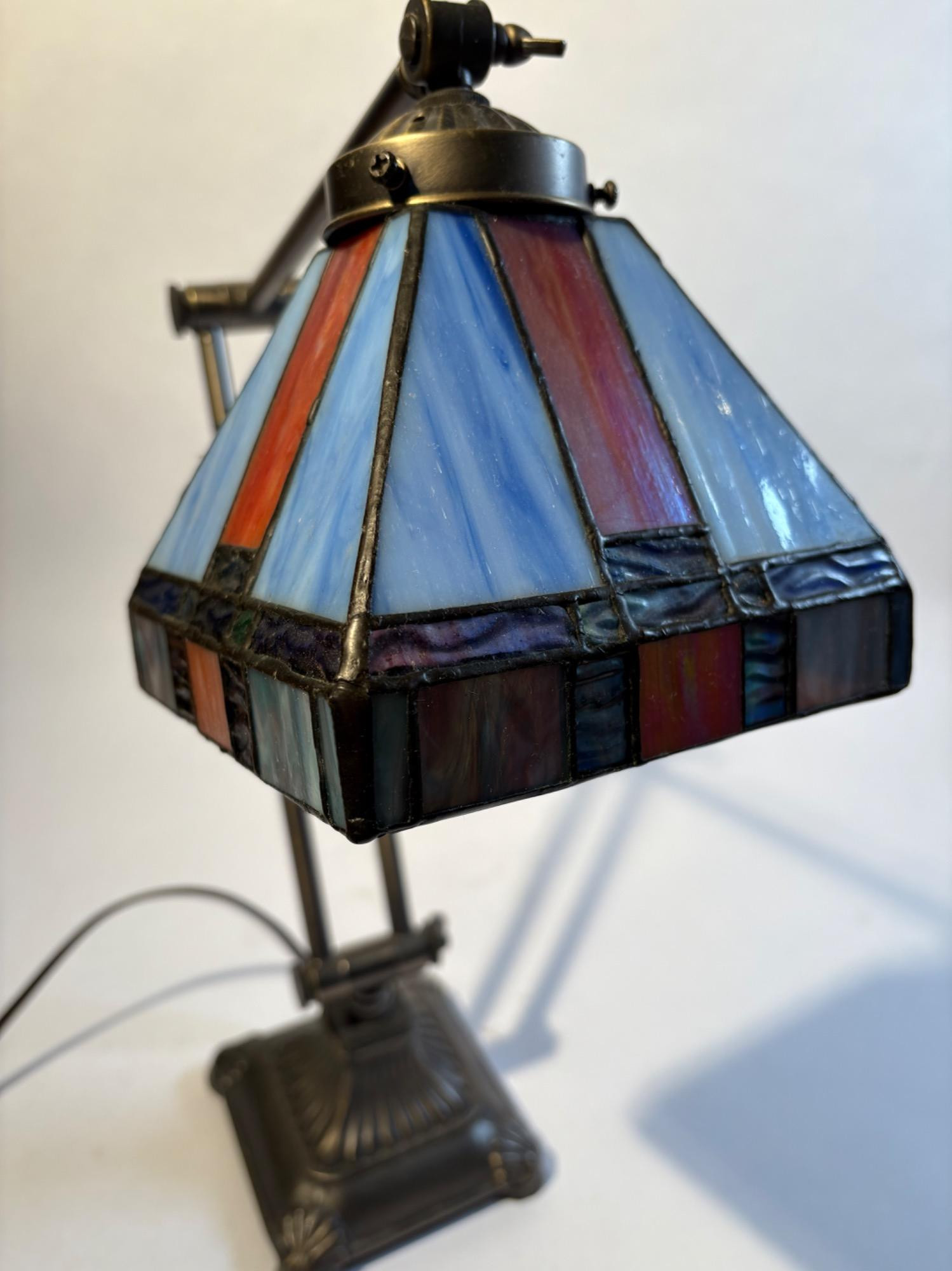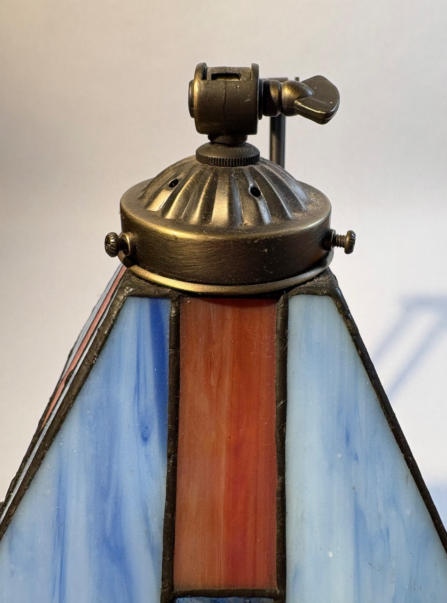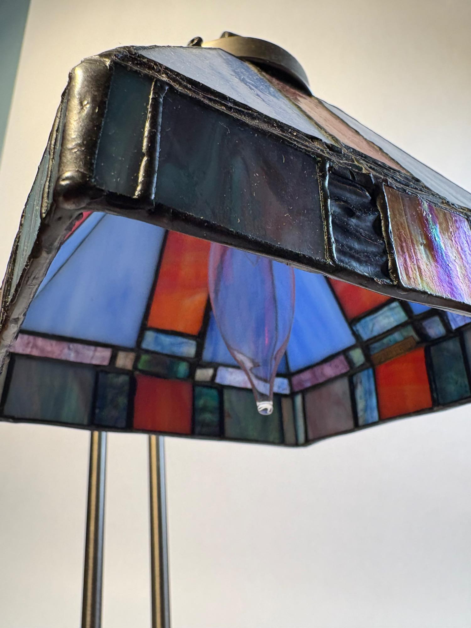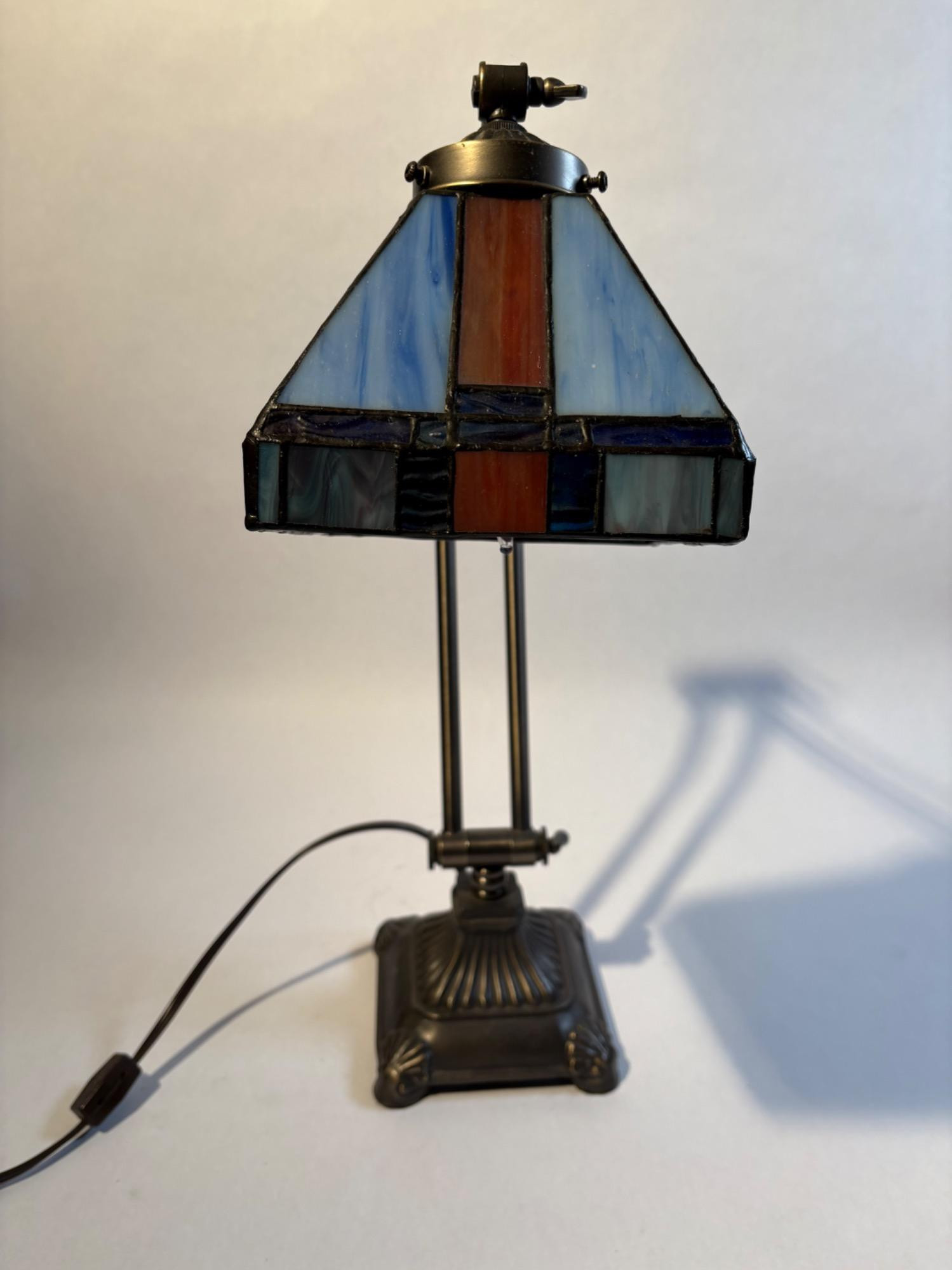 Lovely retro style stained glass table lamp. Cast metal with square blue & brown stained-glass shade. Shade measures approximately 5.75" square and about 6" H. Lamp as positioned in second photo is approx. 20" H. It has a 6' cord with a 2-prong plug and touch on and off. Appears to be in excellent operating condition.