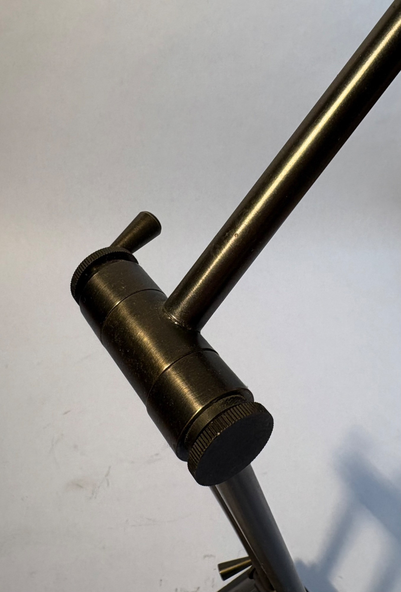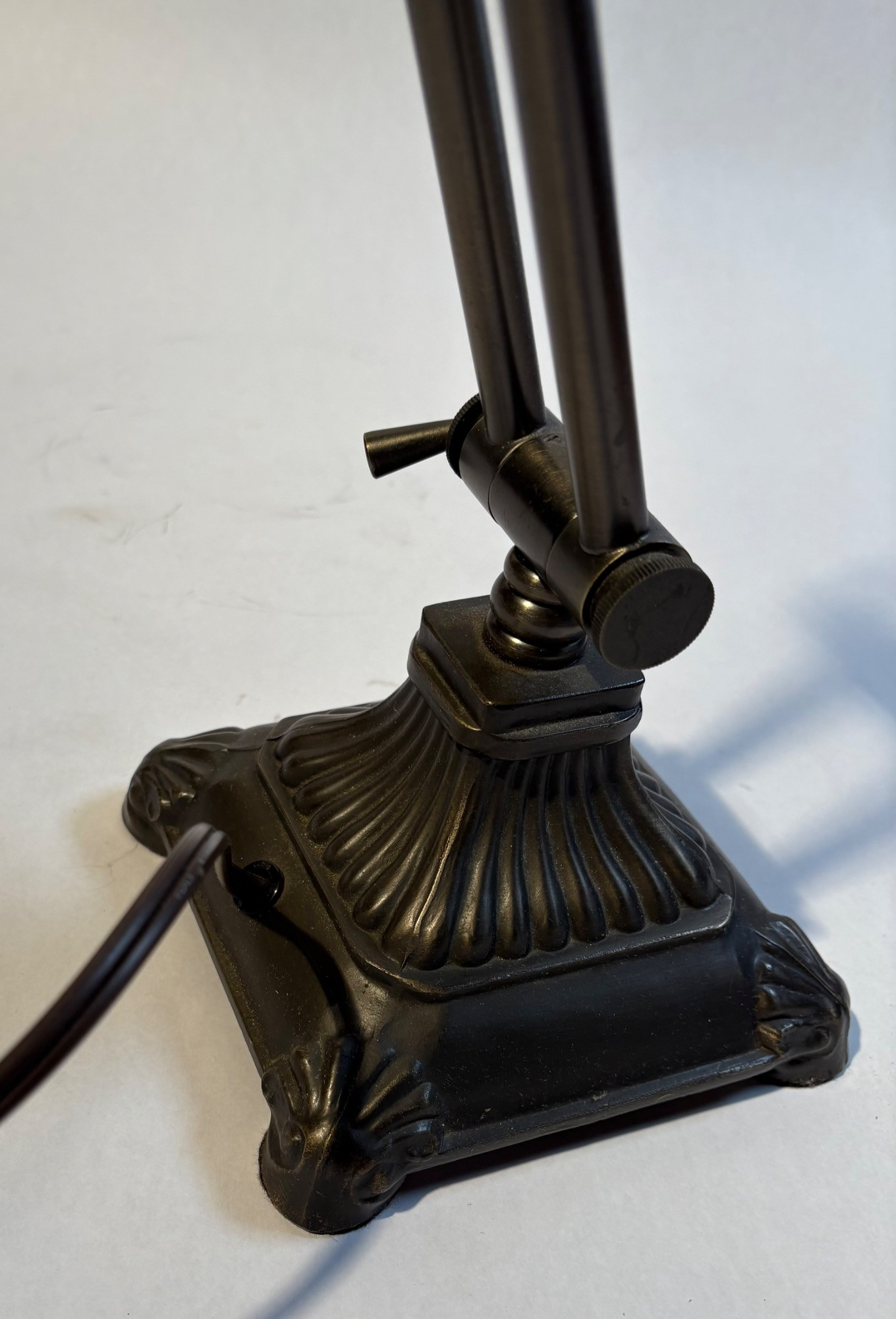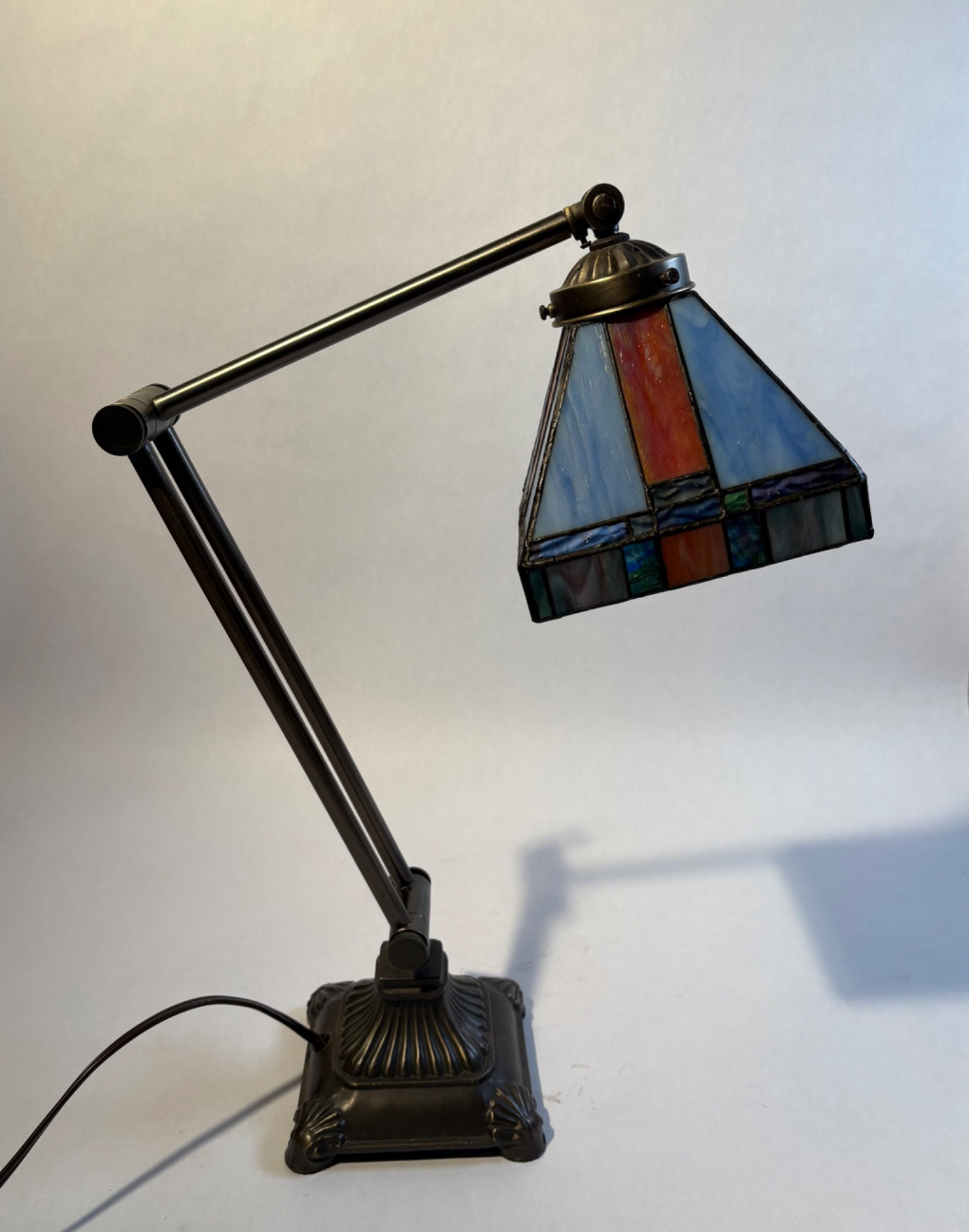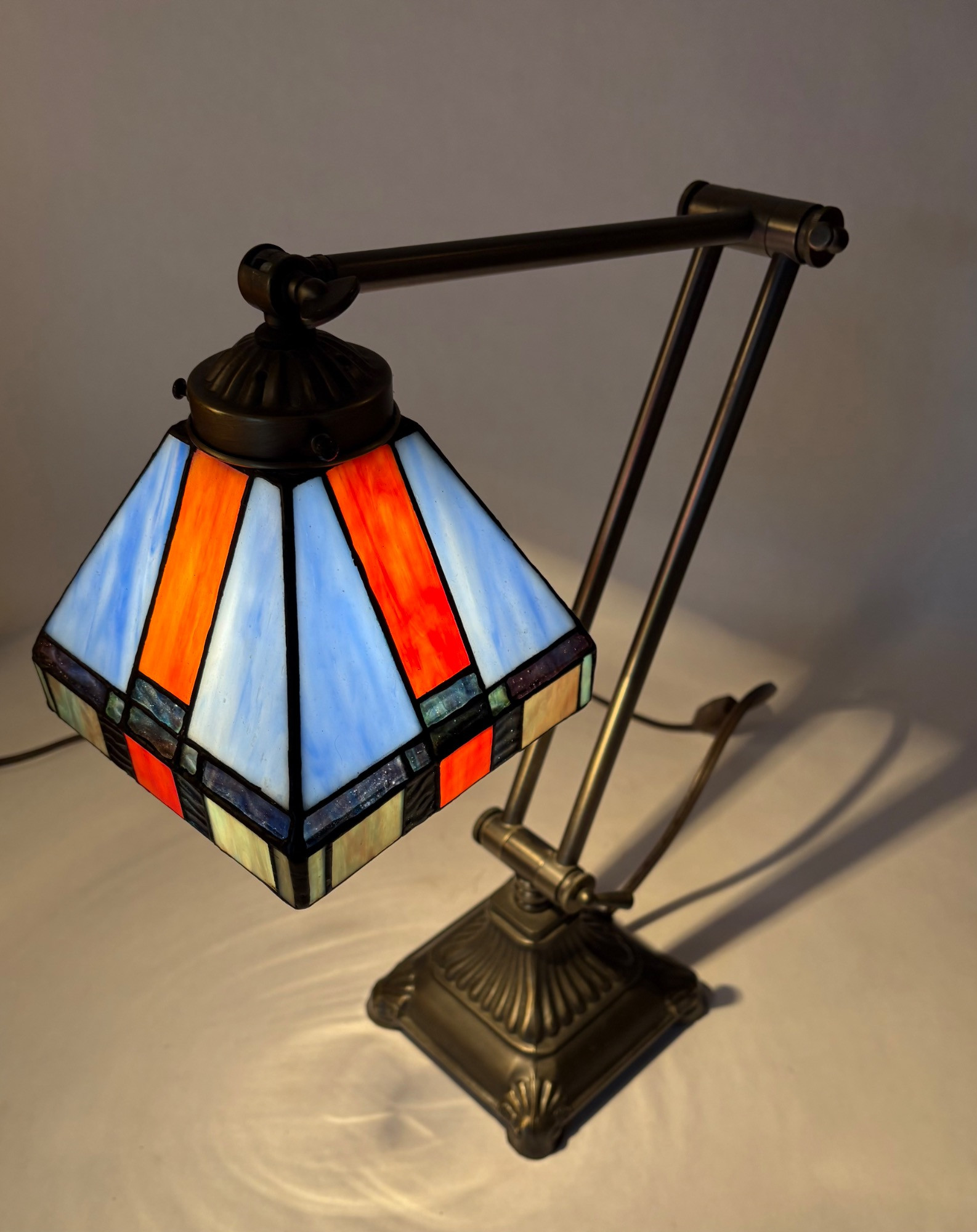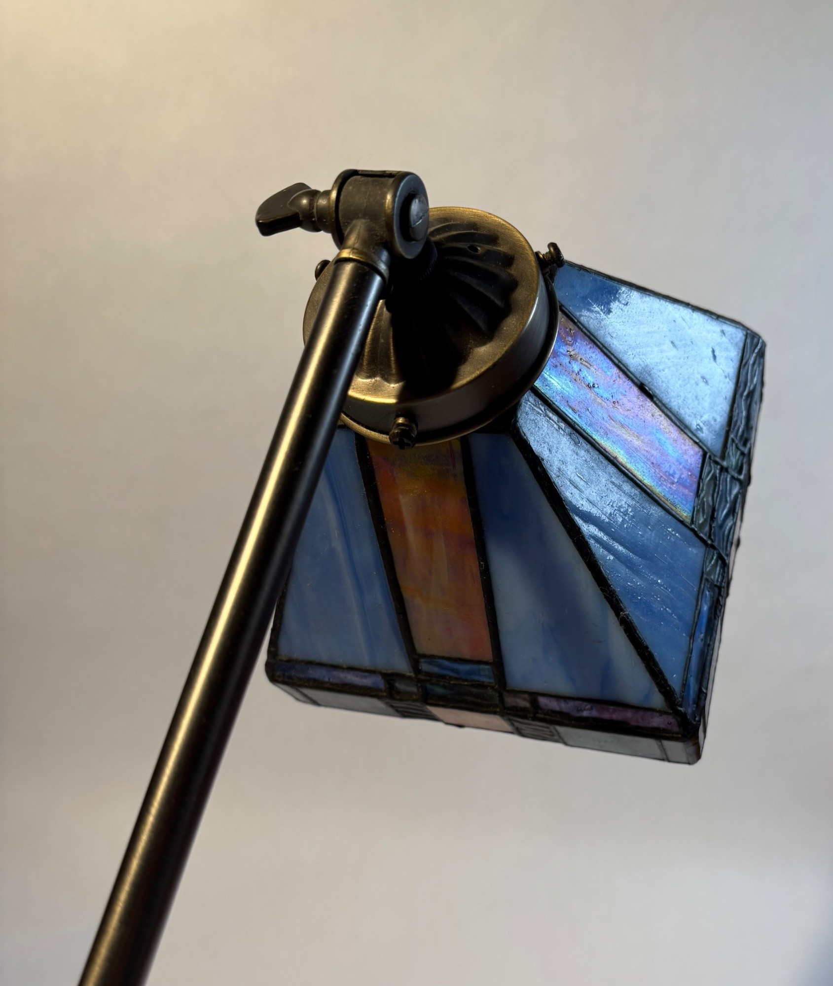 Lovely retro style stained glass table lamp. Cast metal with square blue & brown stained-glass shade. Shade measures approximately 5.75" square and about 6" H. Lamp as positioned in second photo is approx. 20" H. It has a 6' cord with a 2-prong plug and touch on and off. Appears to be in excellent operating condition.