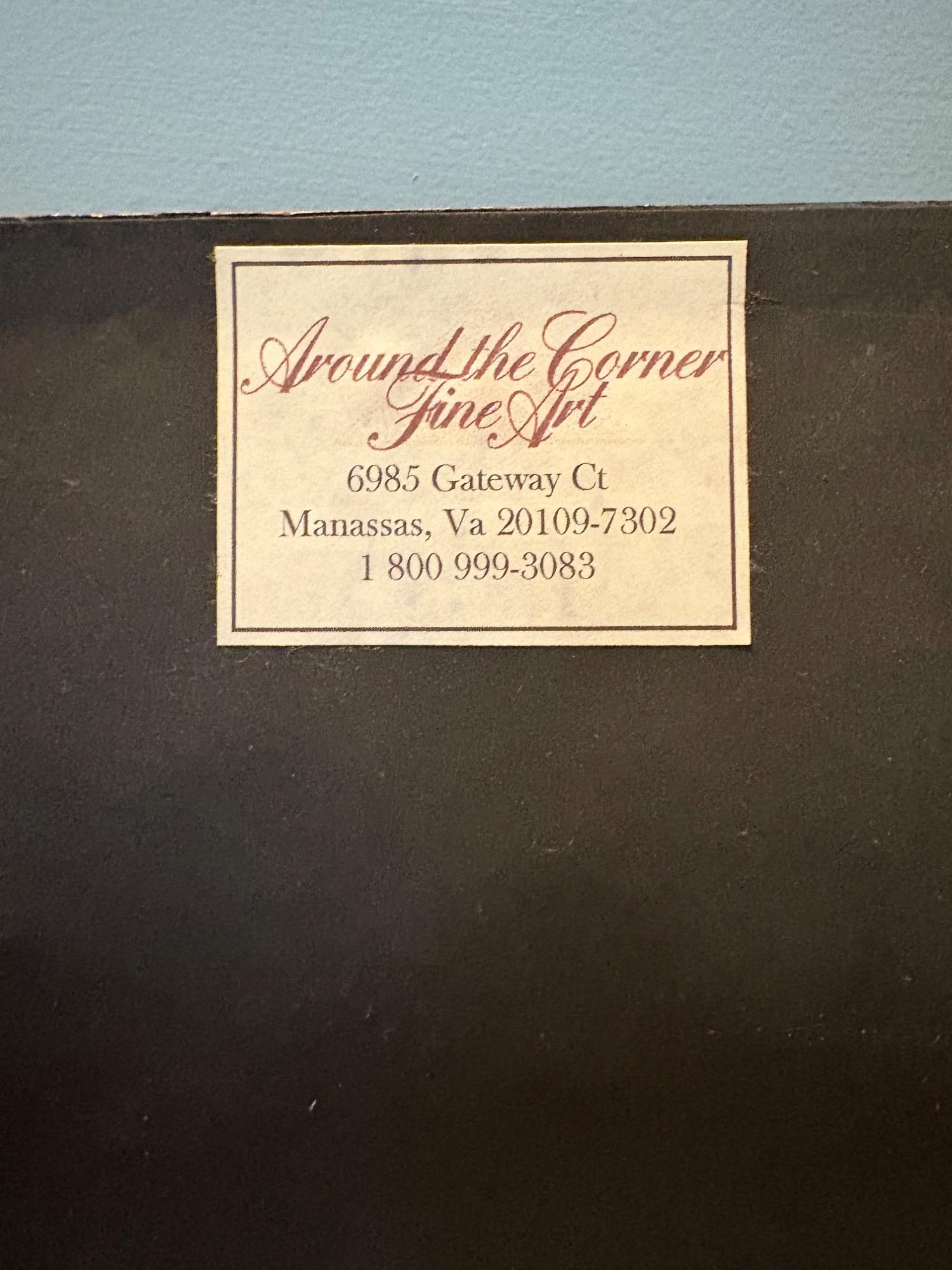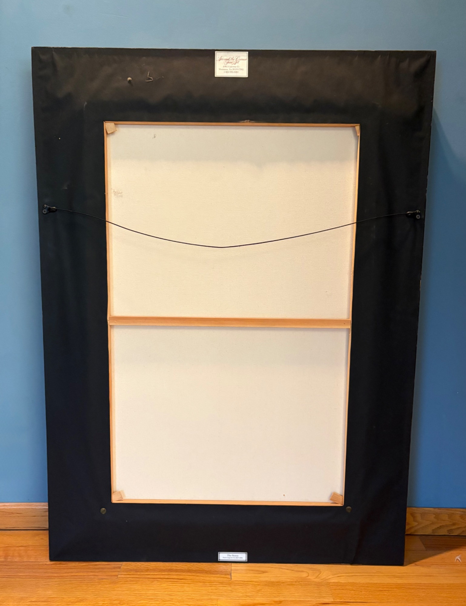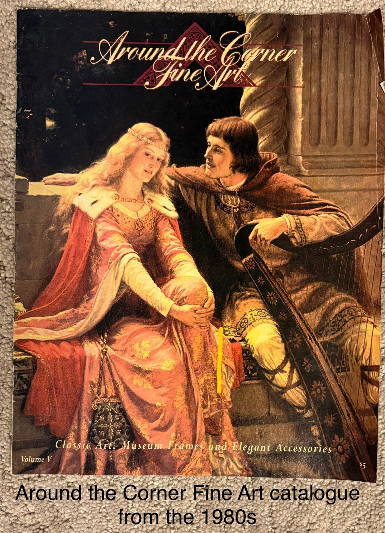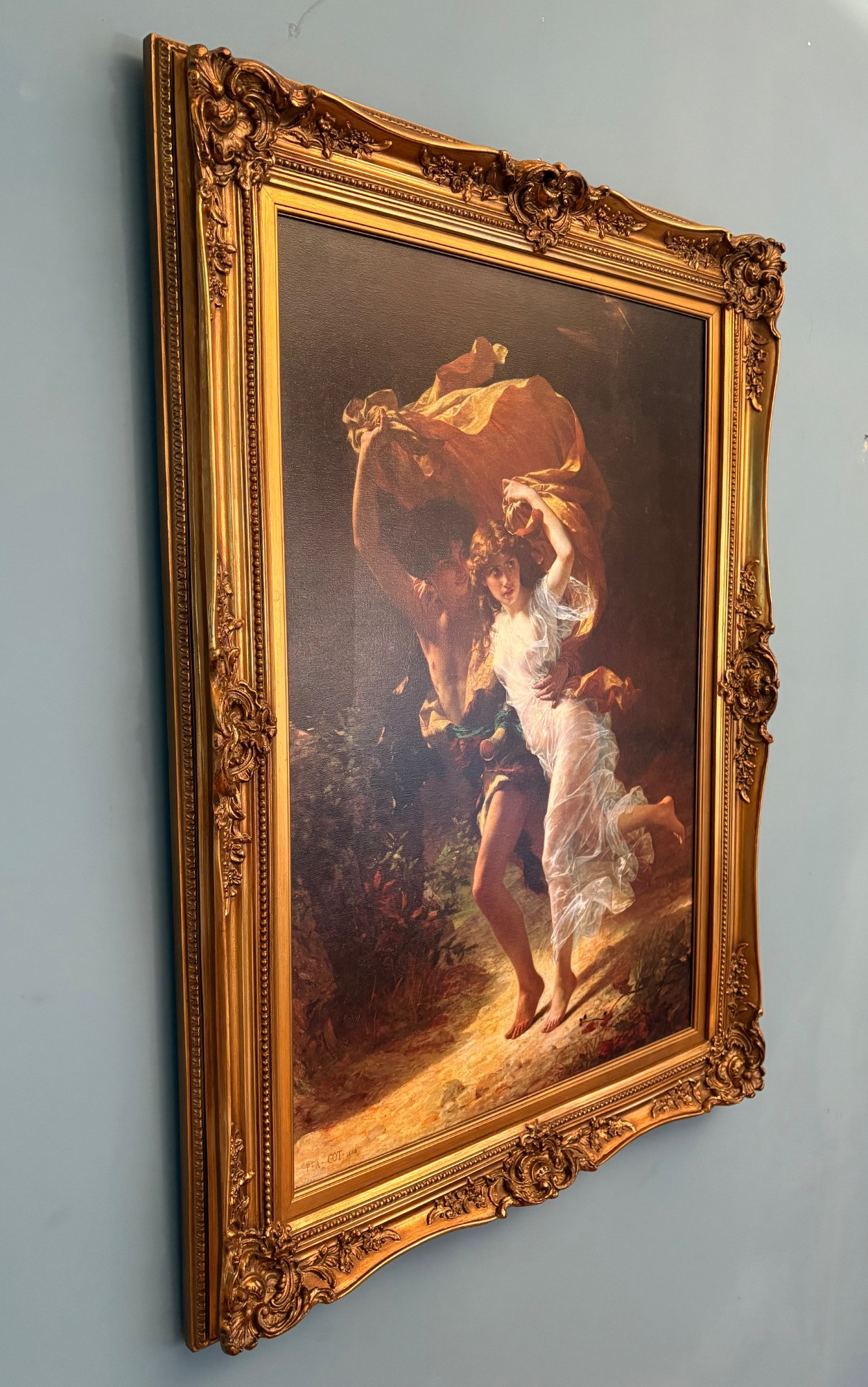 “The Storm” by Pierre Auguste Cot (1837 - 1883). Reproduction painting on canvas with typical classical imagery and high contrasts lighting. Surrounded by a lovely carved wood frame in gold. Medium or larger size work at just under 4' high by 3' wide framed. From Around the Corner Fine Art of Virginia known for producing high quality reproductions & frames in the 1980s & 1990s (Sadly, they appear to have closed shop in the early 2000s). We found a catalogue offering many of the exact works our client owned that roughly aligns with our client's purchase dates (pre-internet when everything was phone ordered or mail ordered). For those curious about the original price range/production of the paintings, see catalogue info in photos below after the listing photos.