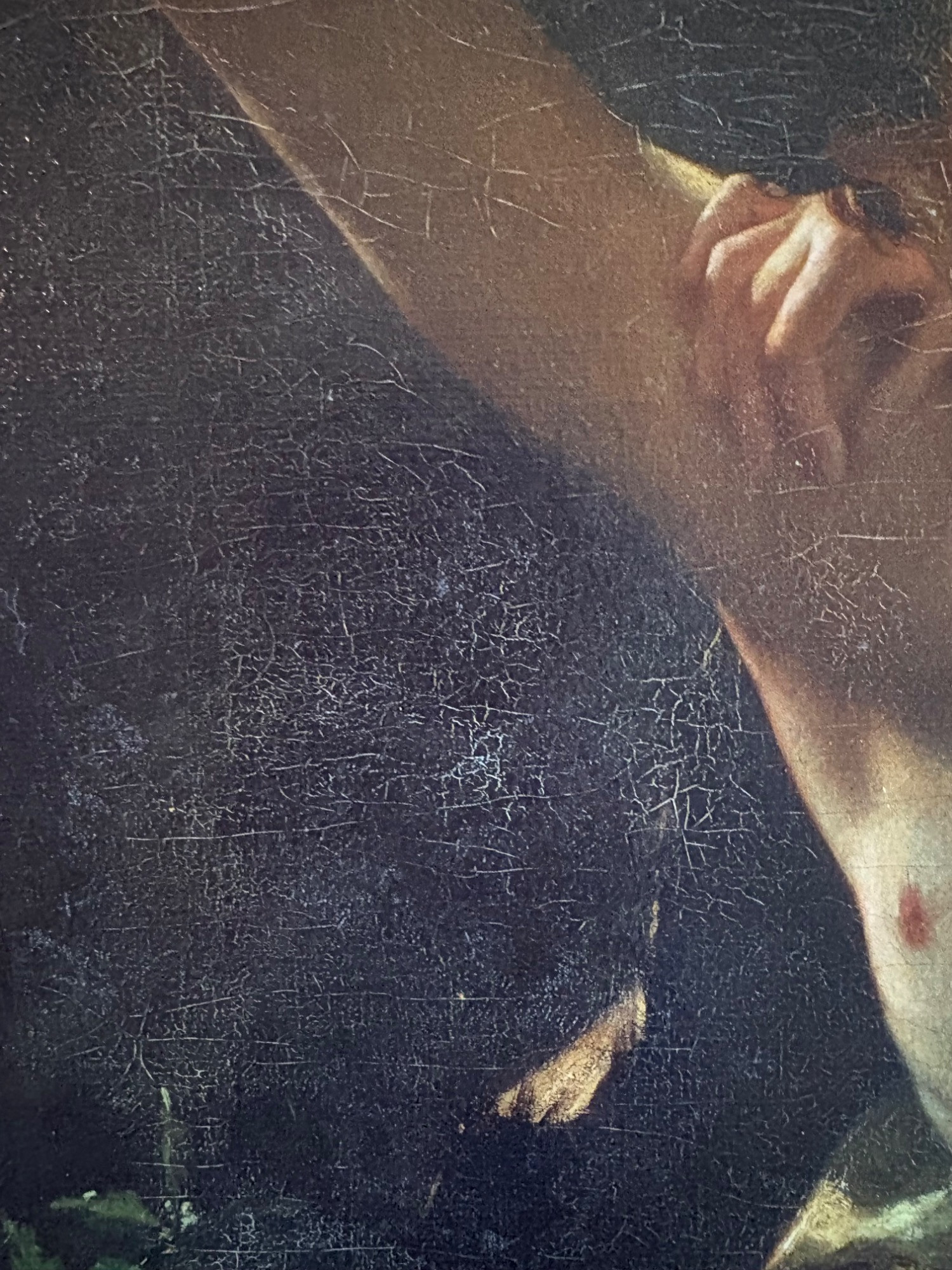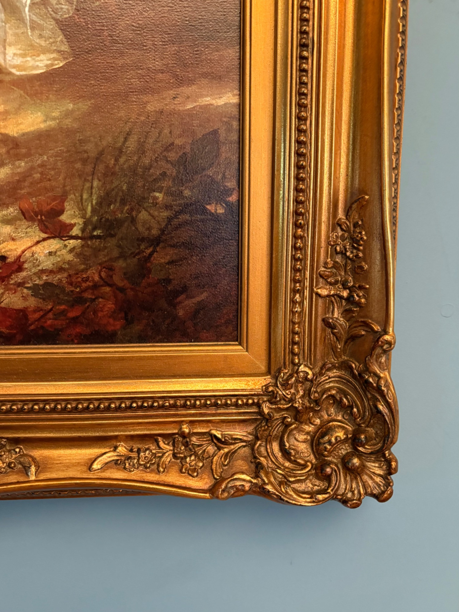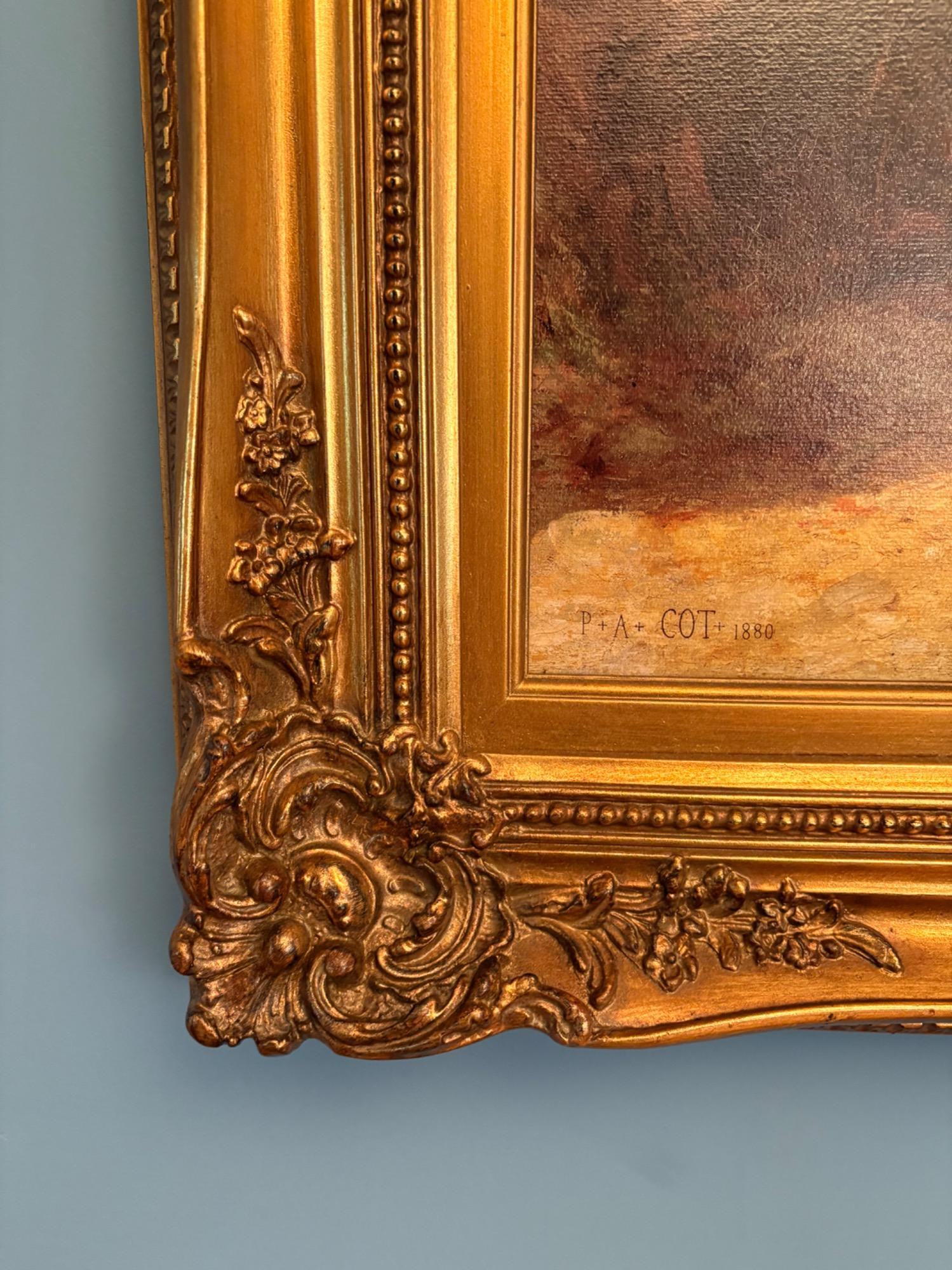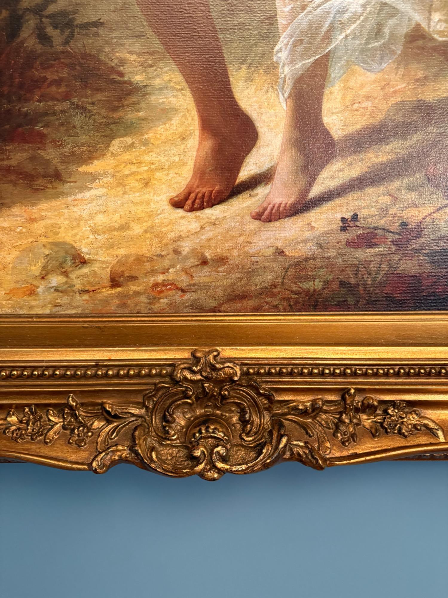 “The Storm” by Pierre Auguste Cot (1837 - 1883). Reproduction painting on canvas with typical classical imagery and high contrasts lighting. Surrounded by a lovely carved wood frame in gold. Medium or larger size work at just under 4' high by 3' wide framed. From Around the Corner Fine Art of Virginia known for producing high quality reproductions & frames in the 1980s & 1990s (Sadly, they appear to have closed shop in the early 2000s). We found a catalogue offering many of the exact works our client owned that roughly aligns with our client's purchase dates (pre-internet when everything was phone ordered or mail ordered). For those curious about the original price range/production of the paintings, see catalogue info in photos below after the listing photos.