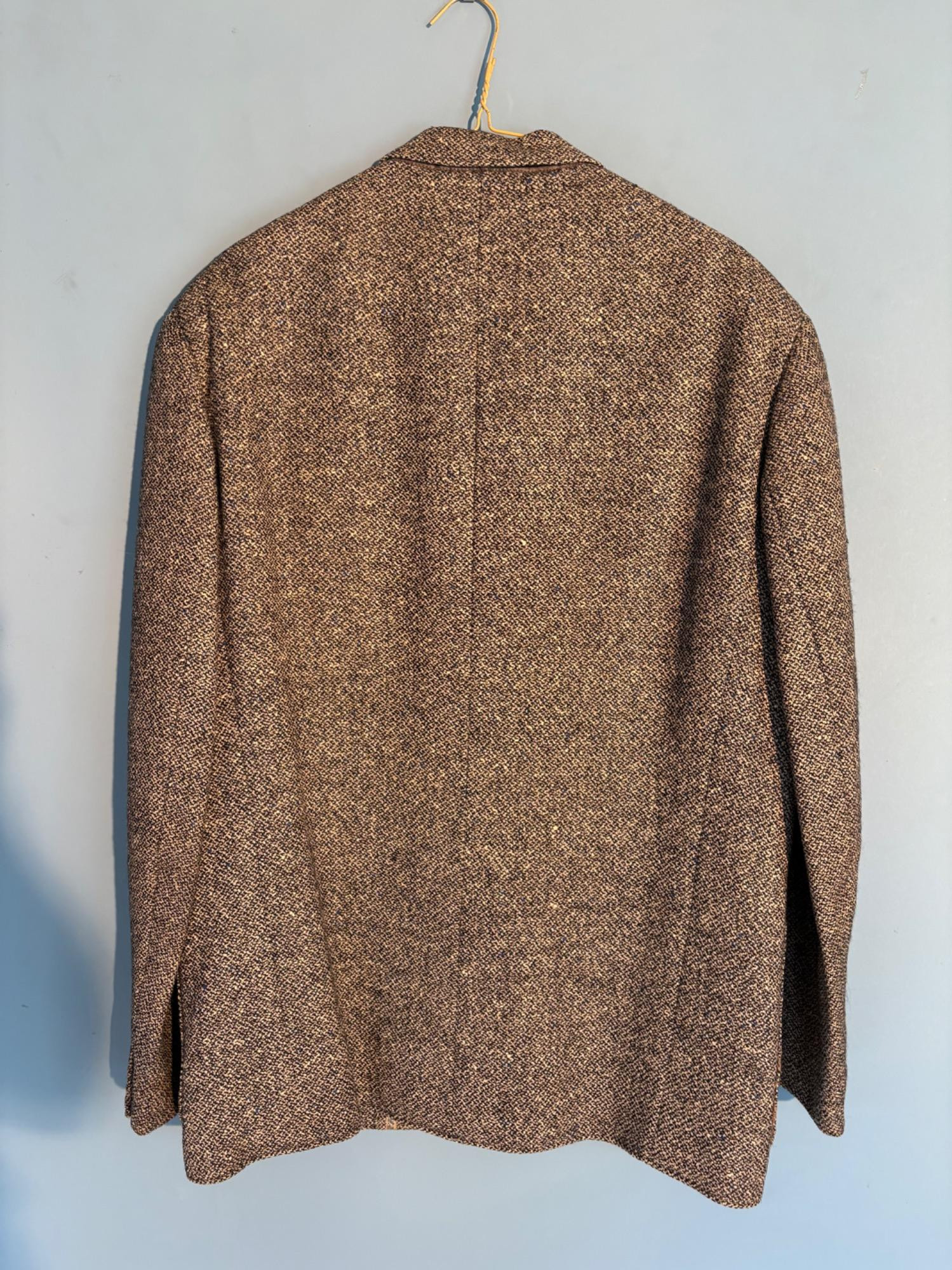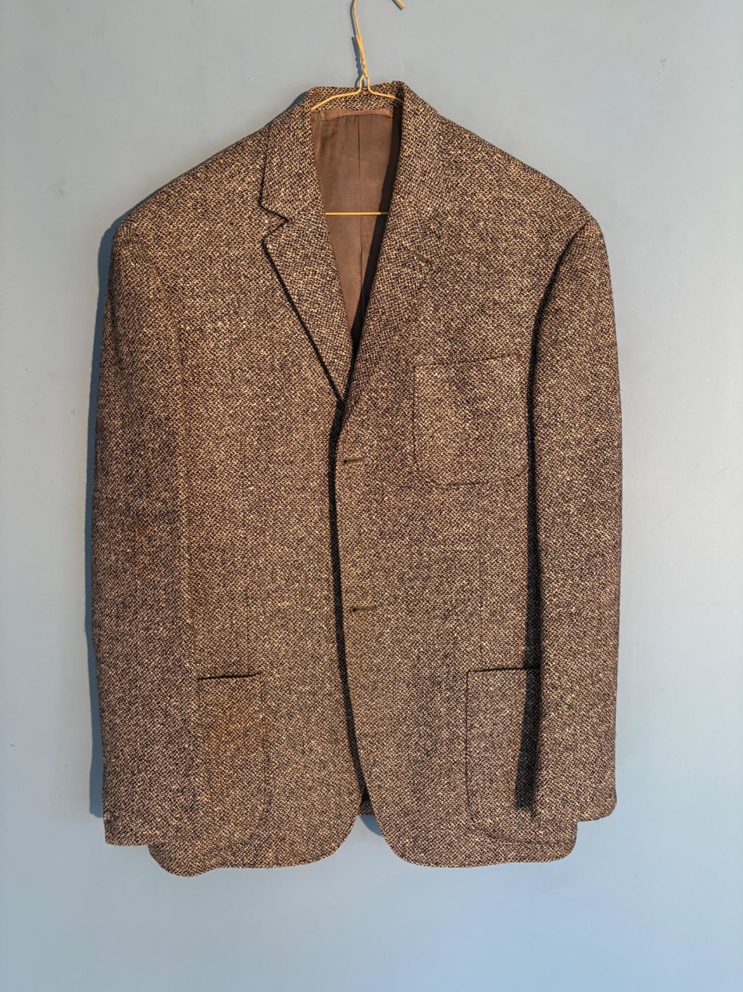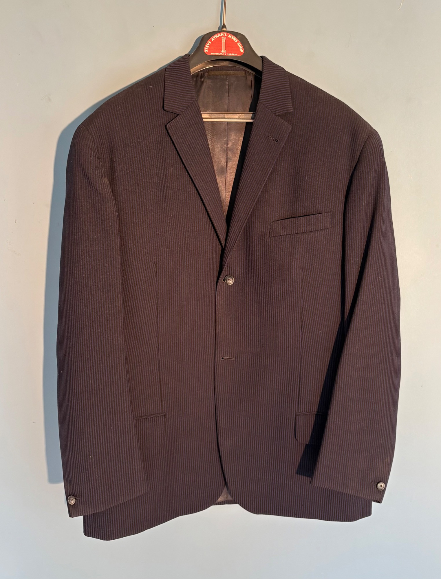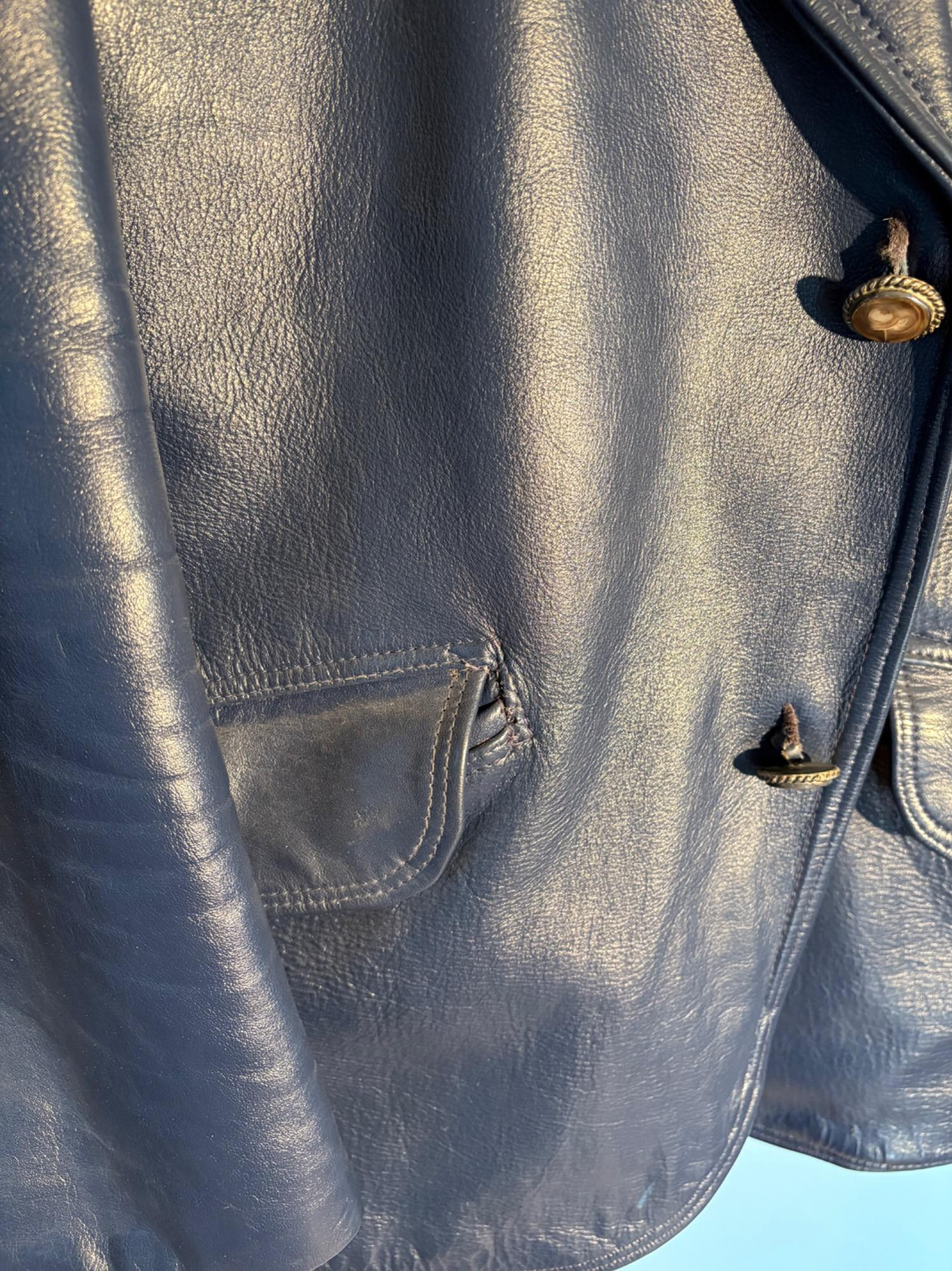 Vintage sport jacket quartet. The first 3 jackets in this lot were made in Europe and are vintage. We could not find sizes on them, but are guessing they are somewhere around a 44 or 46 long given the client's other suits. They all appear to be wool and there are a few moth holes in the striped jacket - see last 2 photos - and some flaw here and there. However we believe all three were beautiful pieces of workmanship in their day and a vintage enthusiast would love them and find the small repairs worth doing. Vintage navy blue leather sport coat-style jacket. Has two-button front closure and is lined in red. No traditional makers tag but embossed in the leather on the inside pocket is "Azure by Lin - 1978". This leads us to think that it was custom made for our client and his other jackets were 44 or 46 long and/or XL. Note that the lining is a little worse for wear - see last photo - but the exterior leather appears to be in great shape. It would be worth getting the jacket relined if you like it as the leather is heavy-duty. and in great condition. Bonus - additional blue wool sport jacket not pictured; has breast pocket removed.