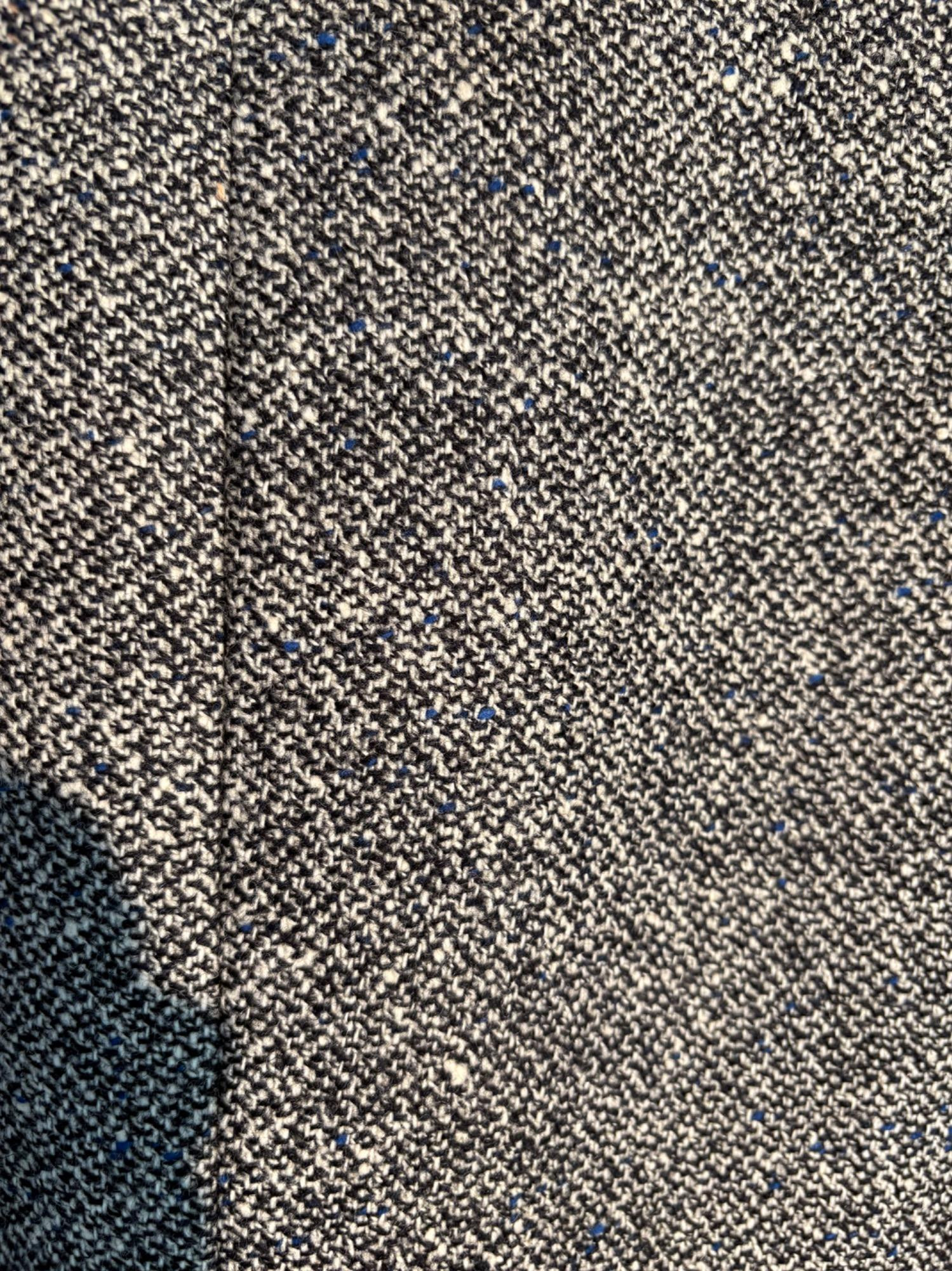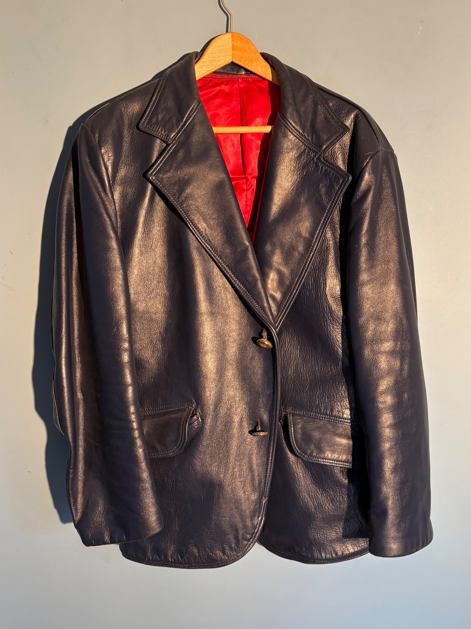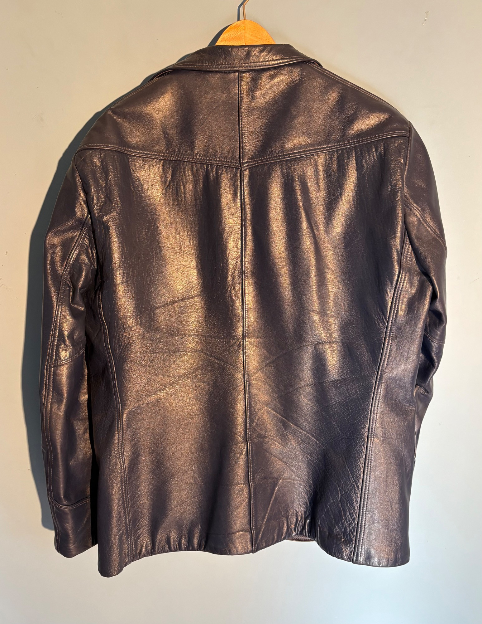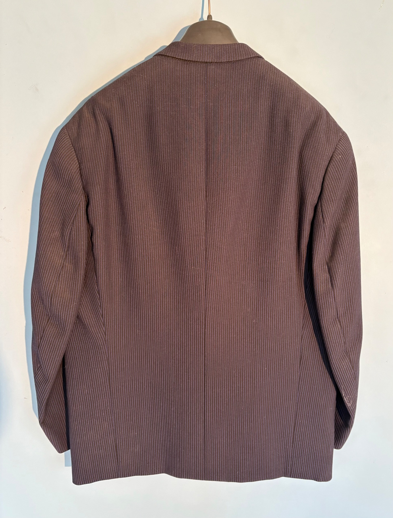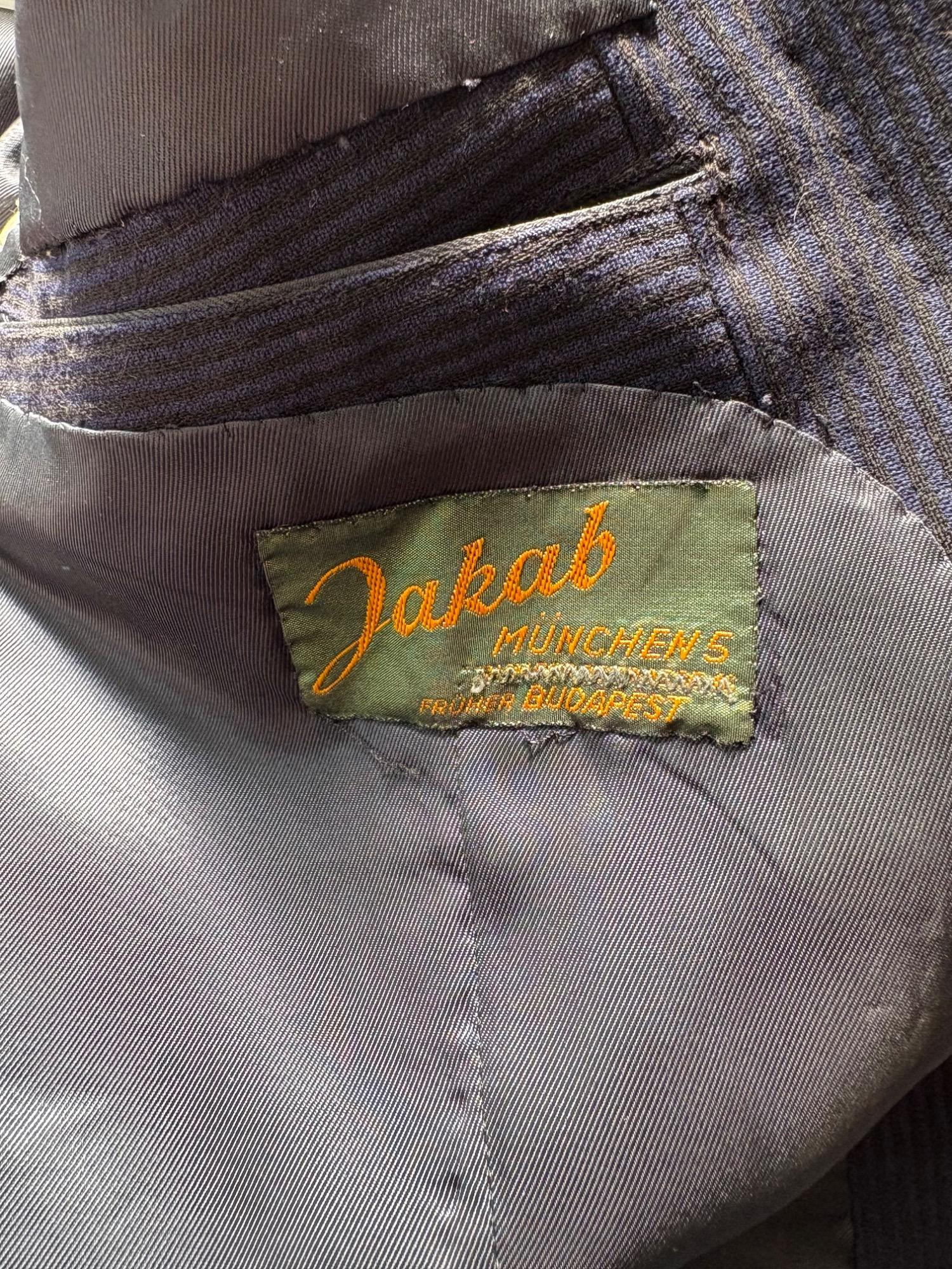 Vintage sport jacket quartet. The first 3 jackets in this lot were made in Europe and are vintage. We could not find sizes on them, but are guessing they are somewhere around a 44 or 46 long given the client's other suits. They all appear to be wool and there are a few moth holes in the striped jacket - see last 2 photos - and some flaw here and there. However we believe all three were beautiful pieces of workmanship in their day and a vintage enthusiast would love them and find the small repairs worth doing. Vintage navy blue leather sport coat-style jacket. Has two-button front closure and is lined in red. No traditional makers tag but embossed in the leather on the inside pocket is "Azure by Lin - 1978". This leads us to think that it was custom made for our client and his other jackets were 44 or 46 long and/or XL. Note that the lining is a little worse for wear - see last photo - but the exterior leather appears to be in great shape. It would be worth getting the jacket relined if you like it as the leather is heavy-duty. and in great condition. Bonus - additional blue wool sport jacket not pictured; has breast pocket removed.