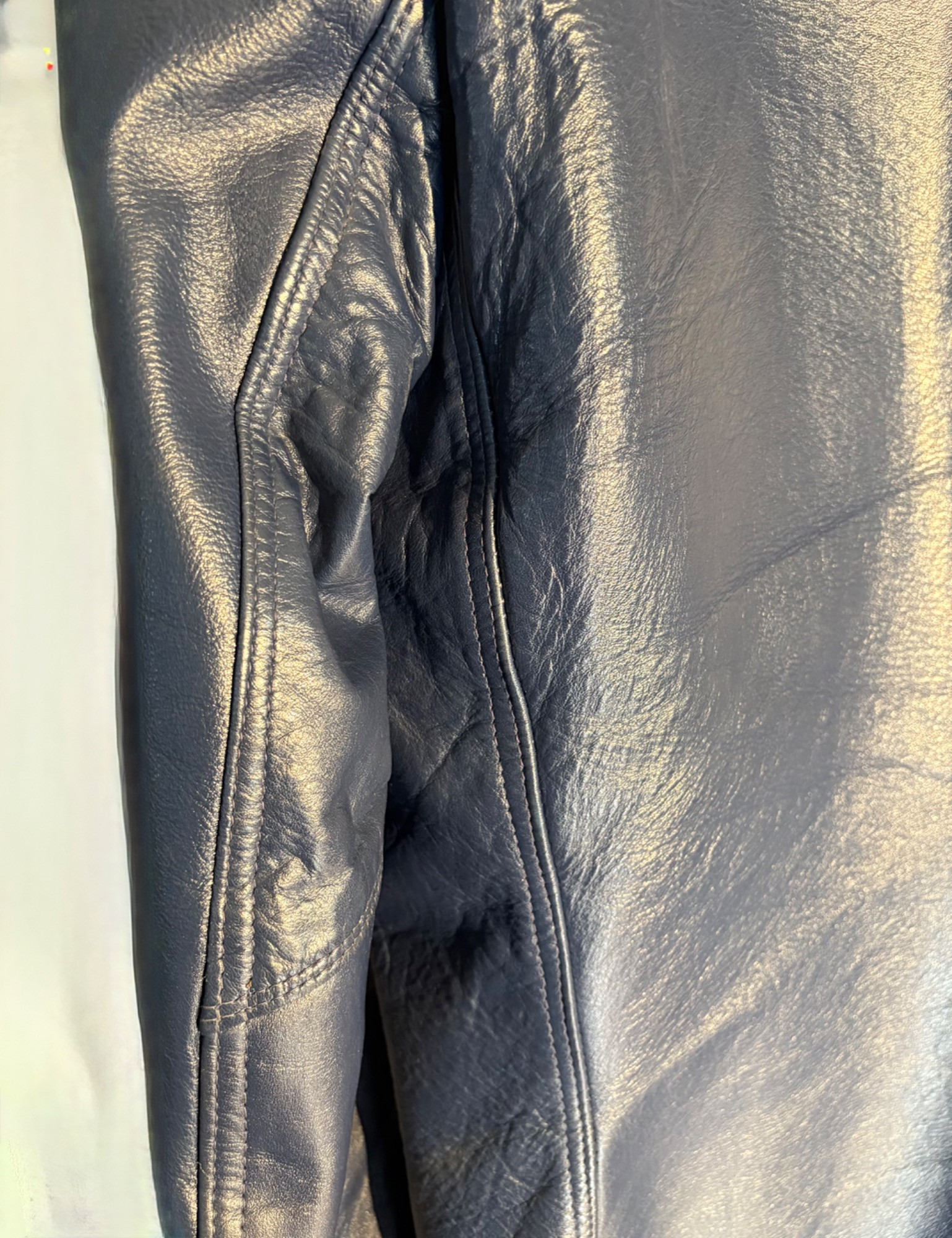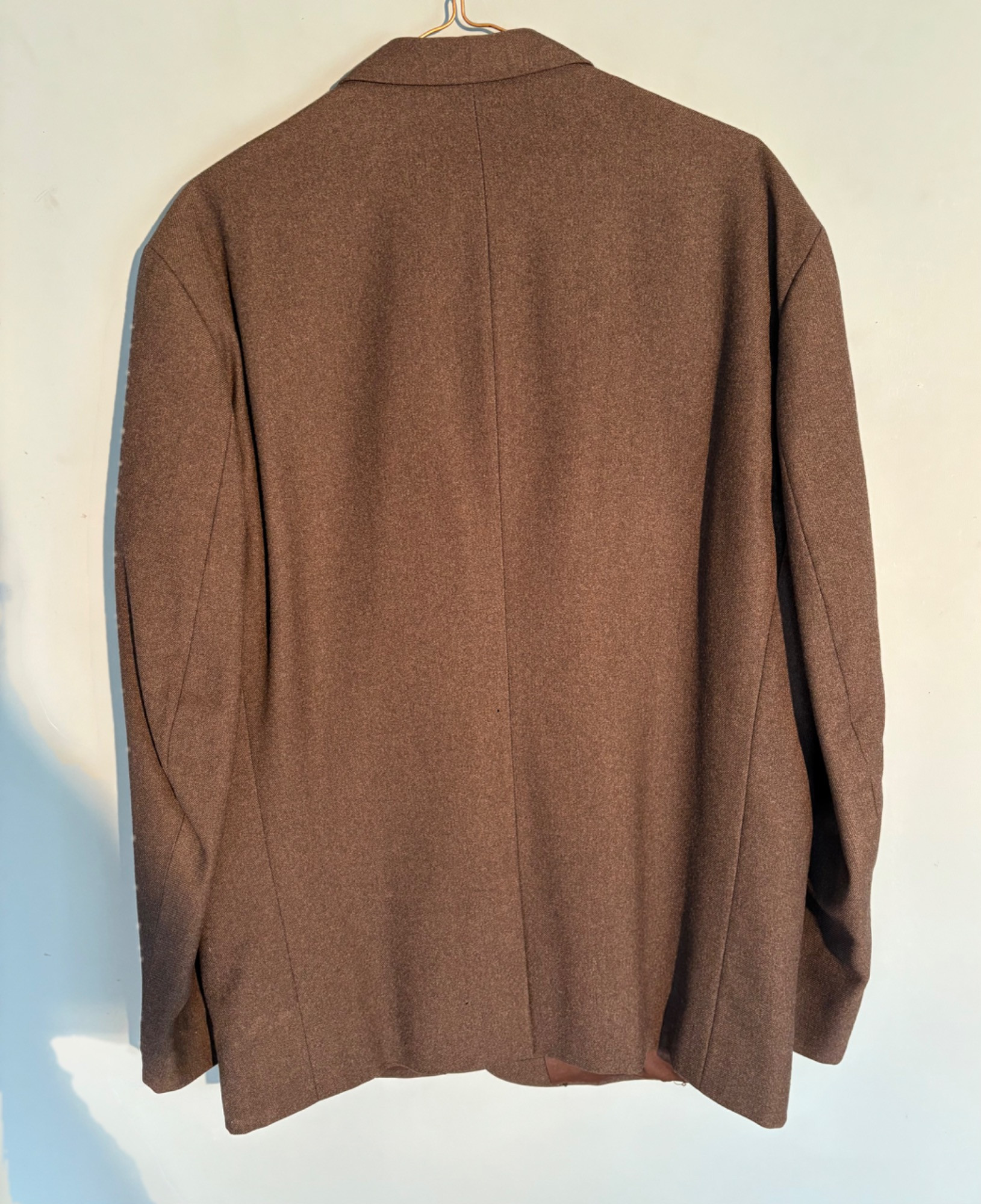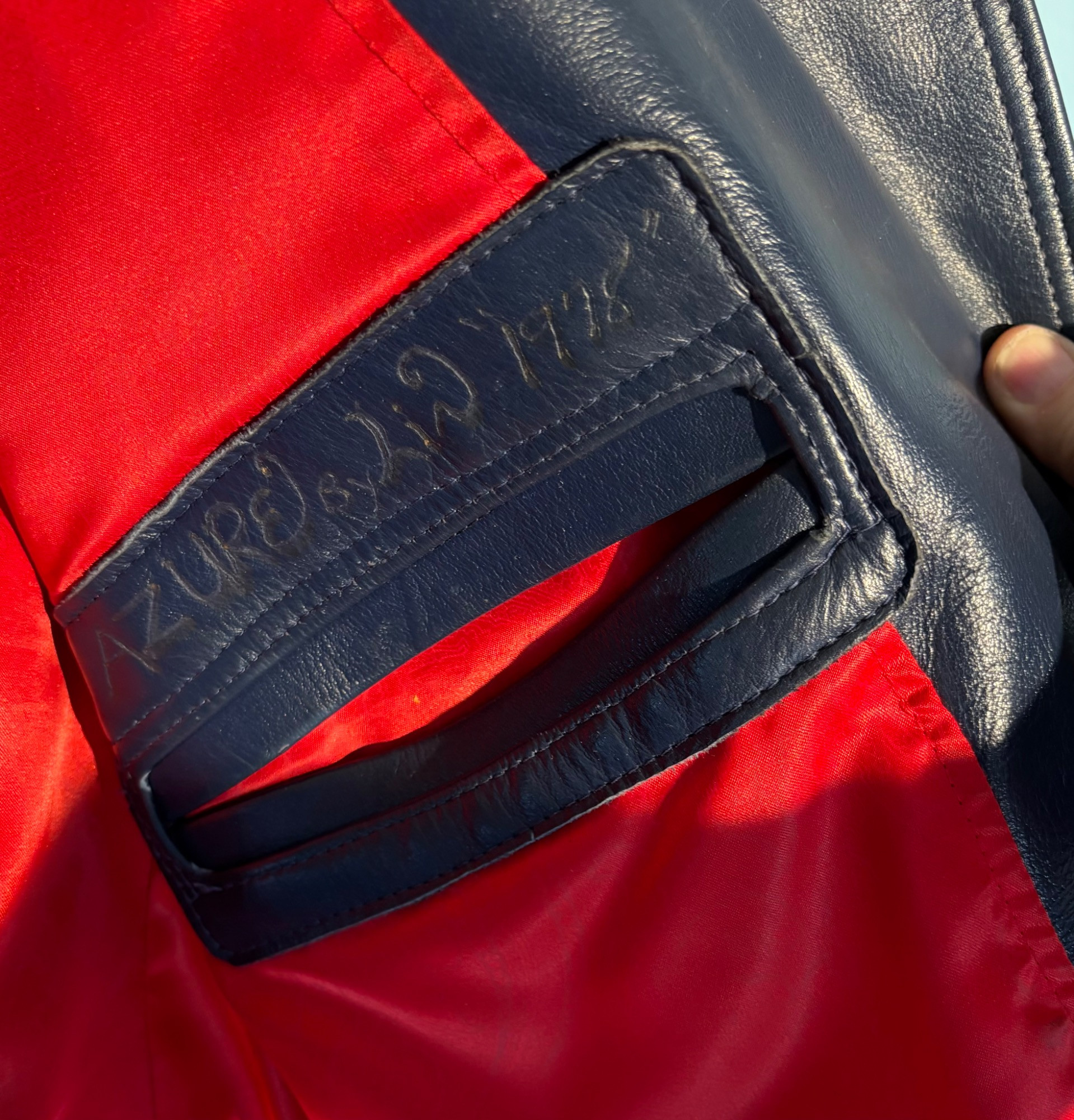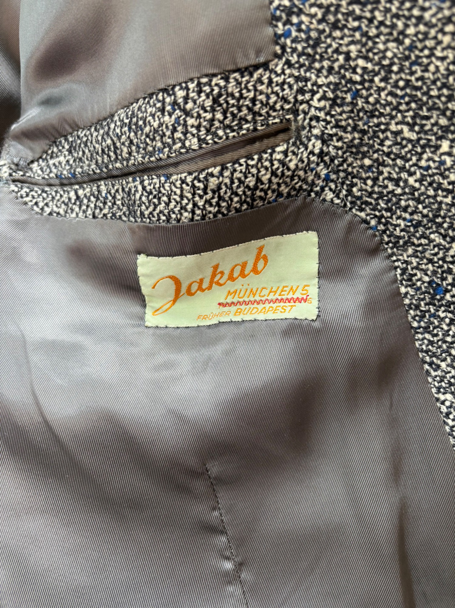 Vintage sport jacket quartet. The first 3 jackets in this lot were made in Europe and are vintage. We could not find sizes on them, but are guessing they are somewhere around a 44 or 46 long given the client's other suits. They all appear to be wool and there are a few moth holes in the striped jacket - see last 2 photos - and some flaw here and there. However we believe all three were beautiful pieces of workmanship in their day and a vintage enthusiast would love them and find the small repairs worth doing. Vintage navy blue leather sport coat-style jacket. Has two-button front closure and is lined in red. No traditional makers tag but embossed in the leather on the inside pocket is "Azure by Lin - 1978". This leads us to think that it was custom made for our client and his other jackets were 44 or 46 long and/or XL. Note that the lining is a little worse for wear - see last photo - but the exterior leather appears to be in great shape. It would be worth getting the jacket relined if you like it as the leather is heavy-duty. and in great condition. Bonus - additional blue wool sport jacket not pictured; has breast pocket removed.