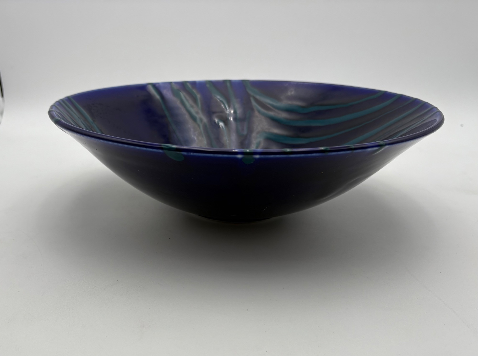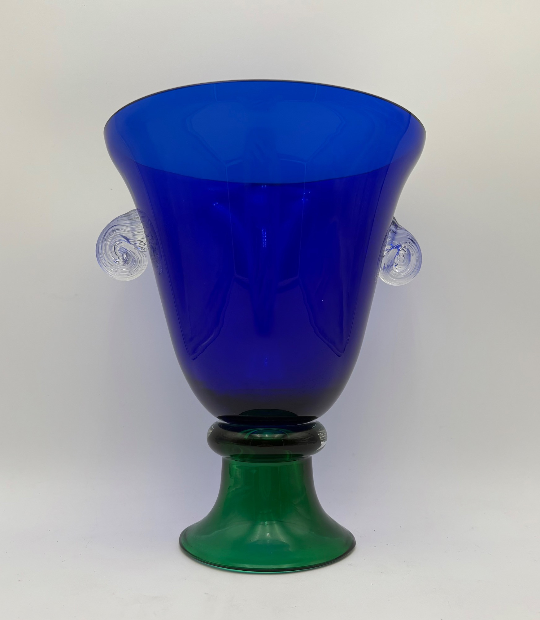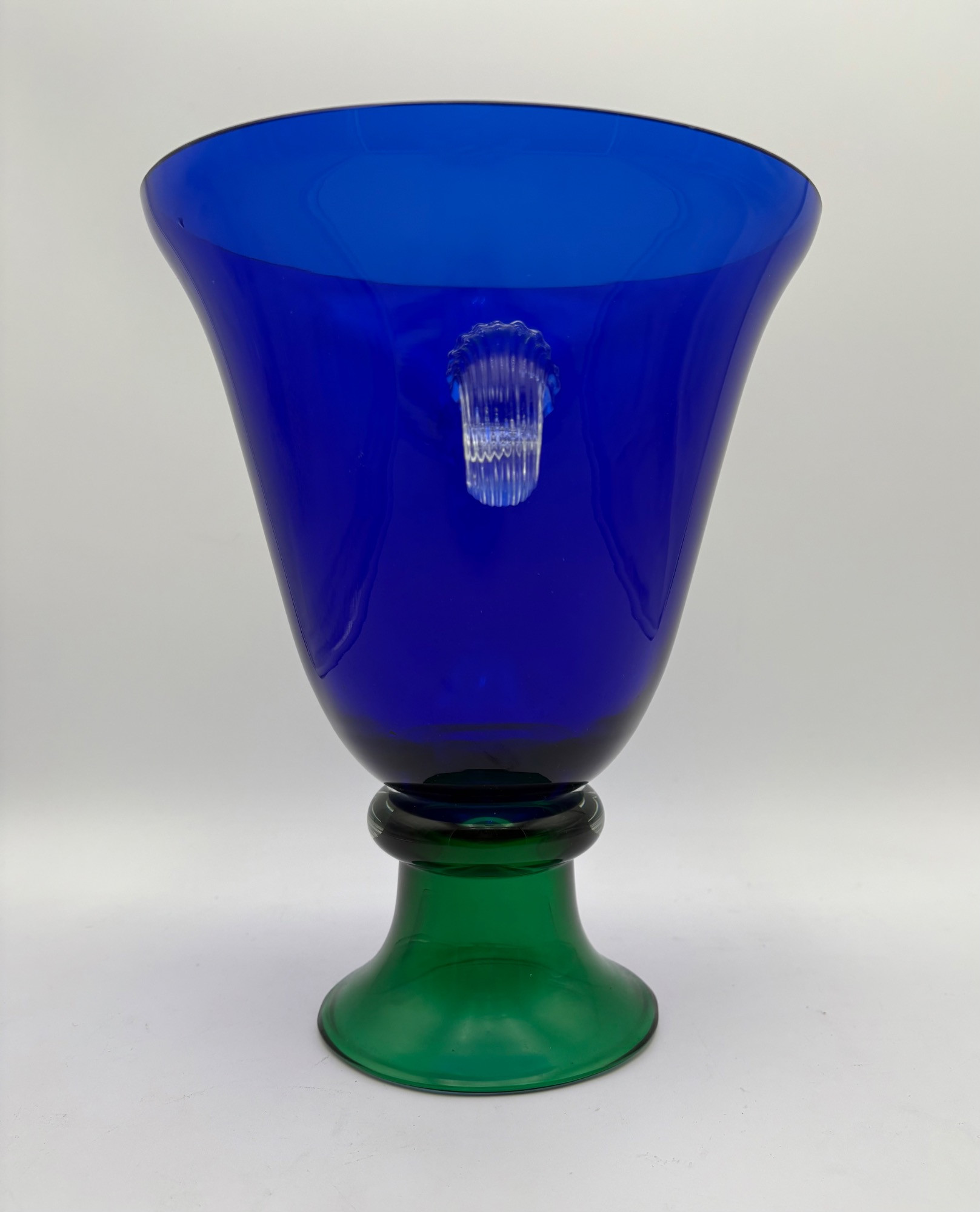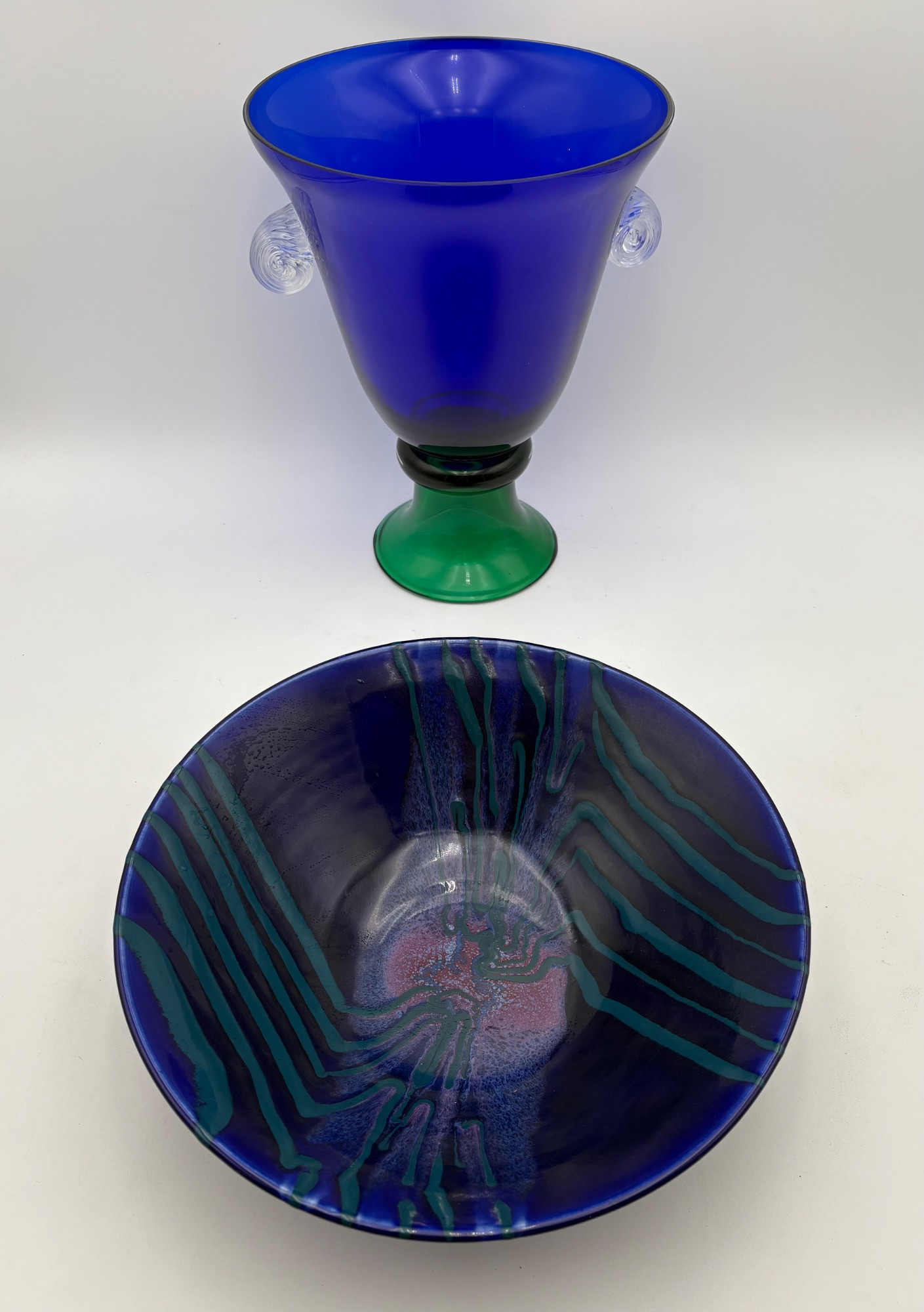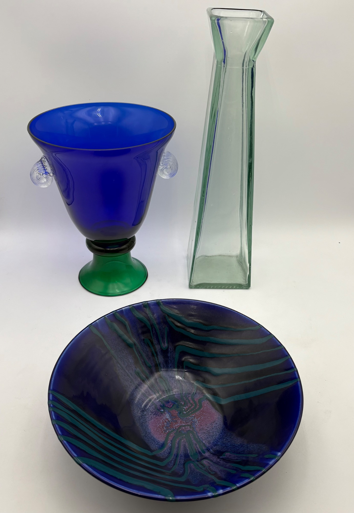 Glass & ceramic trio. Large blue, green, and clear urn-like glass vessel. Lovely sinuous shape with small clear handles and cured lip. No maker mark. Measures 11.5" H x 9" W. Ceramic serving bowl in saturated greens & blues. Potter has signed bottom, but we don't recognize the name. Measures 3.5" H x 12" W Clear square bottomed tapered tall vase. Very heavy glass - this isn't going to tip with tall flowers! Measures 17.25" H x 4.5" W.