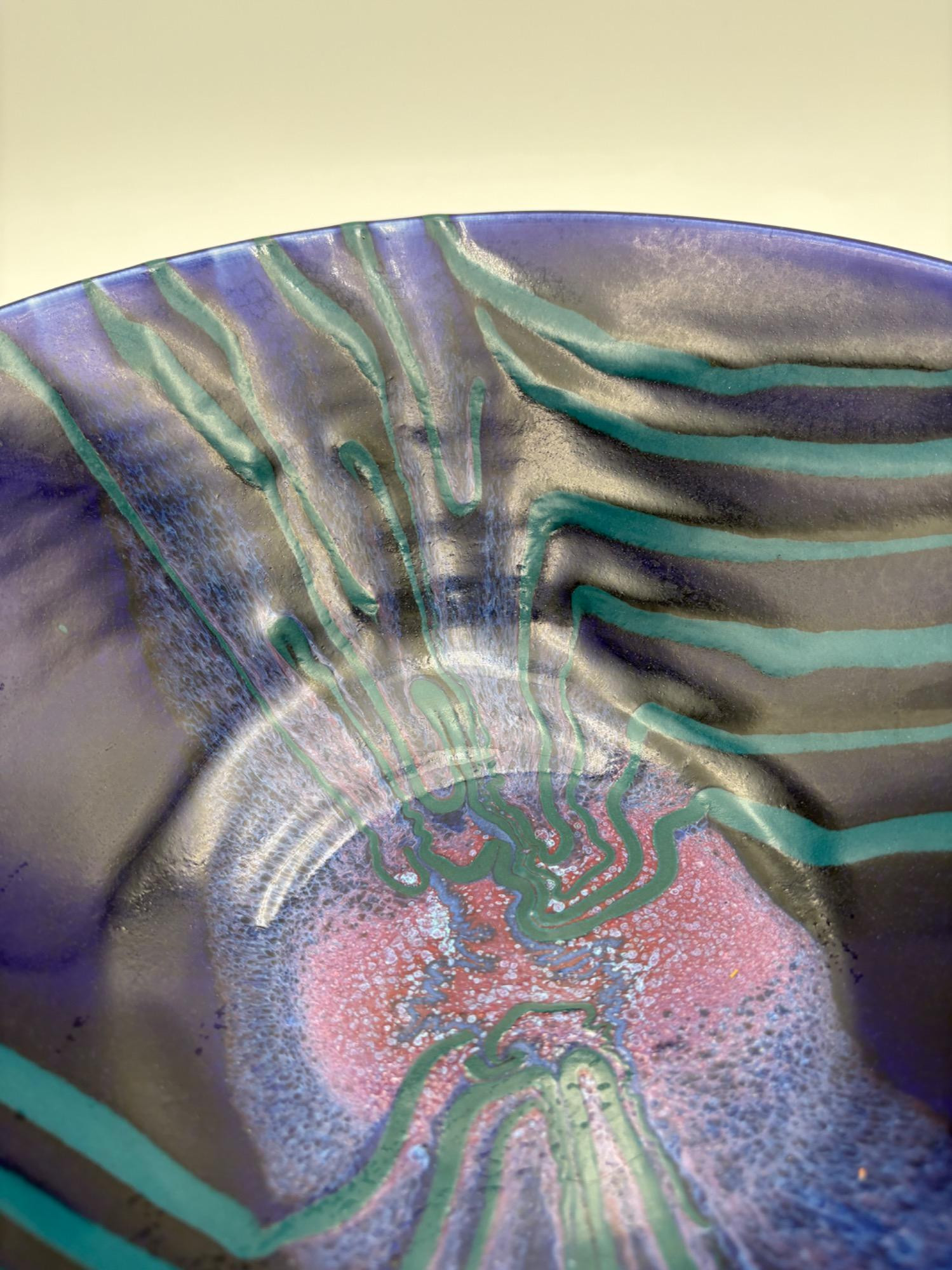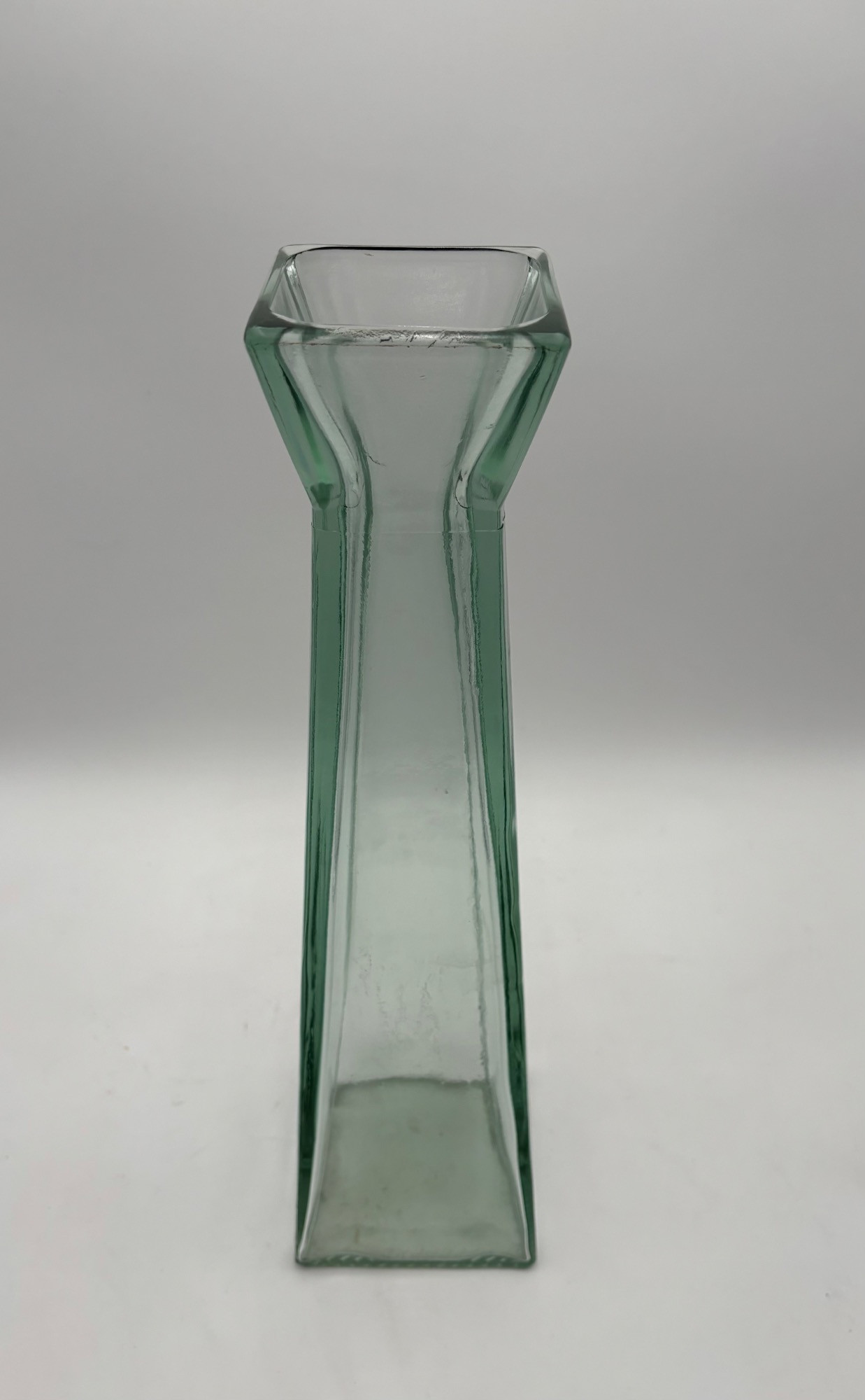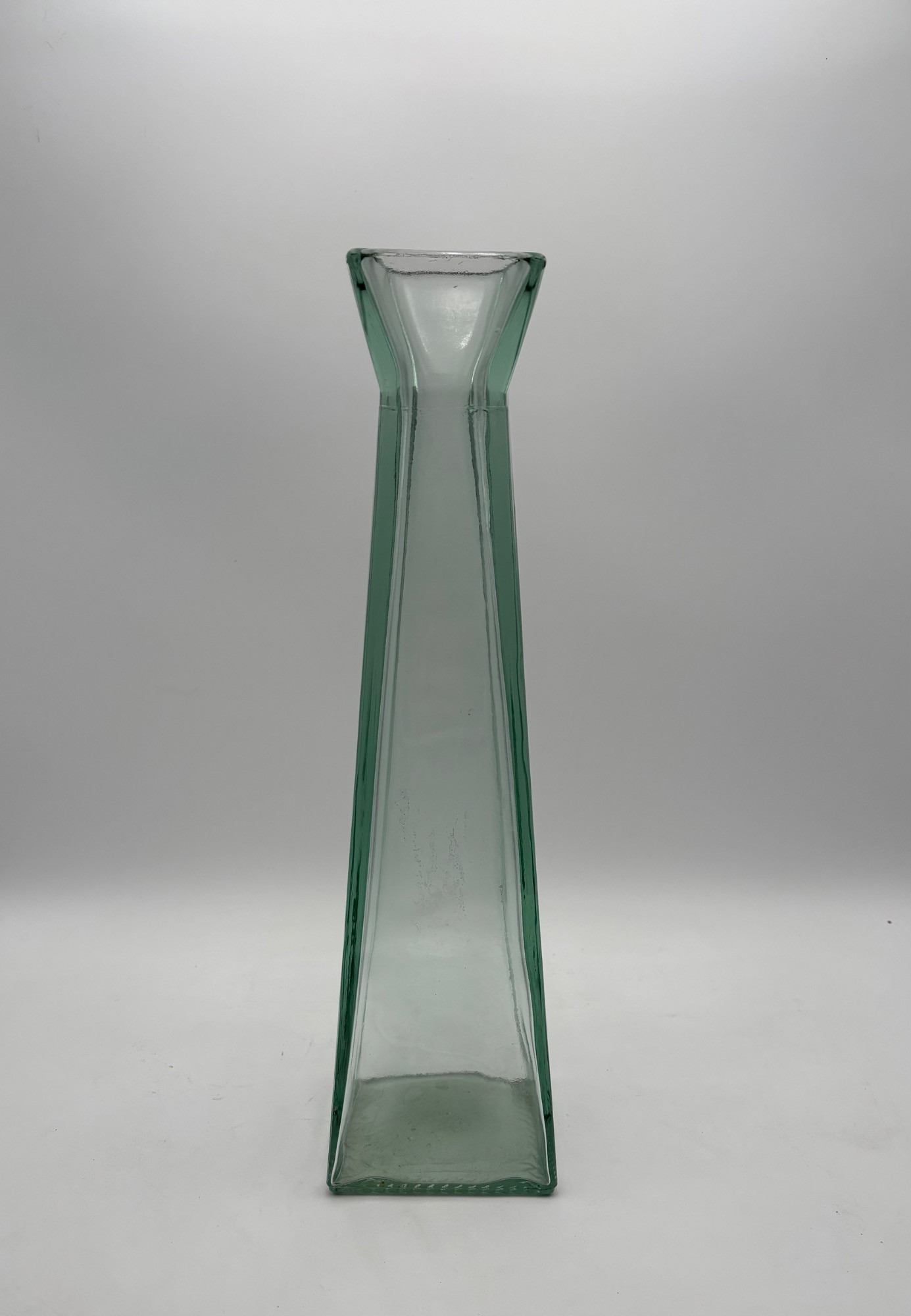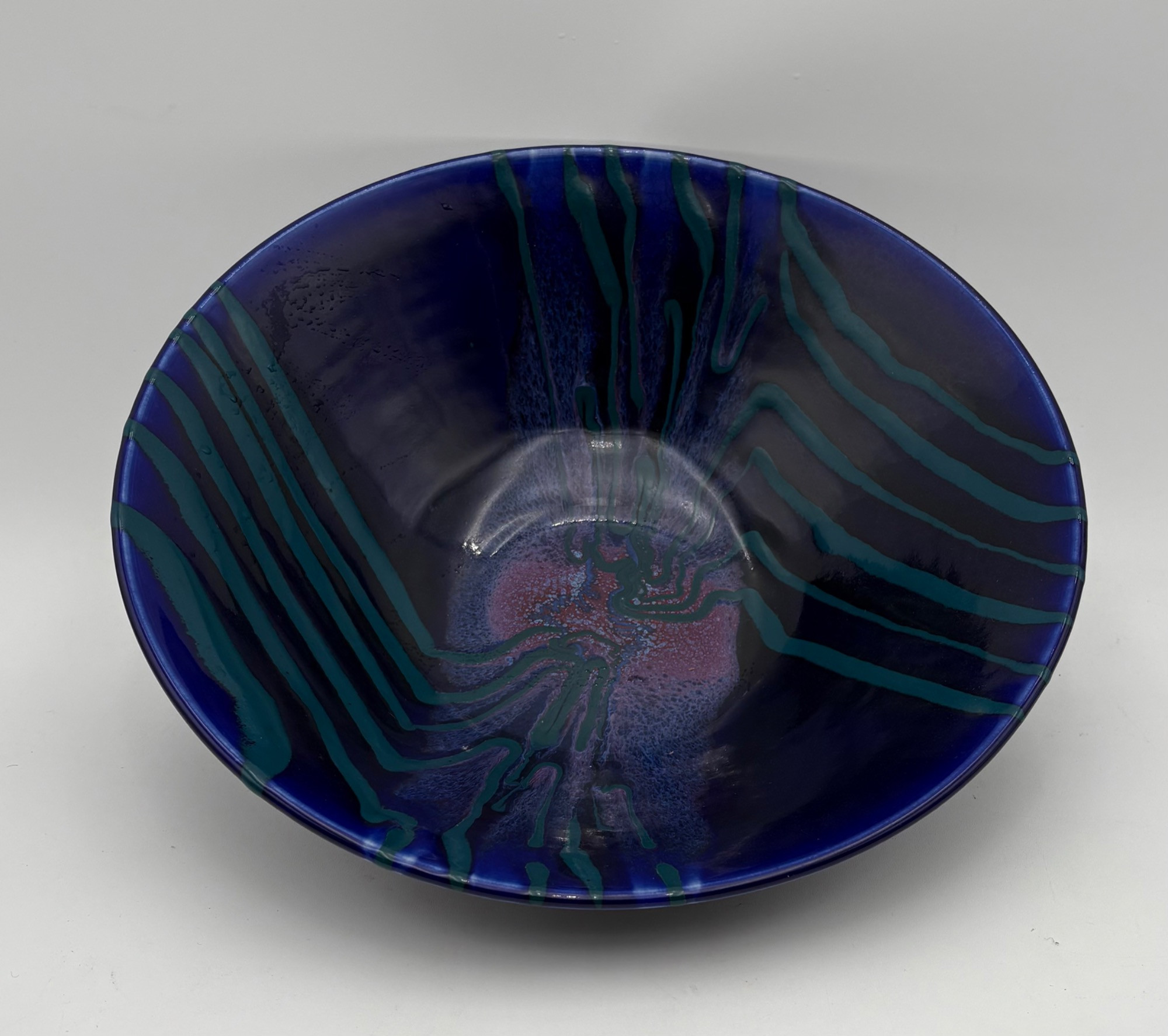 Glass & ceramic trio. Large blue, green, and clear urn-like glass vessel. Lovely sinuous shape with small clear handles and cured lip. No maker mark. Measures 11.5" H x 9" W. Ceramic serving bowl in saturated greens & blues. Potter has signed bottom, but we don't recognize the name. Measures 3.5" H x 12" W Clear square bottomed tapered tall vase. Very heavy glass - this isn't going to tip with tall flowers! Measures 17.25" H x 4.5" W.