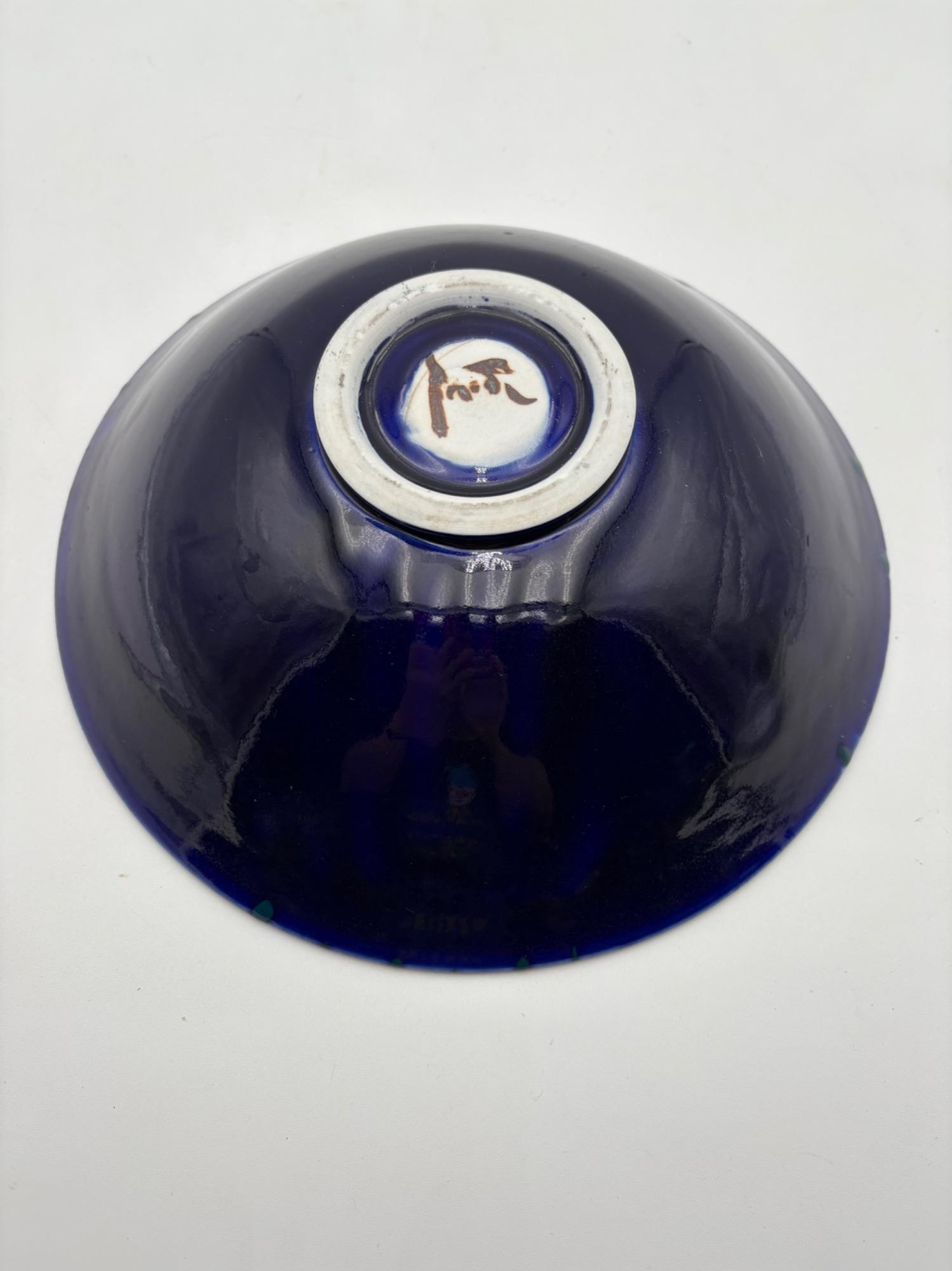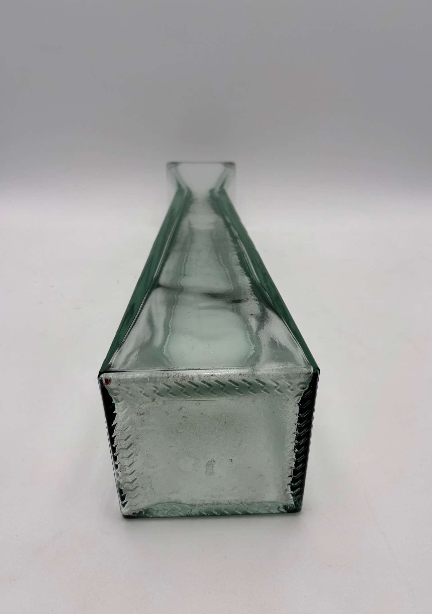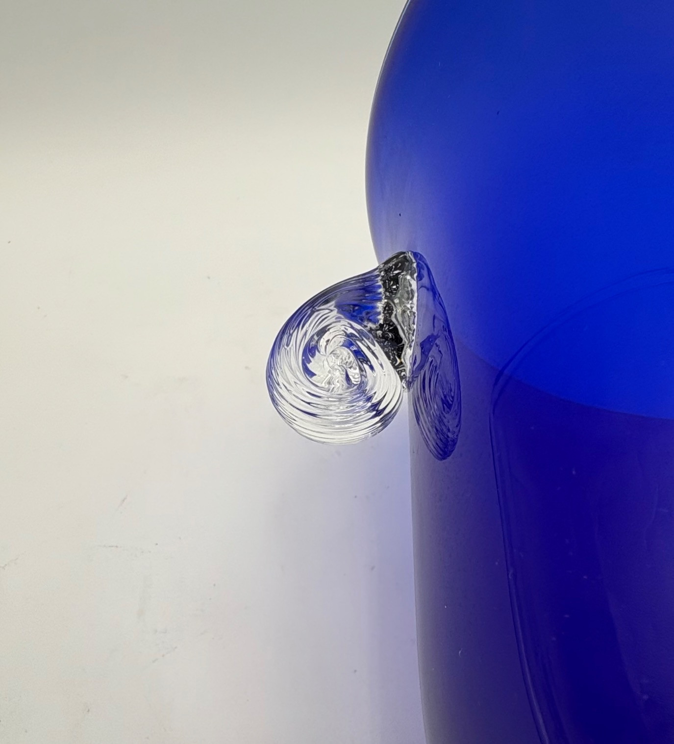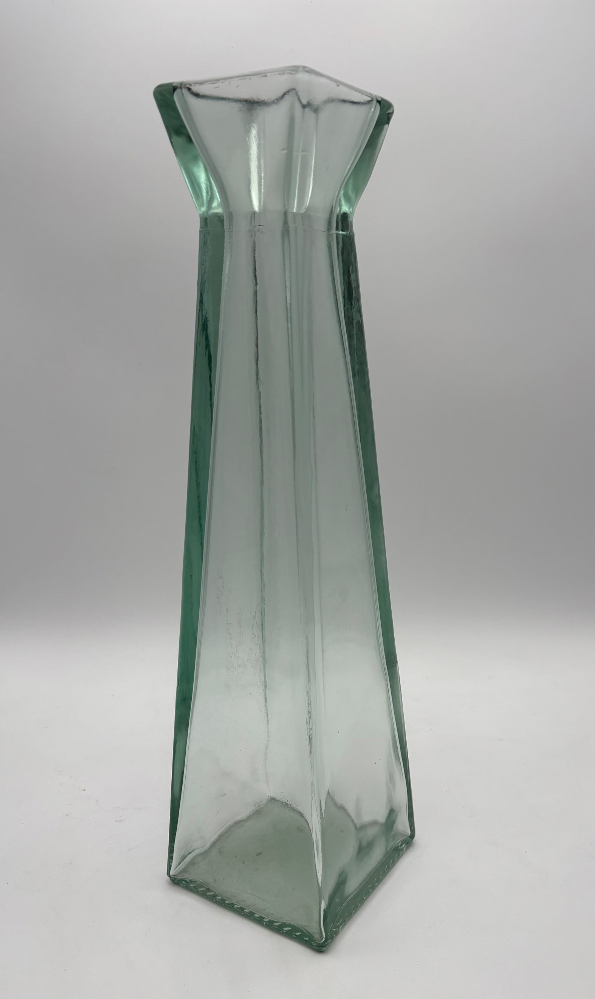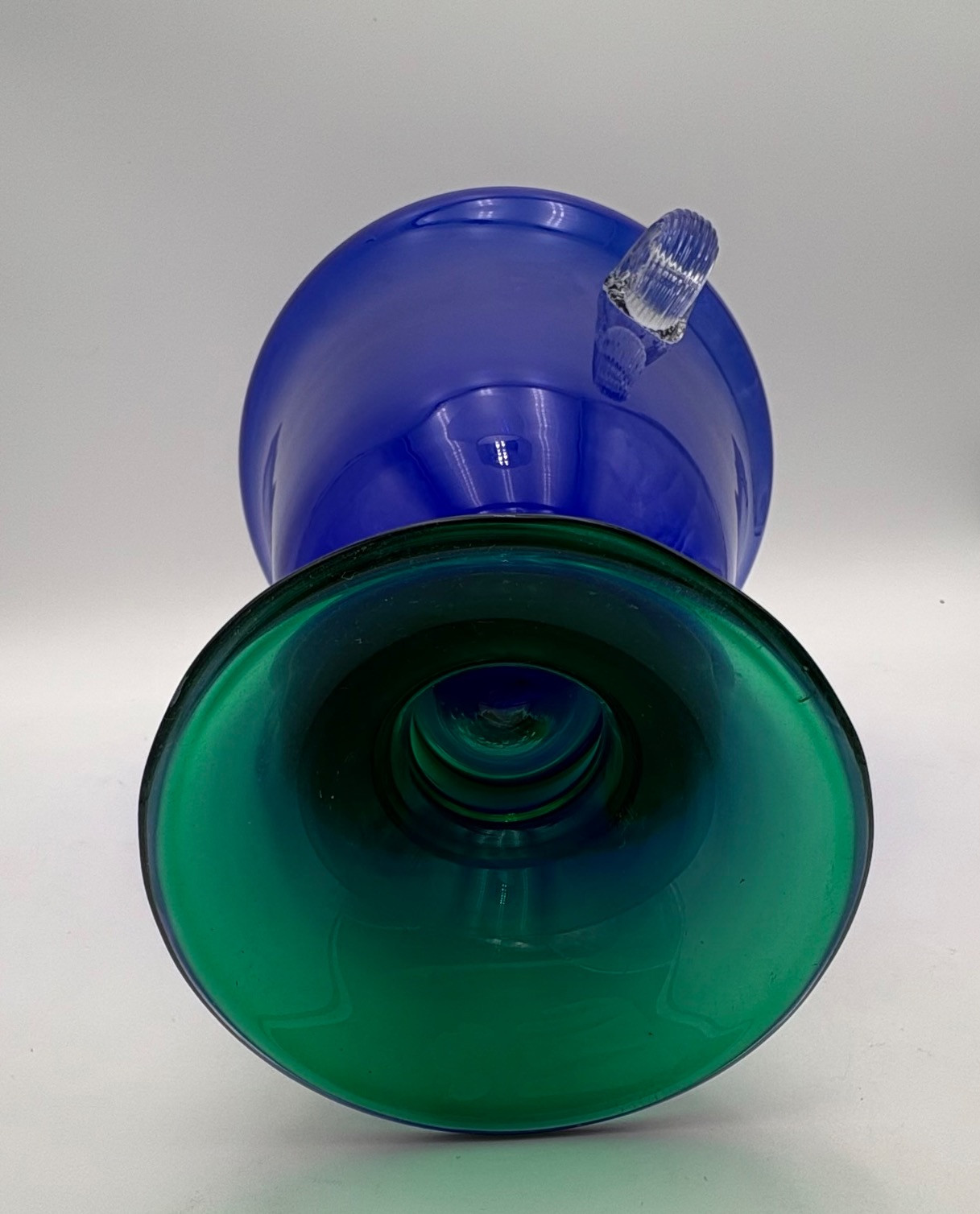 Glass & ceramic trio. Large blue, green, and clear urn-like glass vessel. Lovely sinuous shape with small clear handles and cured lip. No maker mark. Measures 11.5" H x 9" W. Ceramic serving bowl in saturated greens & blues. Potter has signed bottom, but we don't recognize the name. Measures 3.5" H x 12" W Clear square bottomed tapered tall vase. Very heavy glass - this isn't going to tip with tall flowers! Measures 17.25" H x 4.5" W.