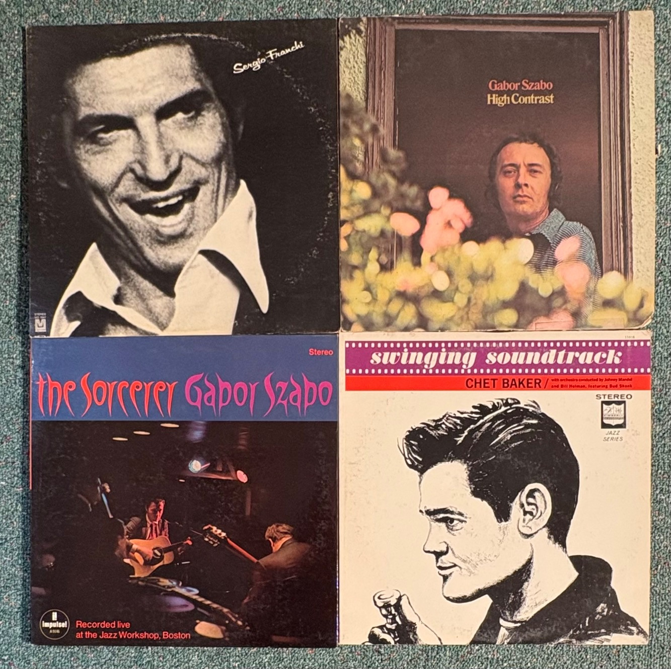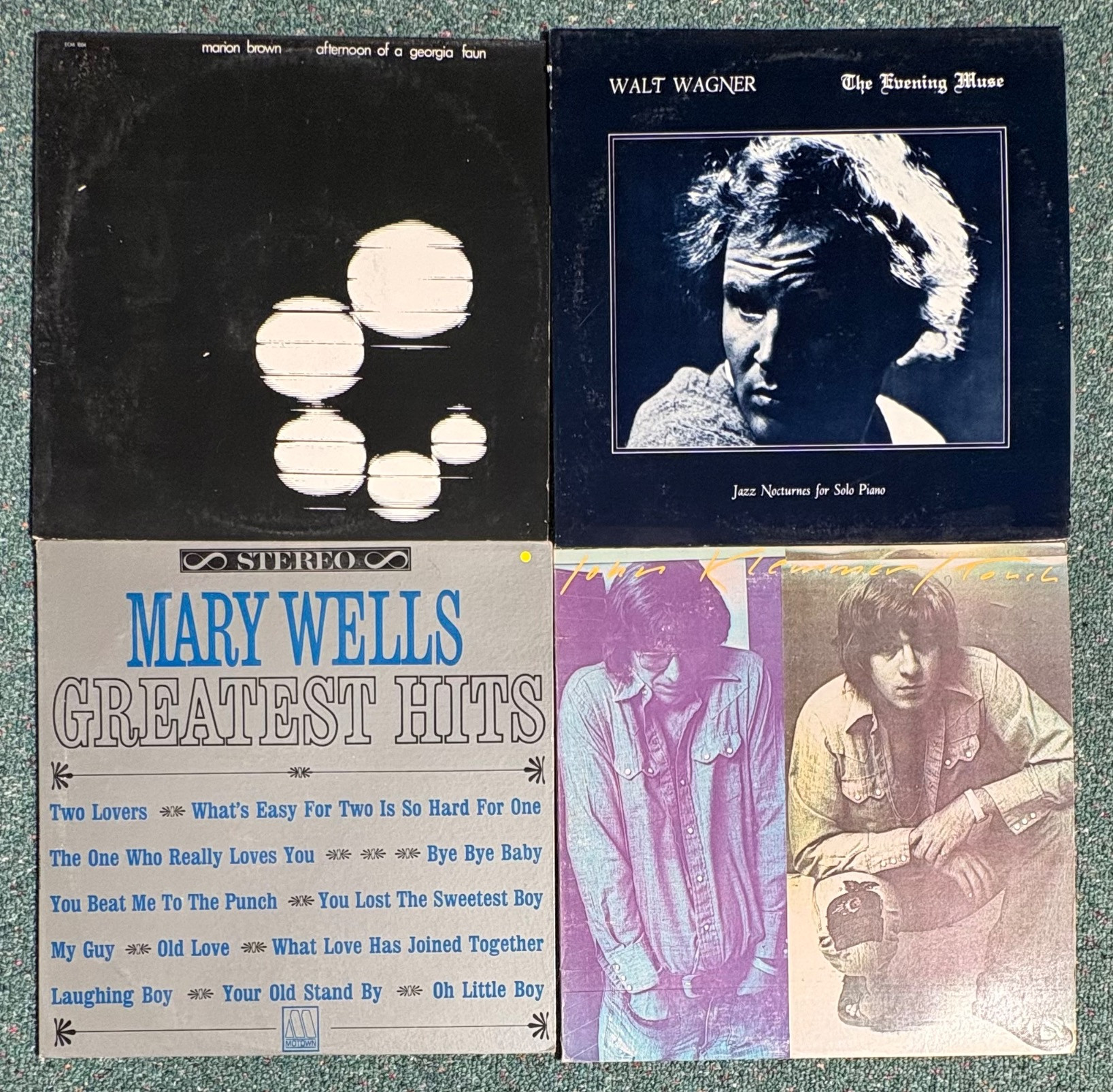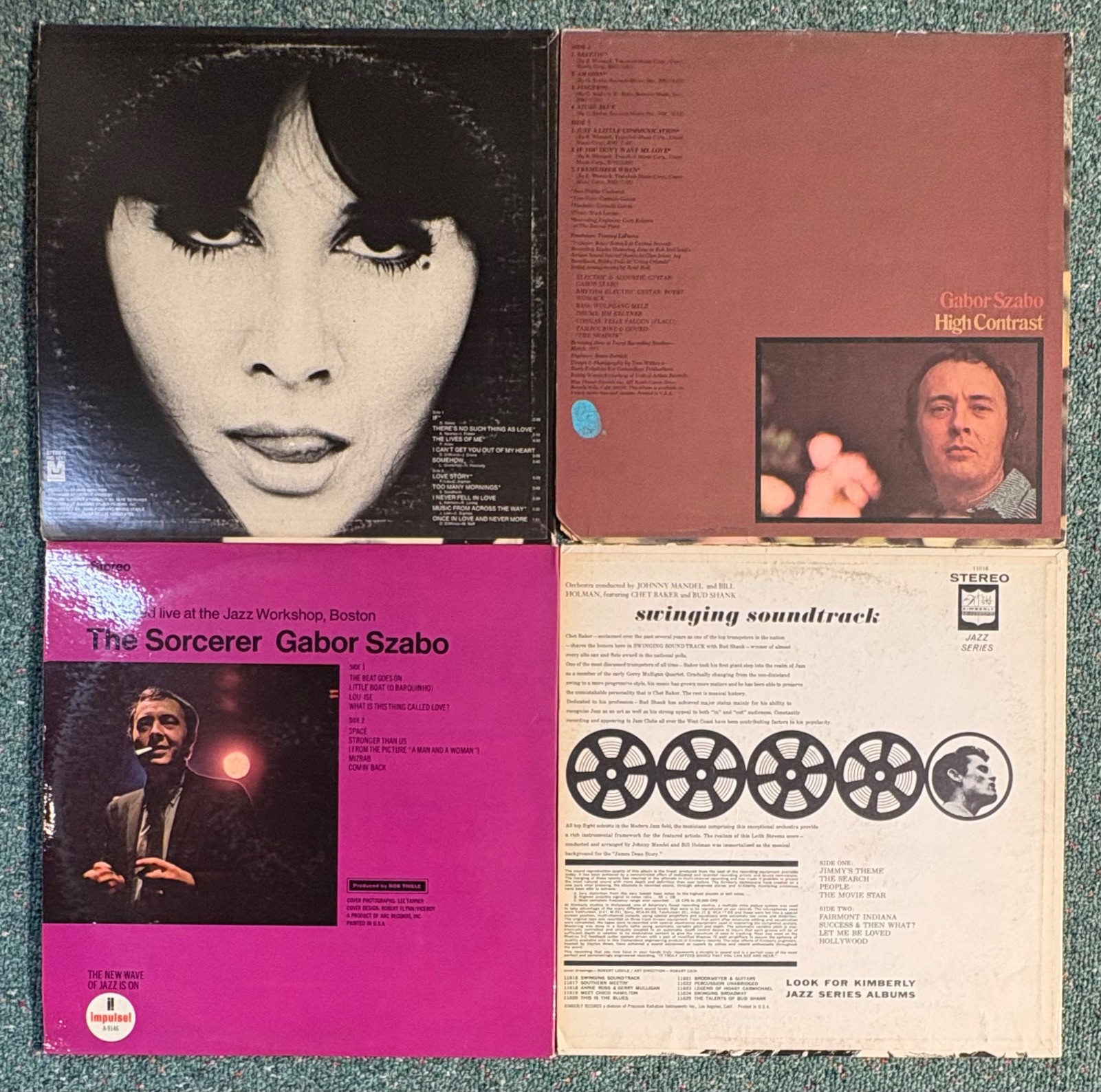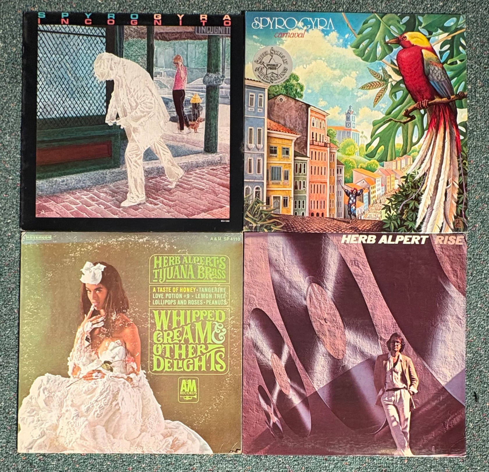 16 vintage vinyl LPs! Our client had eclectic taste and loved his albums - thus, most of these have been lovingly played over the years. We checked to make sure the correct album was in the correct cover and did a cursory glance for any egregious scratches. Some covers reflect heavy use and are worn/split in places/have names written on them. However, the majority are in good used shape. Artists/Bands in this lot include: Gabor Szabo (2 albums) Marion Brown Mary Wells Walt Wagner John Klemmer Chet Baker Sergio Franchi Spyro Gyra (4 albums) Herb Alpert (2 albums) Art Farmer (2 albums)