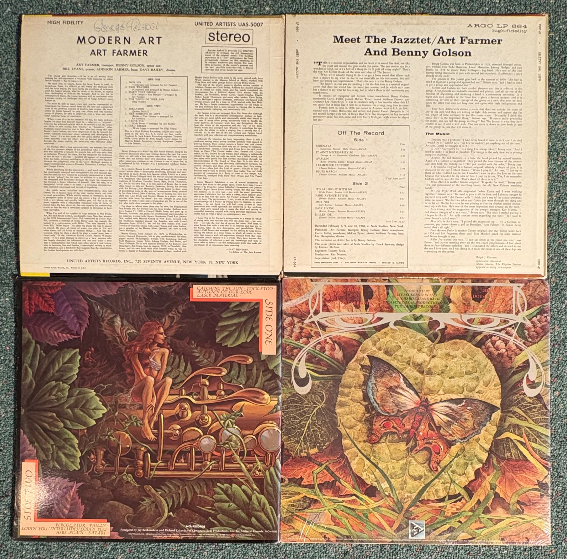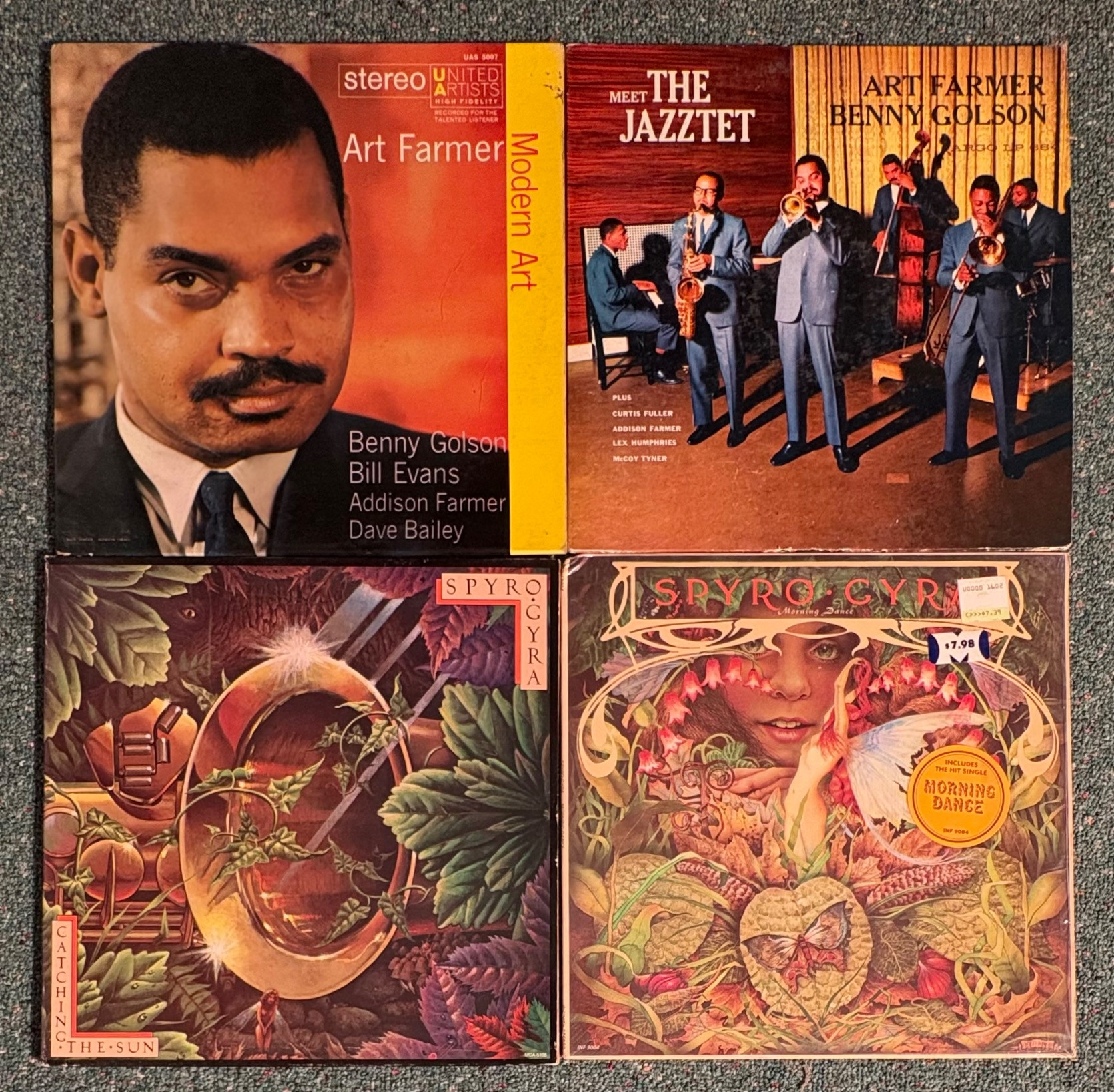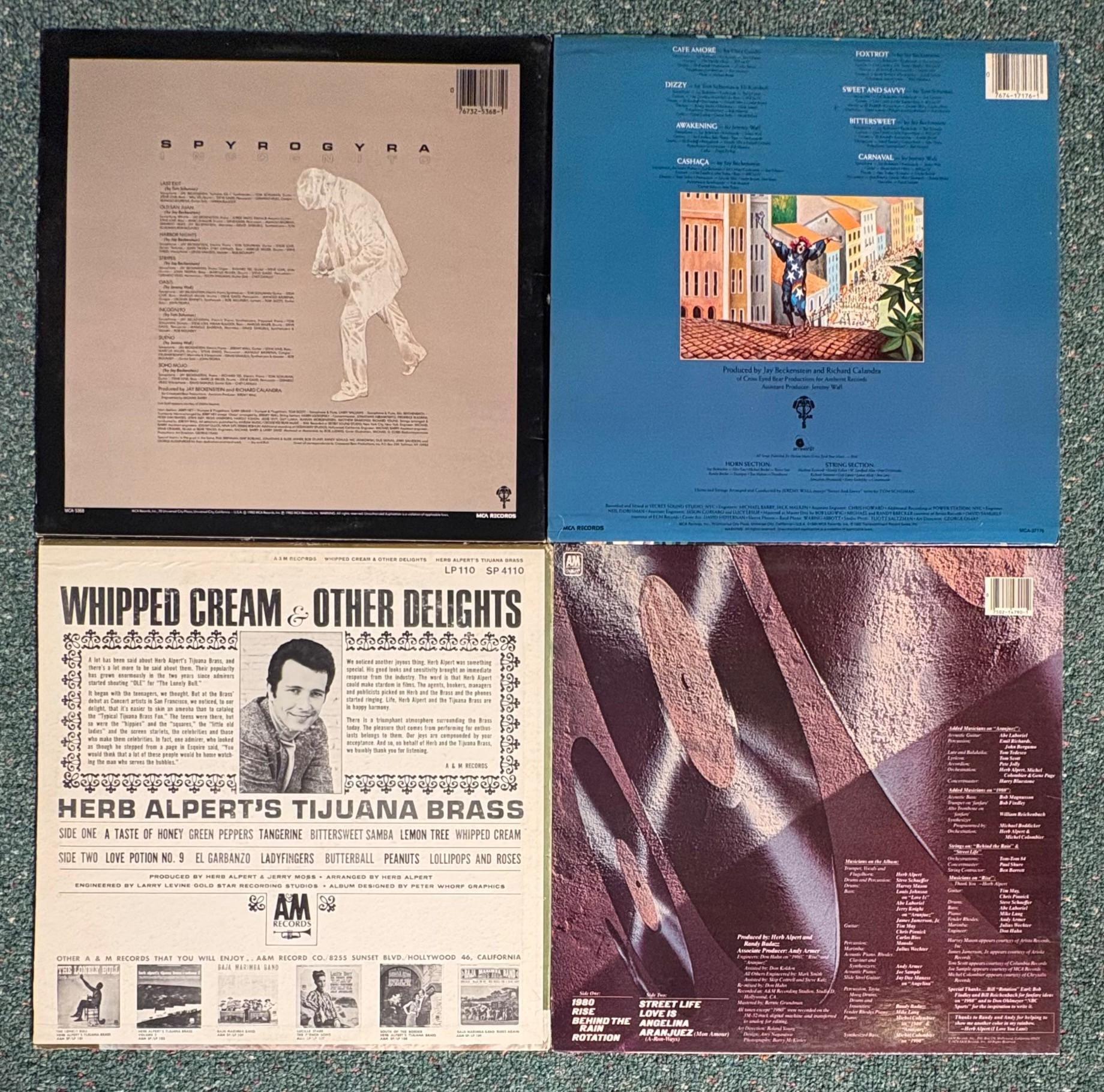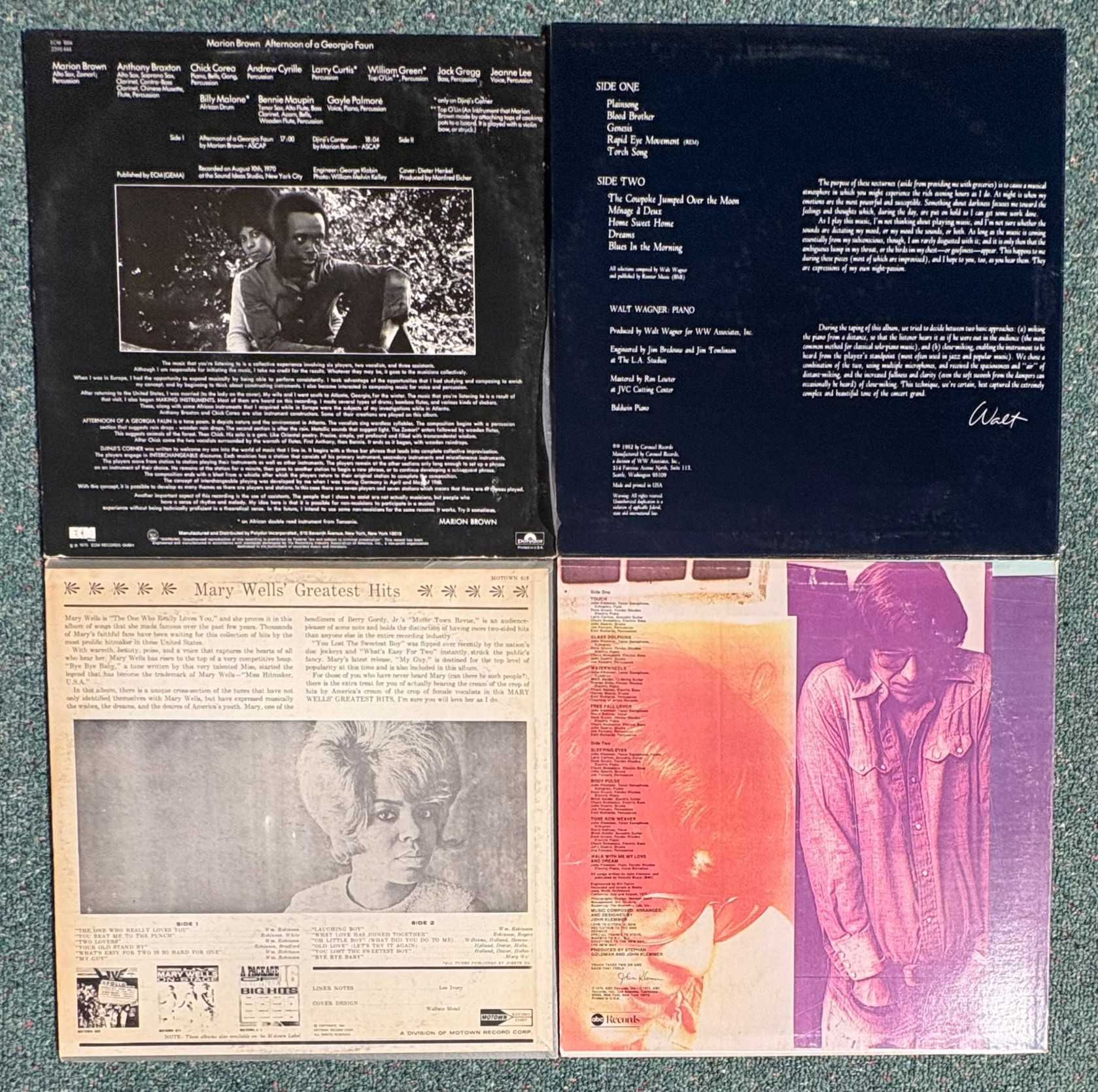 16 vintage vinyl LPs! Our client had eclectic taste and loved his albums - thus, most of these have been lovingly played over the years. We checked to make sure the correct album was in the correct cover and did a cursory glance for any egregious scratches. Some covers reflect heavy use and are worn/split in places/have names written on them. However, the majority are in good used shape. Artists/Bands in this lot include: Gabor Szabo (2 albums) Marion Brown Mary Wells Walt Wagner John Klemmer Chet Baker Sergio Franchi Spyro Gyra (4 albums) Herb Alpert (2 albums) Art Farmer (2 albums)