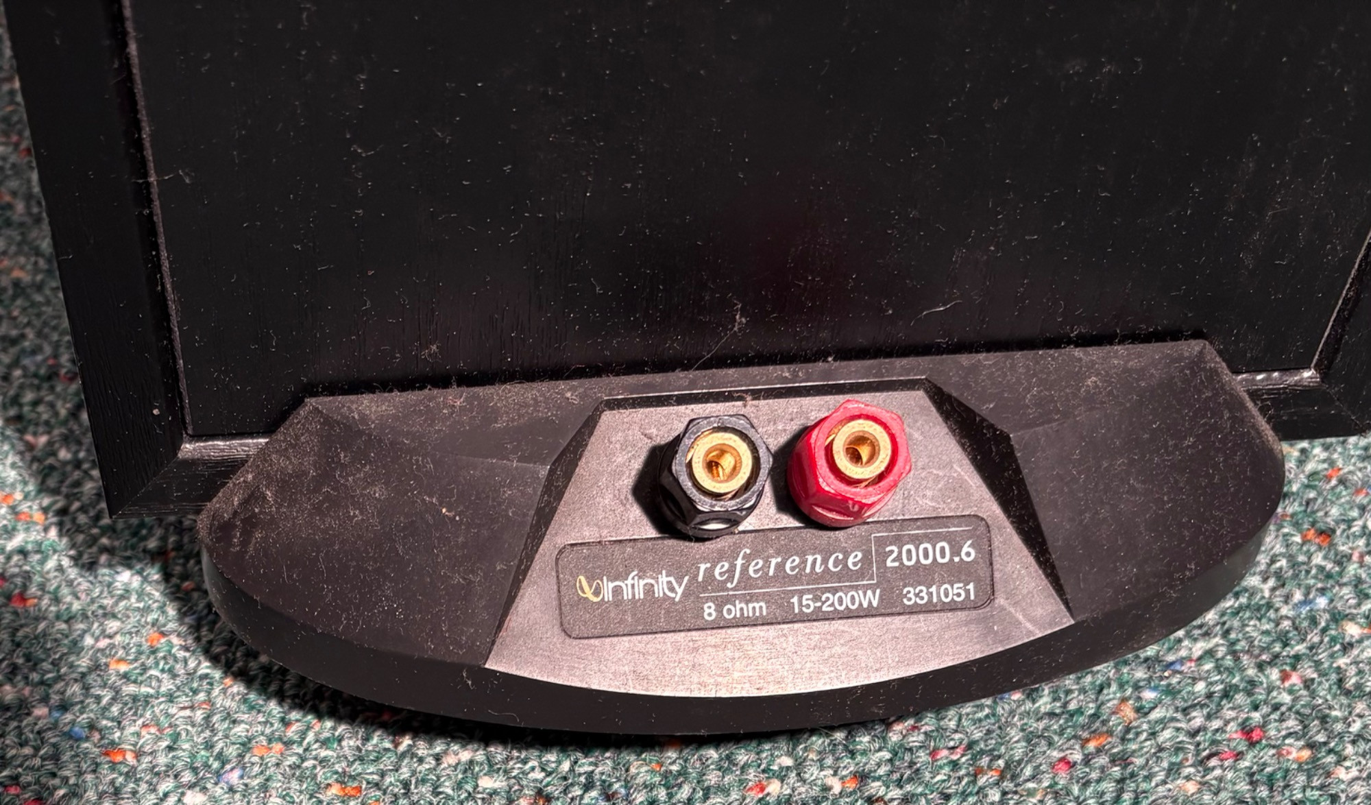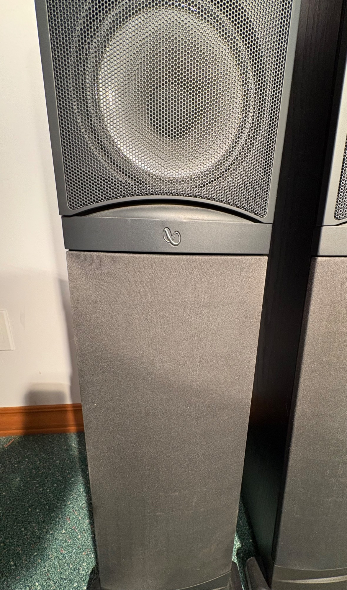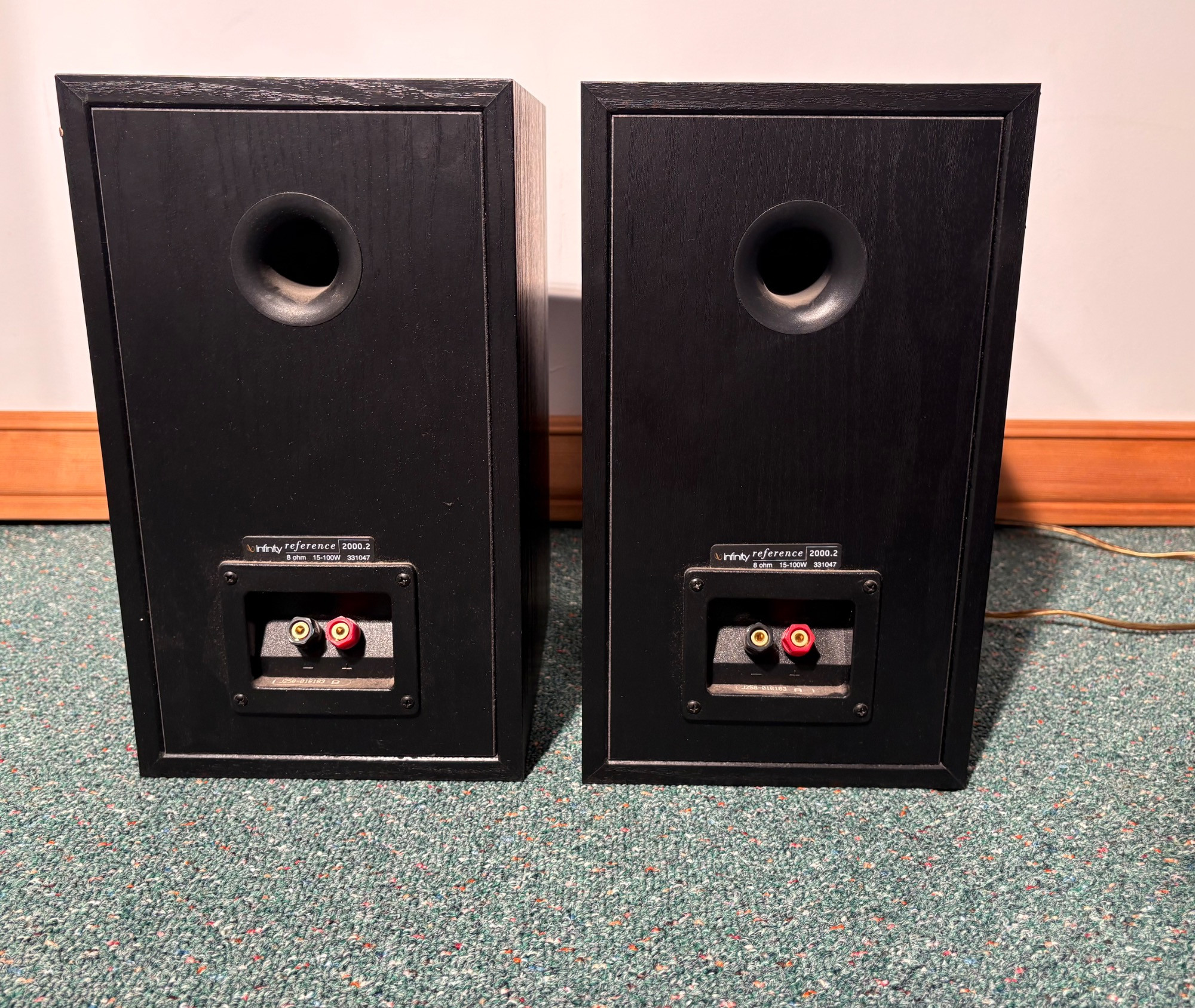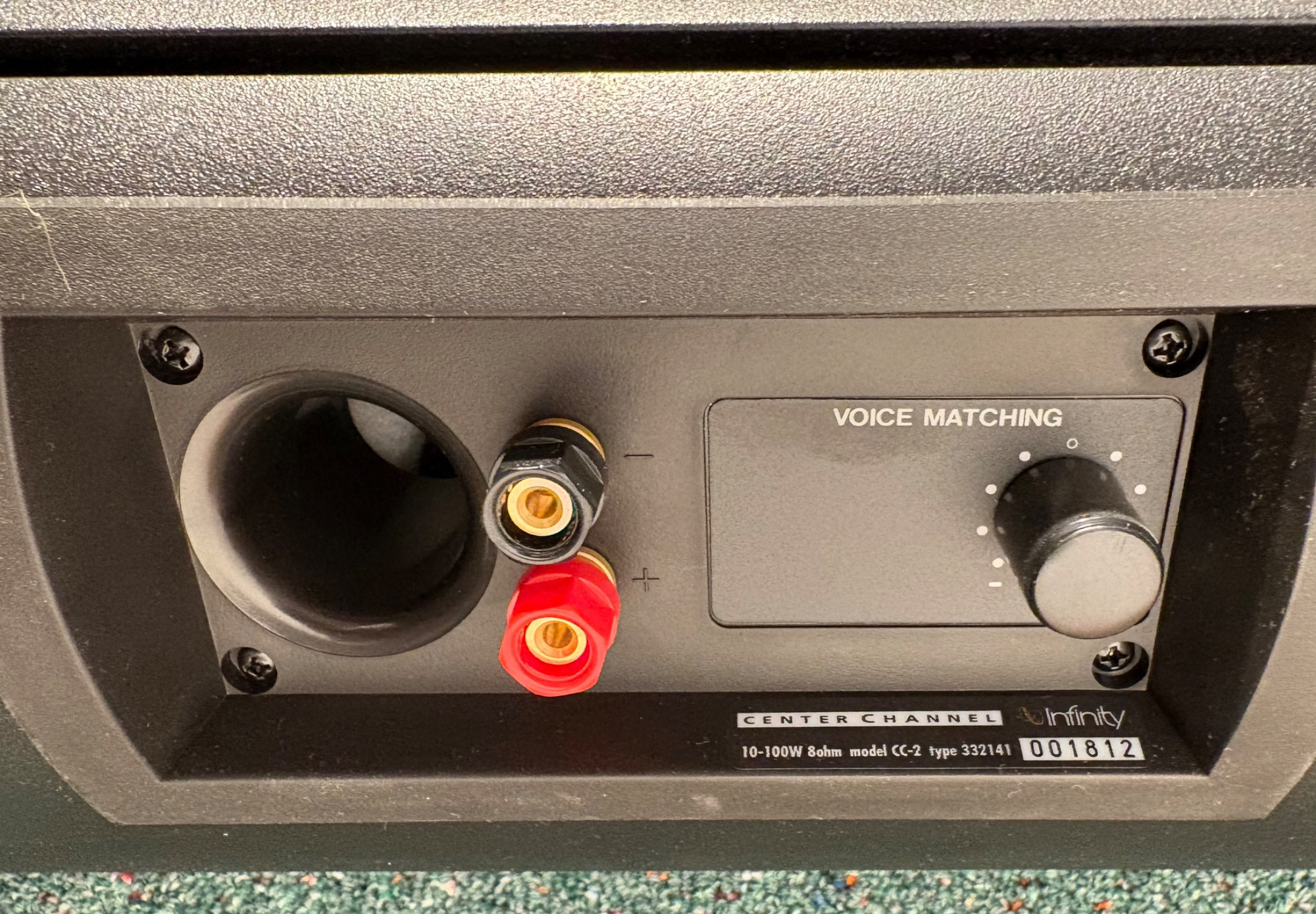 Total of 5 speakers from Infinity Infinity Reference 2000.4 black tower stereo speakers. 8 ohm 15-150 Watts. (2 speakers) Tower speakers measure 40" J x 7.5" W x 12.5" D. Infinity Reference 2000.2 8 ohm bookshelf speakers. 15-100 Watt. (2 speakers) Bookshelf speakers measure 13 " H x 7.5" W x 10" D. Infinity center channel speaker. 10-100 Watt 8 ohm Model CC-2 332141 001812 with “Voice Matching” knob in back; comes with angled support base. All untested as they had been disconnected from stereo components. Local Pickup Only.