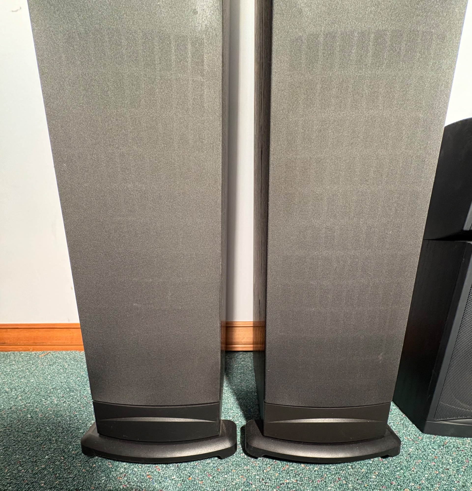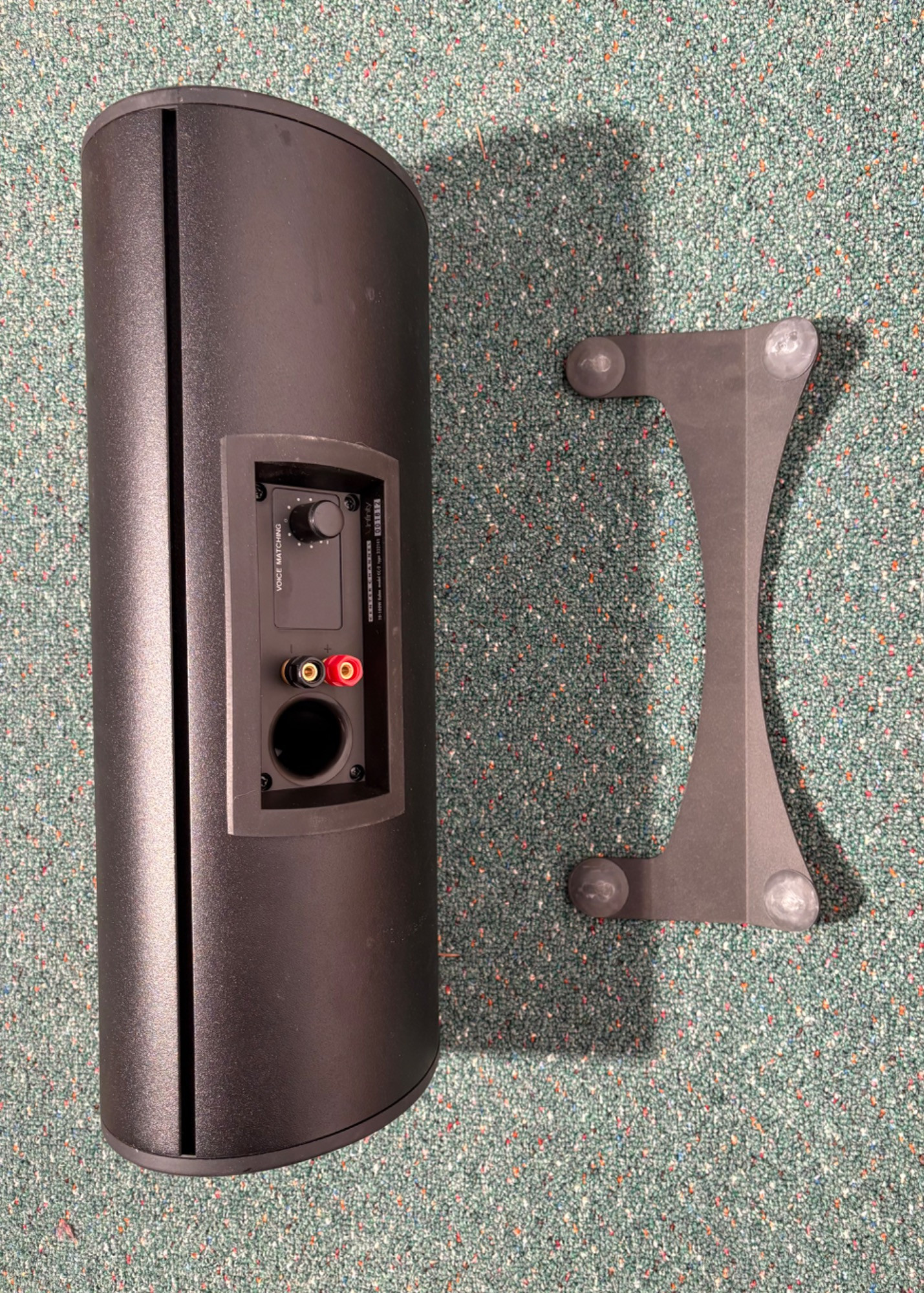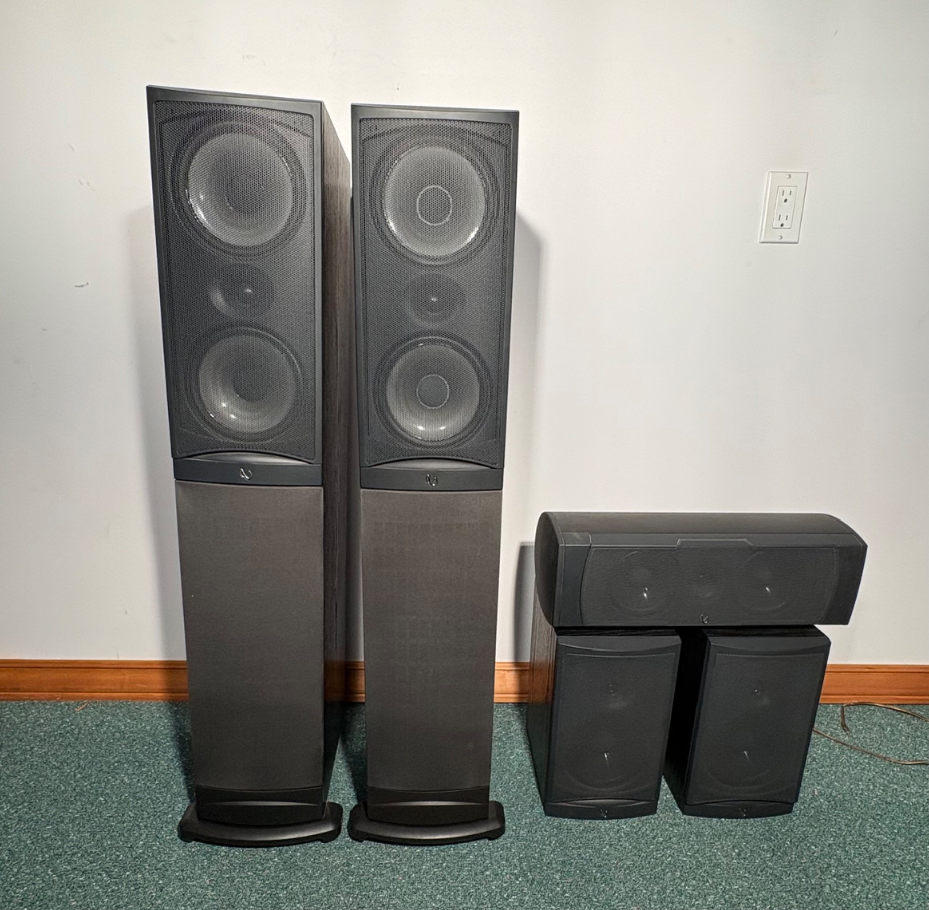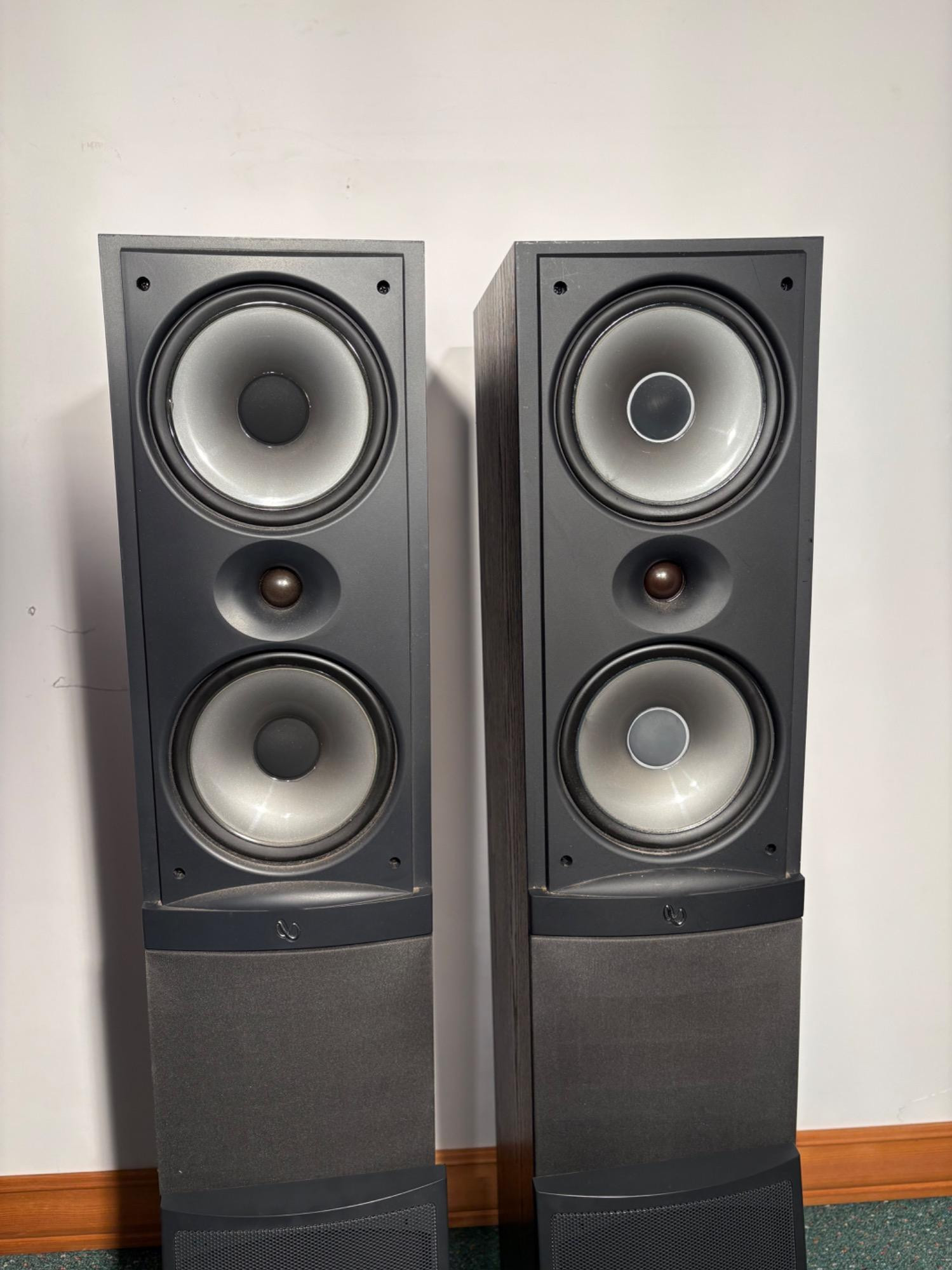 Total of 5 speakers from Infinity Infinity Reference 2000.4 black tower stereo speakers. 8 ohm 15-150 Watts. (2 speakers) Tower speakers measure 40" J x 7.5" W x 12.5" D. Infinity Reference 2000.2 8 ohm bookshelf speakers. 15-100 Watt. (2 speakers) Bookshelf speakers measure 13 " H x 7.5" W x 10" D. Infinity center channel speaker. 10-100 Watt 8 ohm Model CC-2 332141 001812 with “Voice Matching” knob in back; comes with angled support base. All untested as they had been disconnected from stereo components. Local Pickup Only.