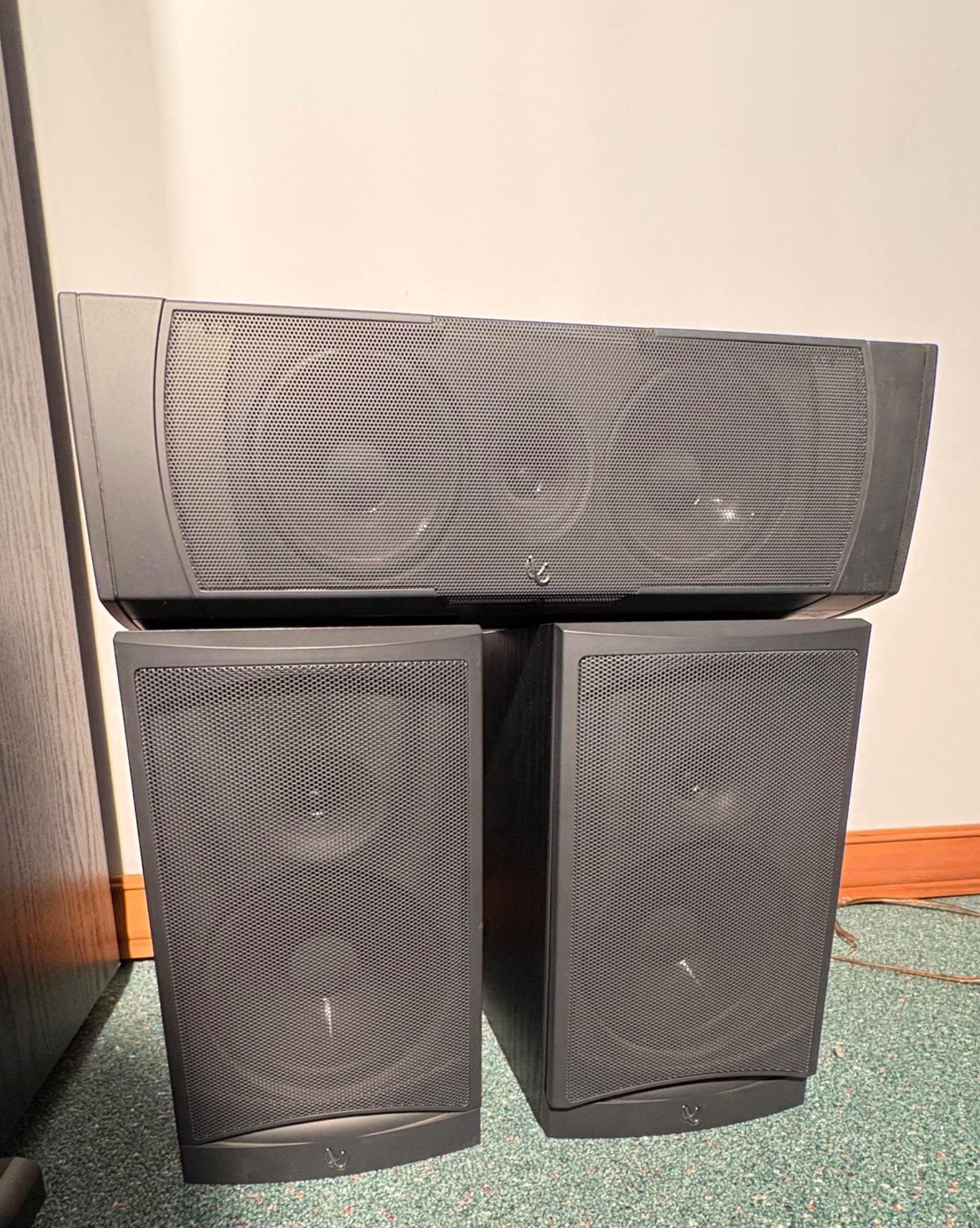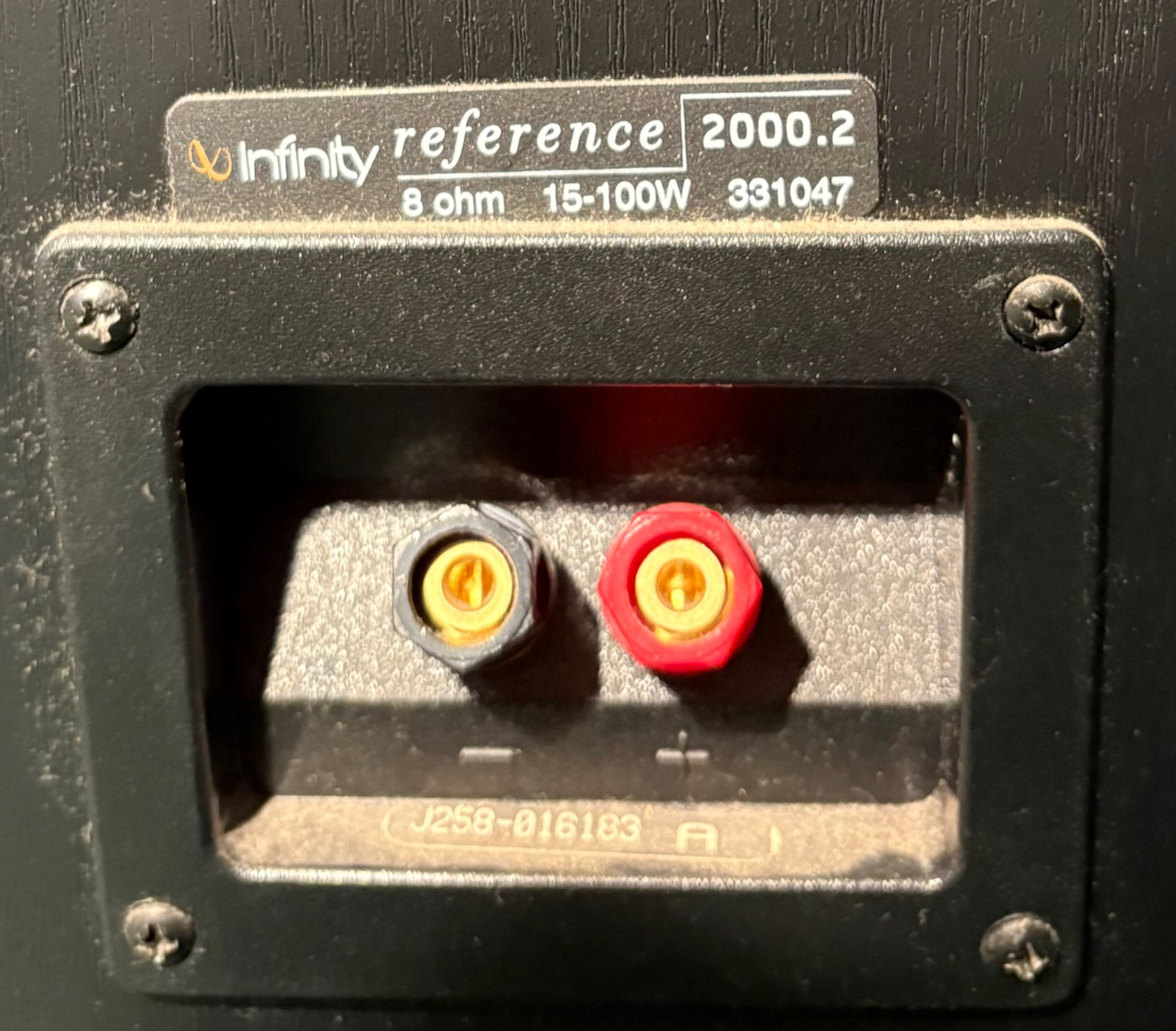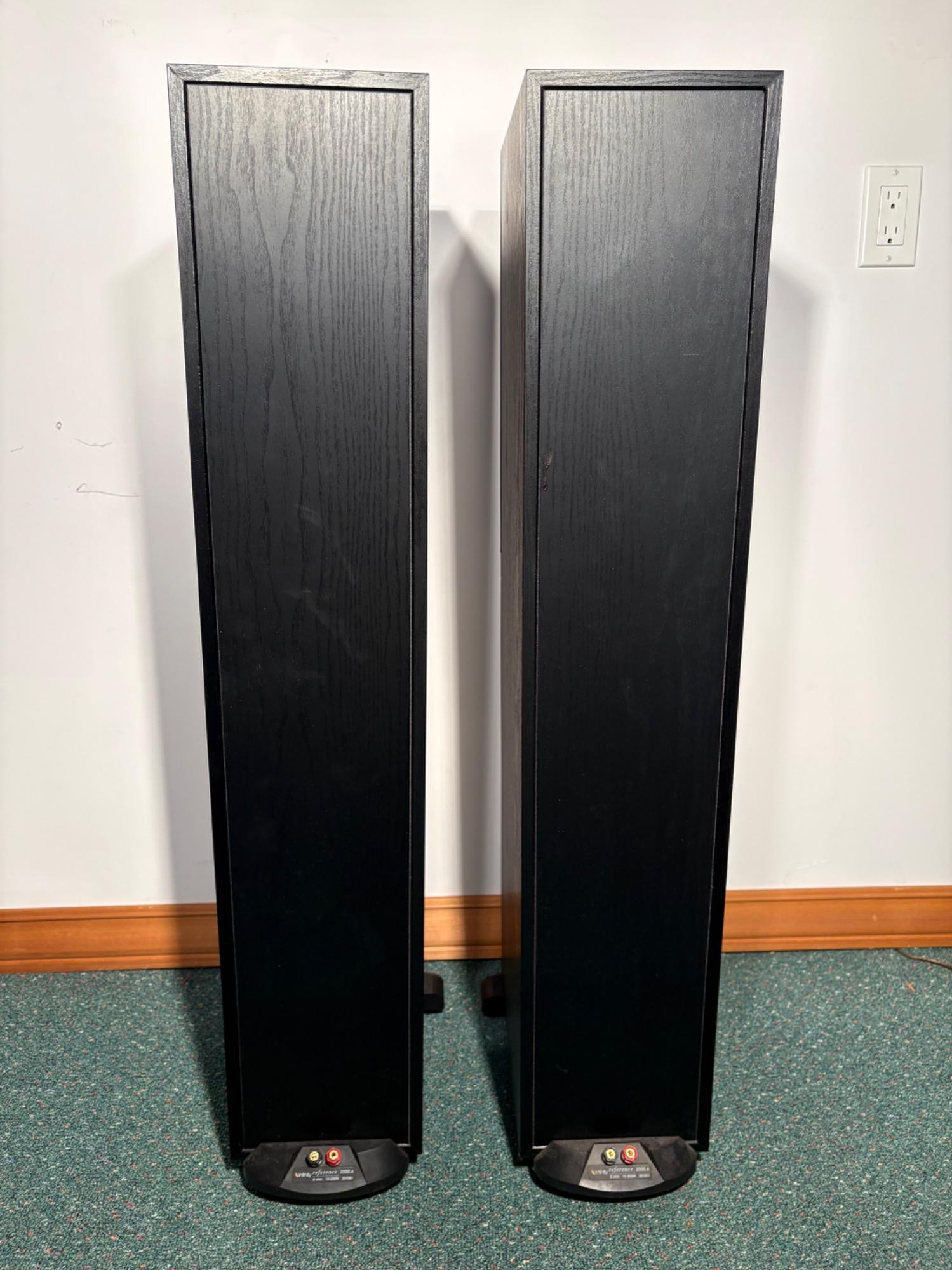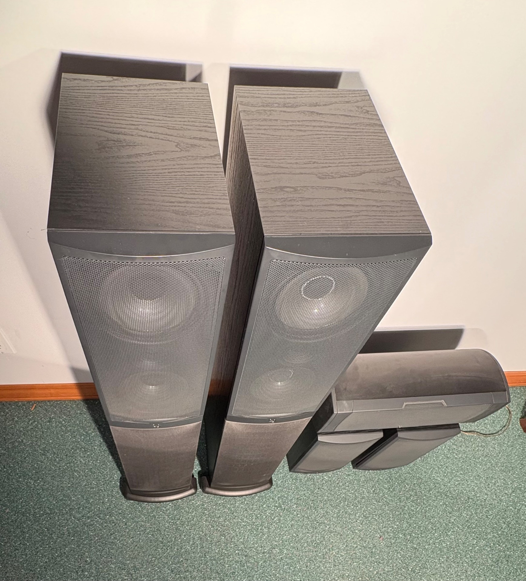 Total of 5 speakers from Infinity Infinity Reference 2000.4 black tower stereo speakers. 8 ohm 15-150 Watts. (2 speakers) Tower speakers measure 40" J x 7.5" W x 12.5" D. Infinity Reference 2000.2 8 ohm bookshelf speakers. 15-100 Watt. (2 speakers) Bookshelf speakers measure 13 " H x 7.5" W x 10" D. Infinity center channel speaker. 10-100 Watt 8 ohm Model CC-2 332141 001812 with “Voice Matching” knob in back; comes with angled support base. All untested as they had been disconnected from stereo components. Local Pickup Only.