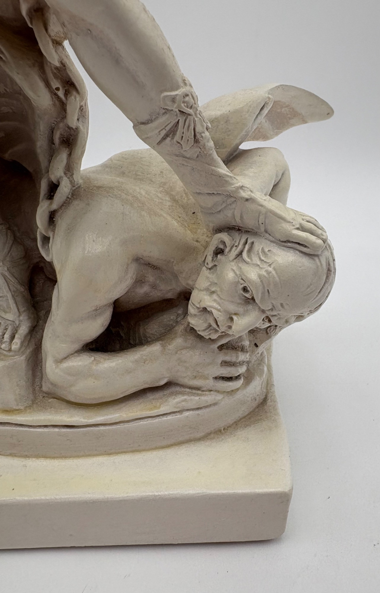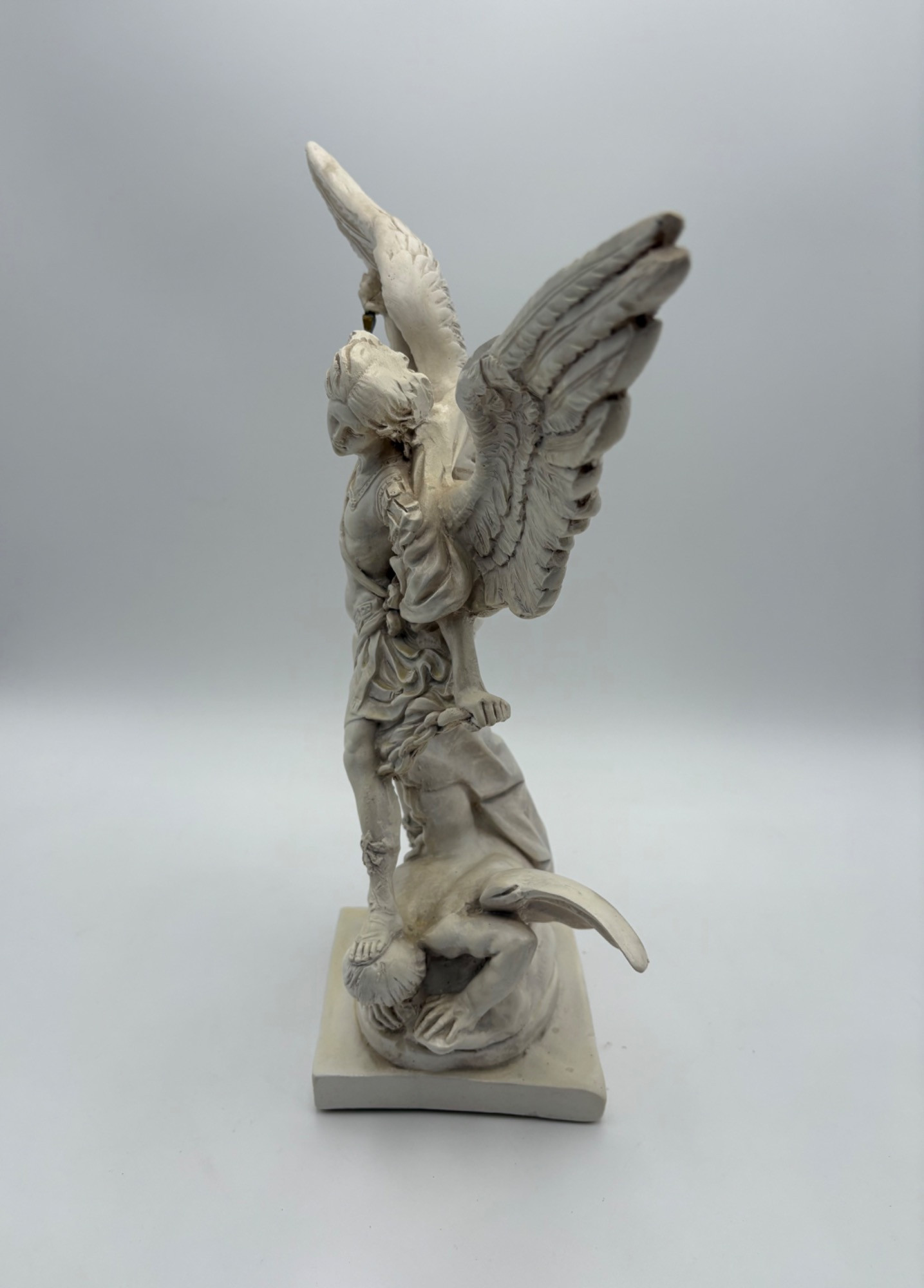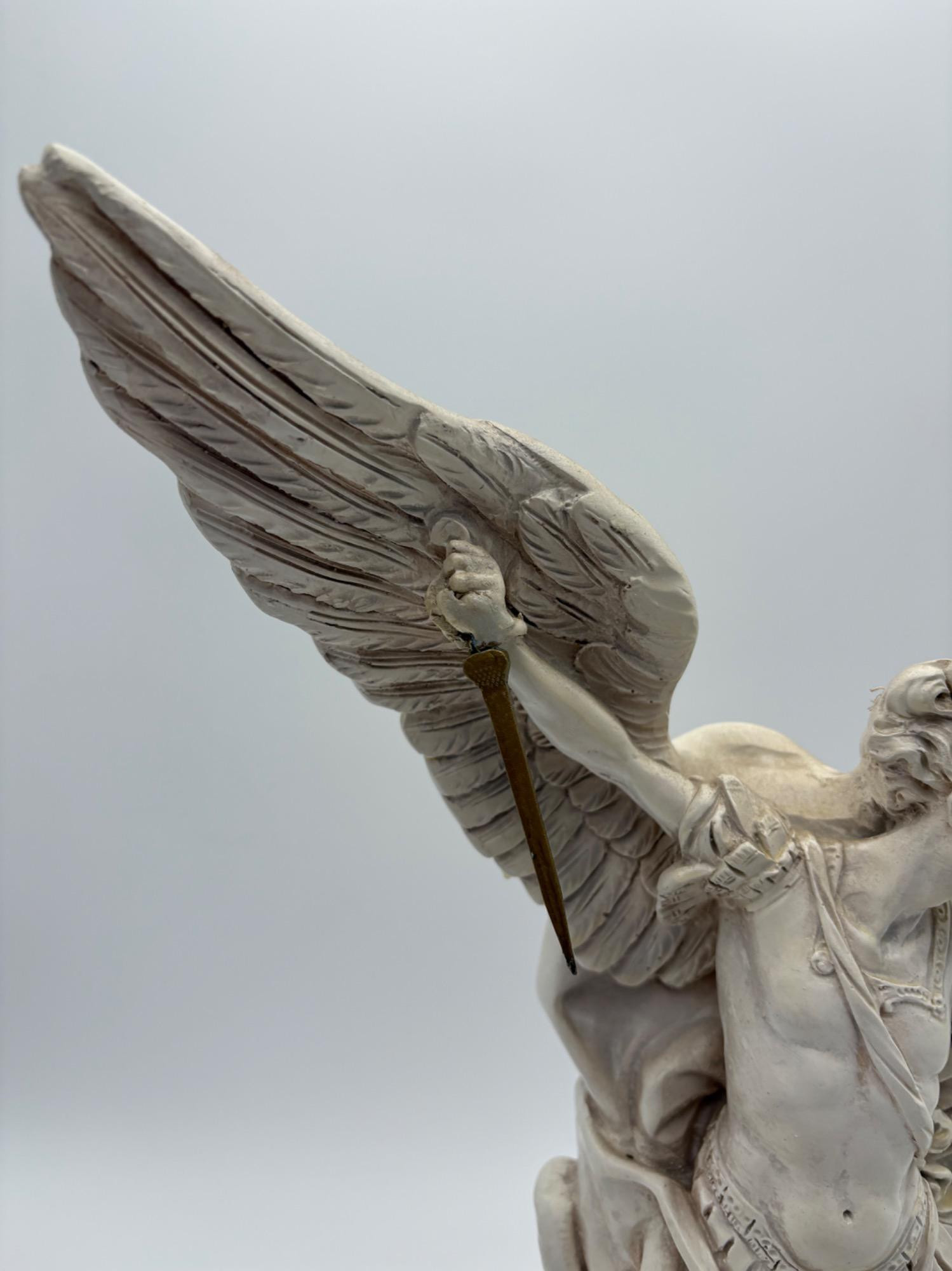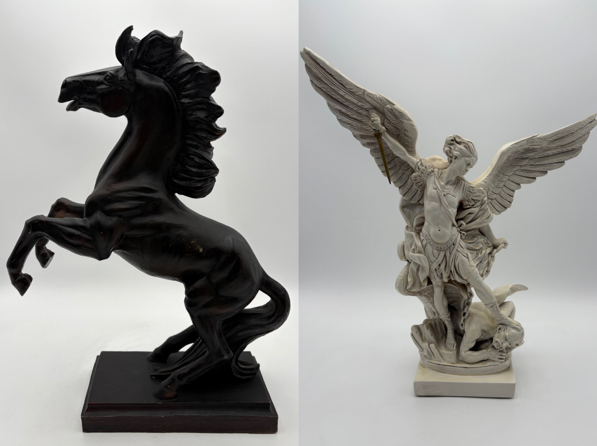 Two sculptures that appear to be out of cast resin and plaster.. No makers mark on either piece. Black rearing stallion on square platform with wavy mane. He could use a bit of black paint where the black finish has rubbed off - see last 2 photos for details. He stands 18.5" H x 14" W x just under 6" D. In ok vintage condition. White avenging angel standing on the head of a devil with wonderful detail. Only coloration is the gold sword. We are unsure of the medium, but think it is plaster given that the unfinished bottom is powdery. Measures 16" H x 14" W x 7" D.