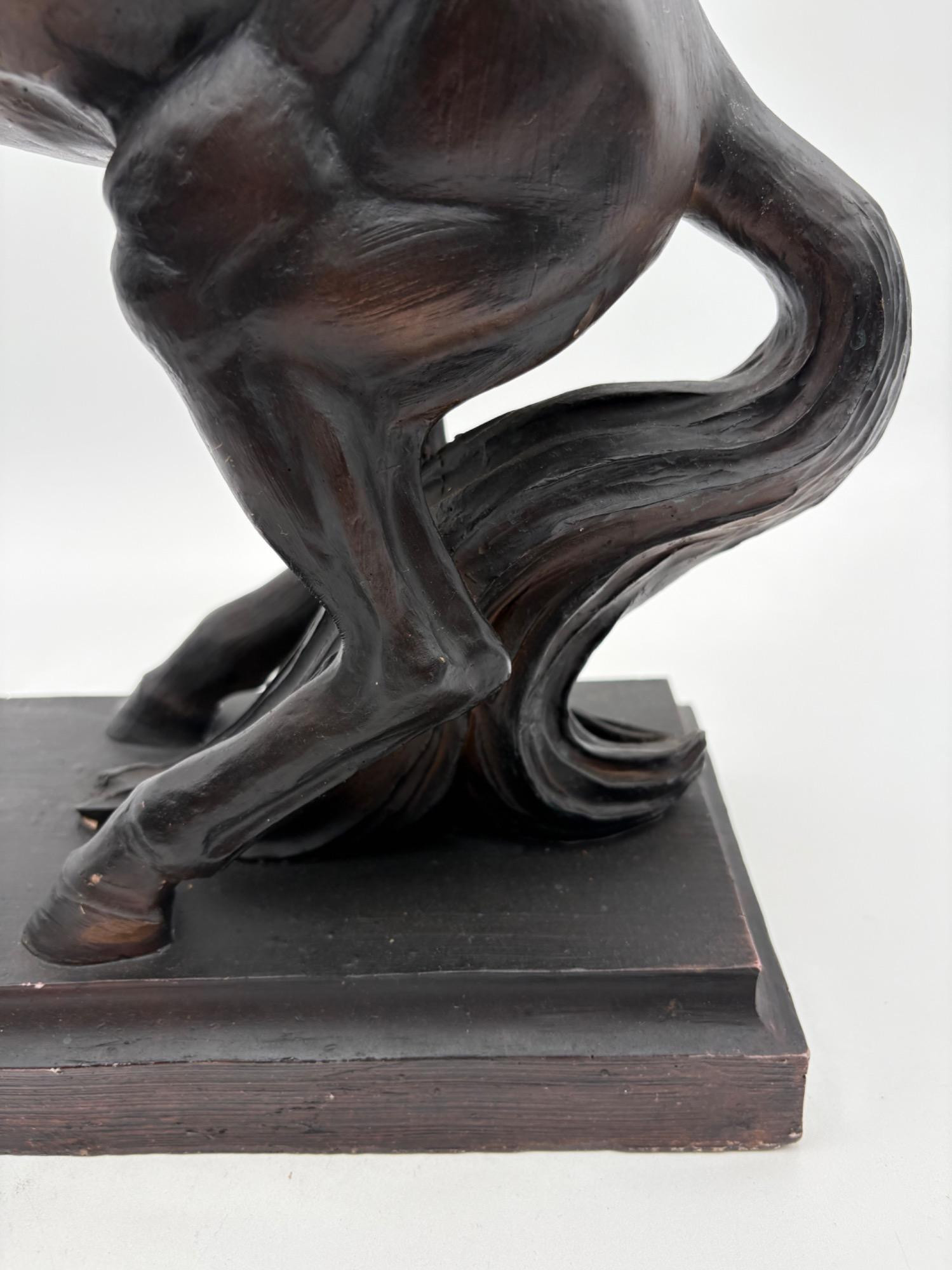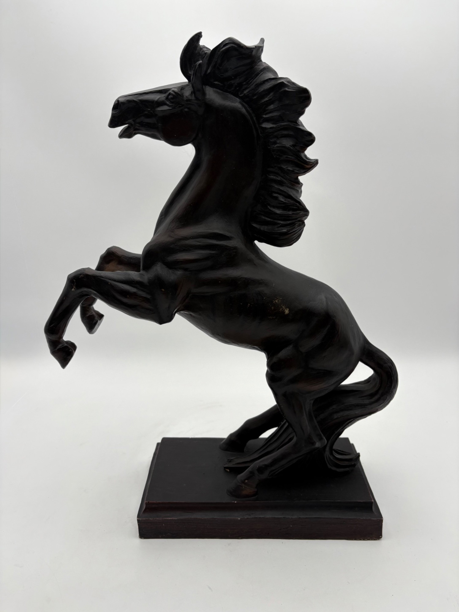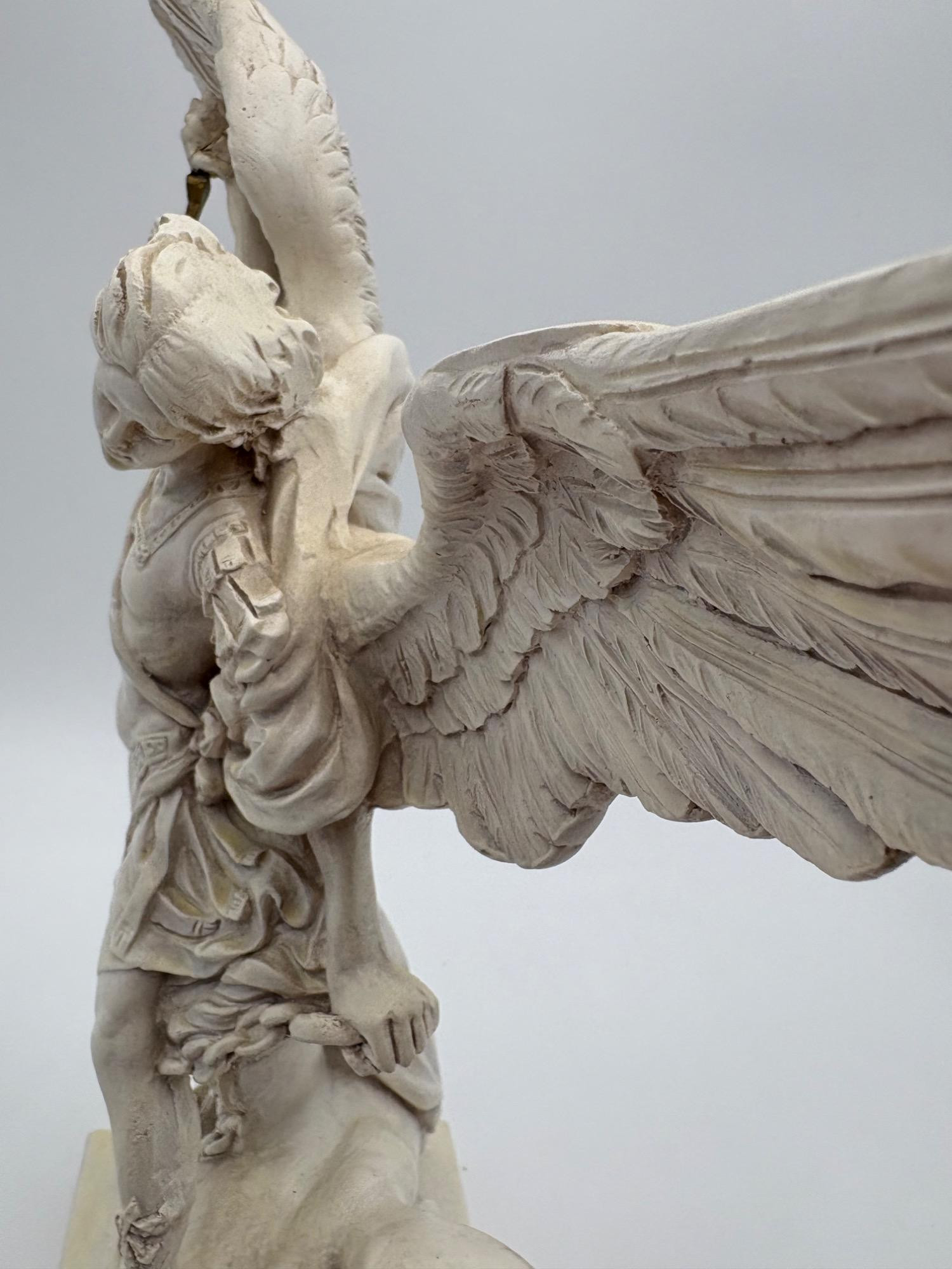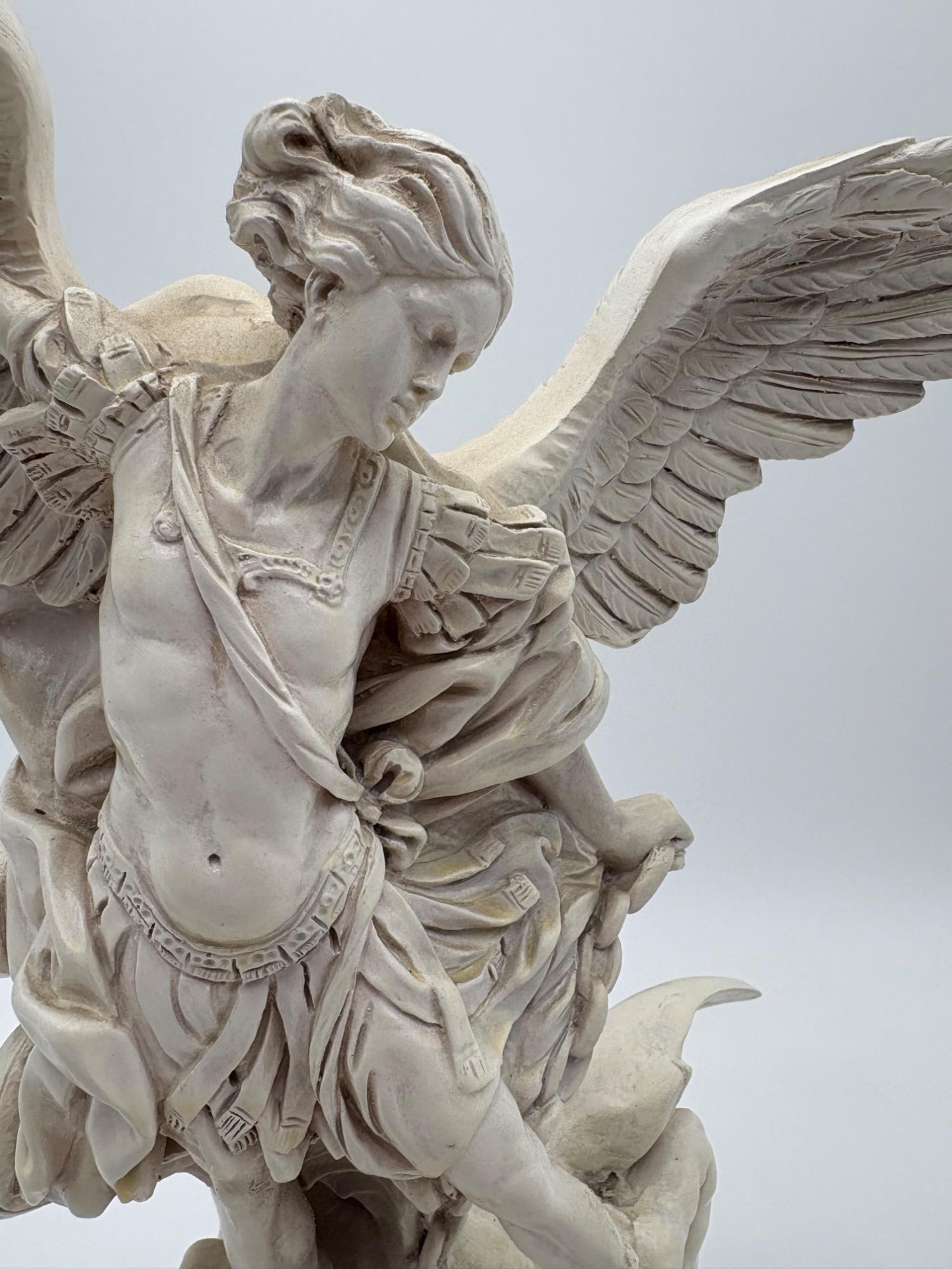 Two sculptures that appear to be out of cast resin and plaster.. No makers mark on either piece. Black rearing stallion on square platform with wavy mane. He could use a bit of black paint where the black finish has rubbed off - see last 2 photos for details. He stands 18.5" H x 14" W x just under 6" D. In ok vintage condition. White avenging angel standing on the head of a devil with wonderful detail. Only coloration is the gold sword. We are unsure of the medium, but think it is plaster given that the unfinished bottom is powdery. Measures 16" H x 14" W x 7" D.