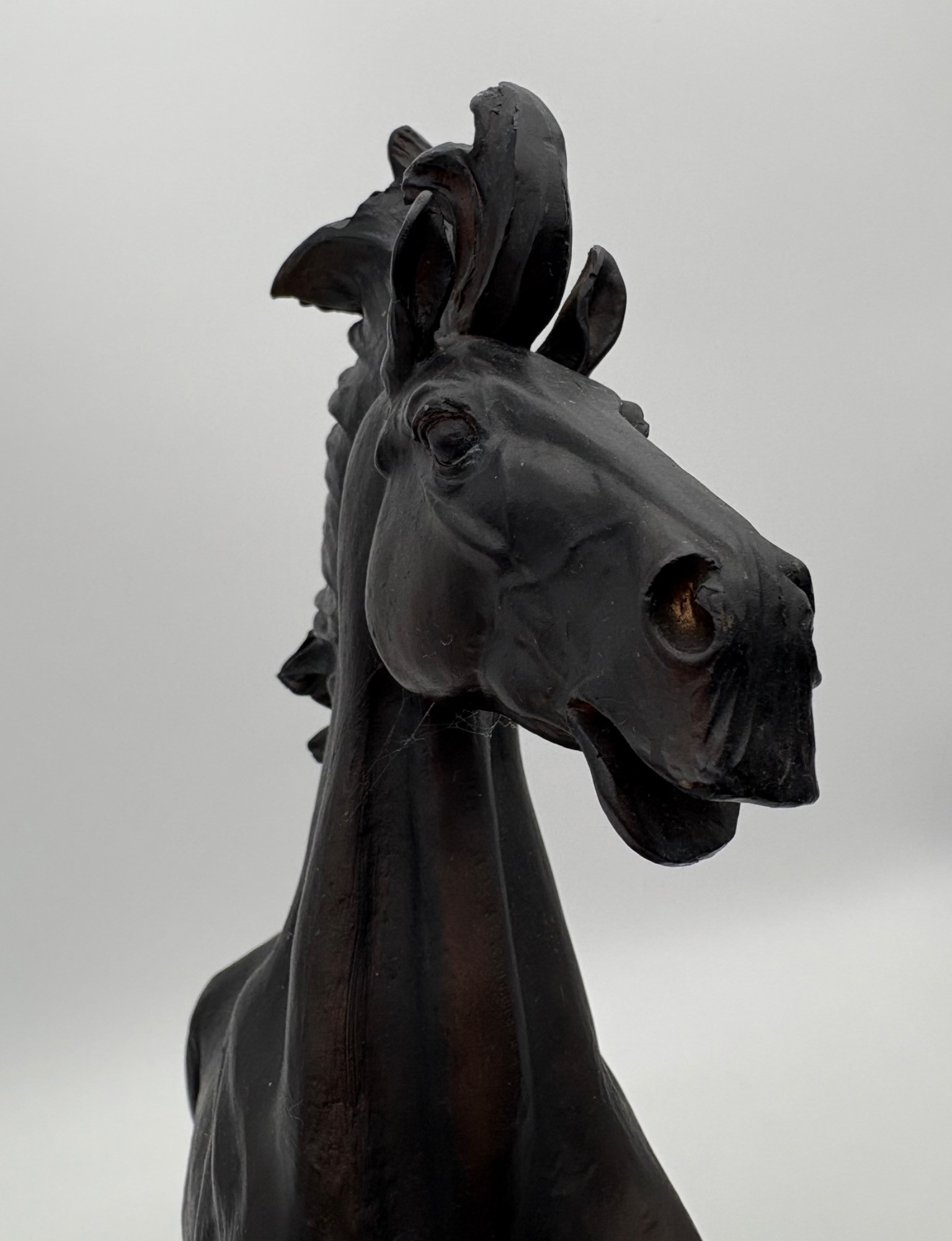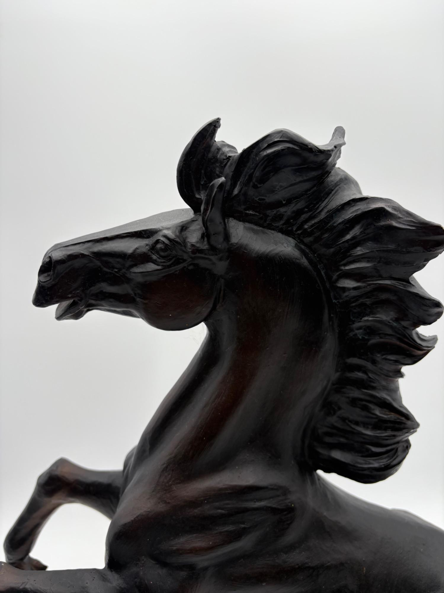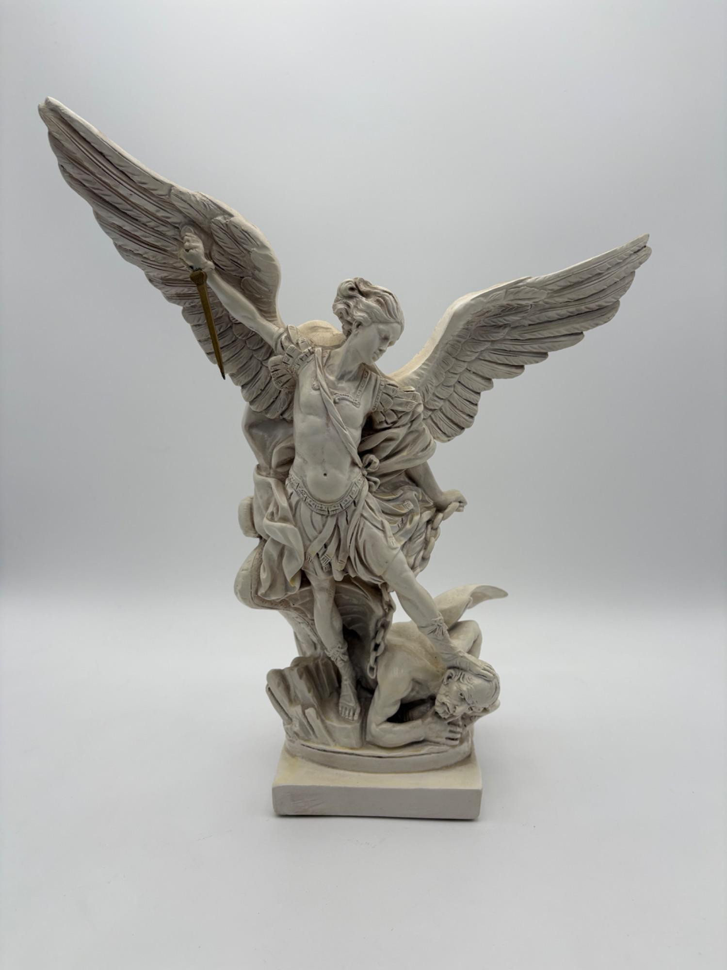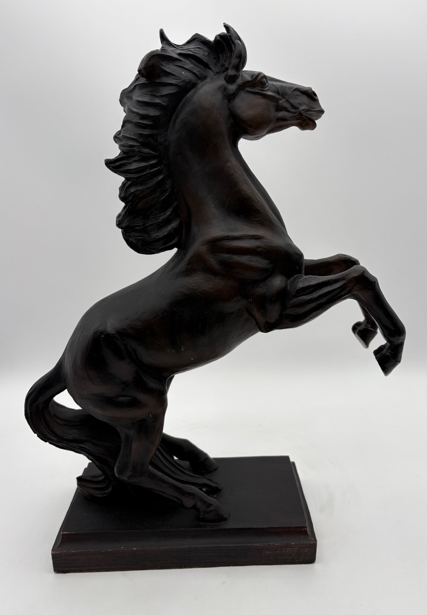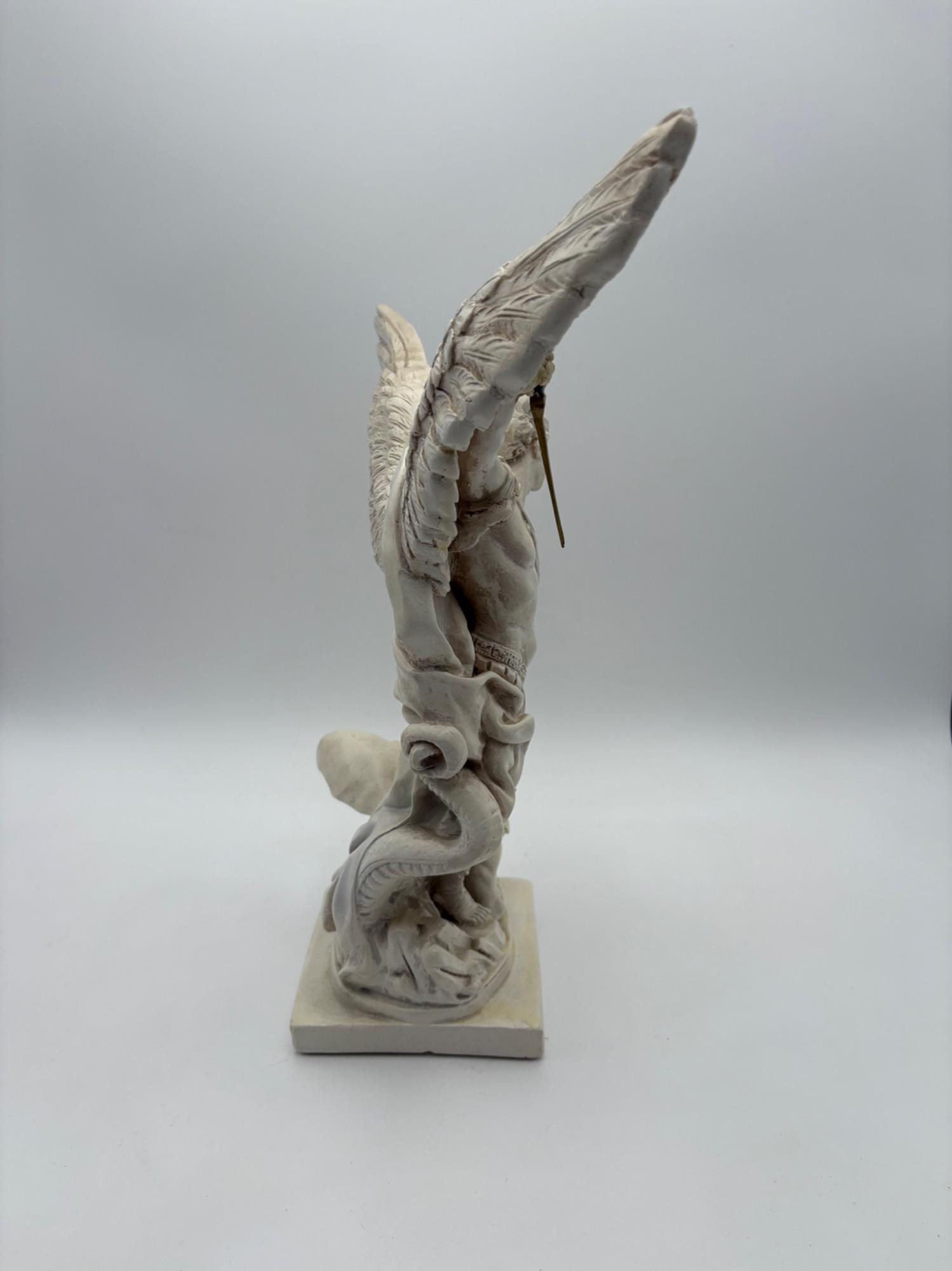 Two sculptures that appear to be out of cast resin and plaster.. No makers mark on either piece. Black rearing stallion on square platform with wavy mane. He could use a bit of black paint where the black finish has rubbed off - see last 2 photos for details. He stands 18.5" H x 14" W x just under 6" D. In ok vintage condition. White avenging angel standing on the head of a devil with wonderful detail. Only coloration is the gold sword. We are unsure of the medium, but think it is plaster given that the unfinished bottom is powdery. Measures 16" H x 14" W x 7" D.