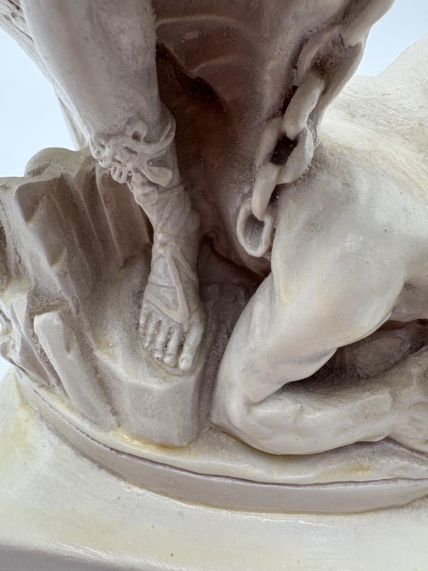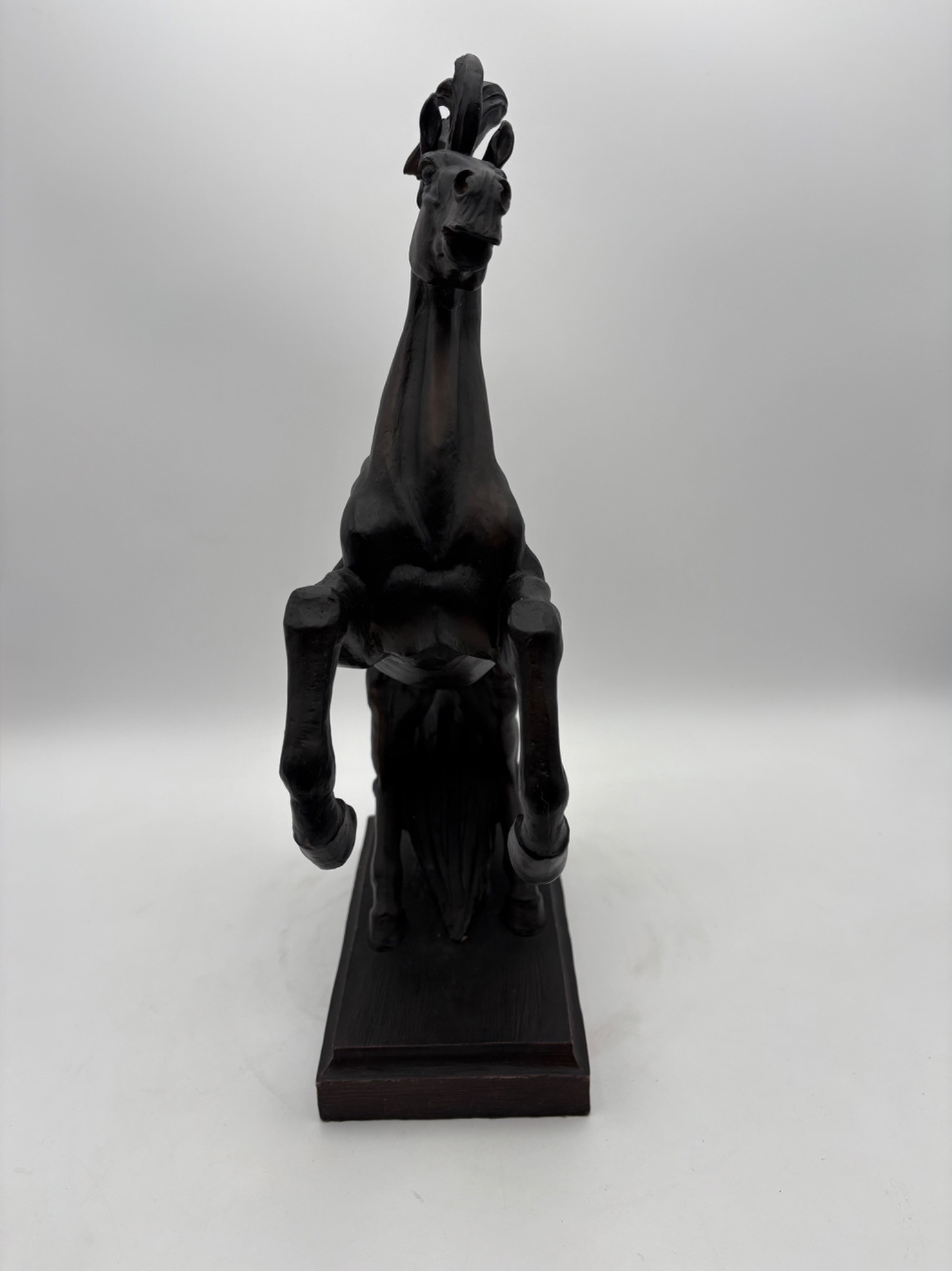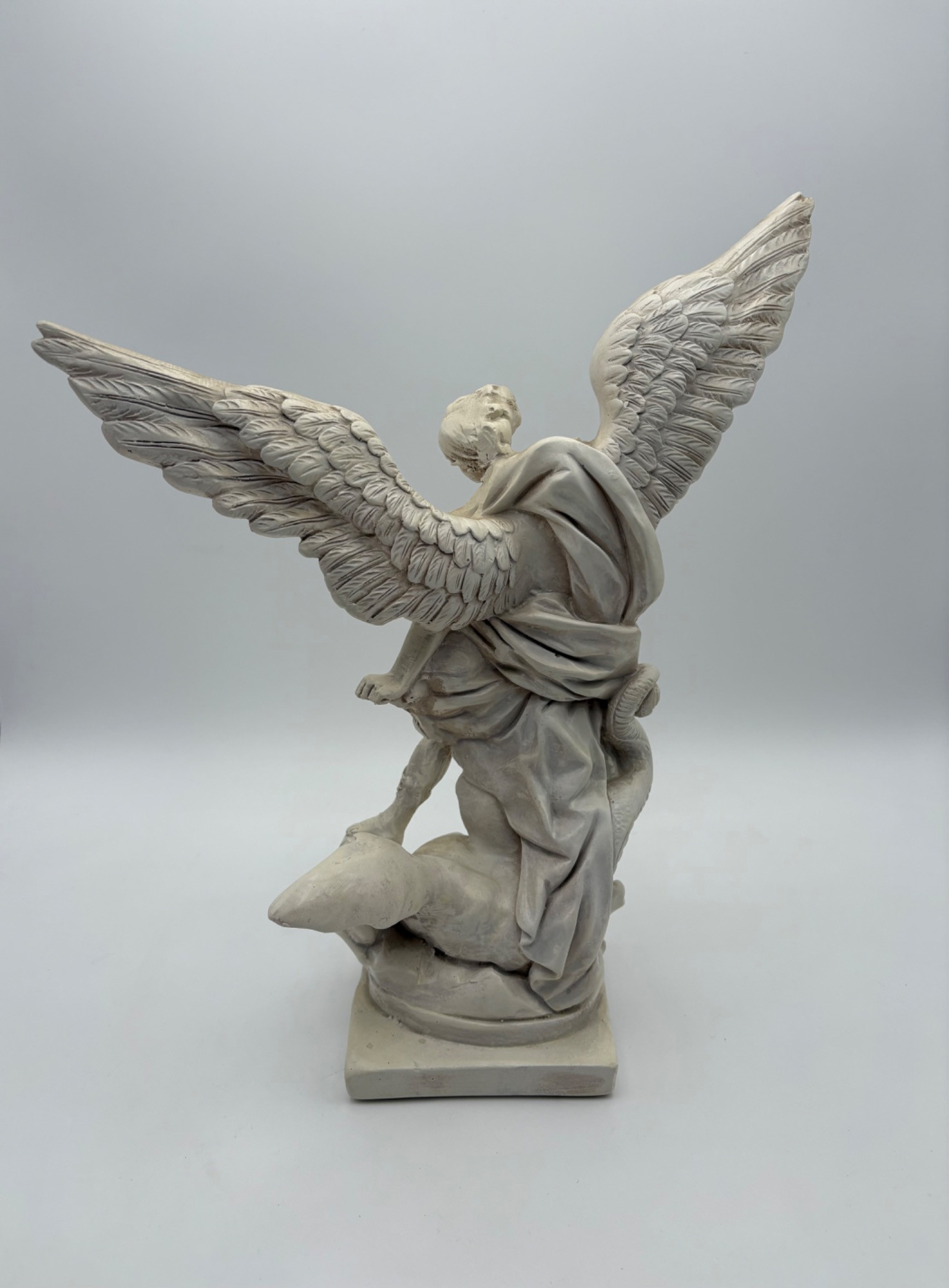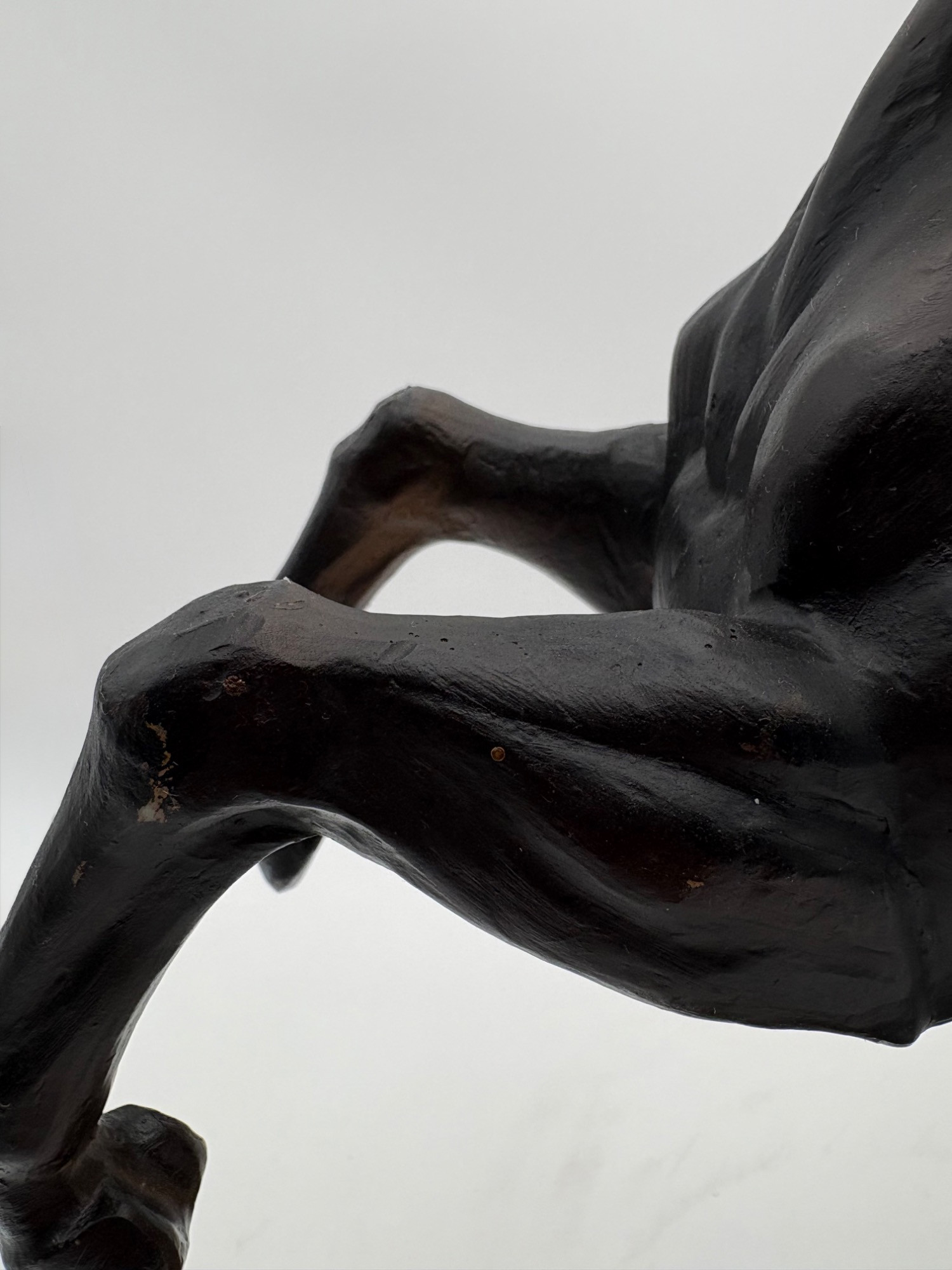 Two sculptures that appear to be out of cast resin and plaster.. No makers mark on either piece. Black rearing stallion on square platform with wavy mane. He could use a bit of black paint where the black finish has rubbed off - see last 2 photos for details. He stands 18.5" H x 14" W x just under 6" D. In ok vintage condition. White avenging angel standing on the head of a devil with wonderful detail. Only coloration is the gold sword. We are unsure of the medium, but think it is plaster given that the unfinished bottom is powdery. Measures 16" H x 14" W x 7" D.