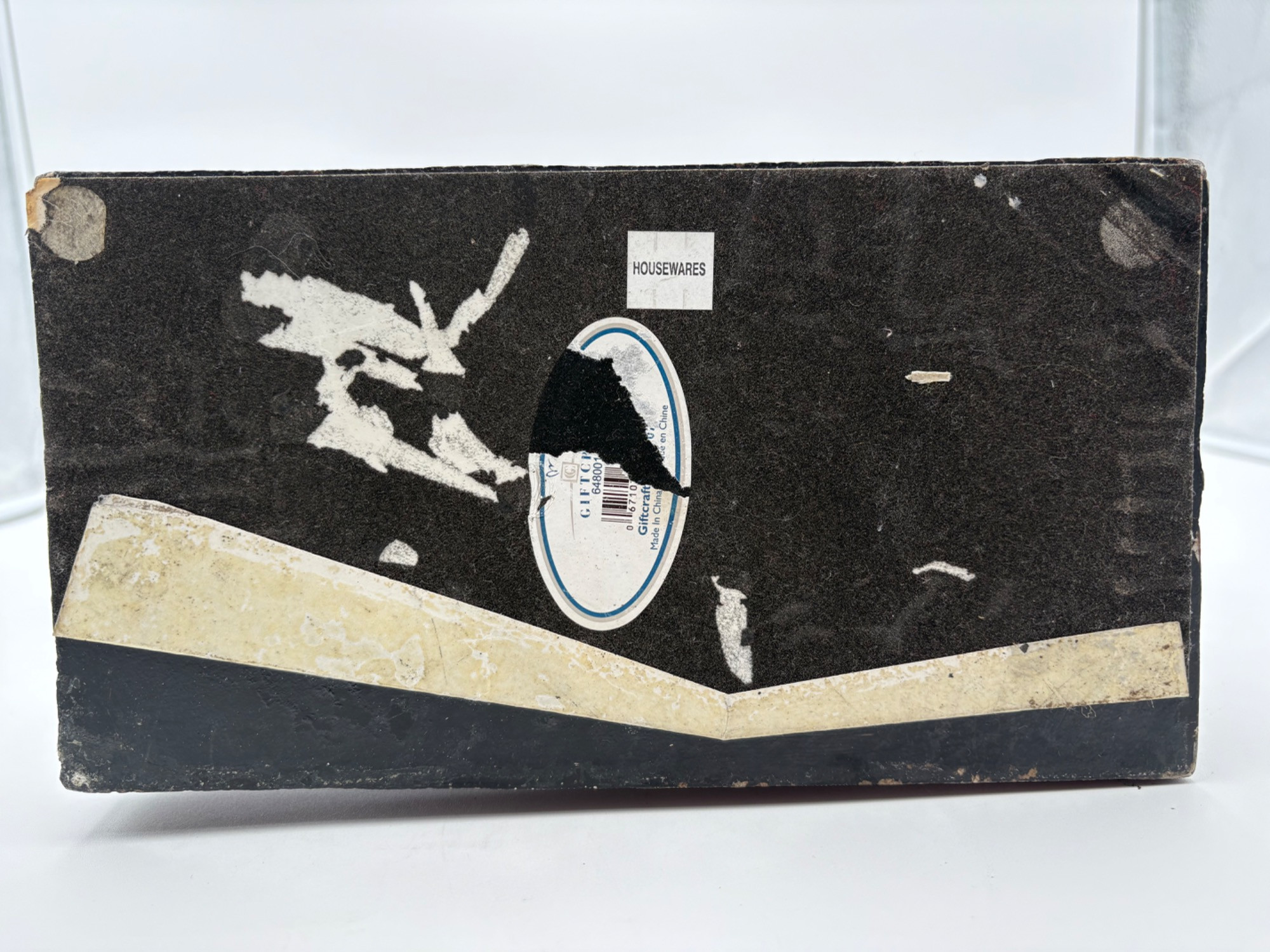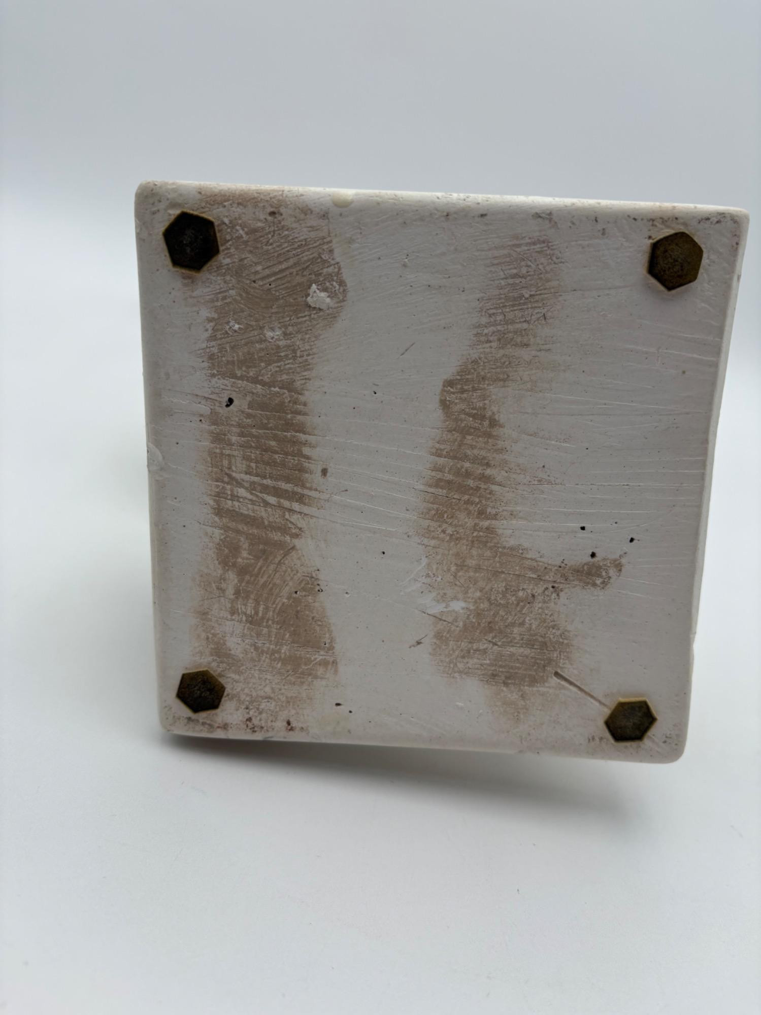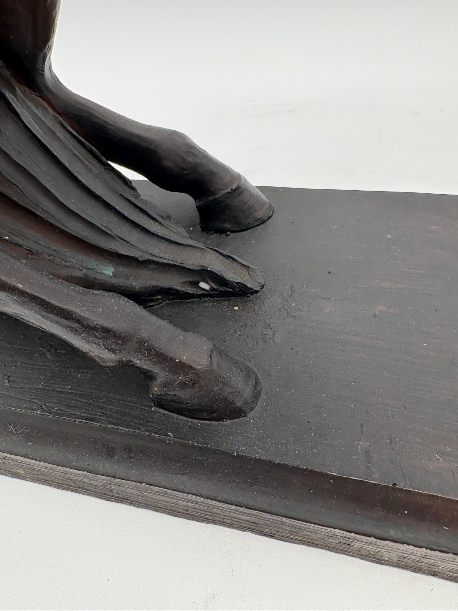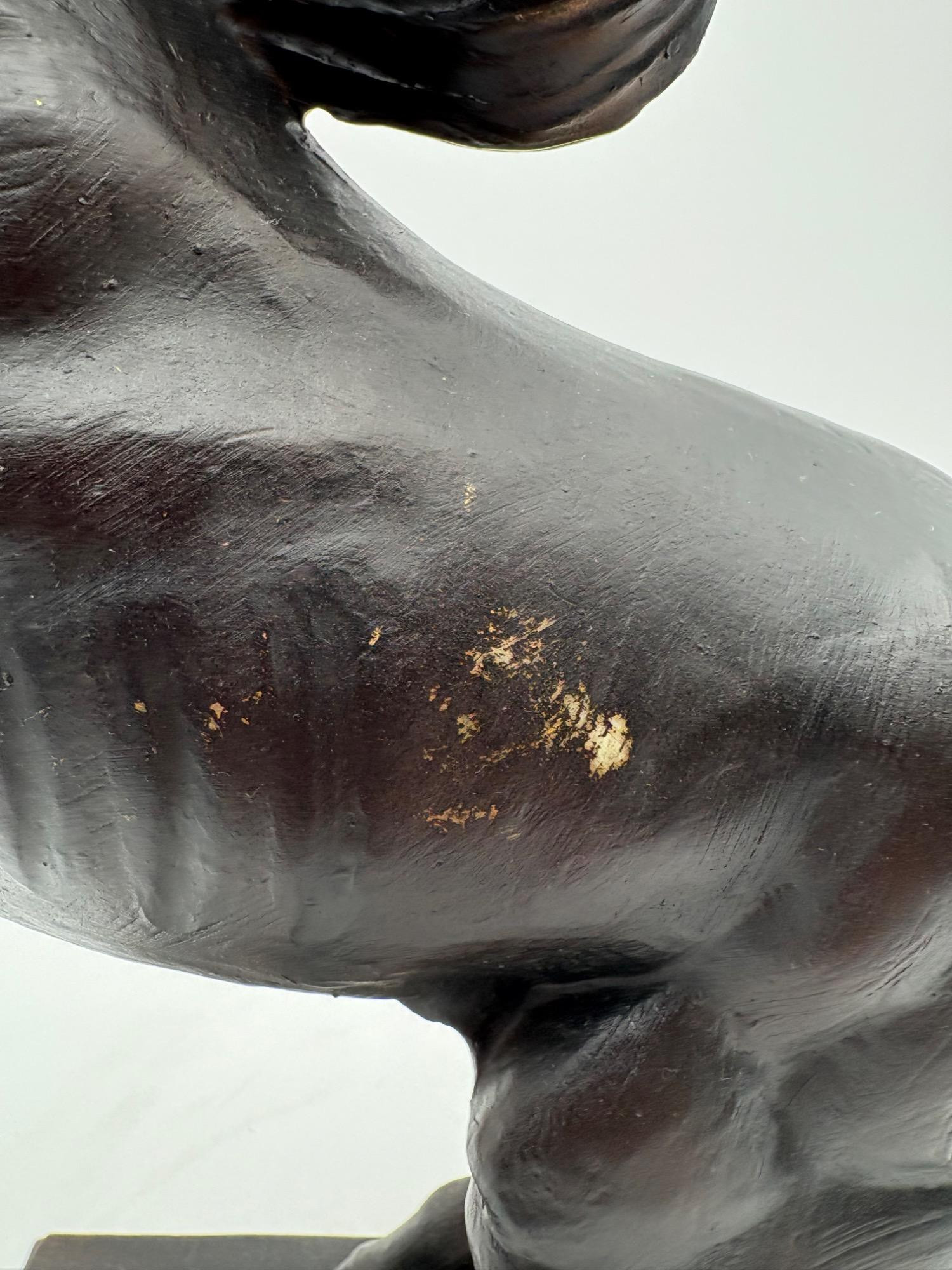 Two sculptures that appear to be out of cast resin and plaster.. No makers mark on either piece. Black rearing stallion on square platform with wavy mane. He could use a bit of black paint where the black finish has rubbed off - see last 2 photos for details. He stands 18.5" H x 14" W x just under 6" D. In ok vintage condition. White avenging angel standing on the head of a devil with wonderful detail. Only coloration is the gold sword. We are unsure of the medium, but think it is plaster given that the unfinished bottom is powdery. Measures 16" H x 14" W x 7" D.