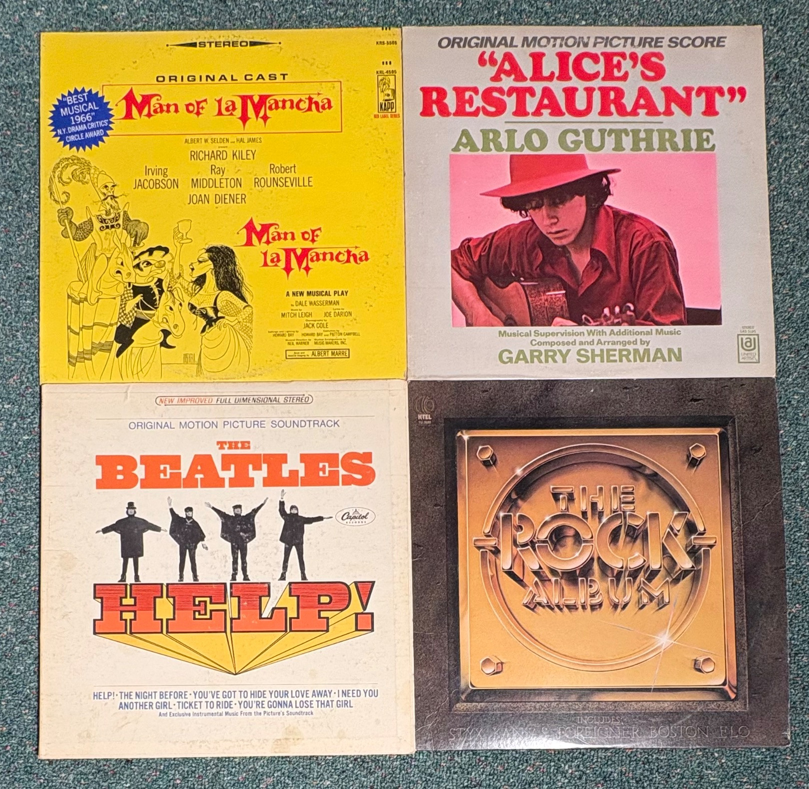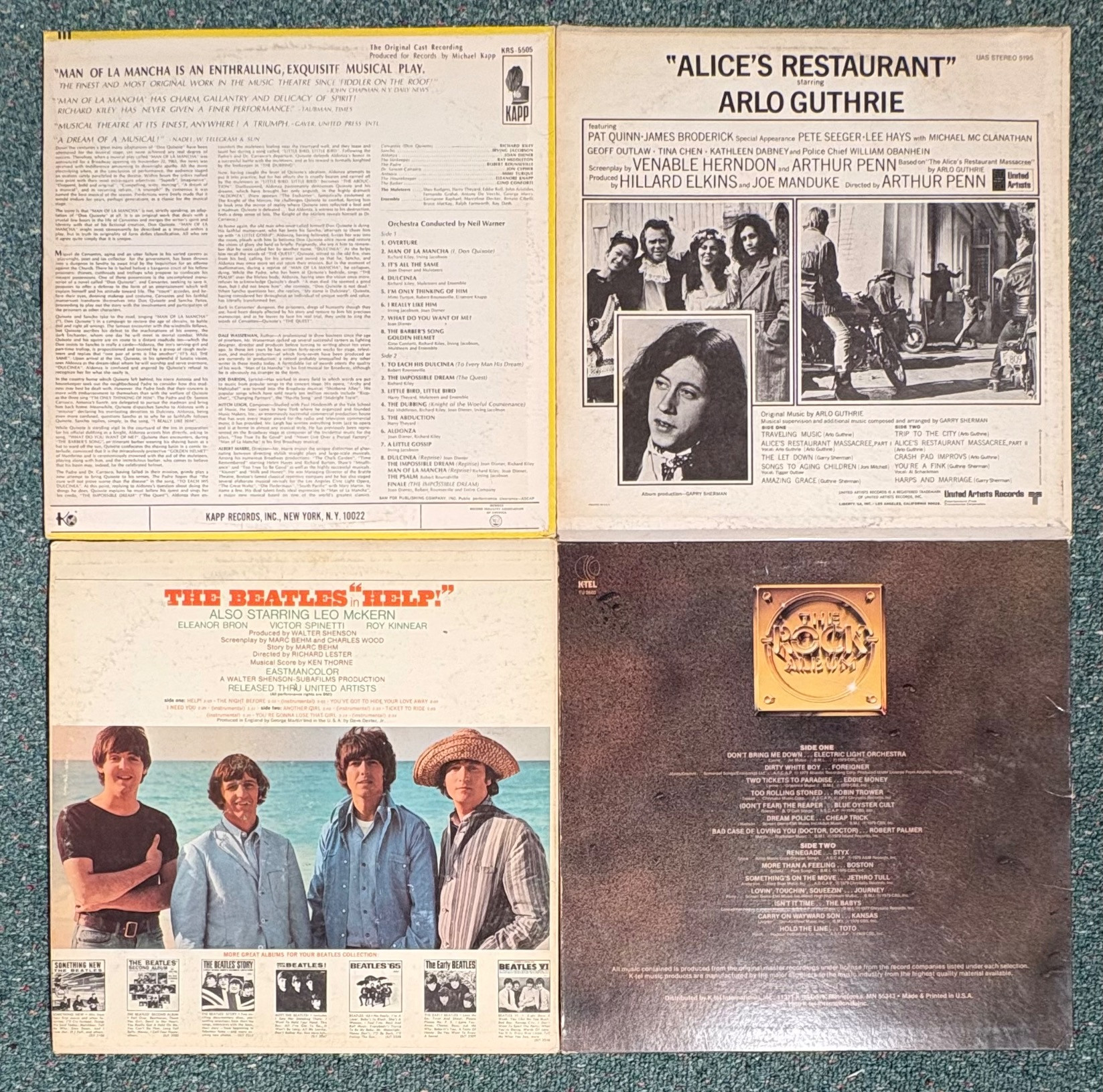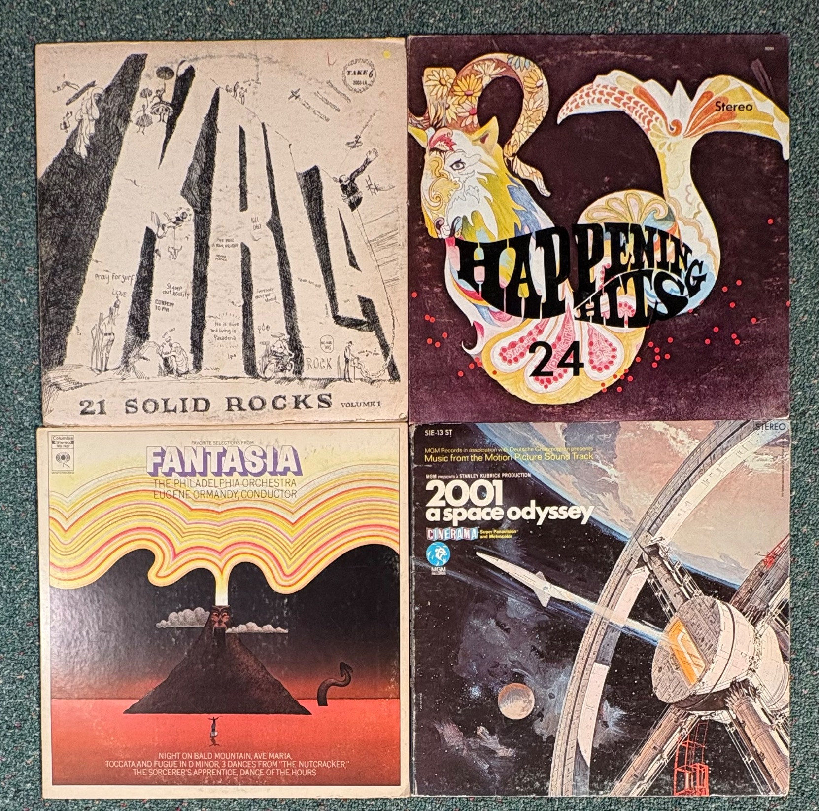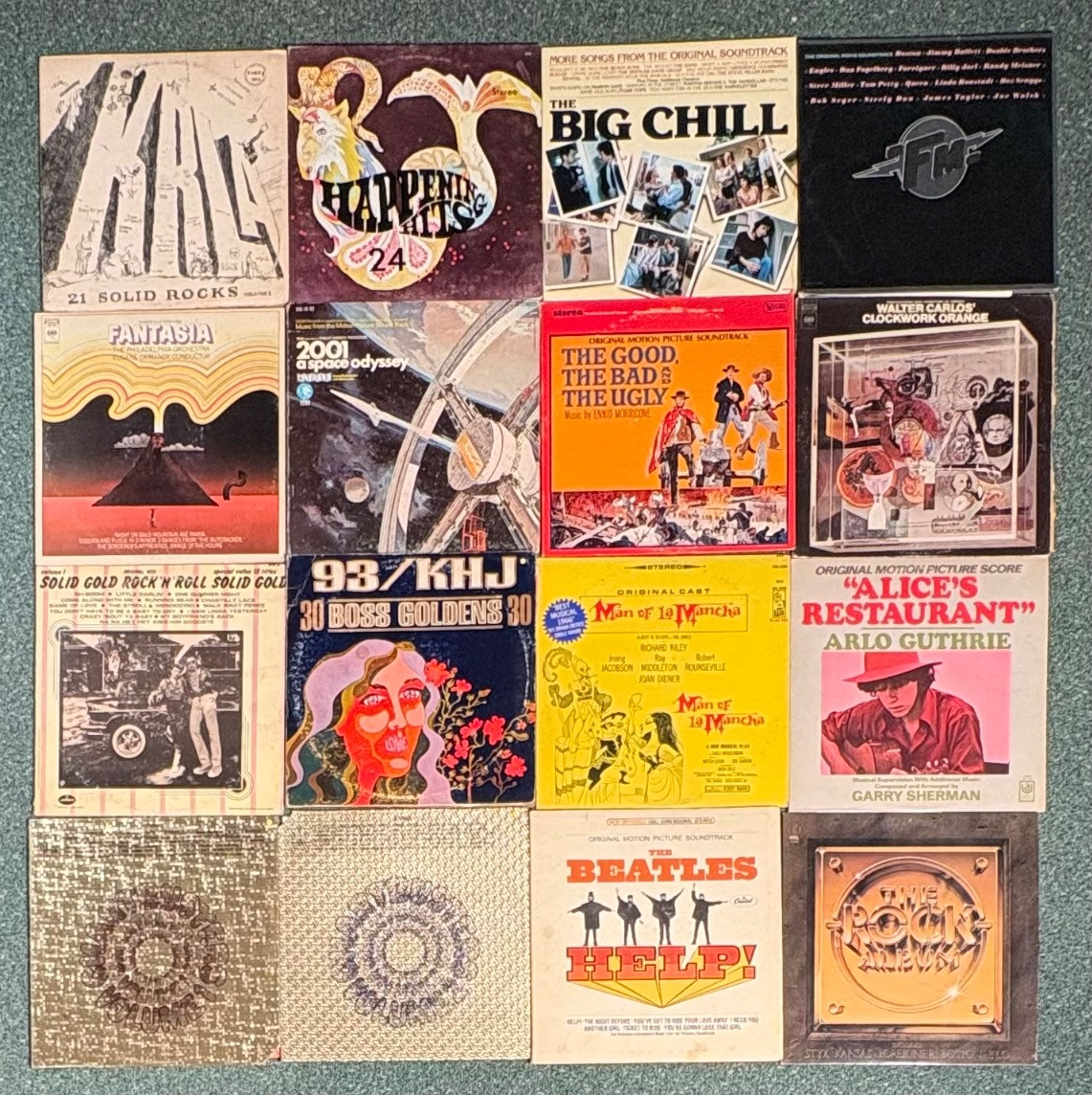 16 vintage vinyl LPs! Our client had eclectic taste and loved his albums - thus, most of these have been lovingly played over the years. We checked to make sure the correct album was in the correct cover and did a cursory glance for any egregious scratches. Some covers reflect heavy use and are worn/split in places/have names written on them. However, the majority are in good used shape. Artists/Bands/Movies in this lot include: Alice’s Restaurant Man Of La Mancha Help Fantasia 2001: A Space Odyssey The Big Chill The Good, The Bad, & The Ugly FM A Clockwork Orange 21 Solid Rocks Chartbusters One Chartbusters Two Solid Gold Rock ‘N’ Roll Happening Hits 24 Multi-Artist Collection - Kansas, Styx, Etc. KJH's 30 Boss Goldens Note: Happening Hits & 21 Solid Rocks missing inner sleeves,