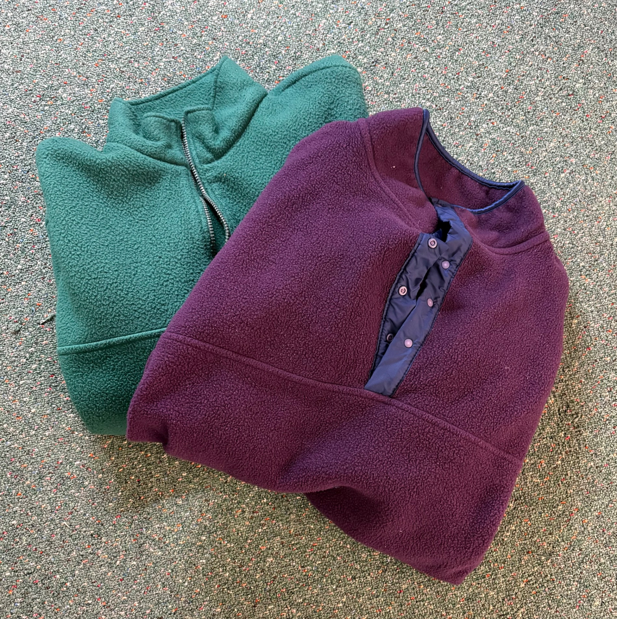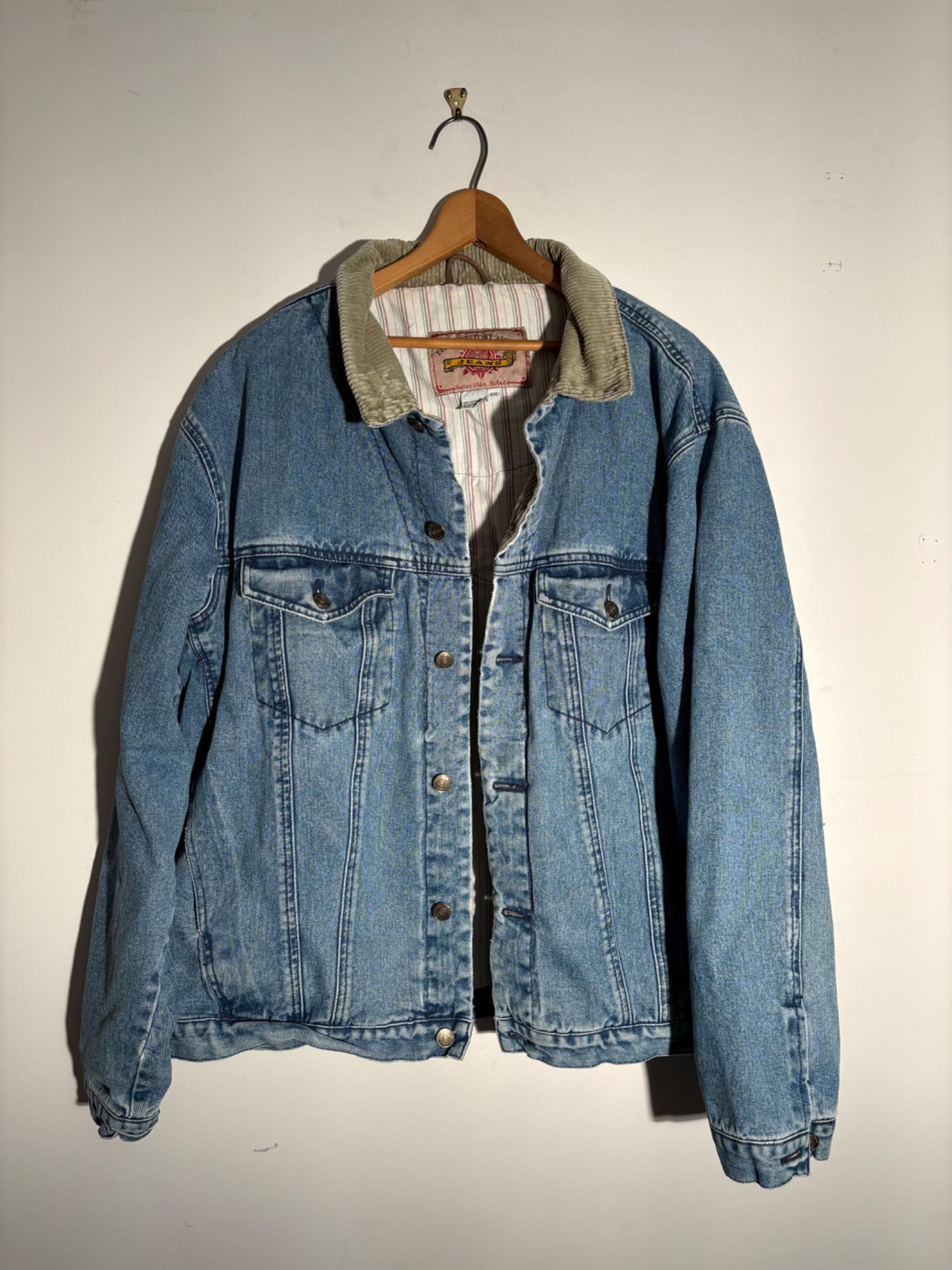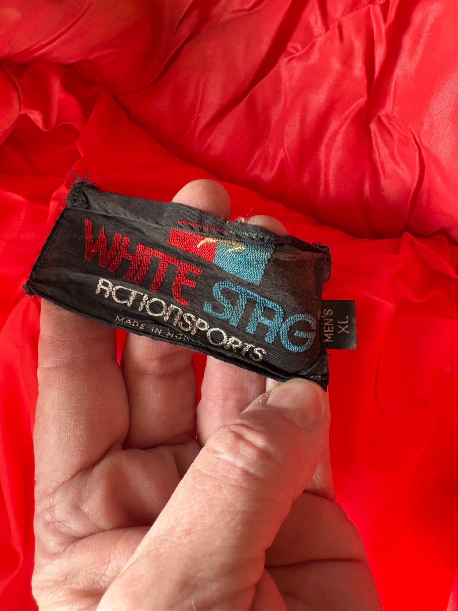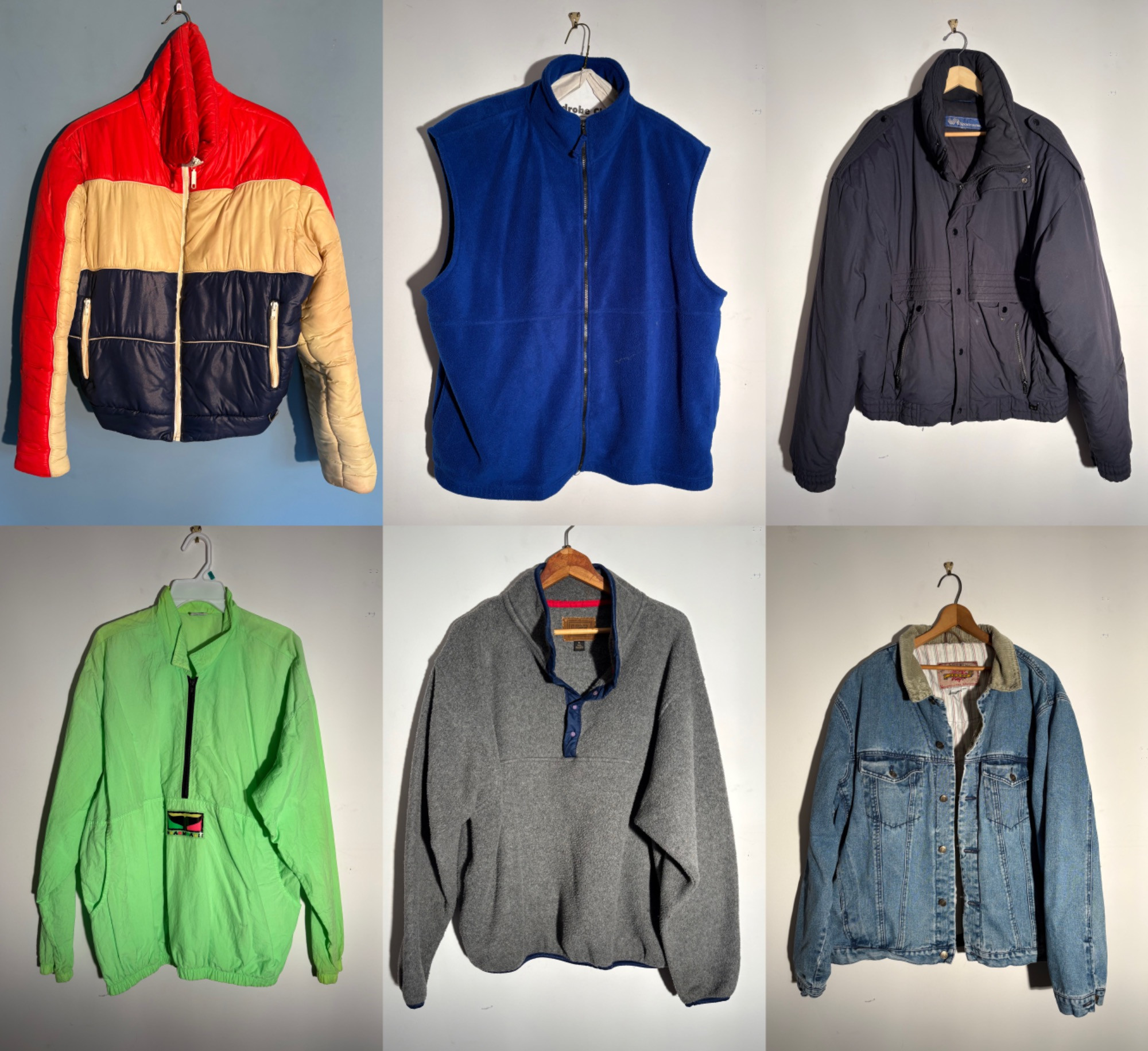 Several items for the vintage enthusiast in a rare size for vintage items; XL! White Stag Actionwear ski coat circa 70s or early 80s. Red, cream, and blue - elasticated rear waist with all plastic zippers. Men's size XL. Definitely vintage and showing use with the most egregious flaw on upper left arm; small hole that needs to be closed. Needs a good wash. Blue Sierra Pacific polar fleece vest size XL. Needs a wash - some white marks on it that might be food. Black Sportscaster zip-front jacket in great shape. No size, but we are guessing XL. Green Crazy Shirts shell with half-zip front. Size XL. Hawaii logo on the kangaroo pocket. OK used condition with some fading, Gray University Wear snap-close polar fleece. Size XL. Shows a fair amount wear, but still very serviceable. Classic denim jacket from The Territory Ahead. Eagle emblem appliqued on back shoulders. Size XXL in good condition. Very soft and broken in. Lined, lots of pockets, and a corduroy collar. BONUS: we found two more polar fleece jackets after photos were taken - they are in the last photo. Both definitely used but with life still in them. Size XL