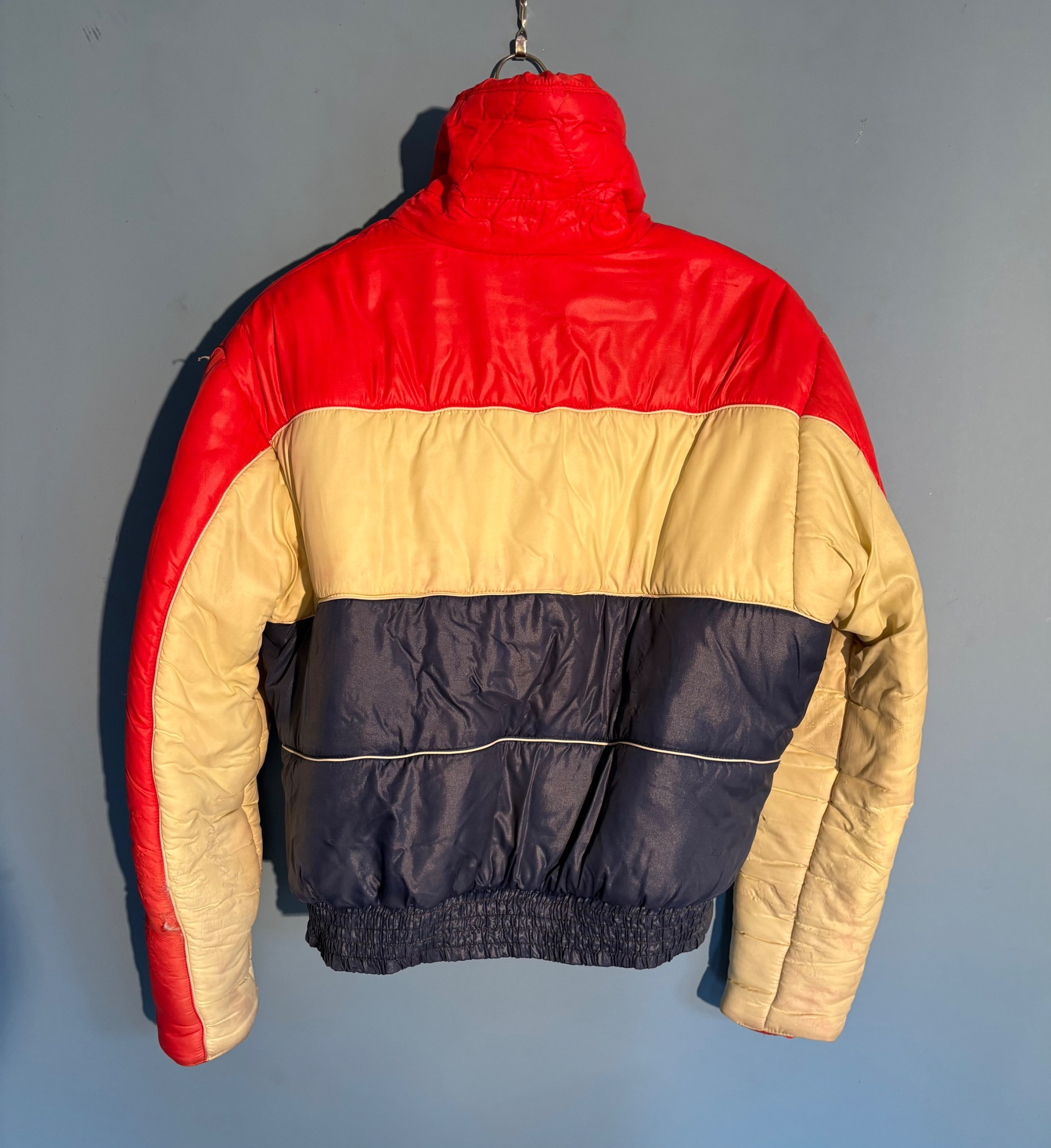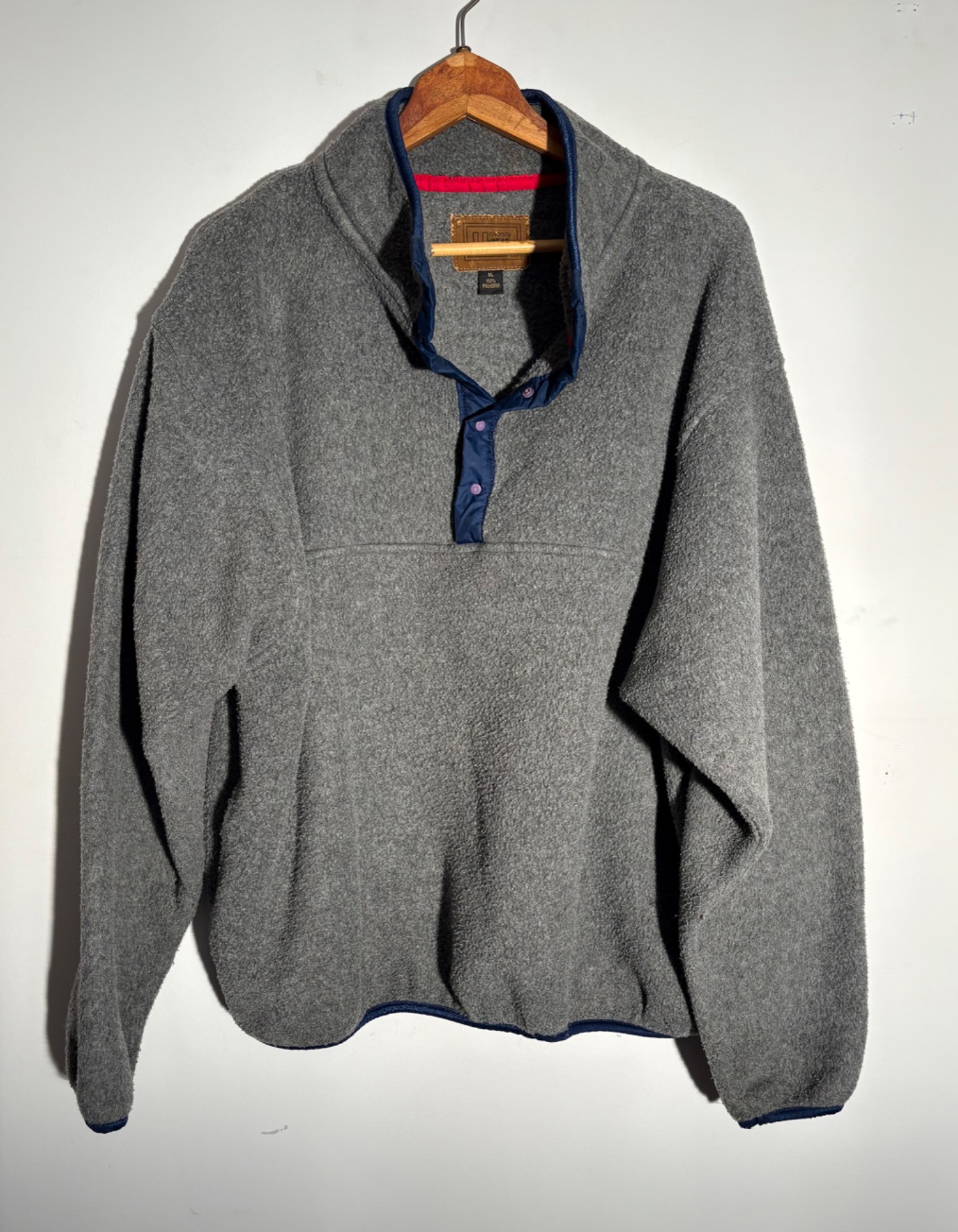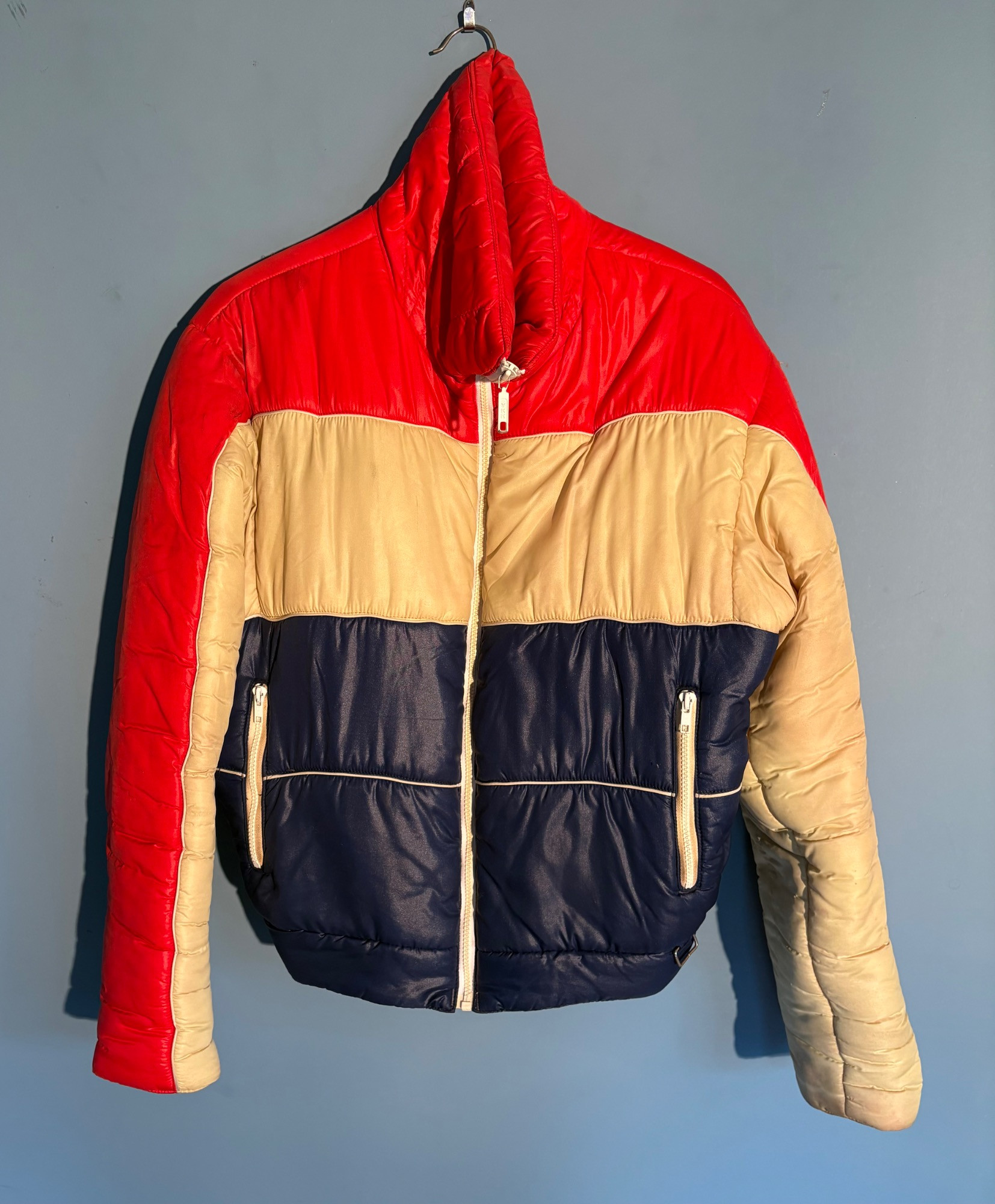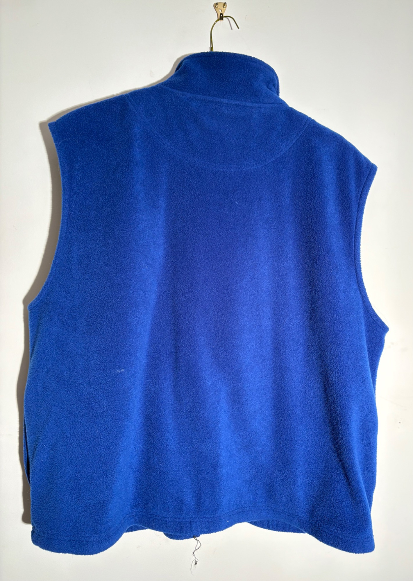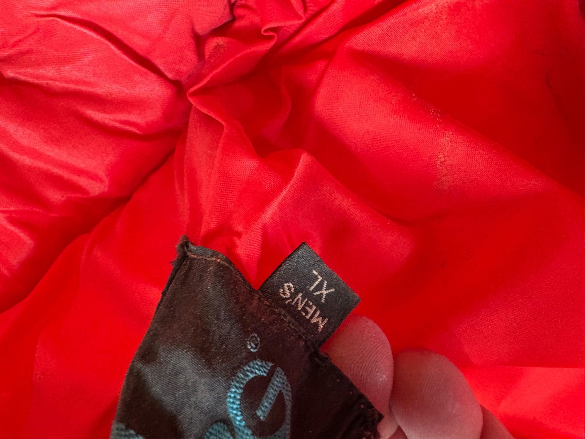 Several items for the vintage enthusiast in a rare size for vintage items; XL! White Stag Actionwear ski coat circa 70s or early 80s. Red, cream, and blue - elasticated rear waist with all plastic zippers. Men's size XL. Definitely vintage and showing use with the most egregious flaw on upper left arm; small hole that needs to be closed. Needs a good wash. Blue Sierra Pacific polar fleece vest size XL. Needs a wash - some white marks on it that might be food. Black Sportscaster zip-front jacket in great shape. No size, but we are guessing XL. Green Crazy Shirts shell with half-zip front. Size XL. Hawaii logo on the kangaroo pocket. OK used condition with some fading, Gray University Wear snap-close polar fleece. Size XL. Shows a fair amount wear, but still very serviceable. Classic denim jacket from The Territory Ahead. Eagle emblem appliqued on back shoulders. Size XXL in good condition. Very soft and broken in. Lined, lots of pockets, and a corduroy collar. BONUS: we found two more polar fleece jackets after photos were taken - they are in the last photo. Both definitely used but with life still in them. Size XL