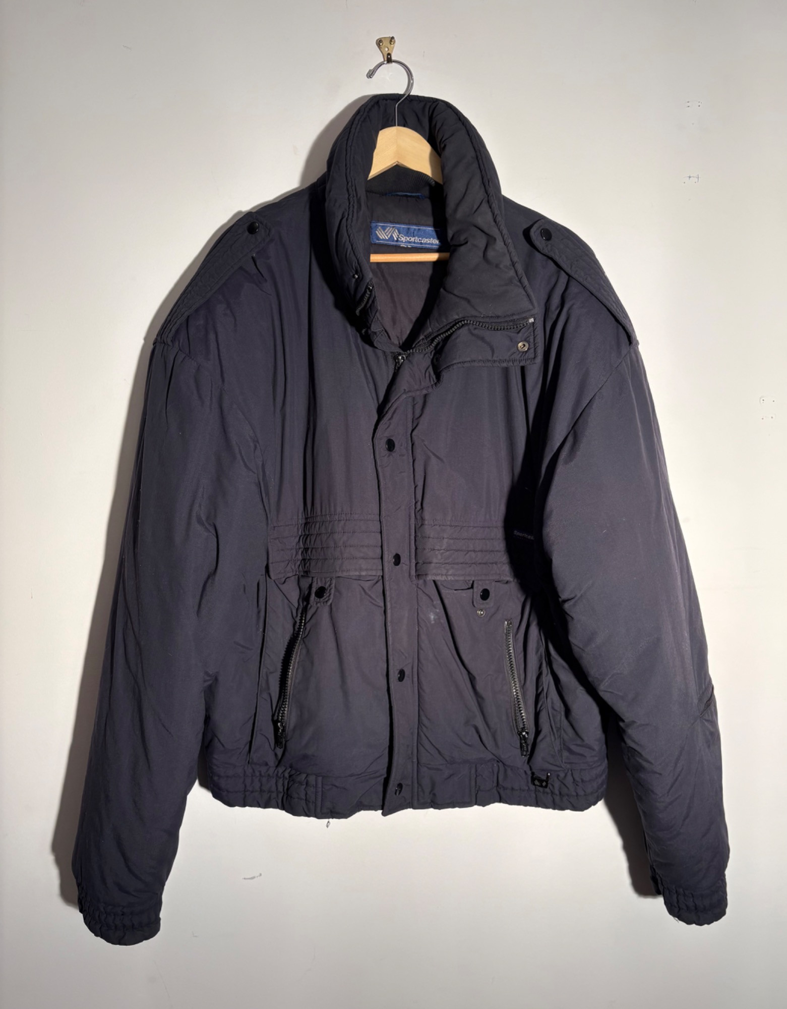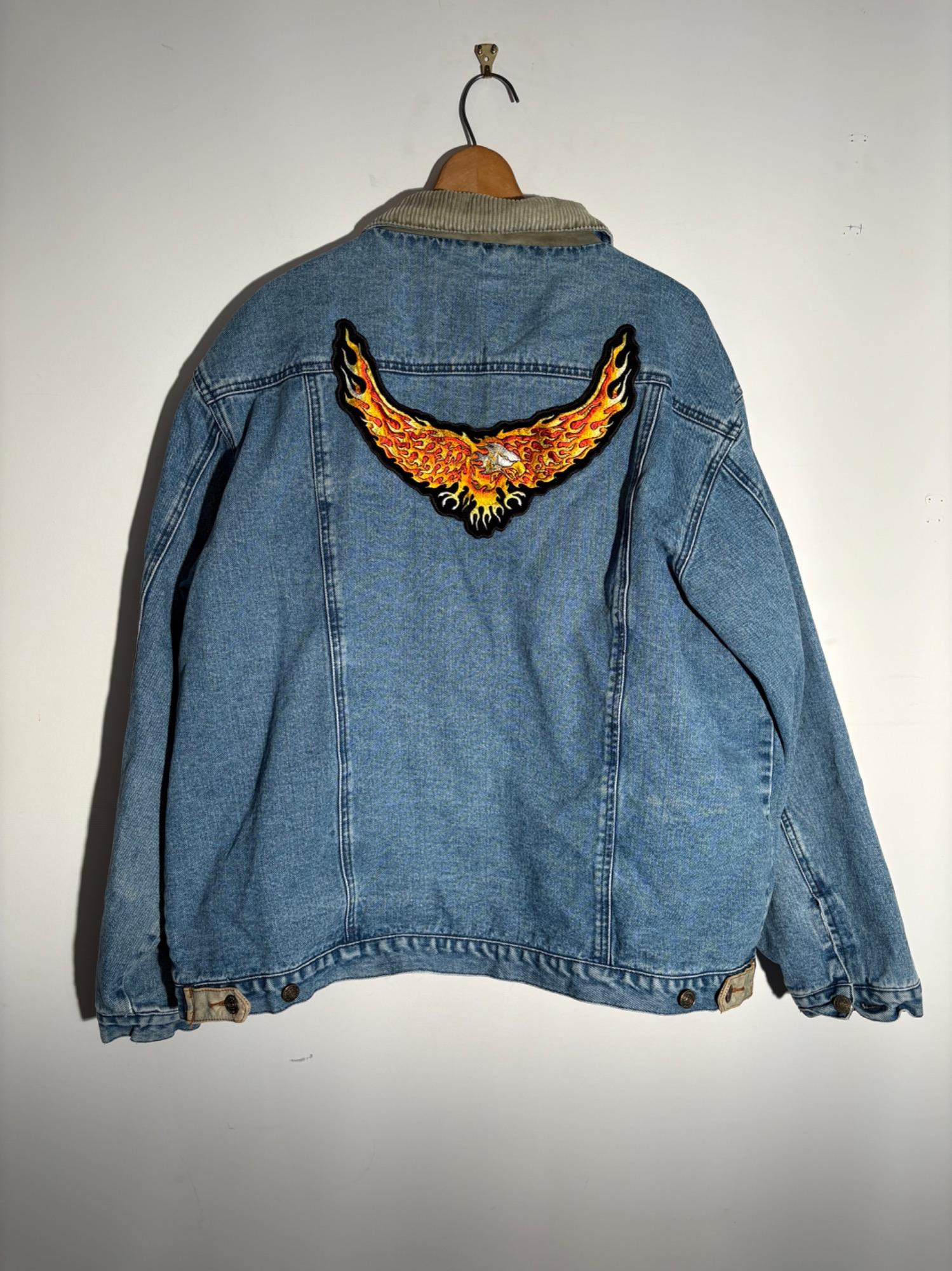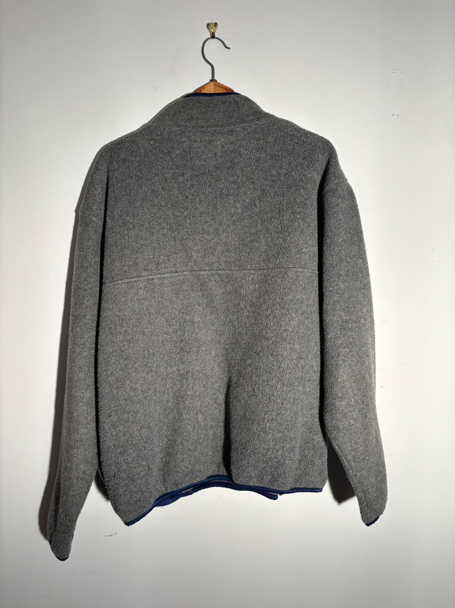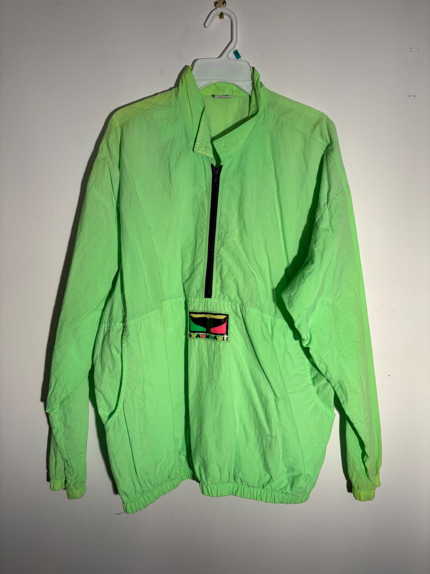 Several items for the vintage enthusiast in a rare size for vintage items; XL! White Stag Actionwear ski coat circa 70s or early 80s. Red, cream, and blue - elasticated rear waist with all plastic zippers. Men's size XL. Definitely vintage and showing use with the most egregious flaw on upper left arm; small hole that needs to be closed. Needs a good wash. Blue Sierra Pacific polar fleece vest size XL. Needs a wash - some white marks on it that might be food. Black Sportscaster zip-front jacket in great shape. No size, but we are guessing XL. Green Crazy Shirts shell with half-zip front. Size XL. Hawaii logo on the kangaroo pocket. OK used condition with some fading, Gray University Wear snap-close polar fleece. Size XL. Shows a fair amount wear, but still very serviceable. Classic denim jacket from The Territory Ahead. Eagle emblem appliqued on back shoulders. Size XXL in good condition. Very soft and broken in. Lined, lots of pockets, and a corduroy collar. BONUS: we found two more polar fleece jackets after photos were taken - they are in the last photo. Both definitely used but with life still in them. Size XL